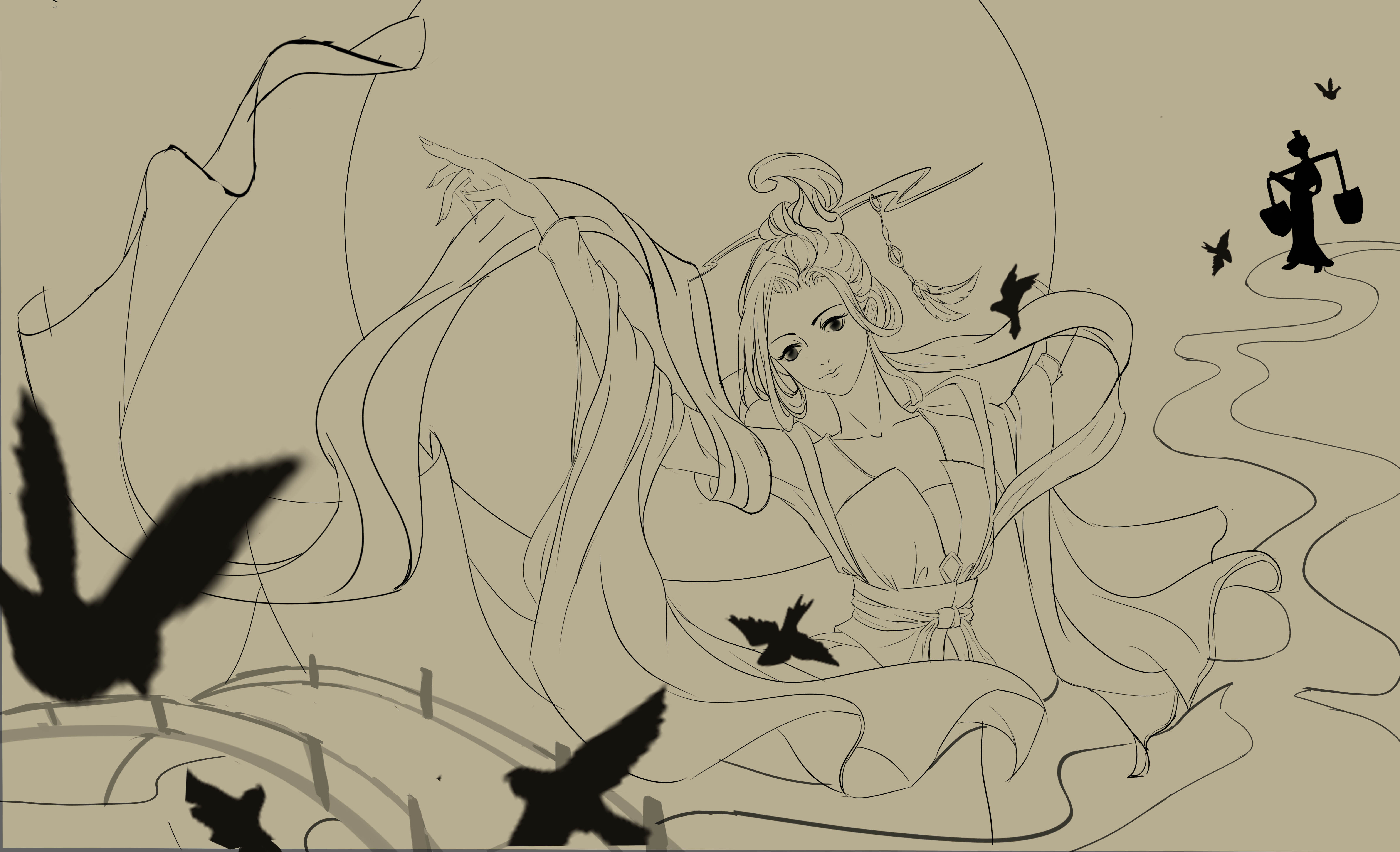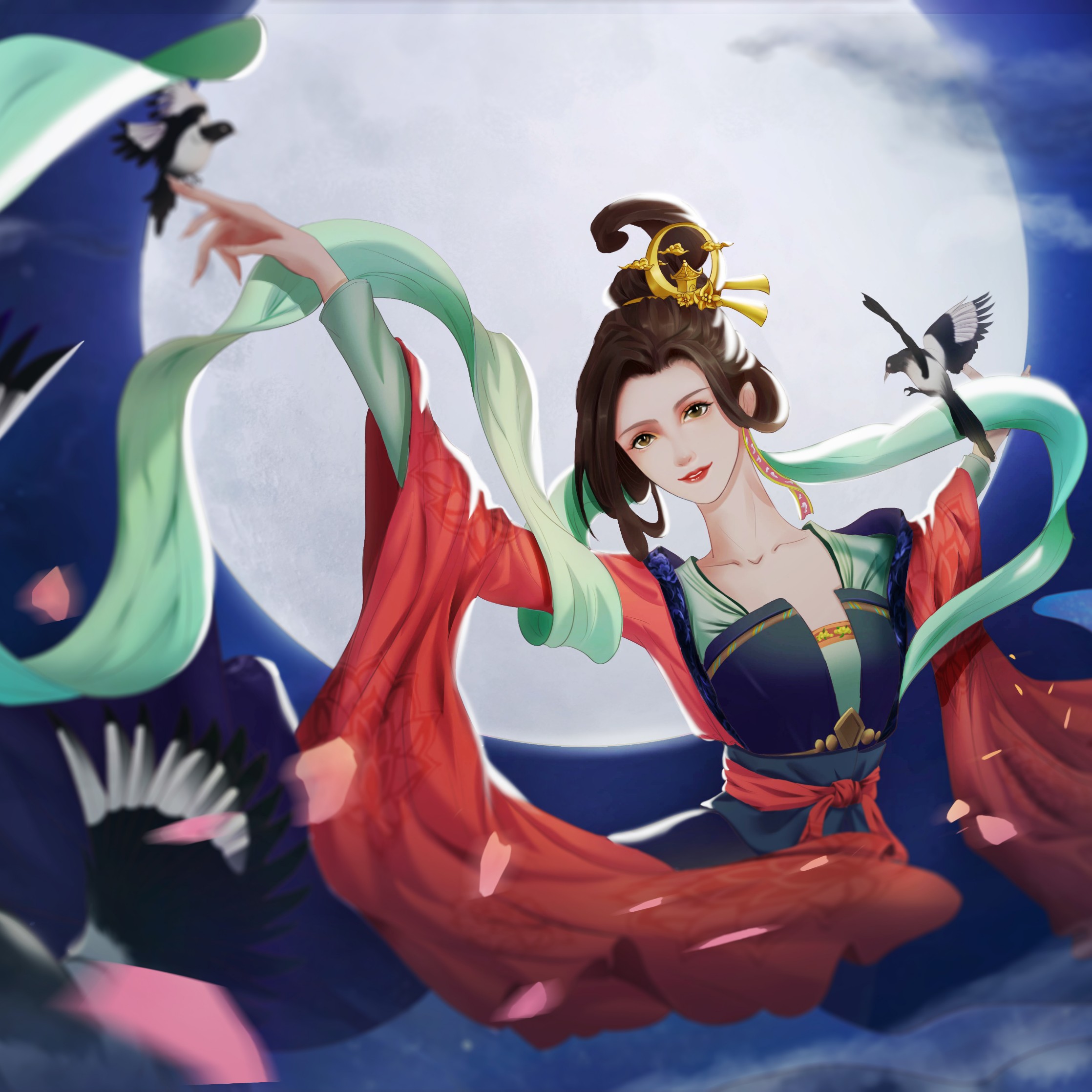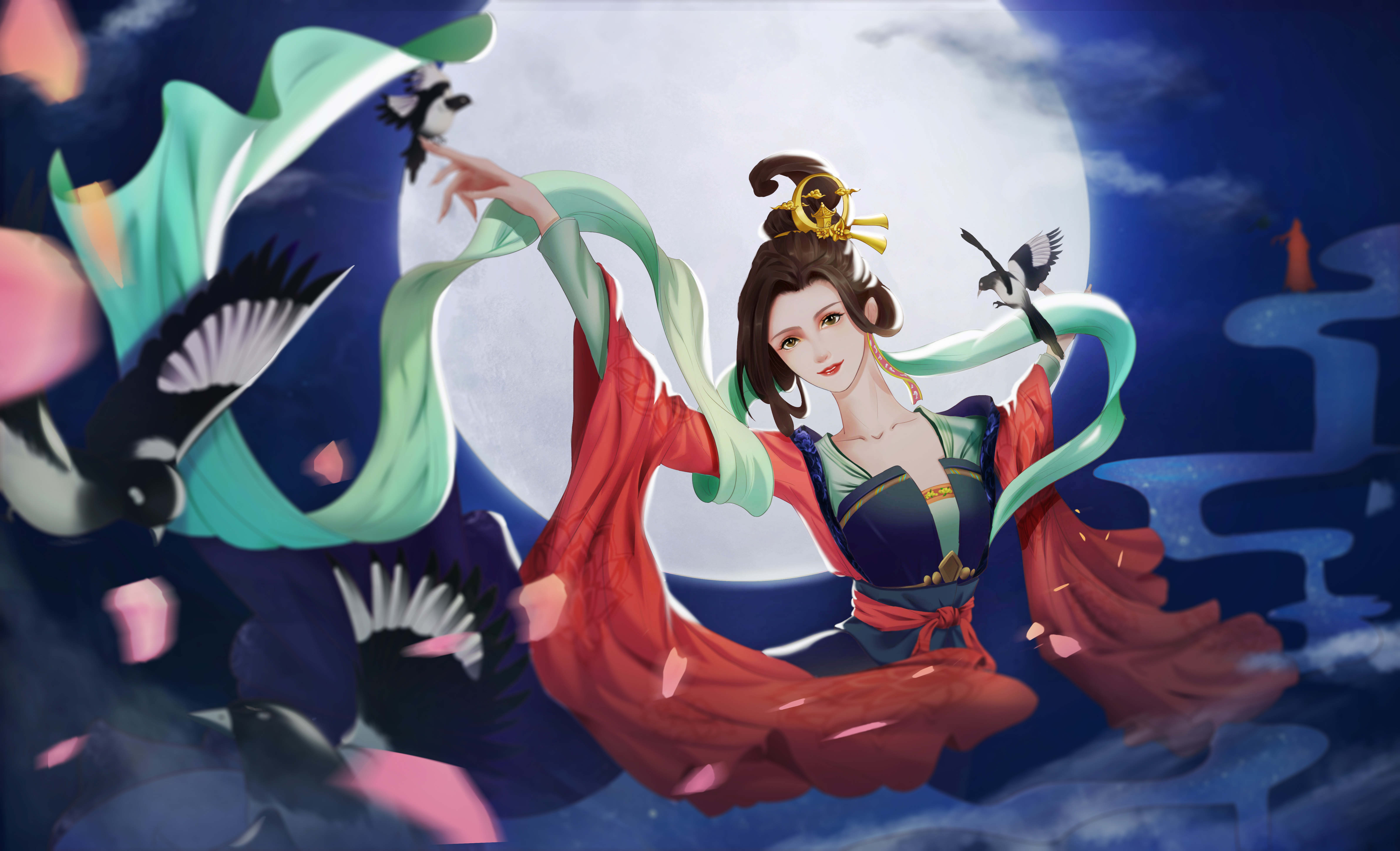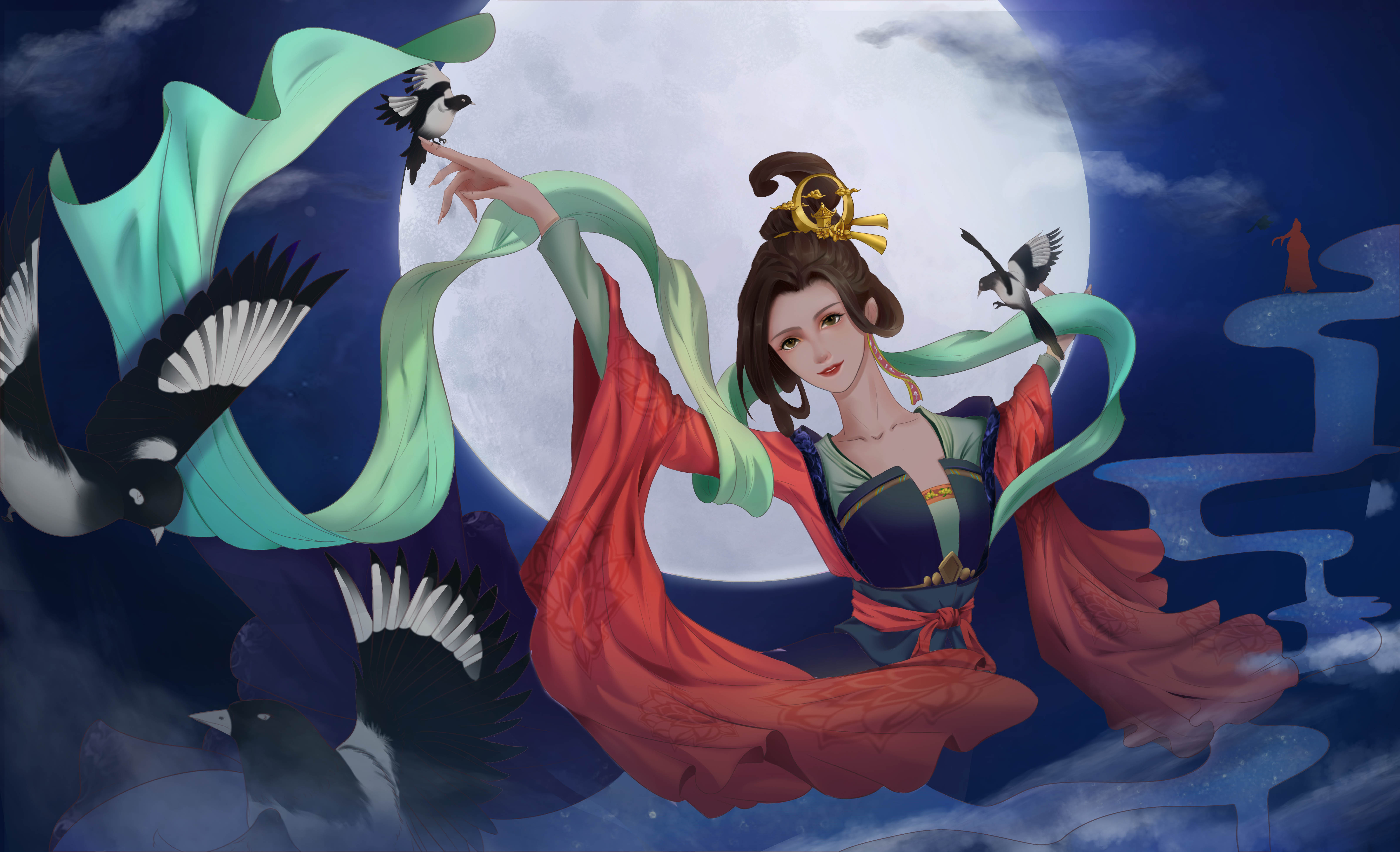 画面想表达的就是,牛郎和织女终于等到了七夕的日子,喜鹊早早的来报喜告诉织女重逢的日子到了,而牛郎随着银河也踏入了天堂,等待着和织女的相遇,织女想到牛郎就快要来到眼前,开心得和喜鹊共舞,而牛郎也从不远处慢慢走来……