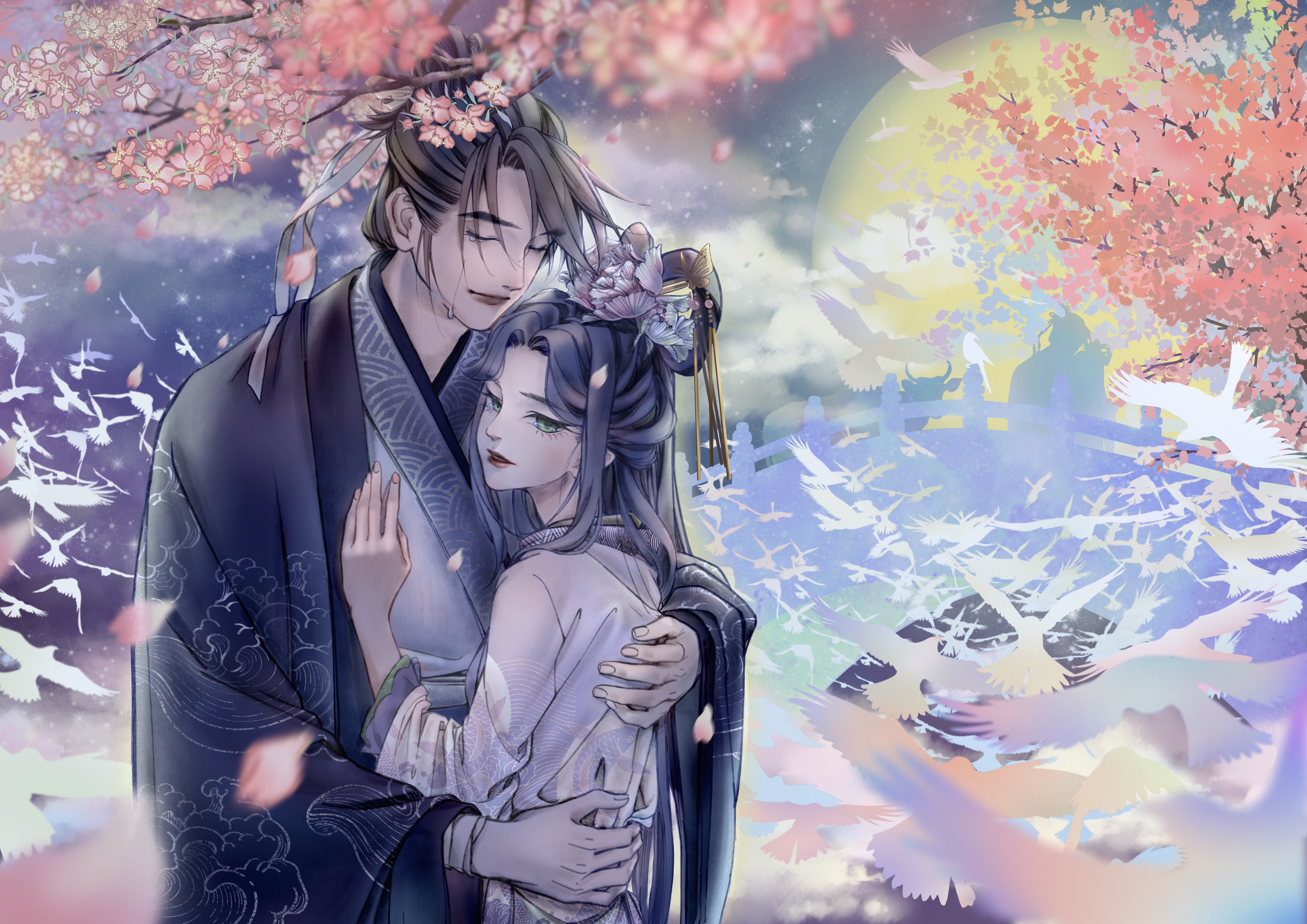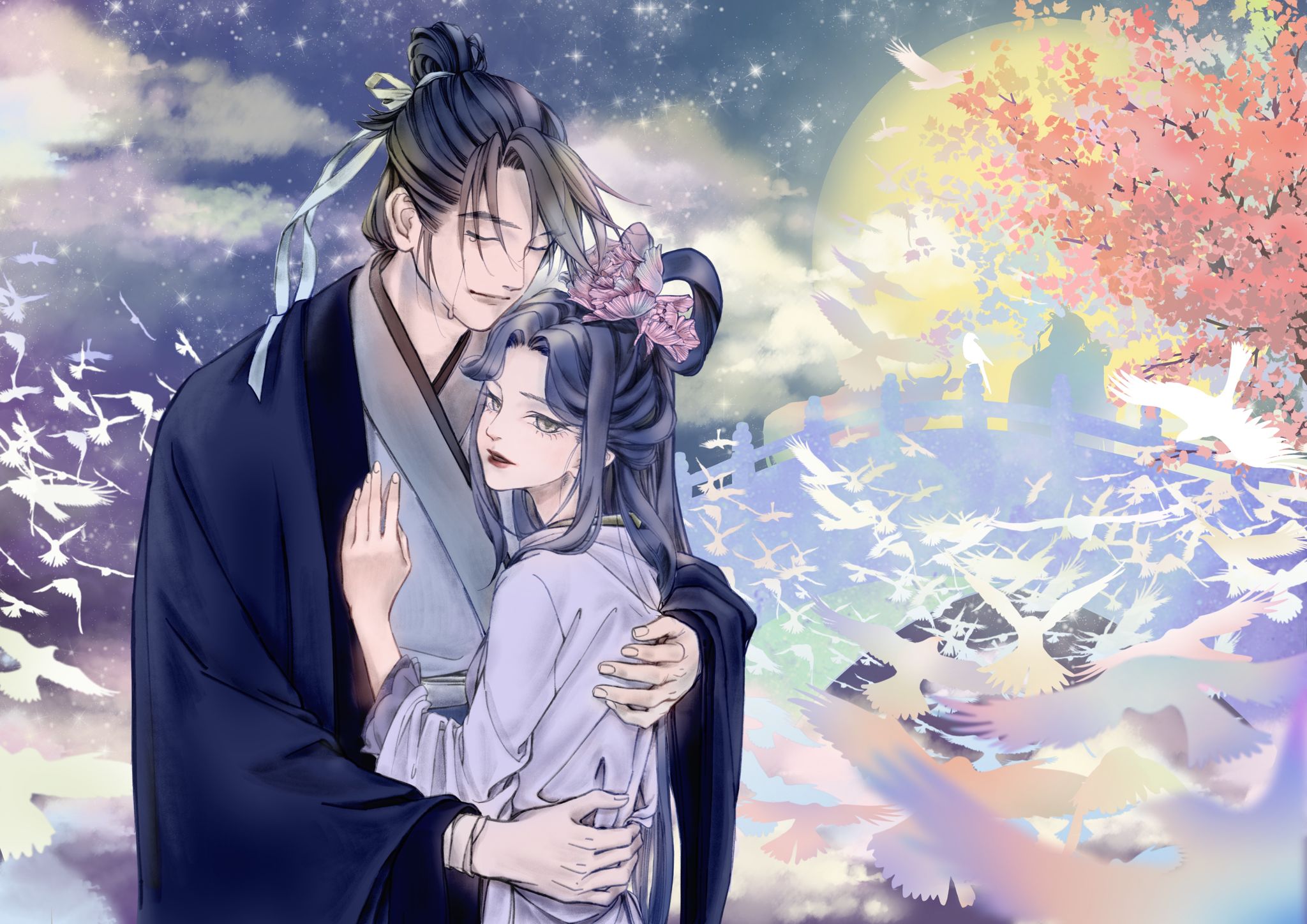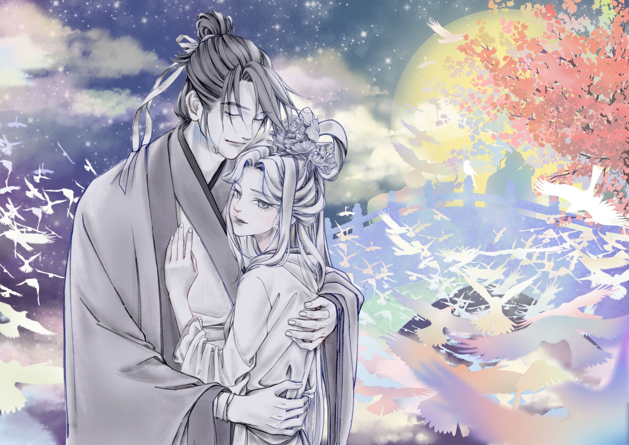 一年一次的相会让重逢的时刻弥足珍贵,两人相拥在鹊桥之上,千万万语化作滚烫的泪水滑落脸颊。