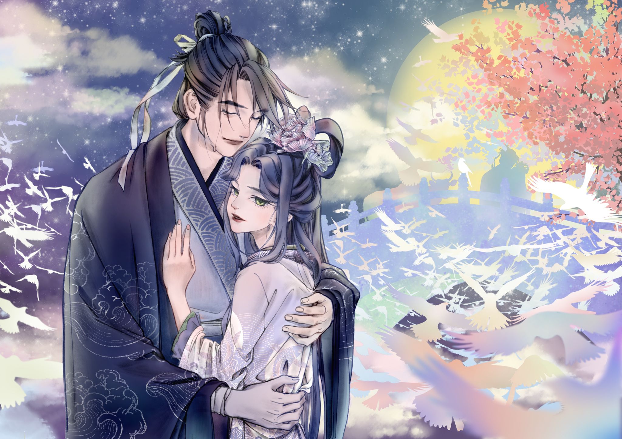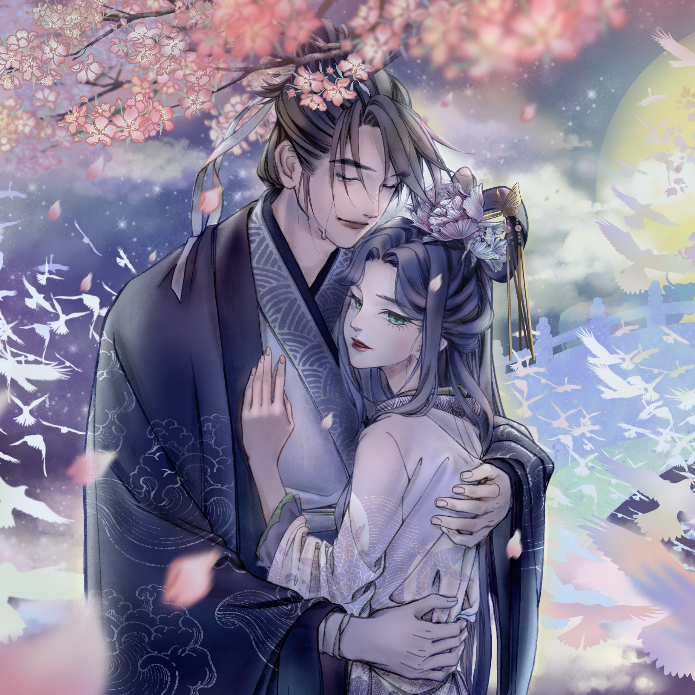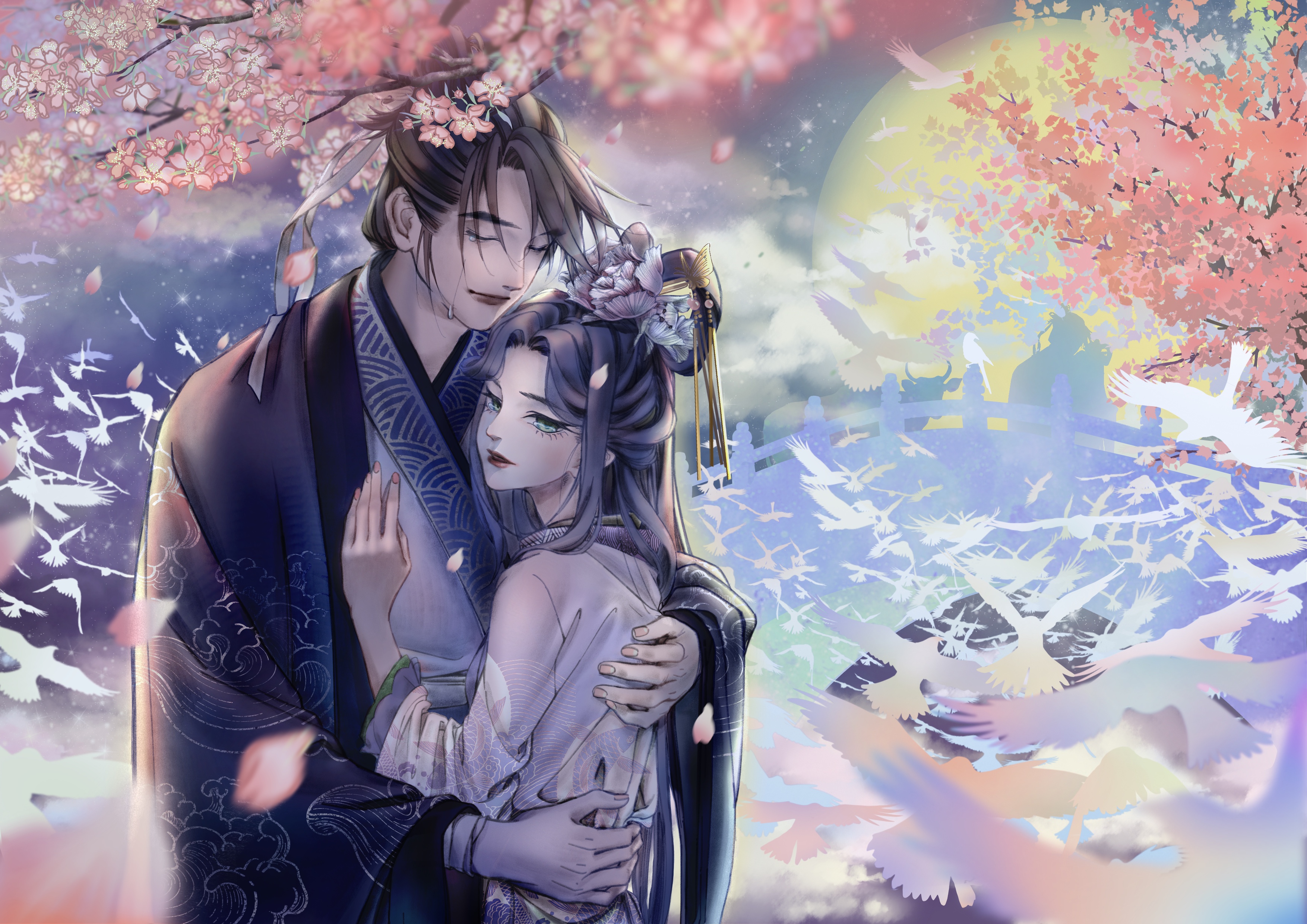 一年一次的相会让重逢的时刻弥足珍贵,两人相拥在鹊桥之上,千万万语化作滚烫的泪水滑落脸颊。