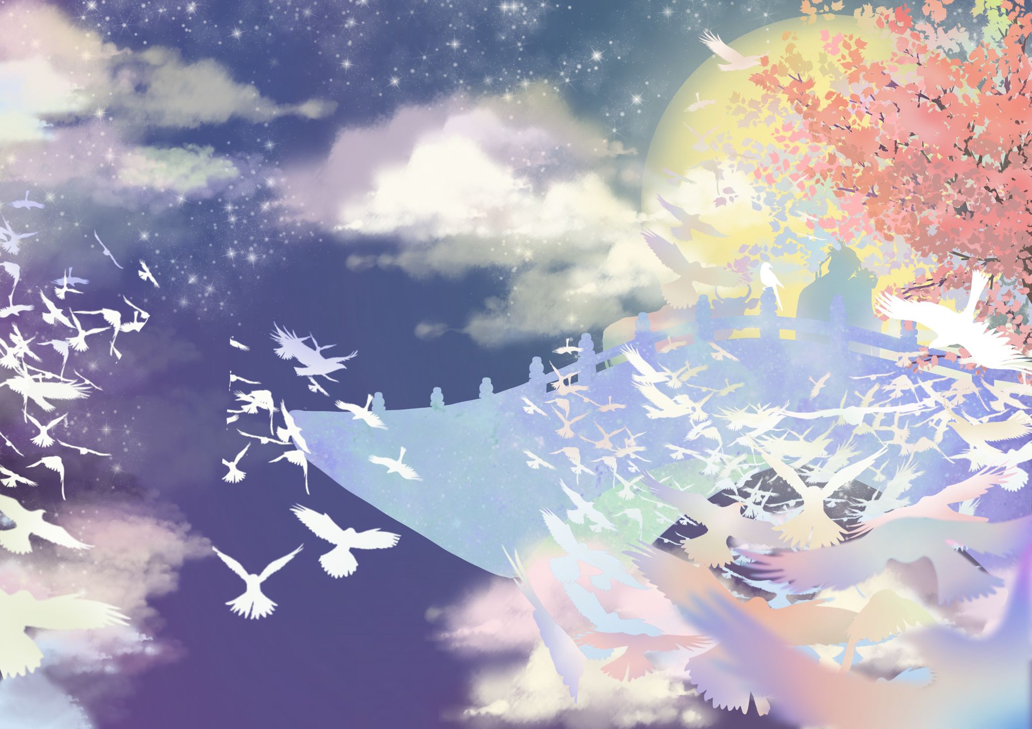传说织女因私嫁凡人而惹怒天帝,天帝责令他们分离,只允许他们每年的农历七月七日相会一次。他们坚贞的爱情感动了喜鹊,无数喜鹊用身体搭成一道跨越天河的喜鹊桥,牛郎织女得以在天河上相会。