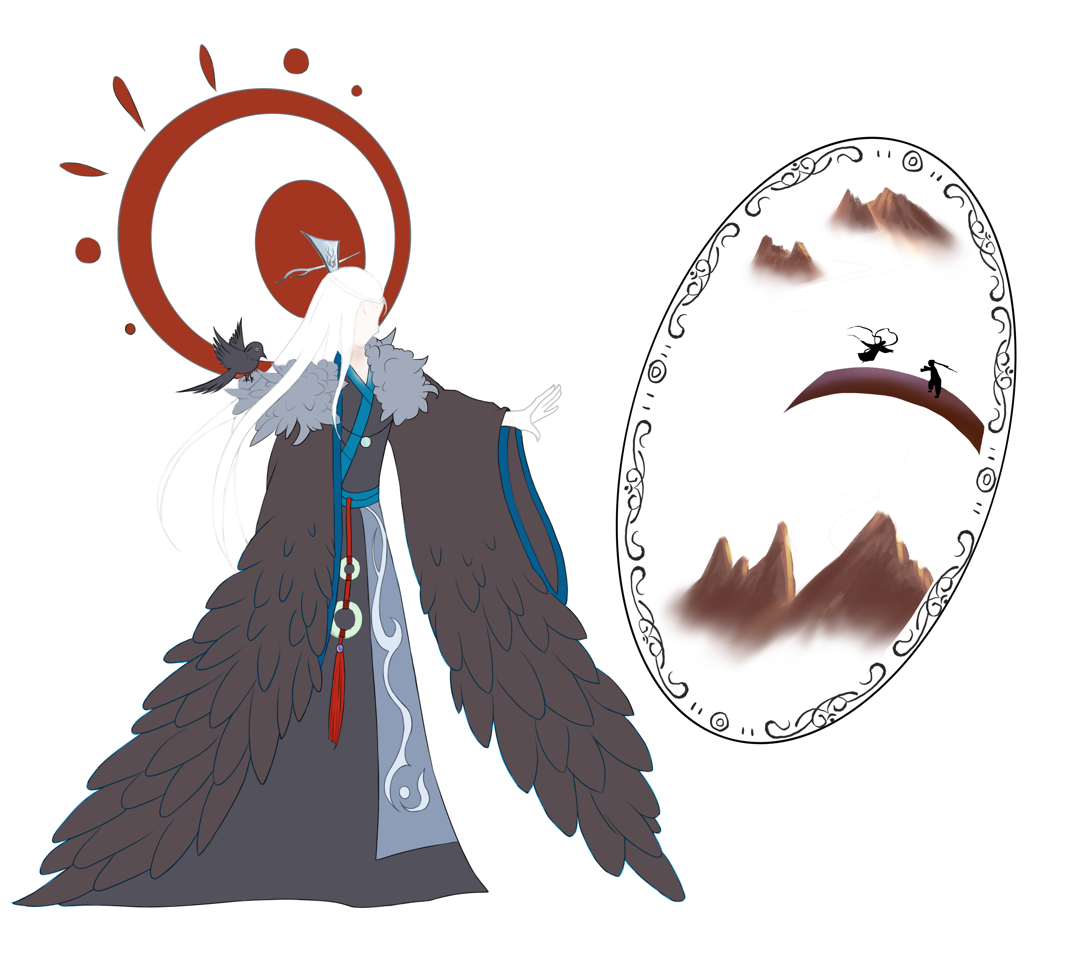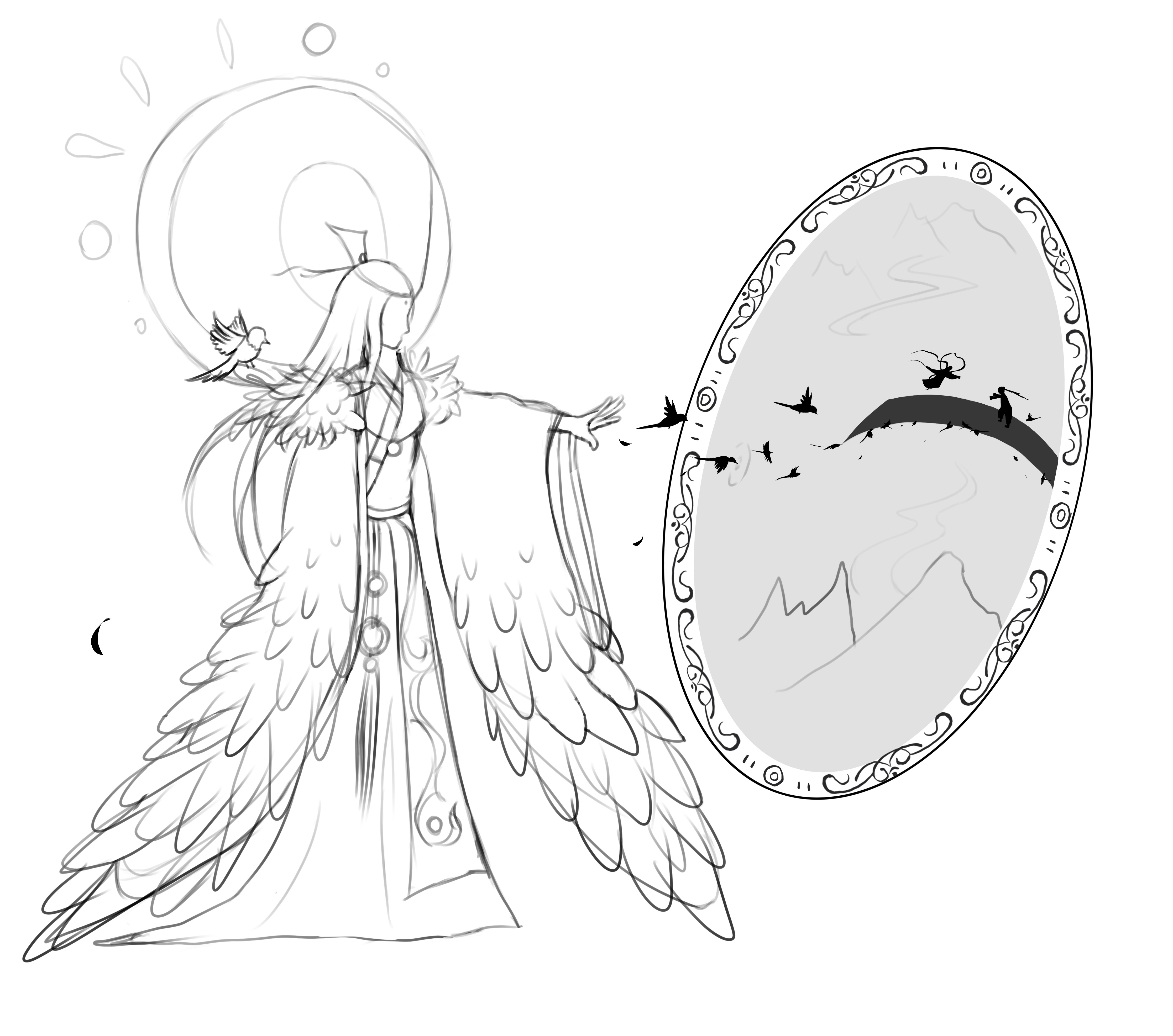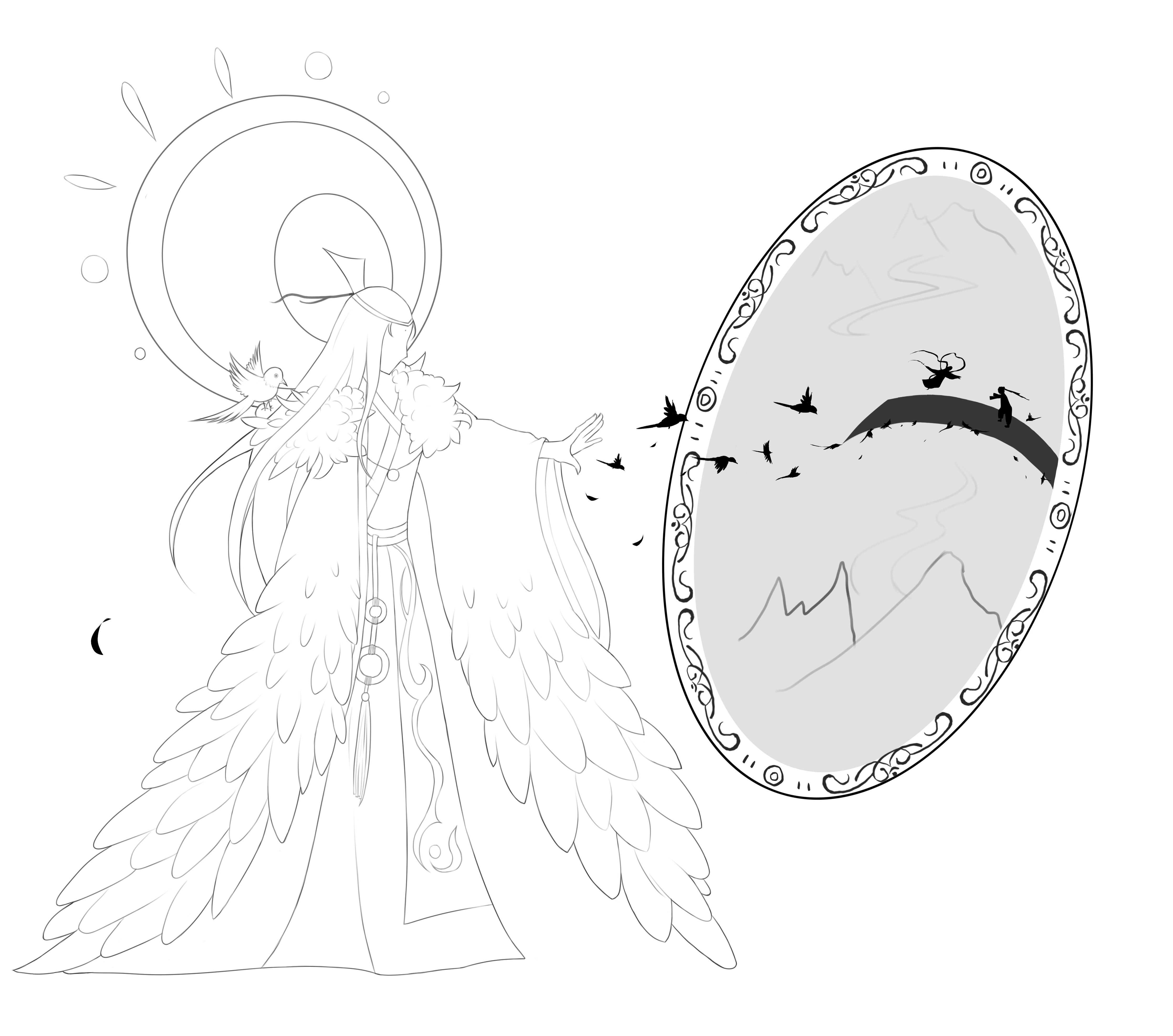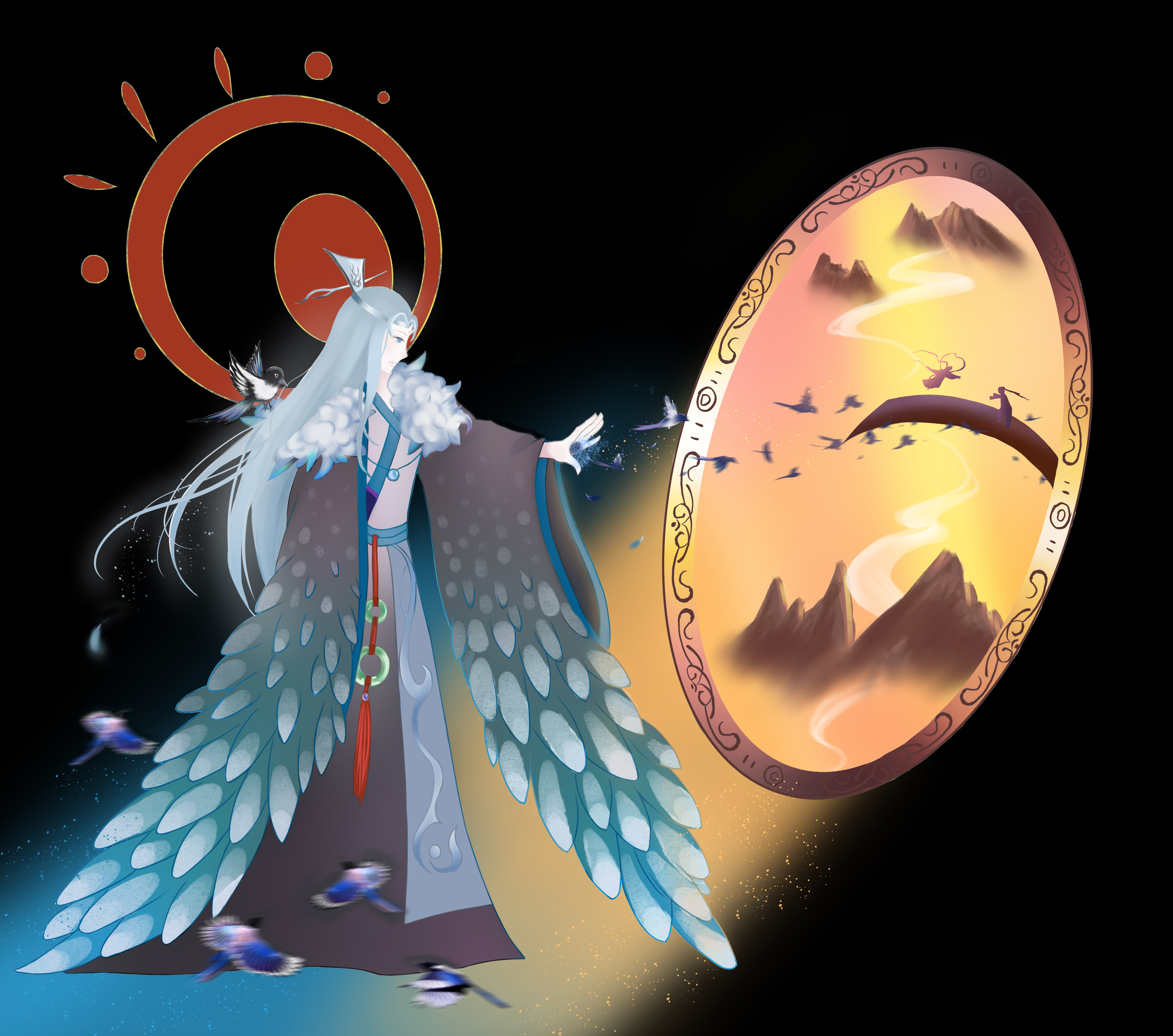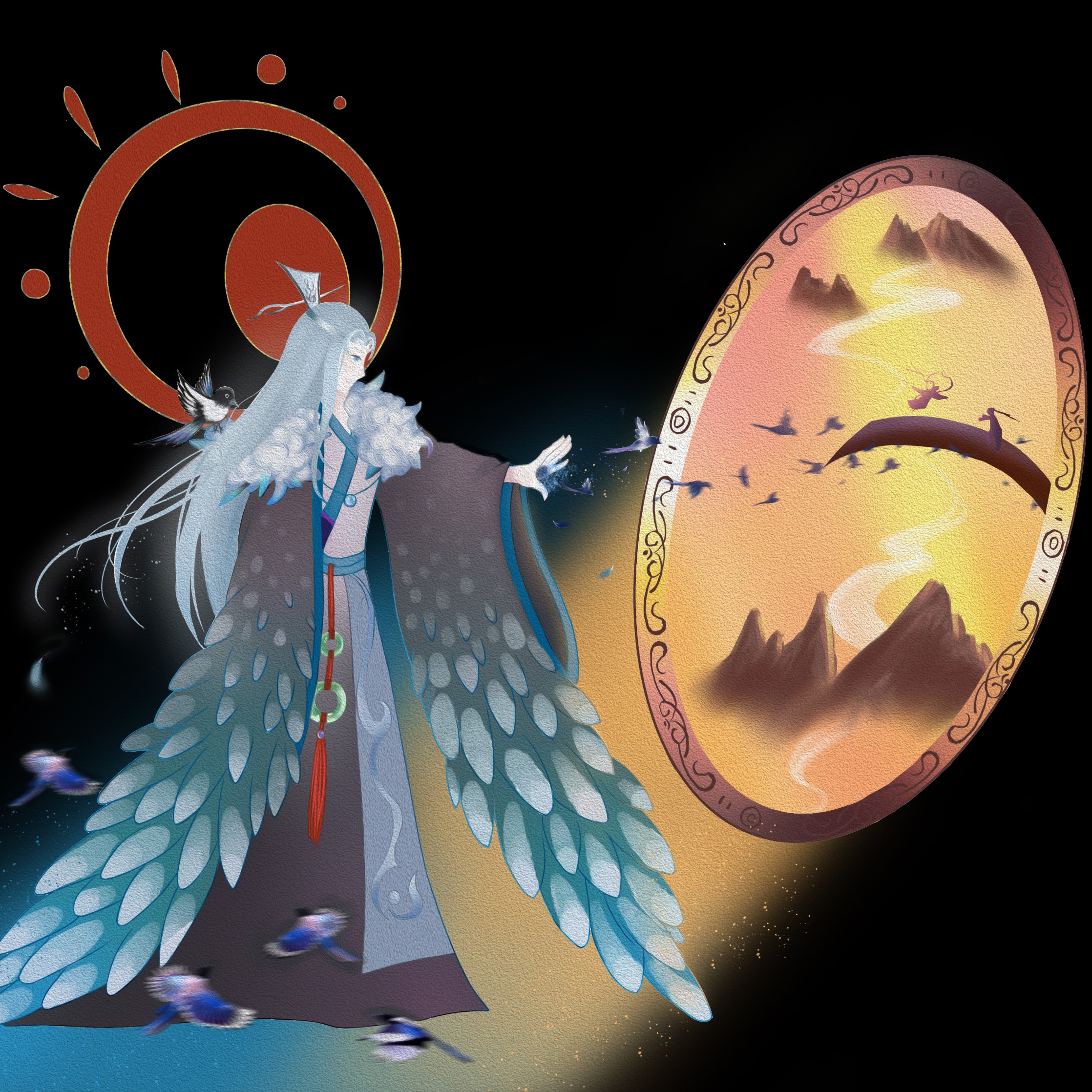 镜子里充满了光明与美好,寓意着爱情。而喜鹊精所在之处却是一片黑暗,温暖的光明是通过镜子里的光照射出来的,寓意着喜鹊精很孤独,那光寓意着帮助他的恩人获得到的一些异样的情绪。冷色代表难过,暖色代表幸福,他喜欢的恩人喜欢别人,所以他很难过,但是他看到他的恩人很开心,于是他也就很开心。妖精,就是这样单纯的生物啊。