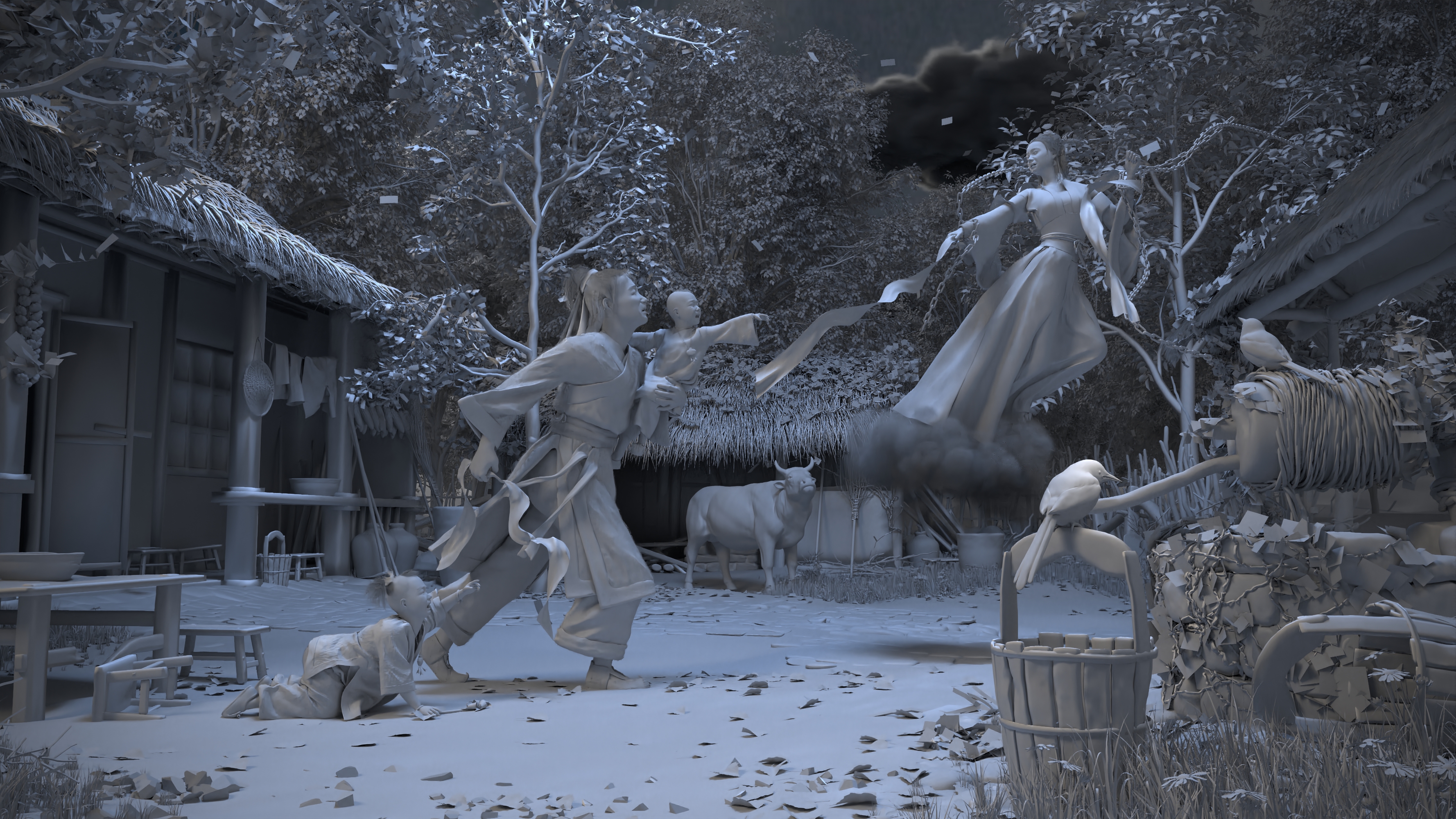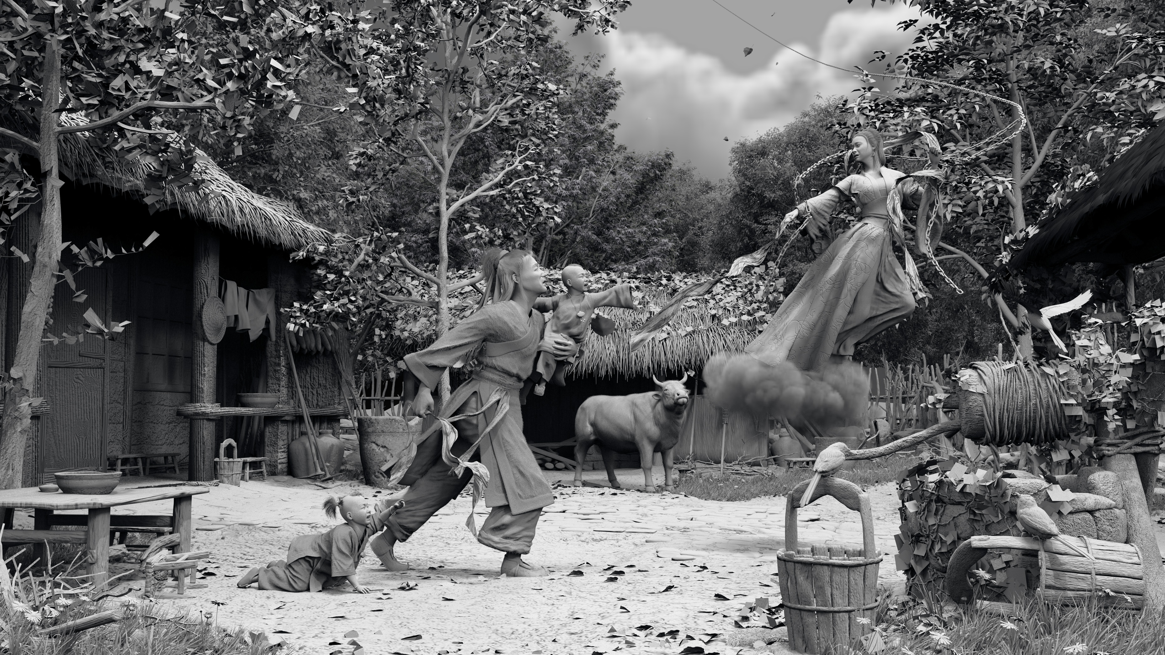 牛郎与织女合后,在人间尤乐。一日,牛郎方抱幼子,与大儿戏,织女在家里缝衣,一家乐融,欢声笑语。忽然,天隆隆声,阴云密布,迅雷震电。一铮铮铁自天降,锁织女手,铁锁带法,将织女引至屋外。牛郎大惊,坚执女之双手不释,二子惊,哭成团。当是时,空传一道震耳之声:织女犯天律,与凡人永通合,今将其捉还宫,由王母命。牛郎抱子追出外,大子仆地,老牛亦出棚,然织女已带去空中,与永留者,二哭之子与半段拉断之稠带尔……