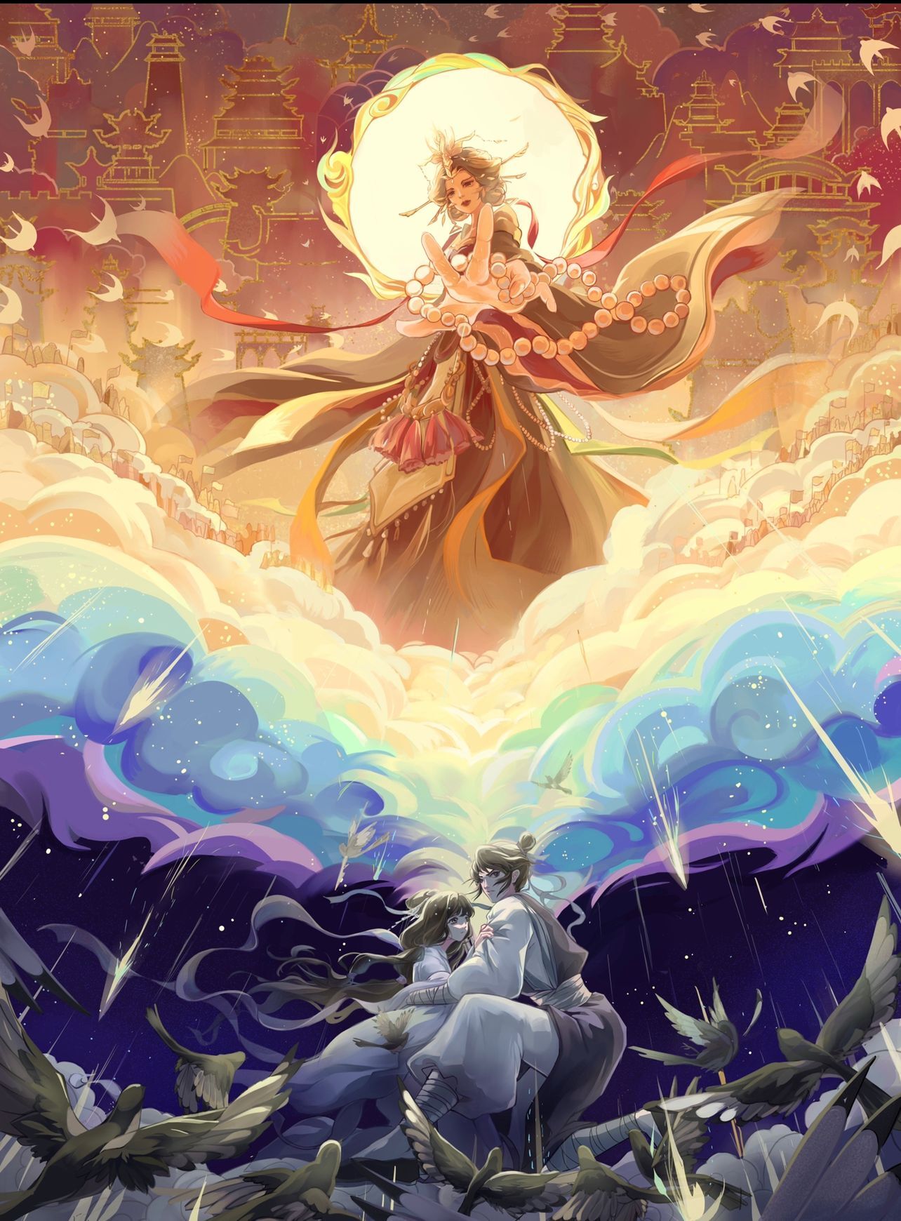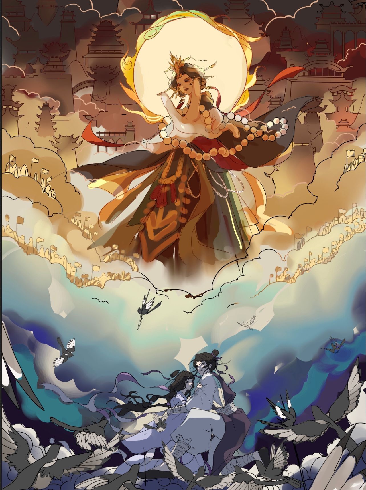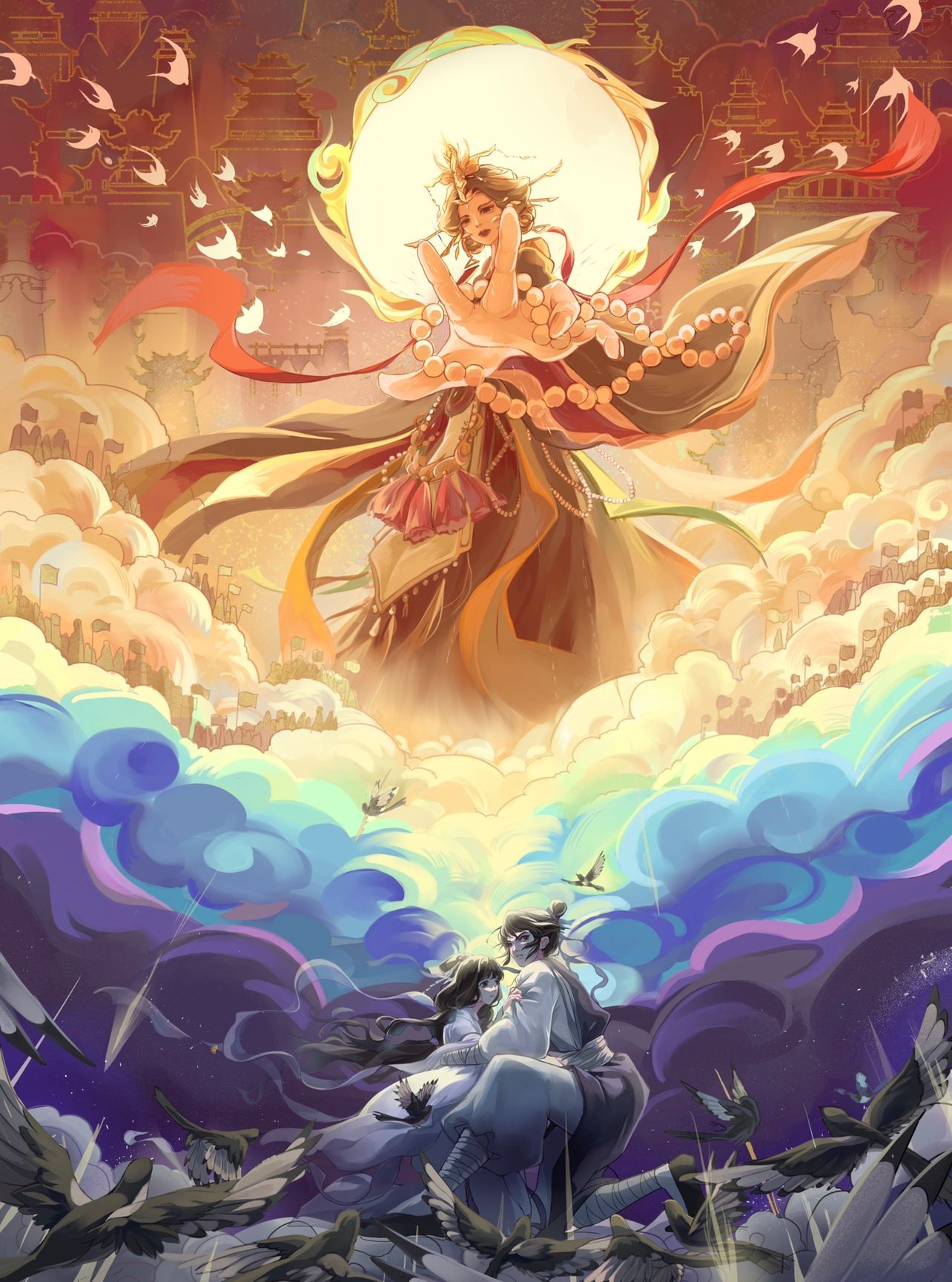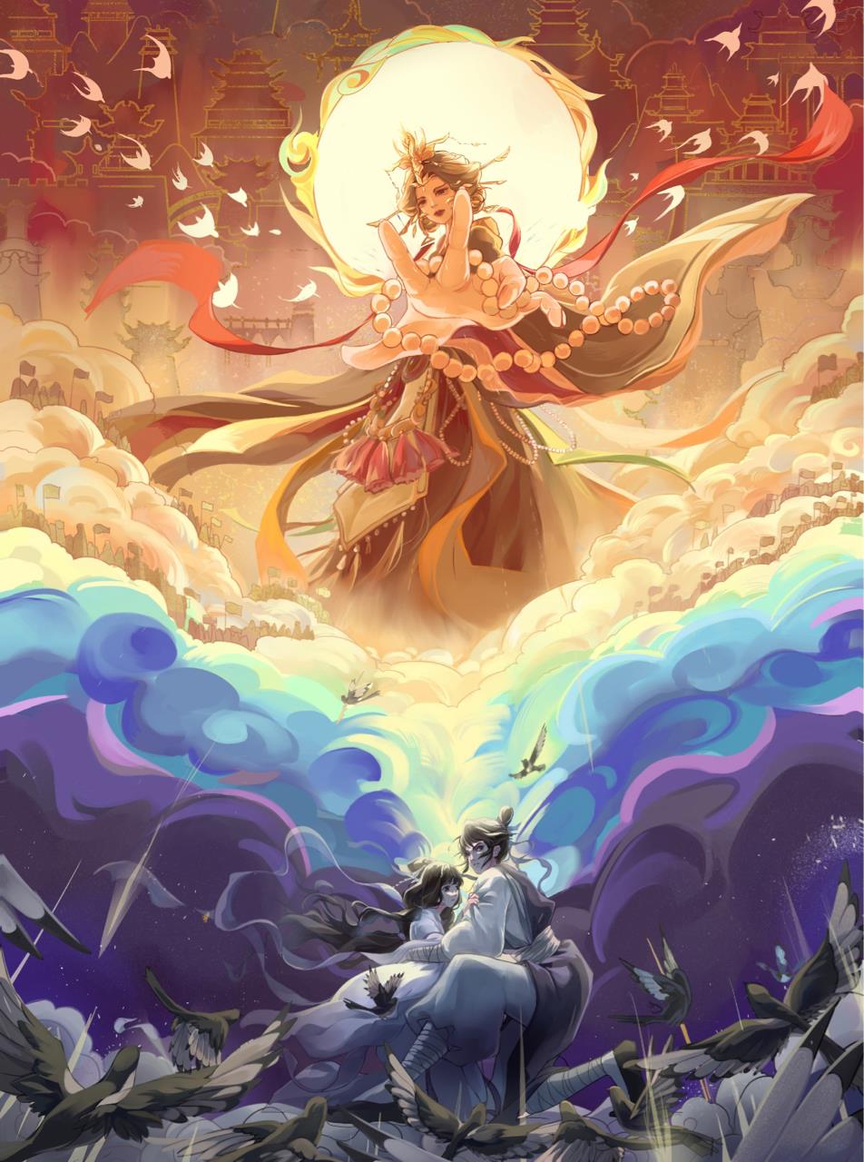 运用了伪厚涂外加平面装饰画的手法完成了这幅作品。通幅用了较多的对比,如比较纯的对比色、巍峨的天宫和静谧的星空的对比、前后远近的虚实对比、在立体构成这方面的大小对比(如王母和天兵天宫的大小对比)。还有比较明显的一点透视,用光剑、王母的衣服和天宫飞燕等元素增加视觉引导,这些元素指向她的掌心,也体现出王母的威严和绝对的权利。