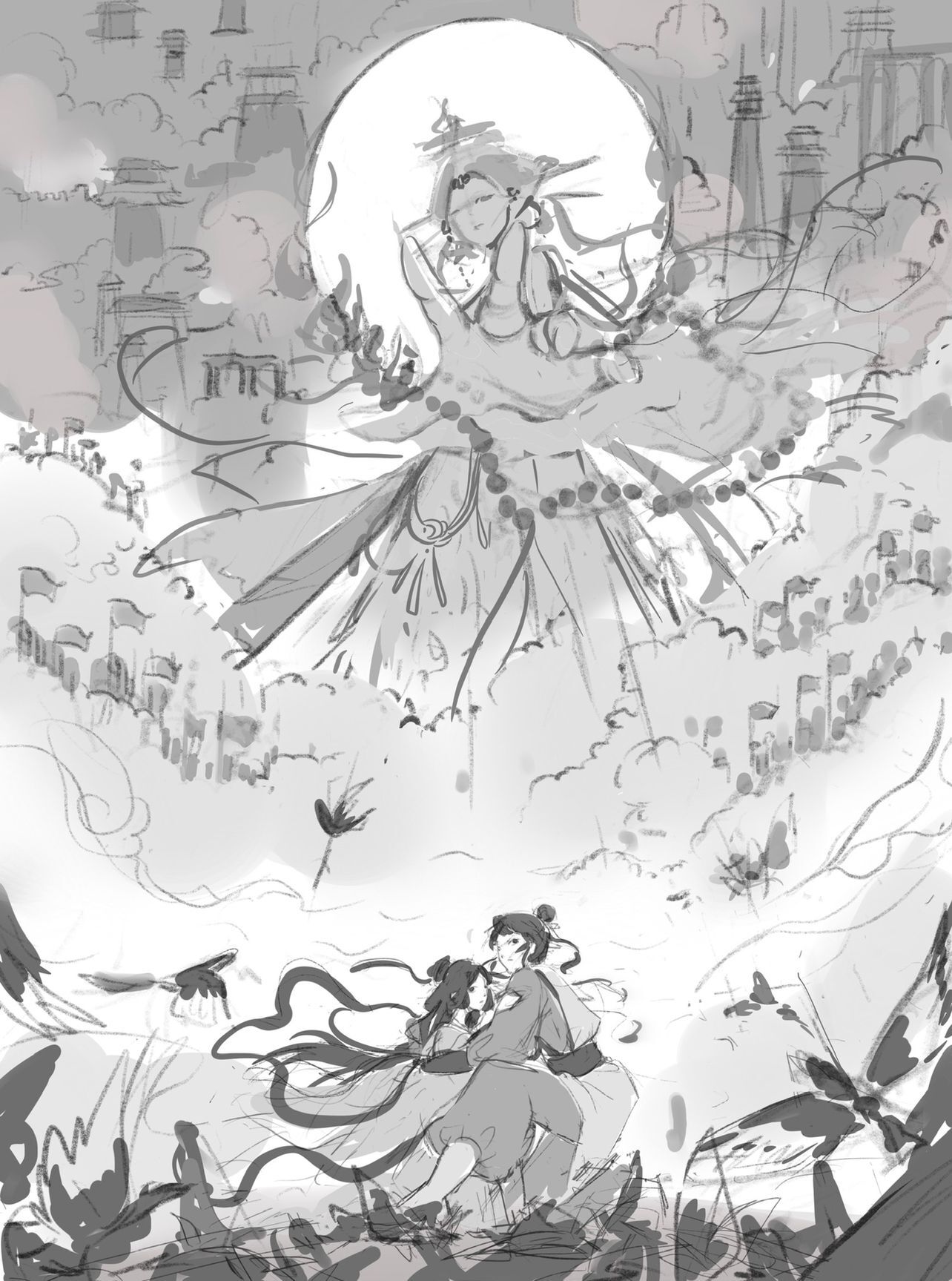 画面描绘的是牛郎织女相逢之时,王母前来破坏鹊桥阻止二人相见的情景。