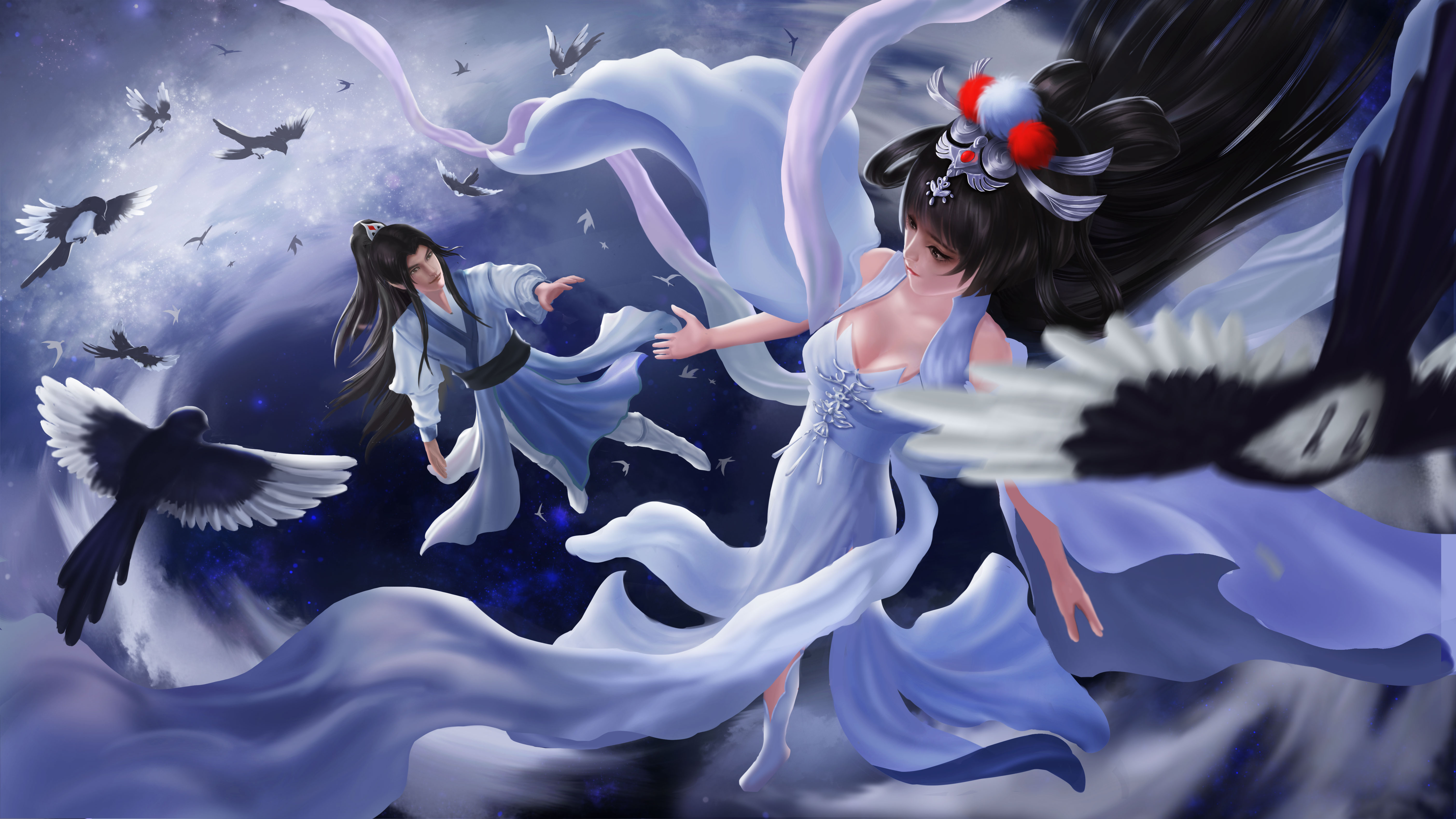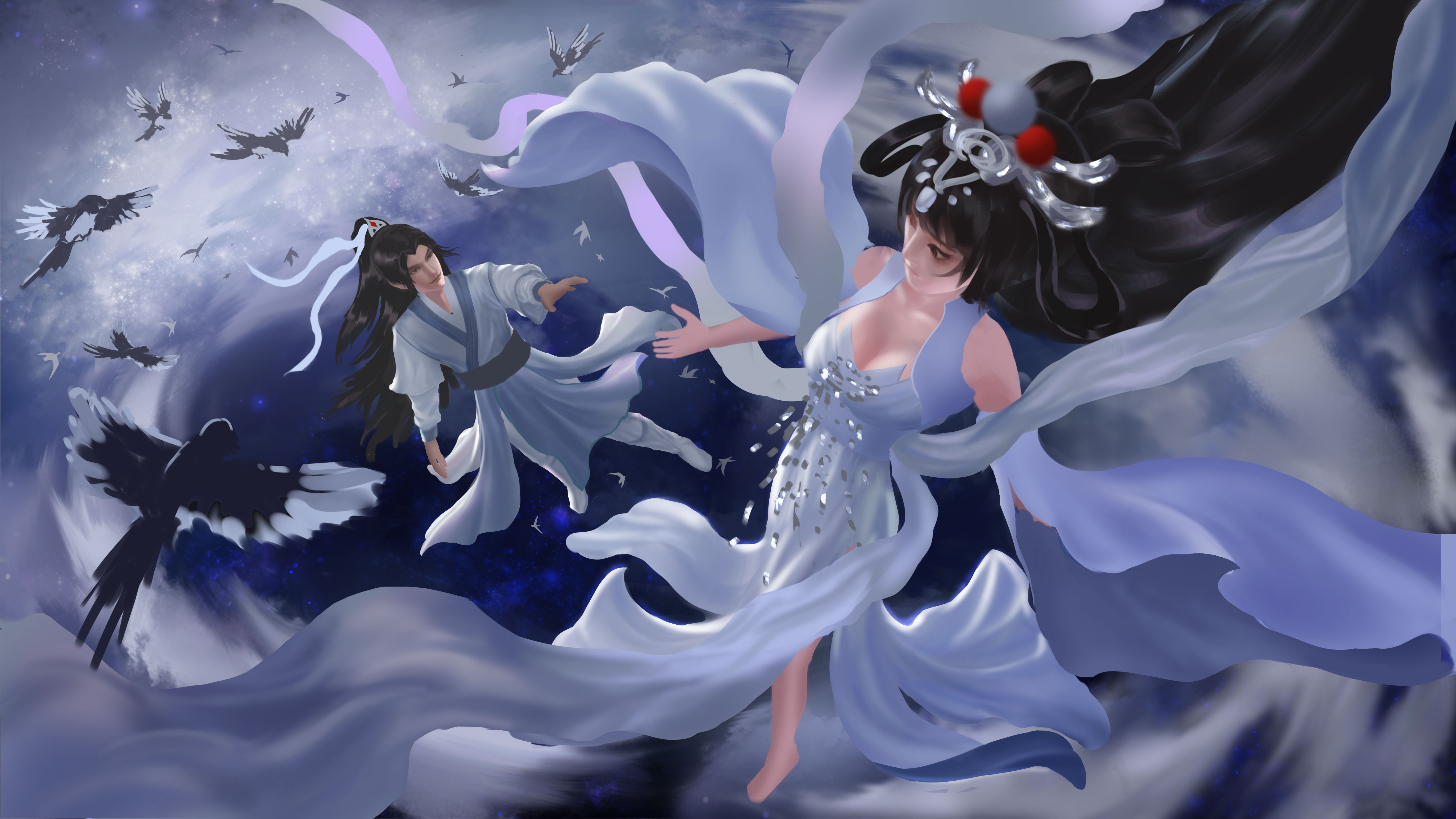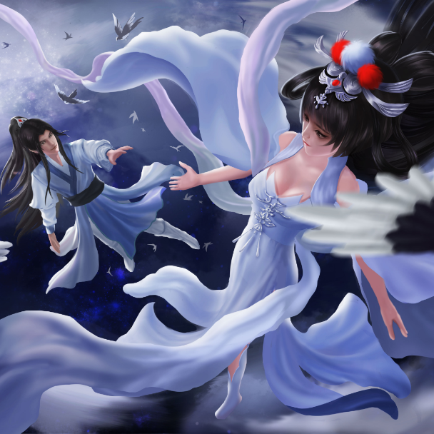 七夕节,牛郎织女在遥远星河相会,两人穿梭在星云中,身边飞舞着喜鹊和云团,画面正描绘两人相见的喜悦之情。