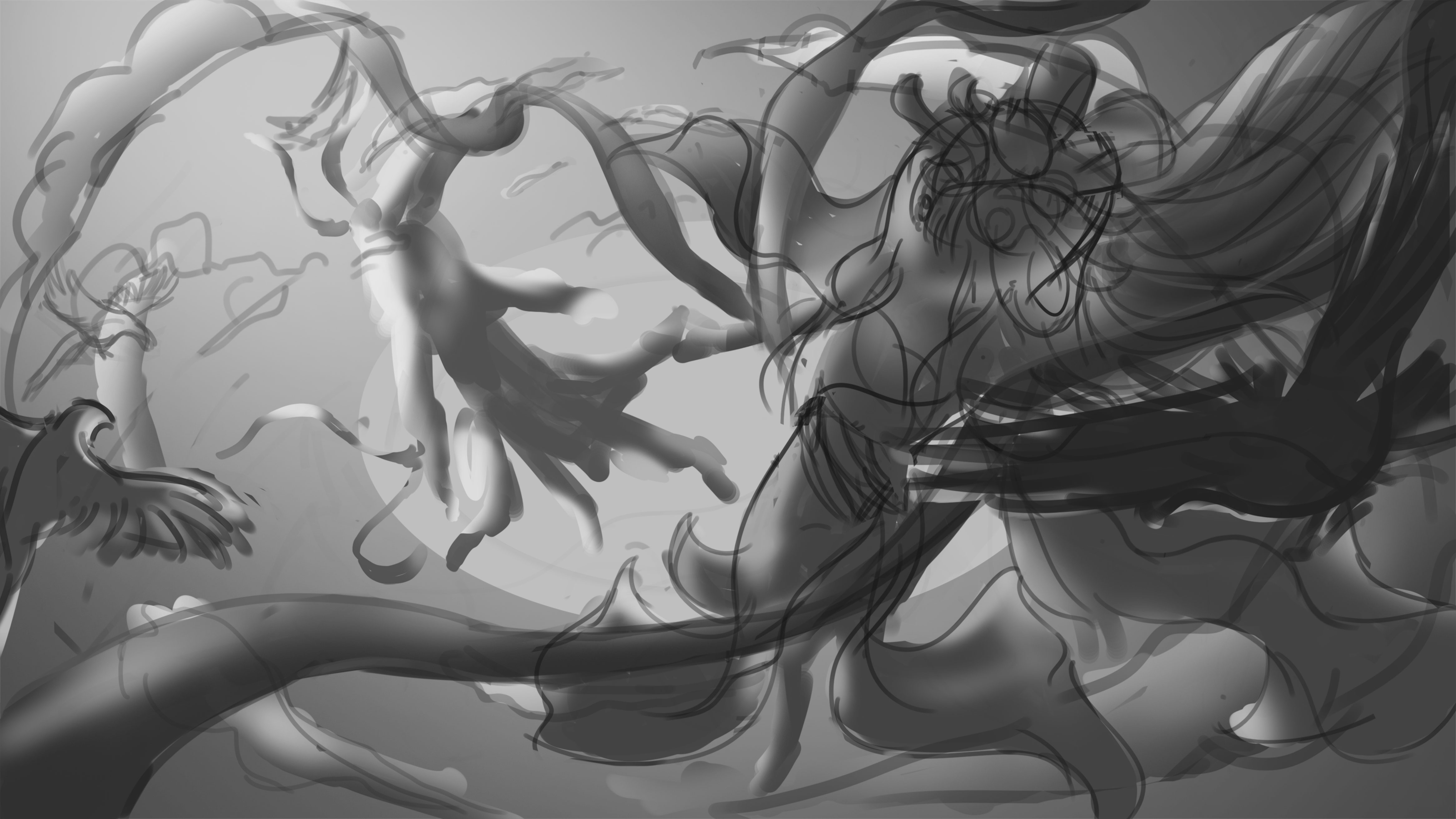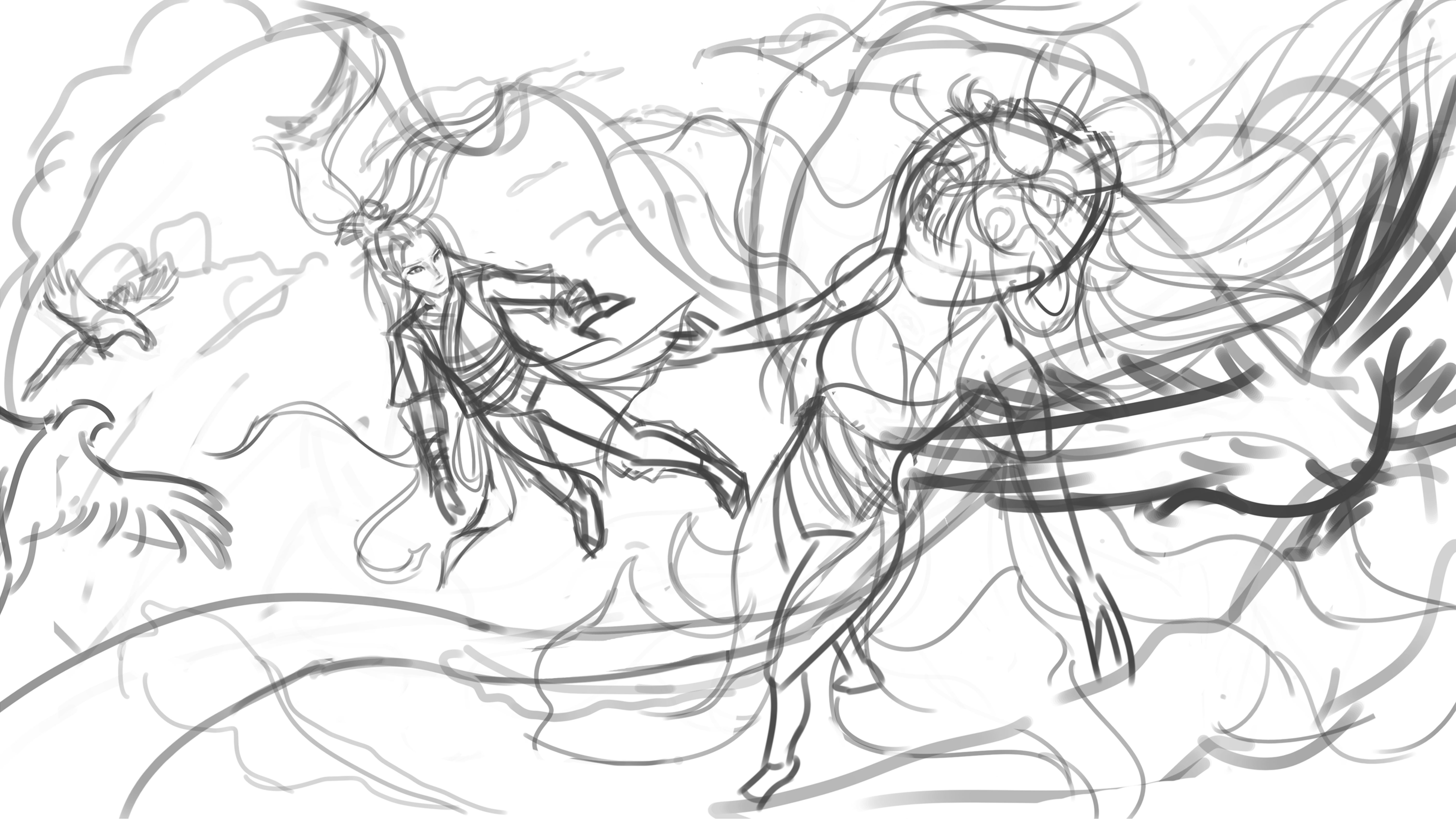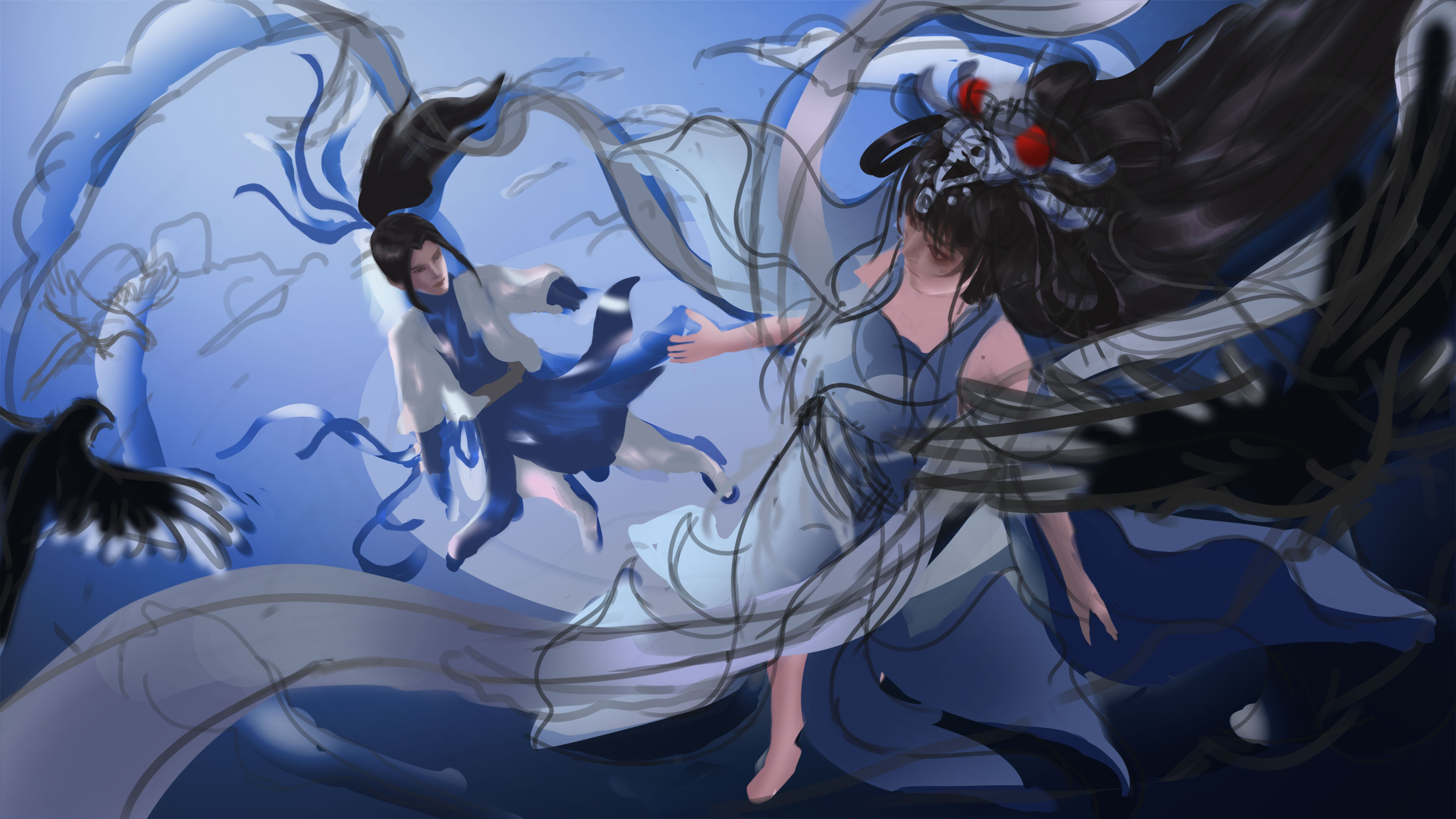 七夕节,牛郎织女在遥远星河相会,两人穿梭在星云中,身边飞舞着喜鹊和云团,画面正描绘两人相见的喜悦之情。