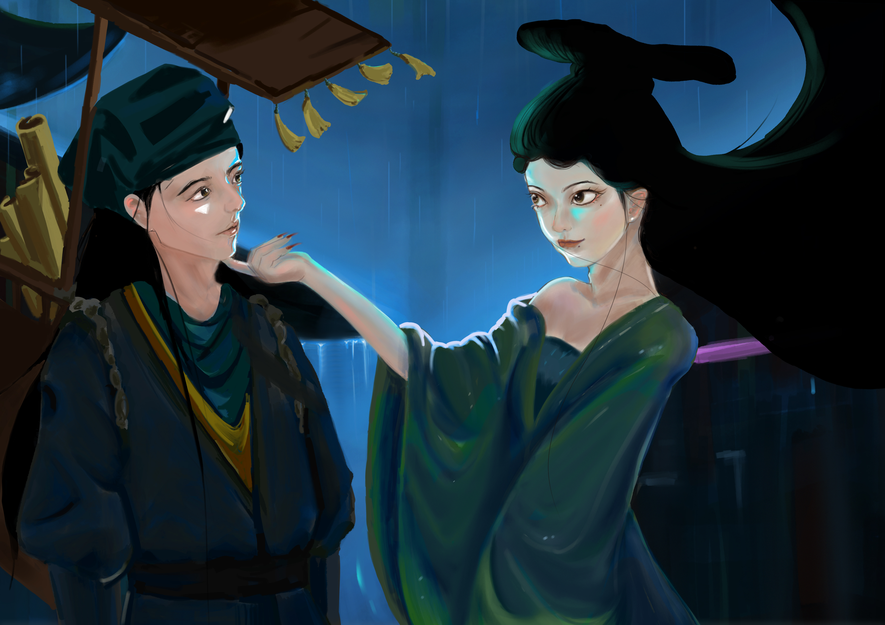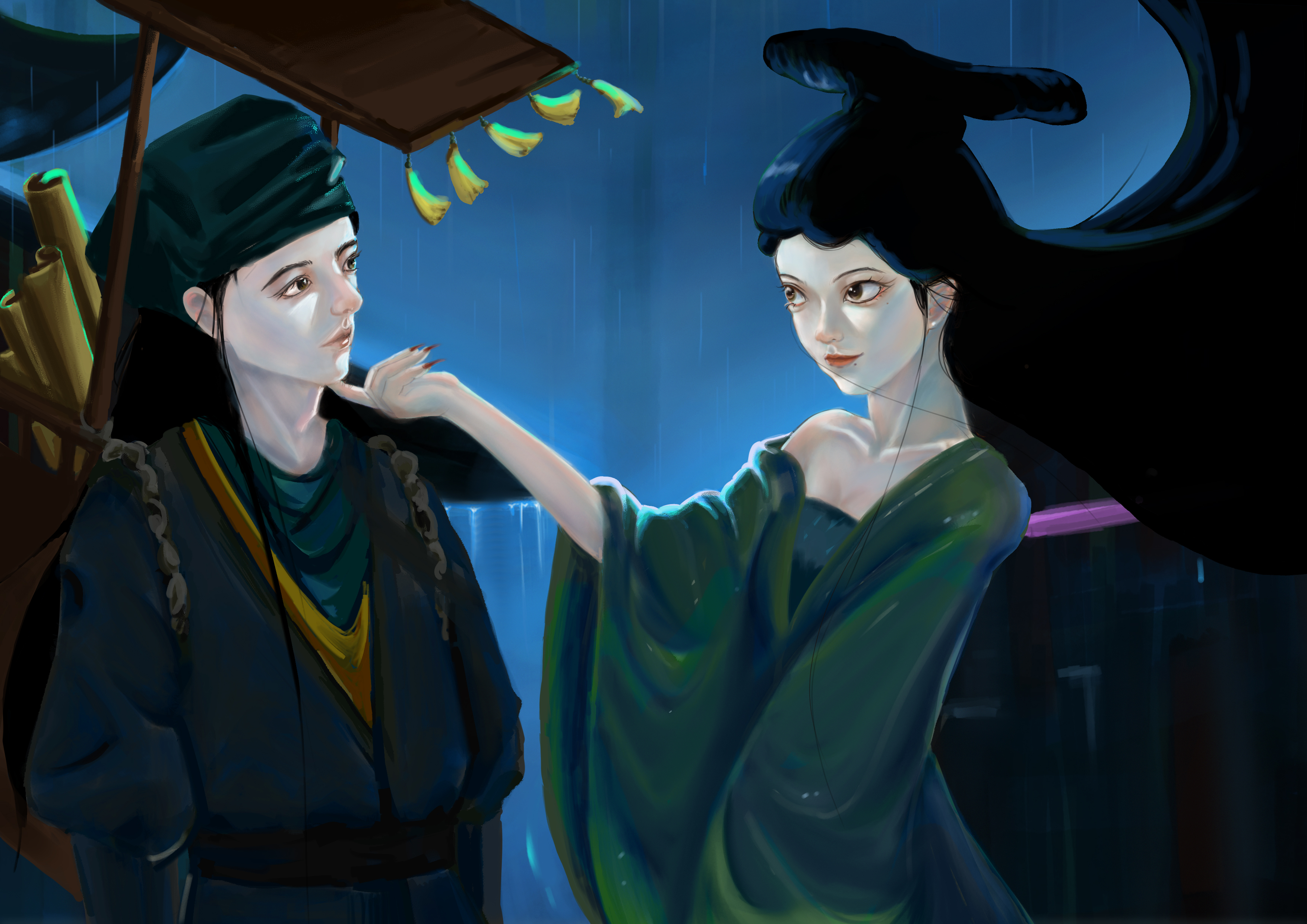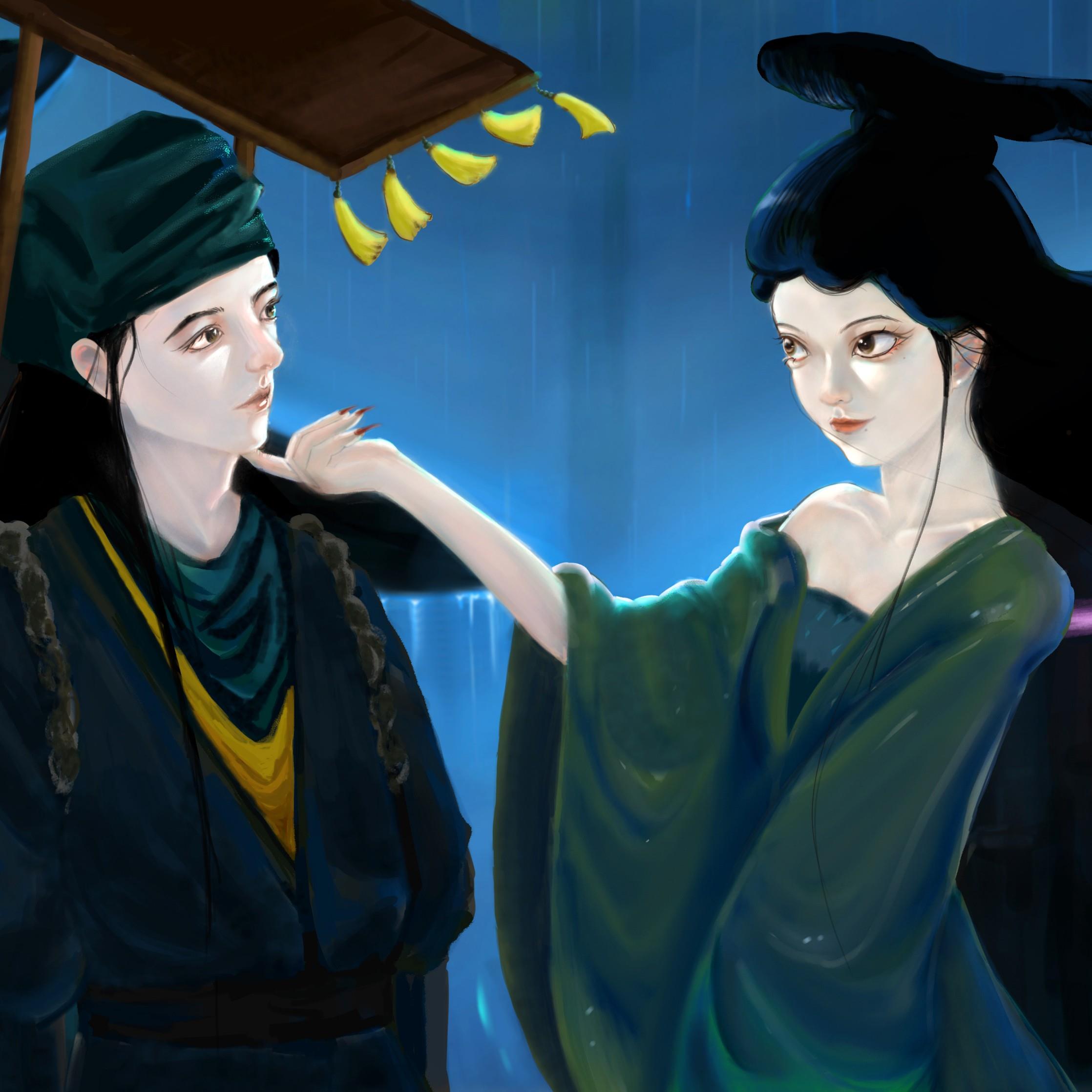 作品来源于蒲松龄的小说《聊斋志异》中的一个故事《聂小倩》,聂小倩与宁采臣的爱情故事具有强烈反抗封建礼教精神,同时善良的聂小倩最终打动了宁采臣,最终与宁采臣结为夫妻。作品描绘了聂小倩与宁采臣的初遇,聂小倩欲引诱宁采臣的画面。