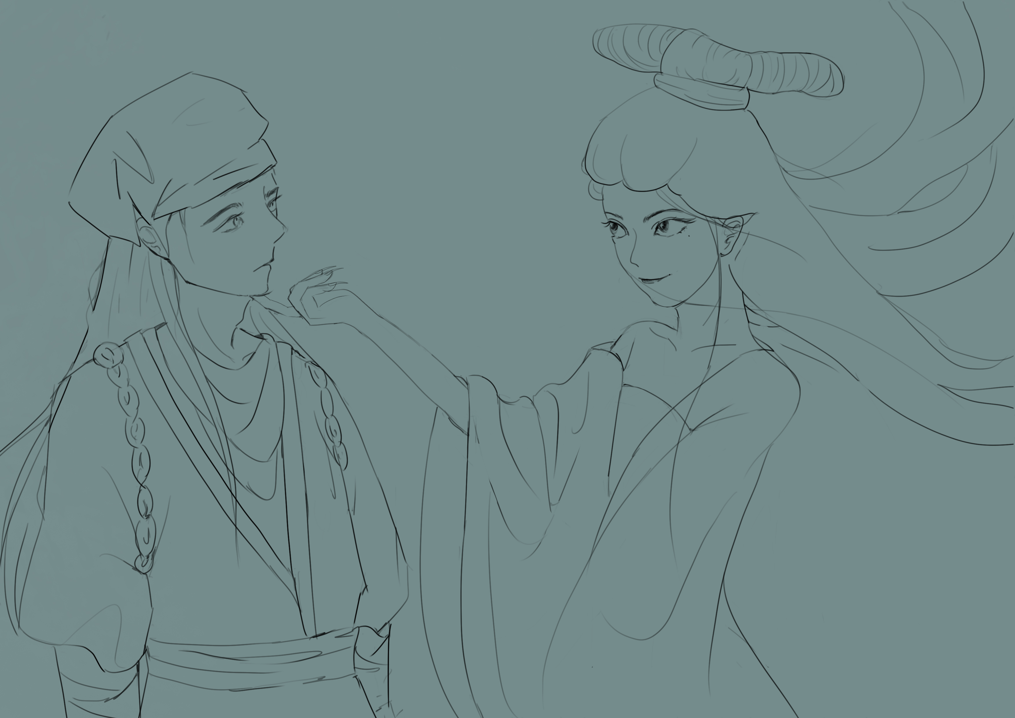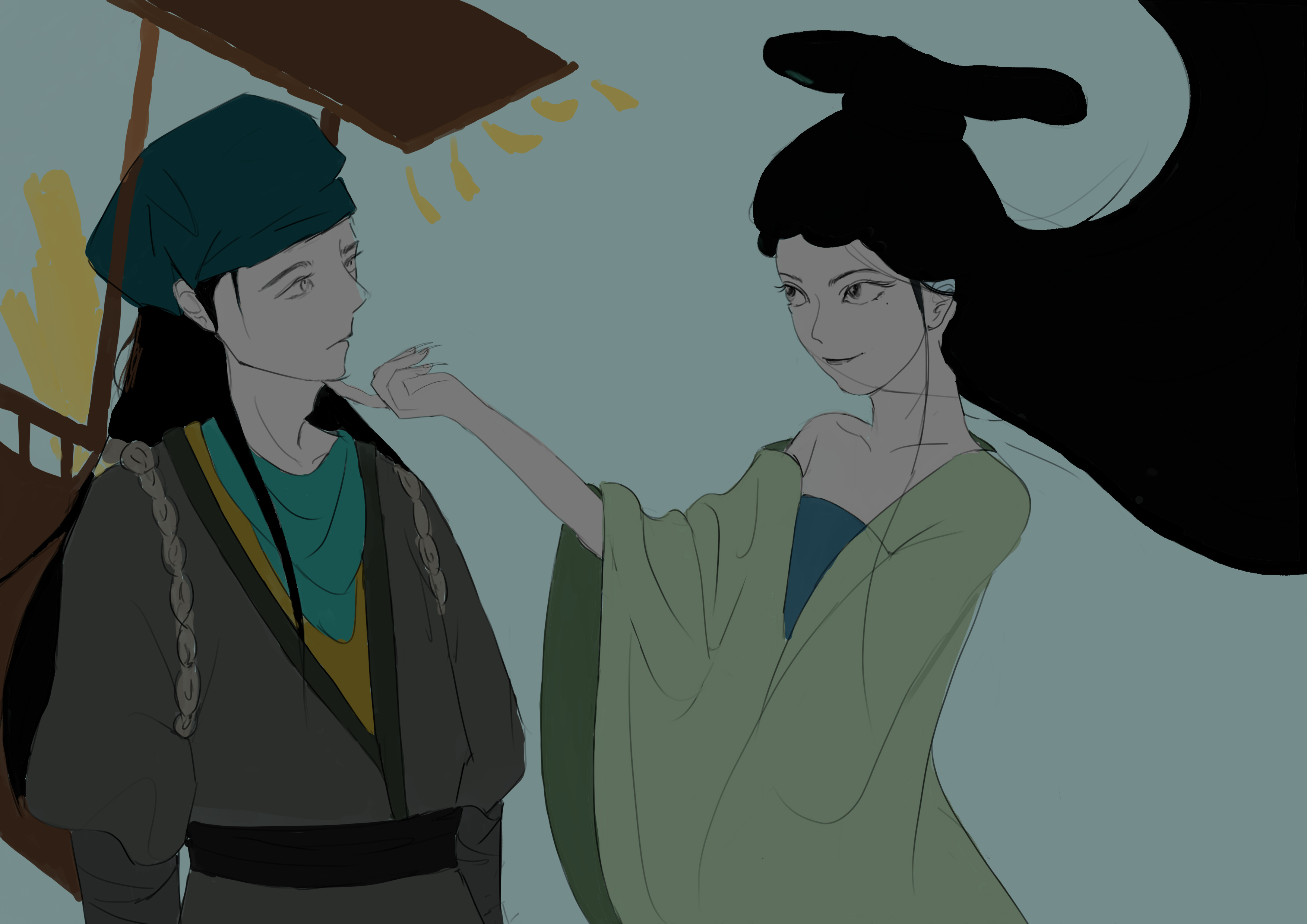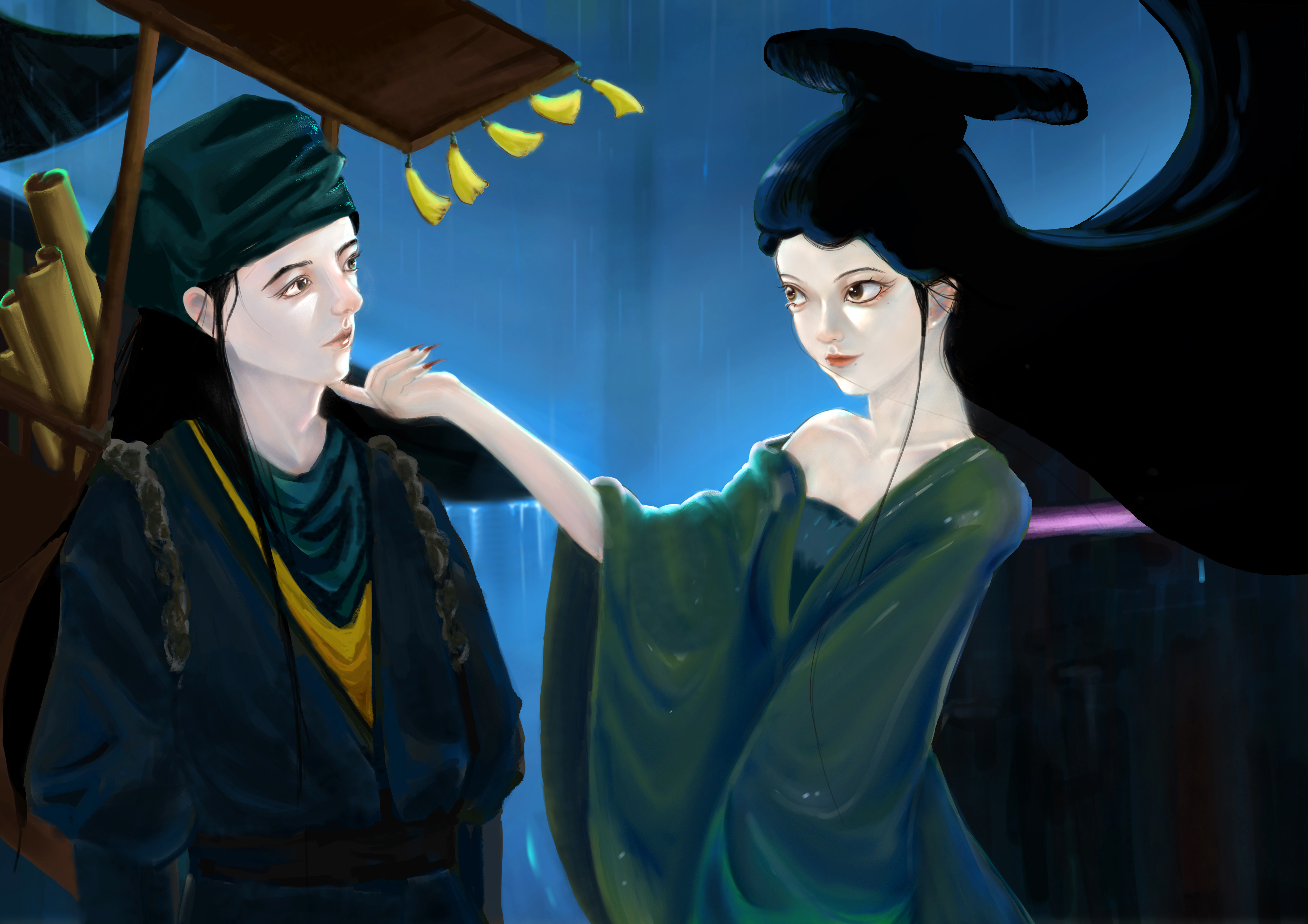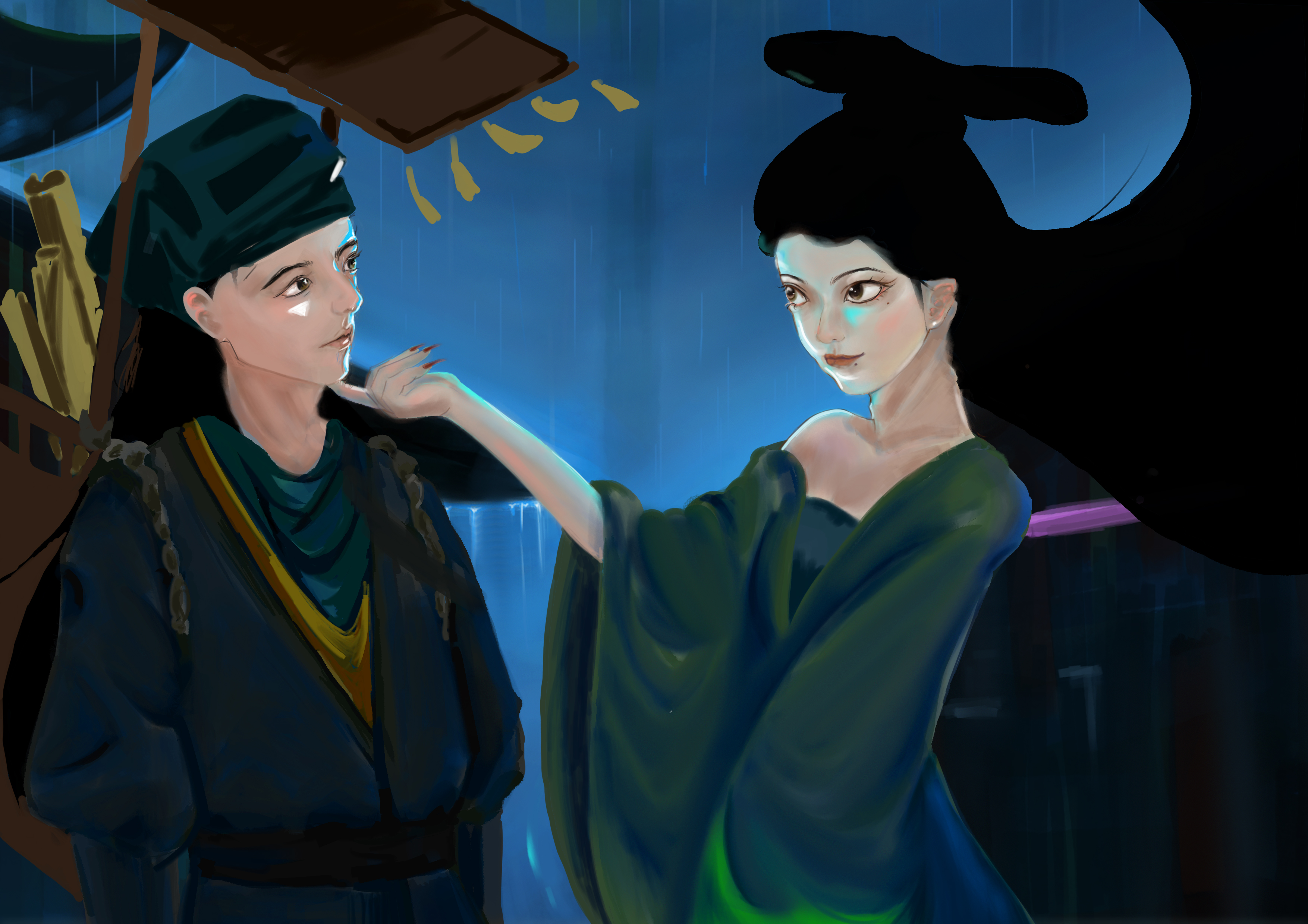 作品来源于蒲松龄的小说《聊斋志异》中的一个故事《聂小倩》,聂小倩与宁采臣的爱情故事具有强烈反抗封建礼教精神,同时善良的聂小倩最终打动了宁采臣,最终与宁采臣结为夫妻。作品描绘了聂小倩与宁采臣的初遇,聂小倩欲引诱宁采臣的画面。