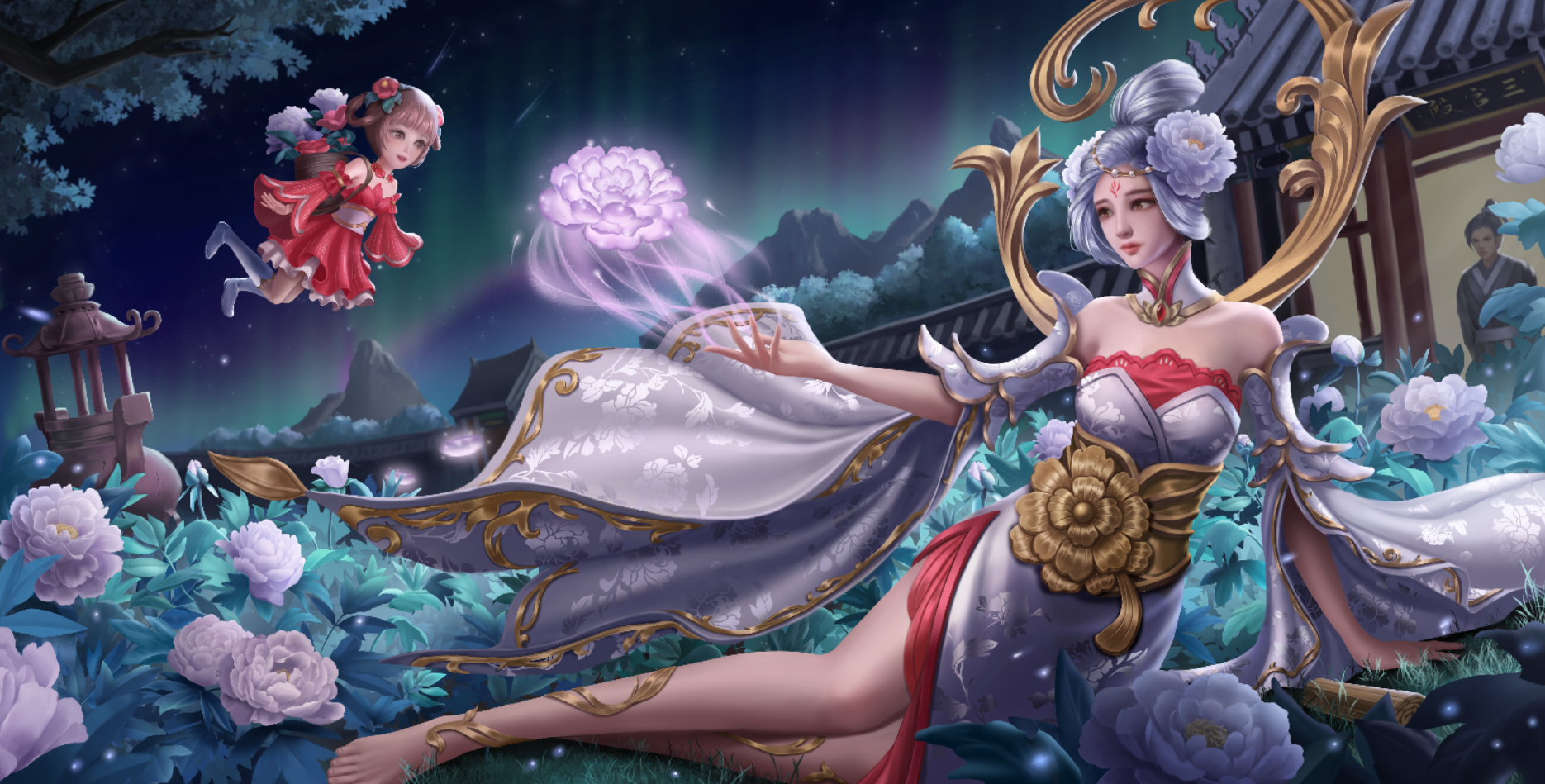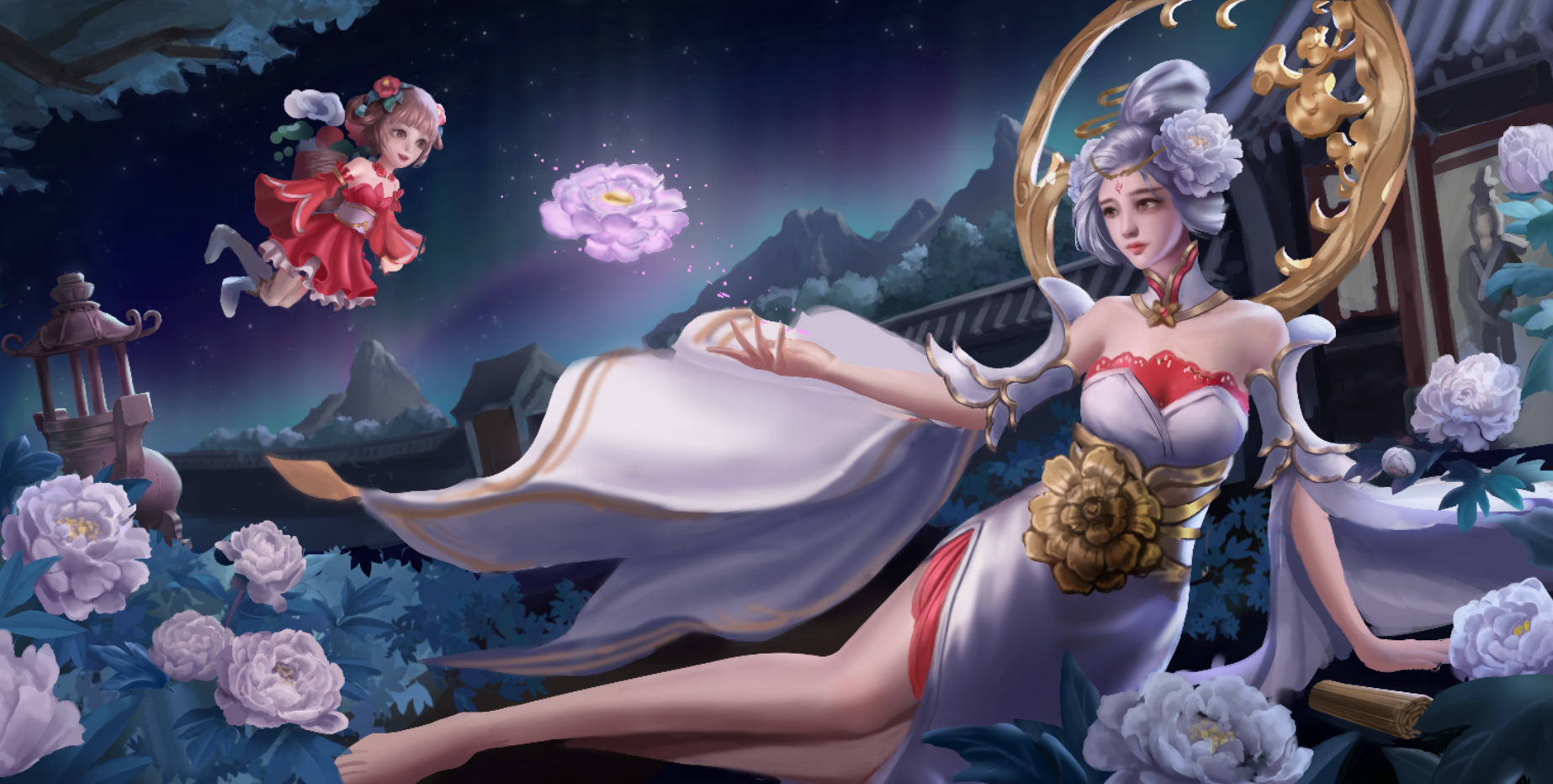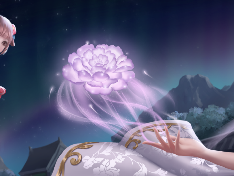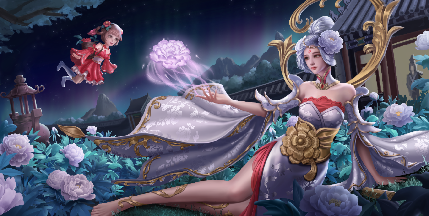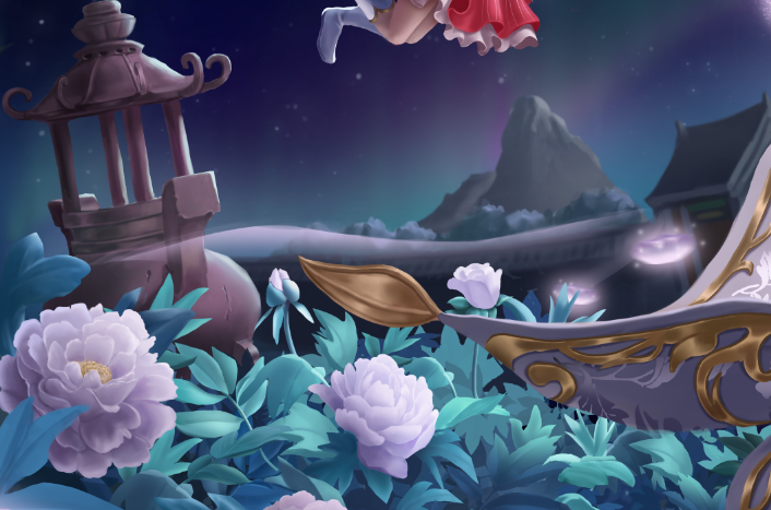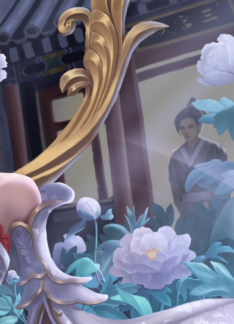根据《聊斋志异》中《香玉》篇目。画面内容取自诗句“只恐夜深花睡去,故烧高烛照红妆”,牡丹花妖香玉祭出花灯,照亮殿前种植的牡丹花,耐冬花妖绛雪幻化成花精灵,身背花篓,穿梭其间,暂居下清宫的黄生正好走出殿门目睹了这一幕。构图上采用了黄金螺旋和九宫格构图。颜色以白红蓝粉为主。
