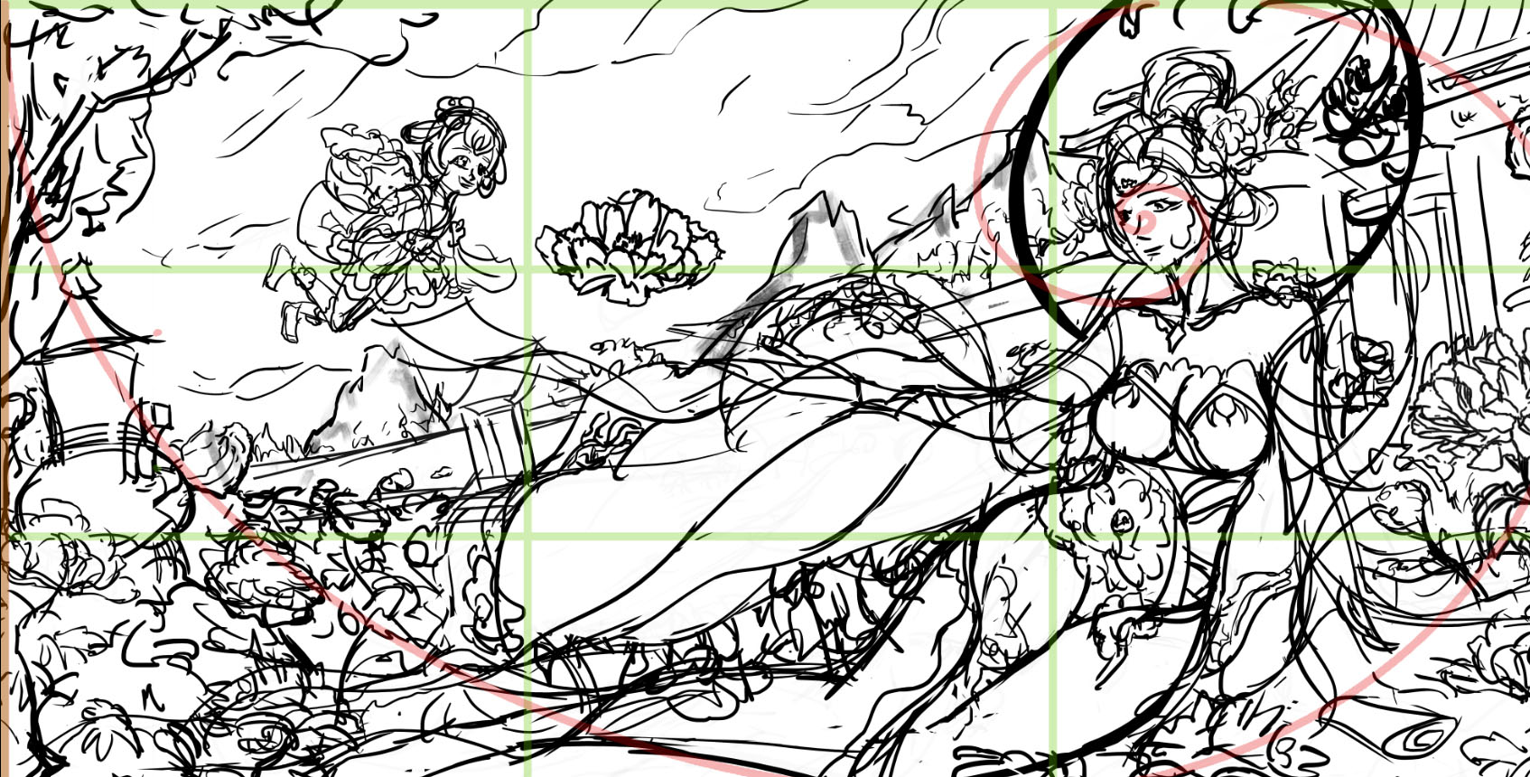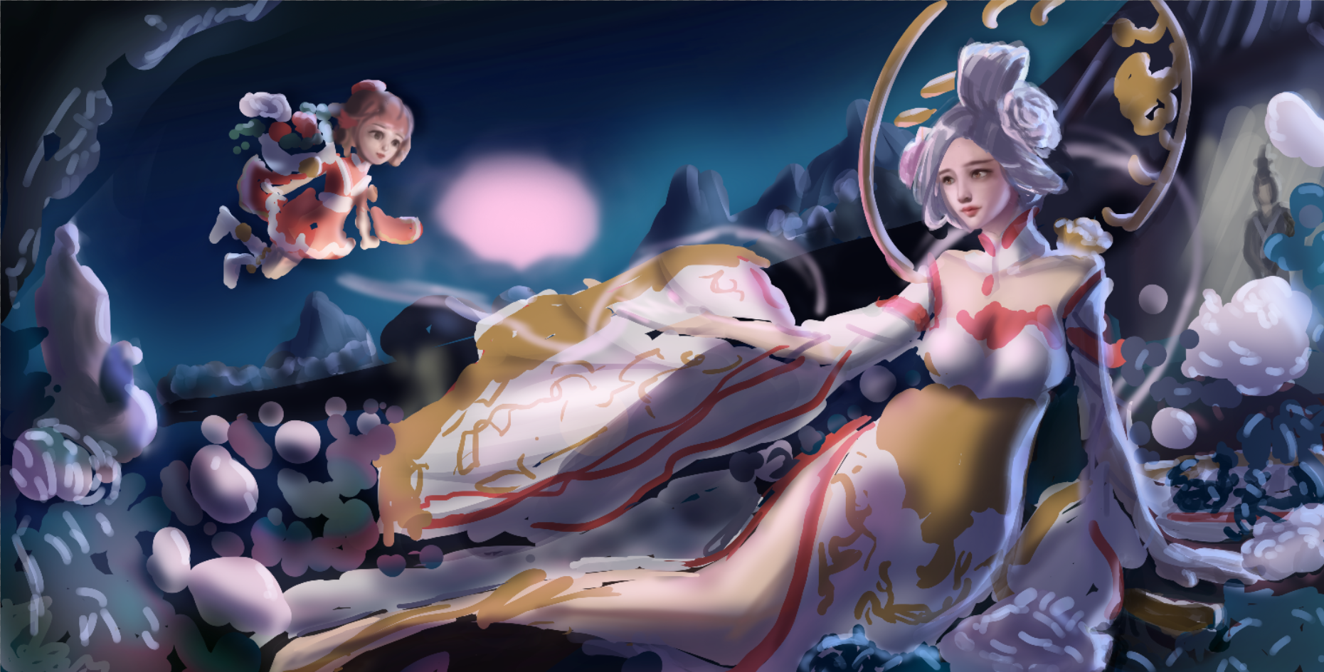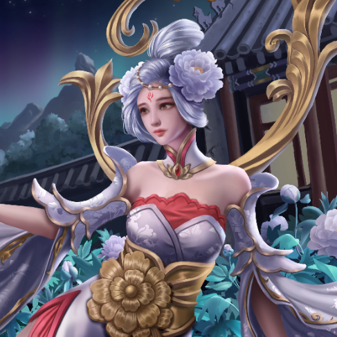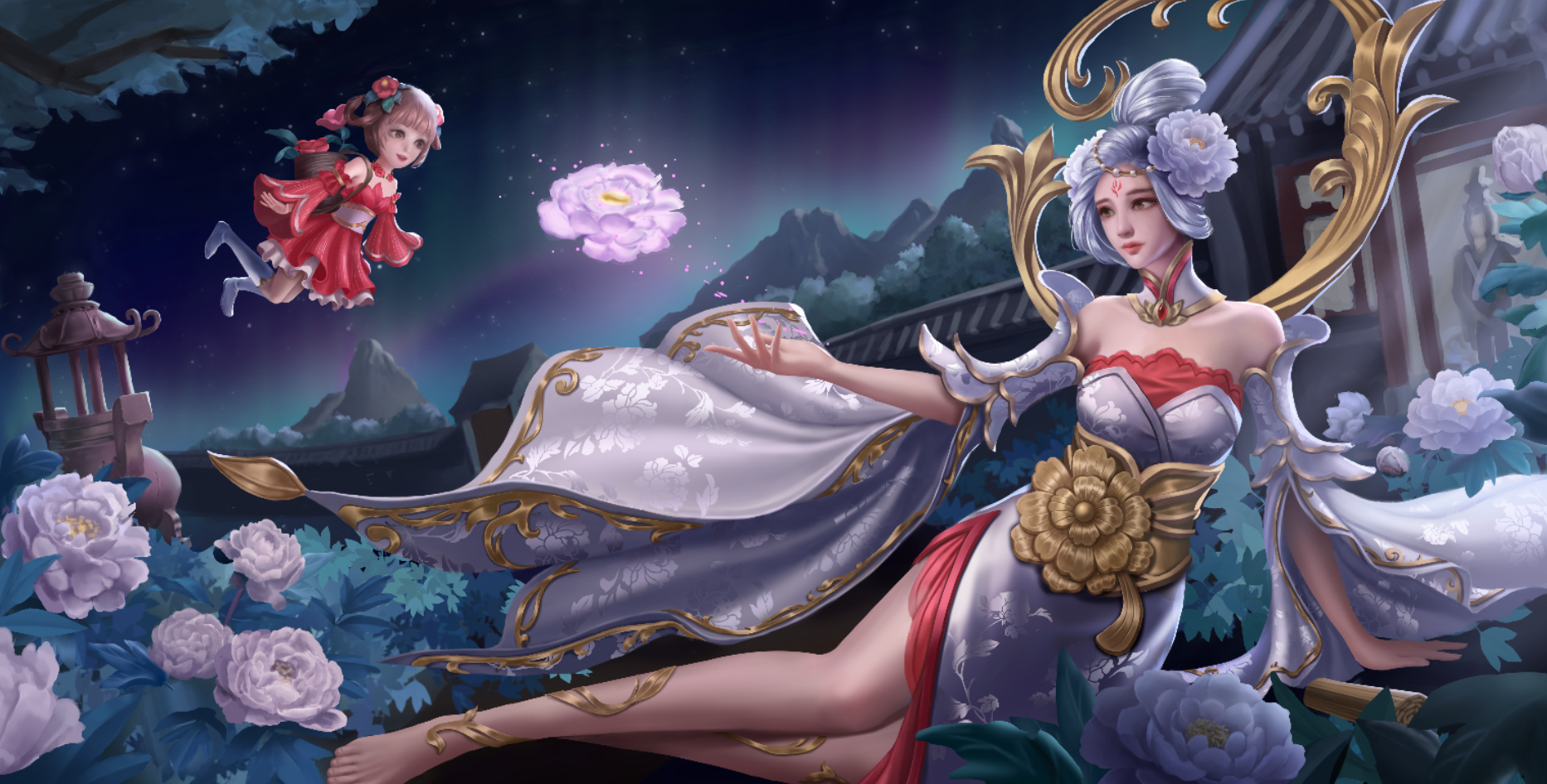 根据《聊斋志异》中《香玉》篇目。画面内容取自诗句“只恐夜深花睡去,故烧高烛照红妆”,牡丹花妖香玉祭出花灯,照亮殿前种植的牡丹花,耐冬花妖绛雪幻化成花精灵,身背花篓,穿梭其间,暂居下清宫的黄生正好走出殿门目睹了这一幕。构图上采用了黄金螺旋和九宫格构图。颜色以白红蓝粉为主。