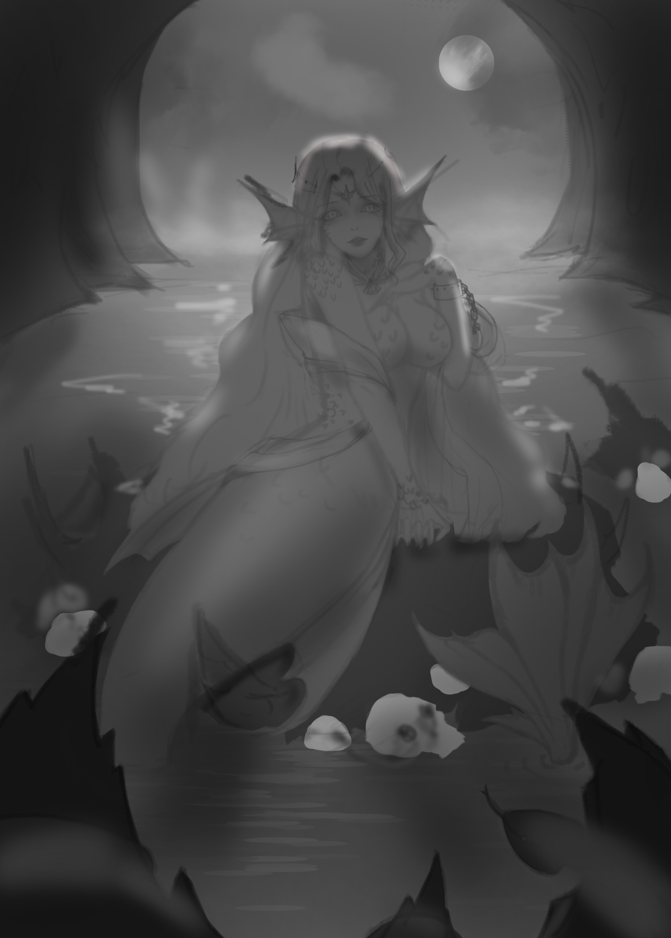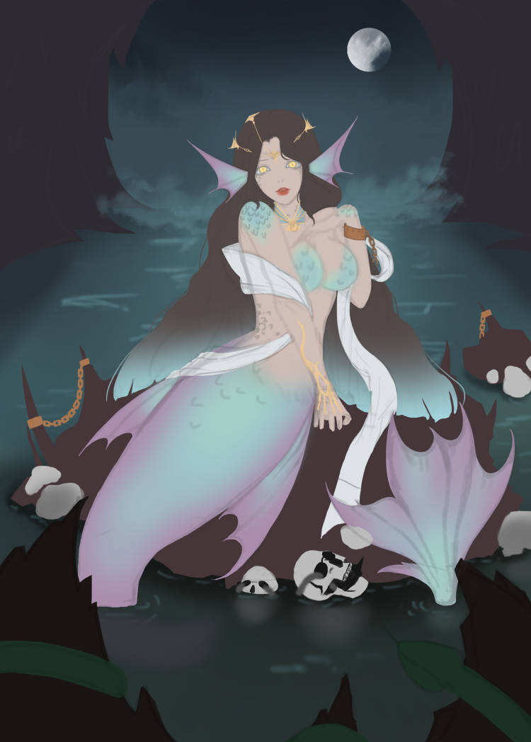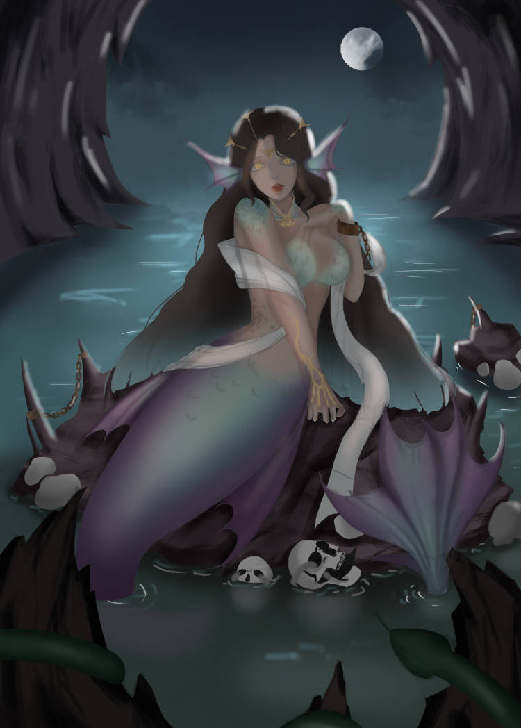 传说,深海的鲛人会徘徊于海中礁石之间,用天籁般的歌喉和妩媚的身姿吸引路过的渔人,并使其出现幻象,从而触礁沉默,成为她的盘中餐……