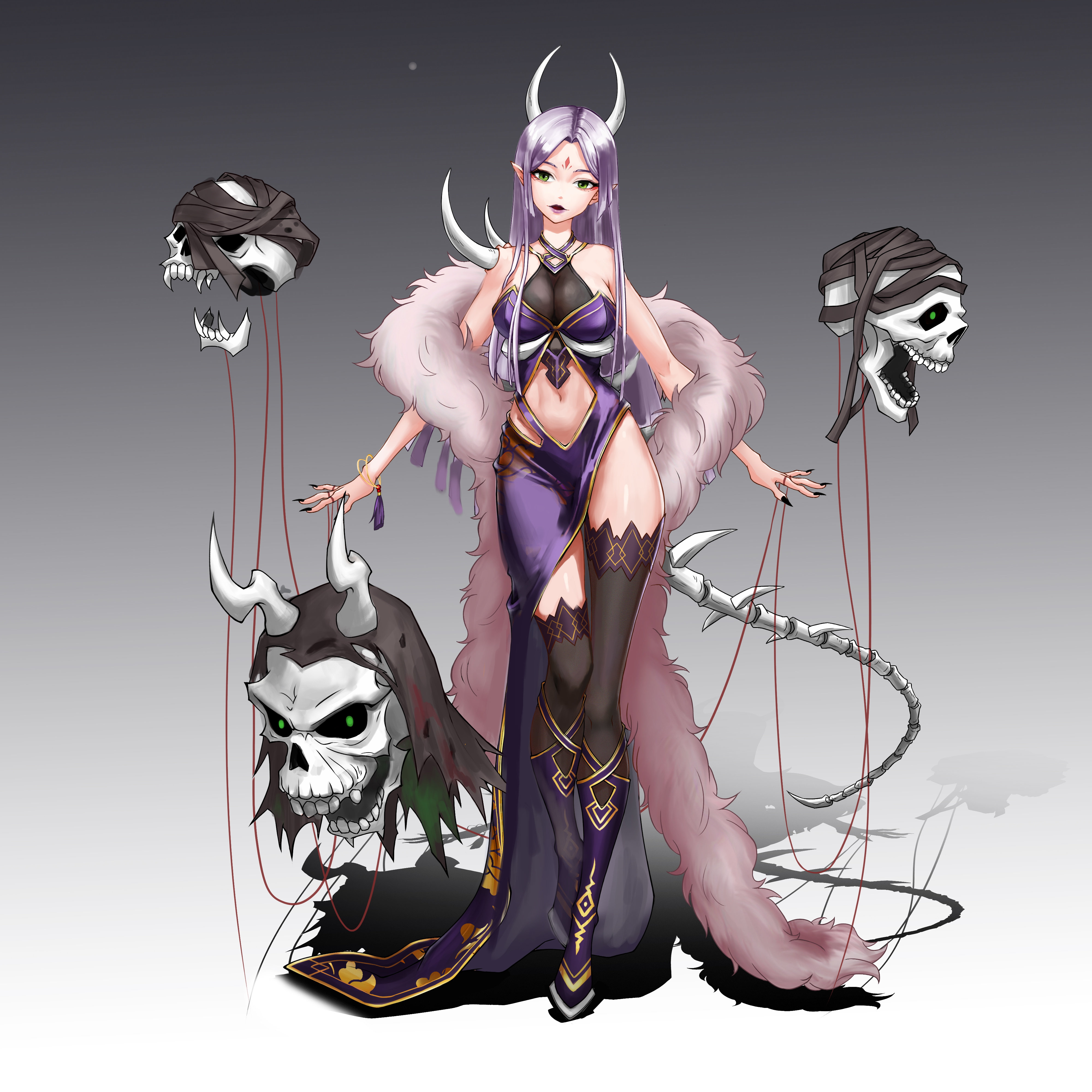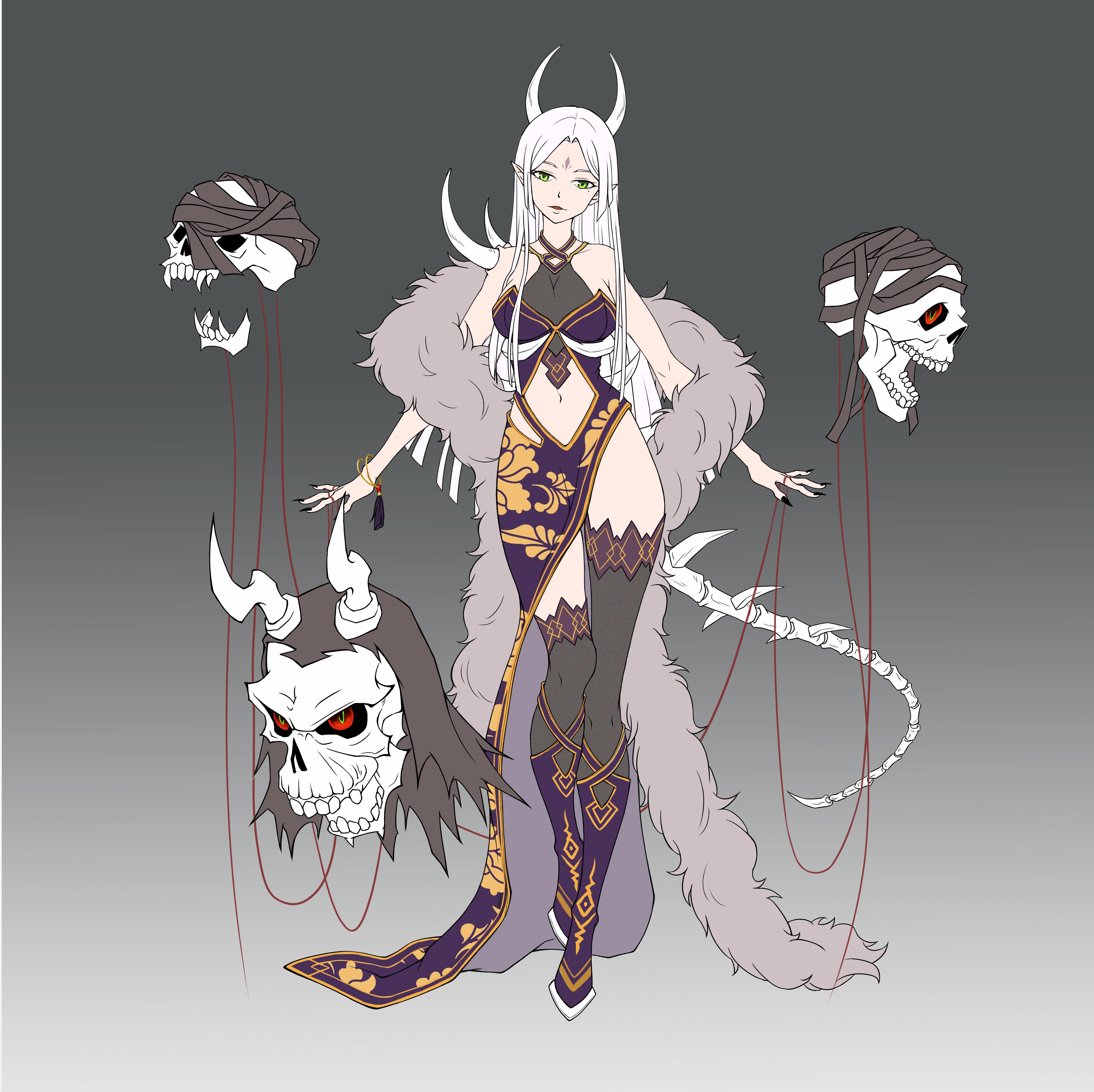 我在设计服饰时,选用了民国时期的旗袍作为整体的服装剪裁的参考,旗袍是优雅知性的,突出了白骨夫人的典雅气质,一些镂空设计和丝质布料为她增添一些性感,以紫色为主的配色则是为了凸显白骨夫人身上神秘缥缈的感觉。