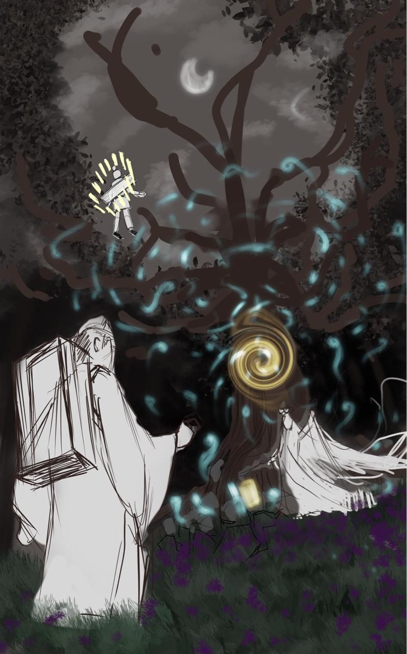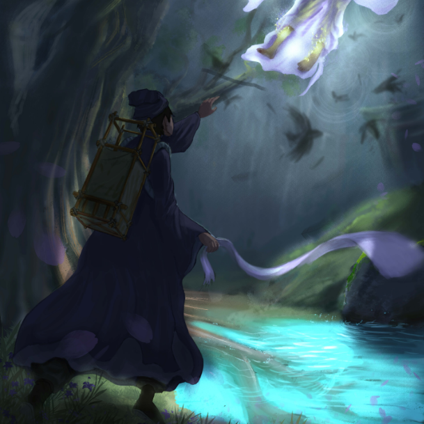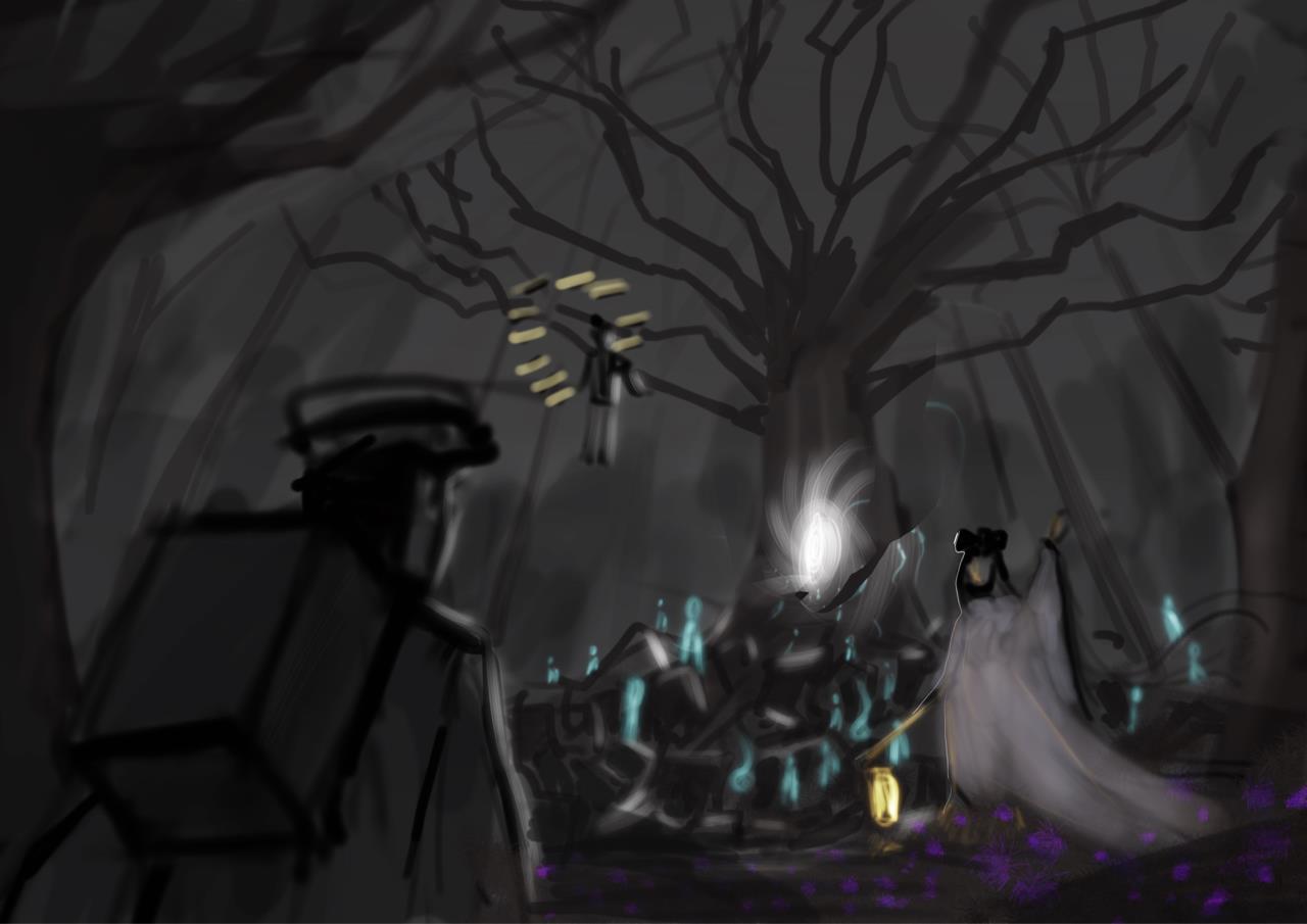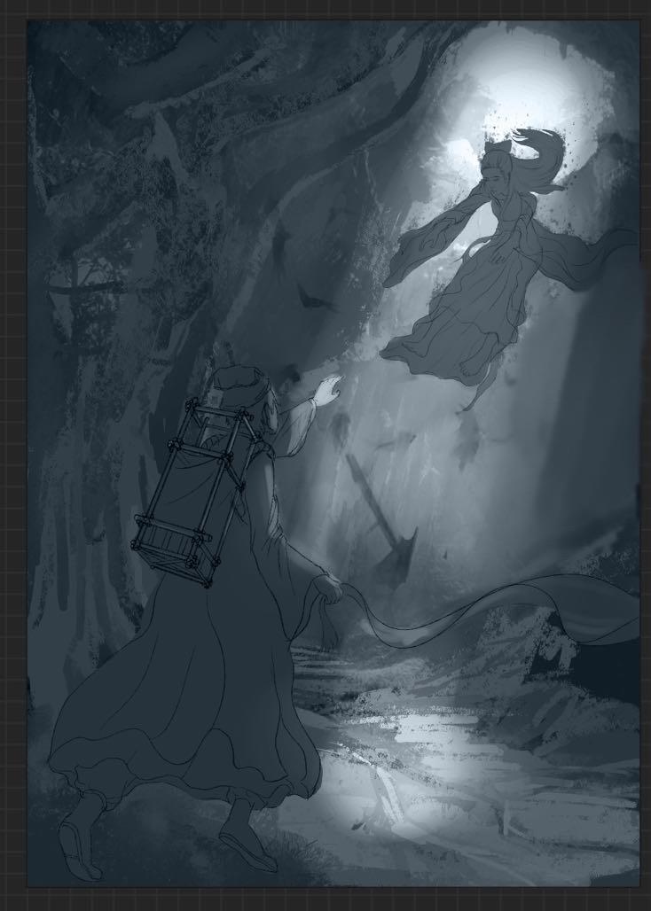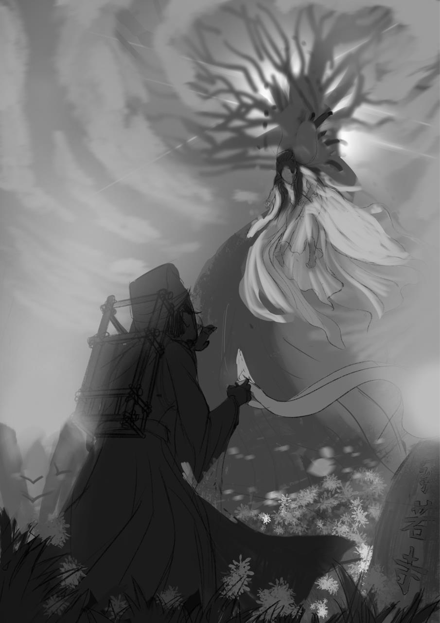 灵感来源:《死神bleach》乌尔奇奥拉黑翼大魔快死的时候和伸手井上别离;还有一句话来自“十里平湖霜满天,寸寸青丝愁华年,对月形单望相护,只羡驾鸯不美仙”所带来想象环境画面和氛围。还有最近俺玩了新出的猫咪《迷失》游戏,那个结局地下城被打开了,顶上露出天空,那个场景感觉不错,可以代表了释放,自由。