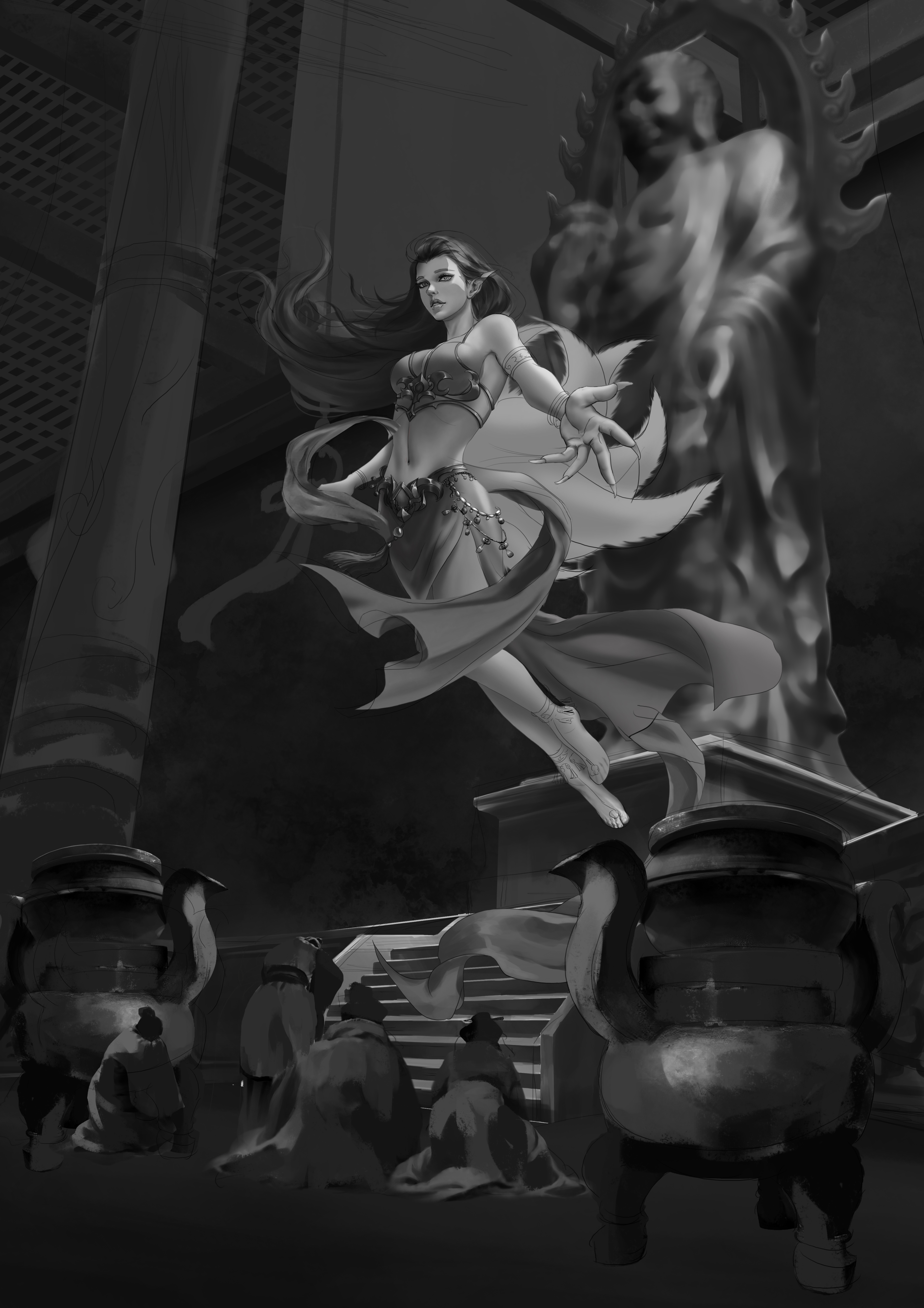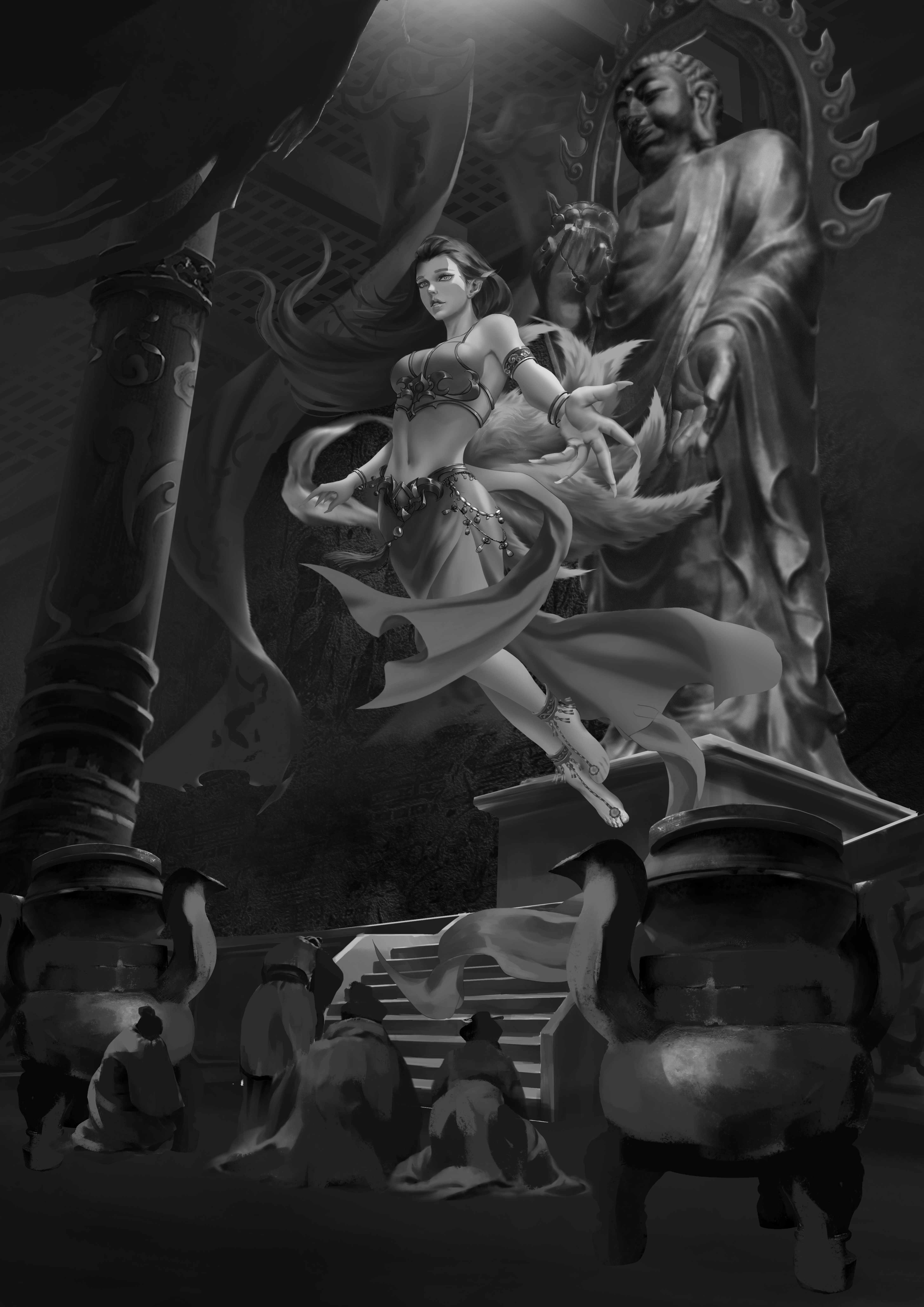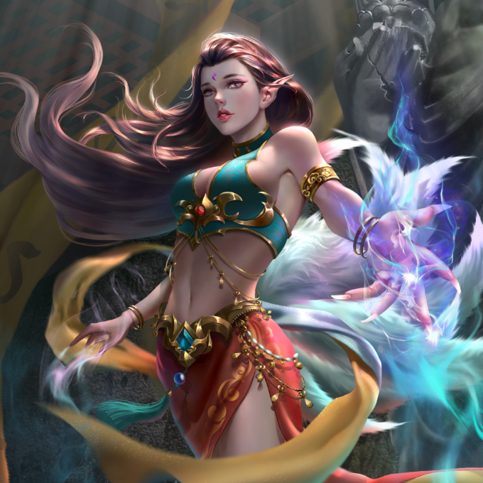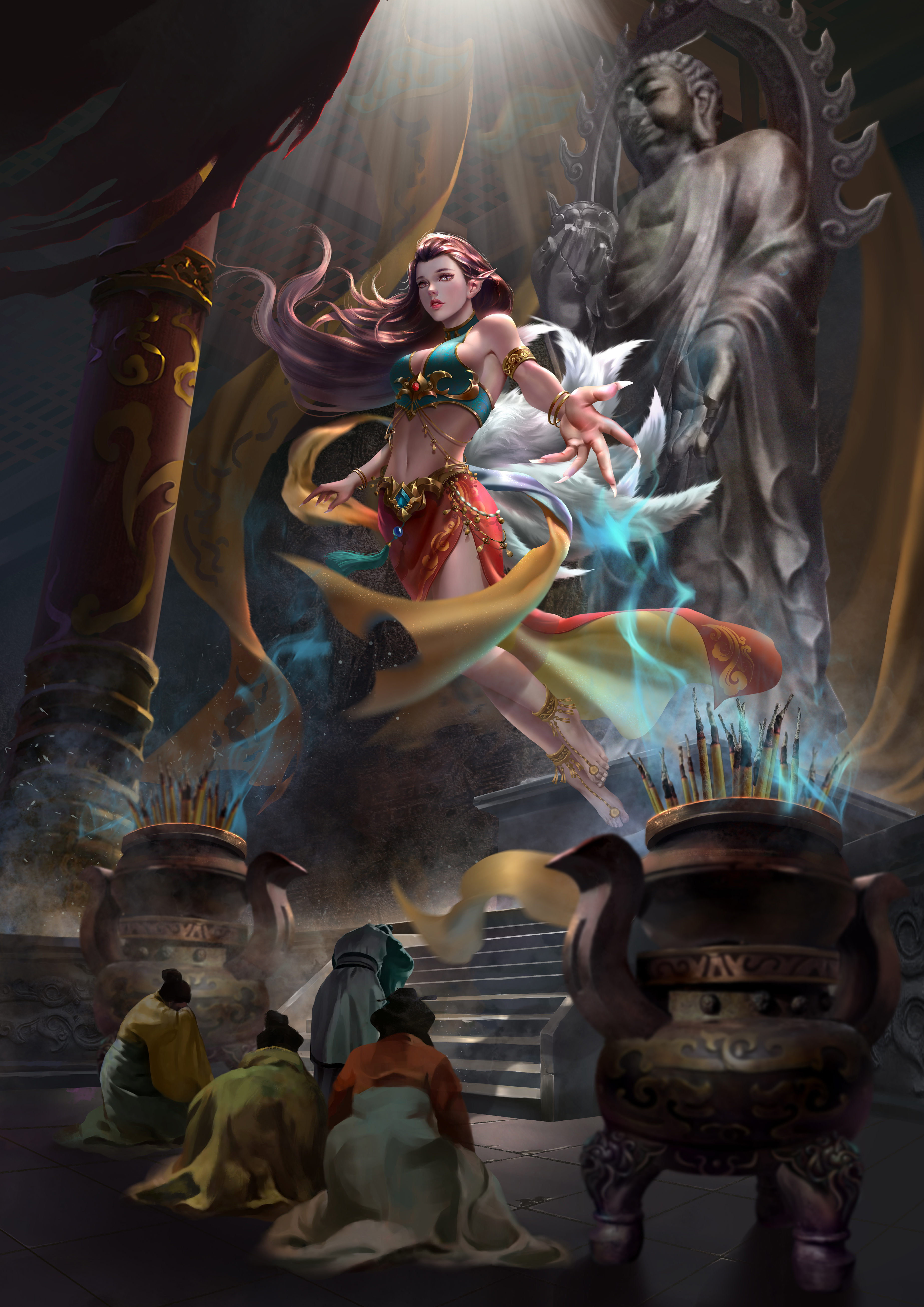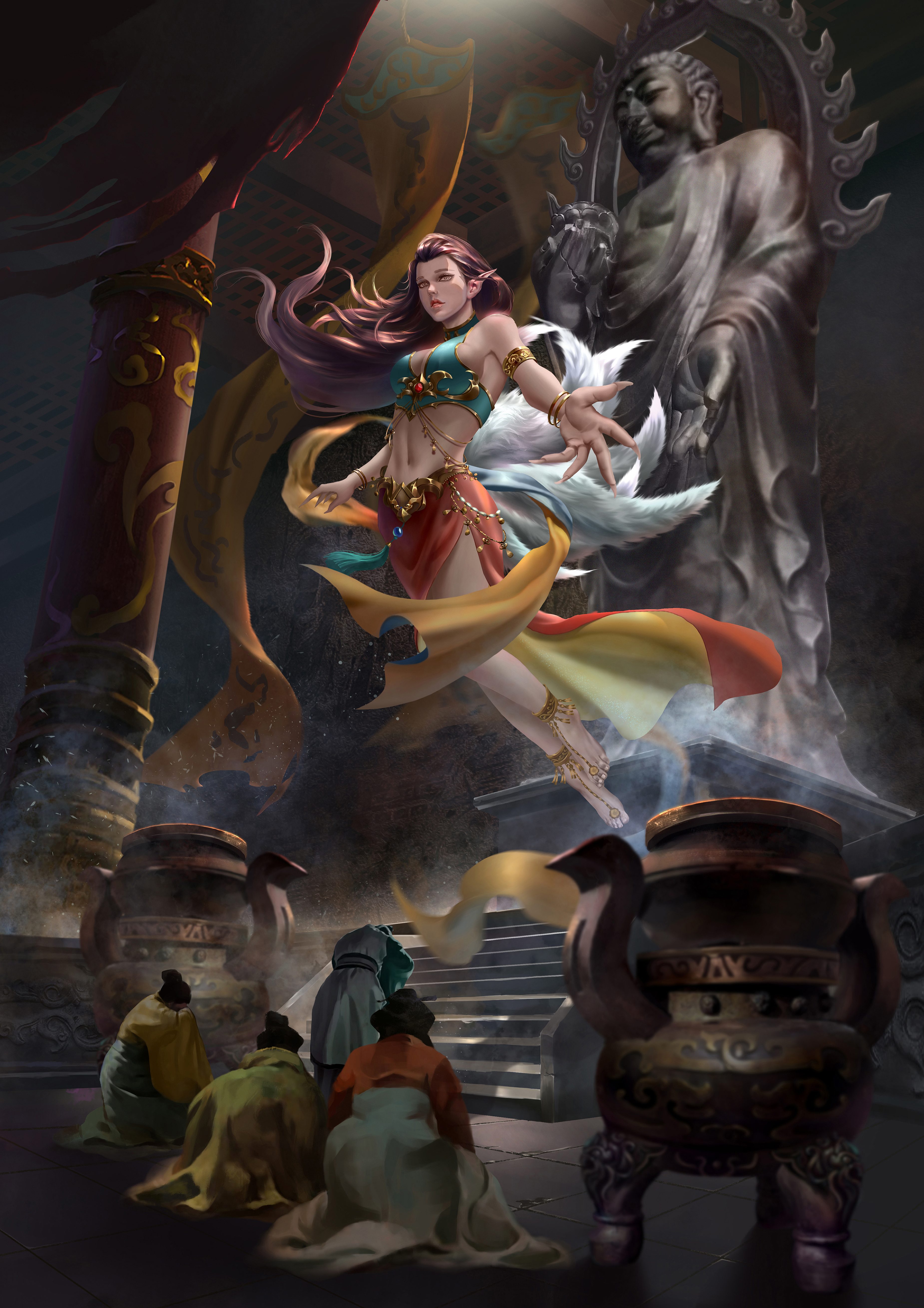 服装设计的灵感来源于敦煌壁画中的飞天服饰加以改进,本来还有点纠结,但是偶然看见壁画中有一“香音神”佛经中名“乾闼婆”她是美丽的满身香馥的菩萨,是天界不食烟火的乐神,因此被称为“香音神”,也就是“不啖酒肉,唯嗅香气之意”。结合本次设计的乃是借寺庙香火修行的狐妖,狐狸本身也是有一特殊的气味,而这只狐狸本就是一只明辨是非善恶的狐狸,飞舞的彩带和飘逸的裙摆,鲜艳的色彩和这个角色相得益彰,故此更加坚定了我的想法。