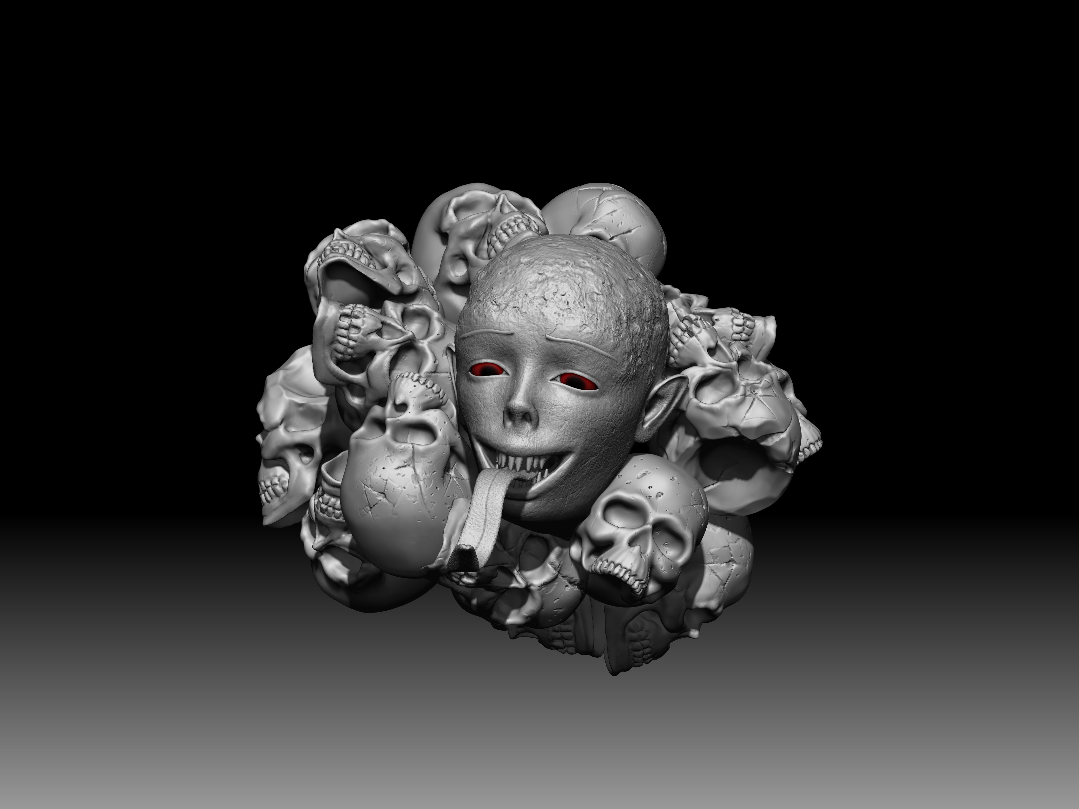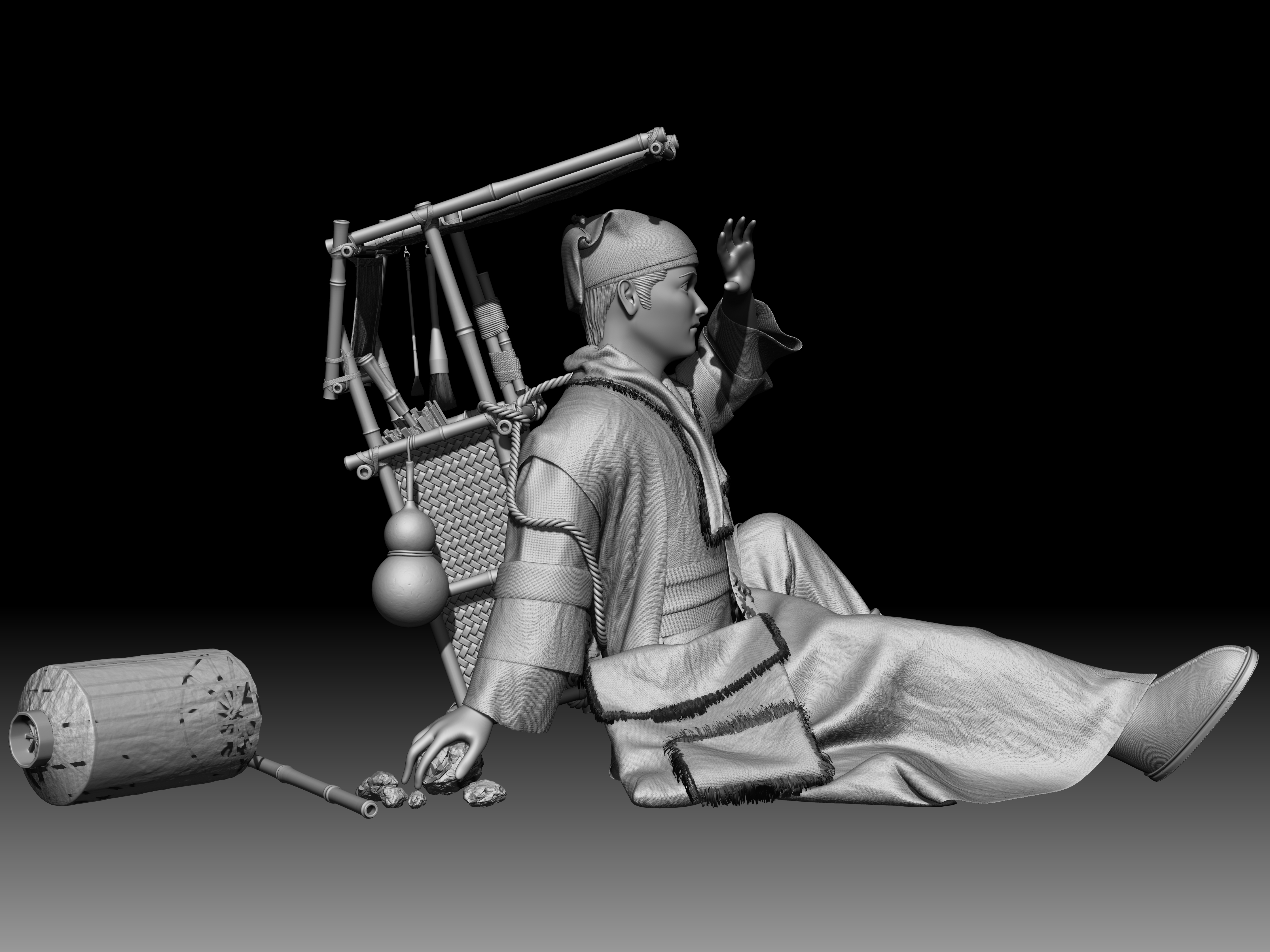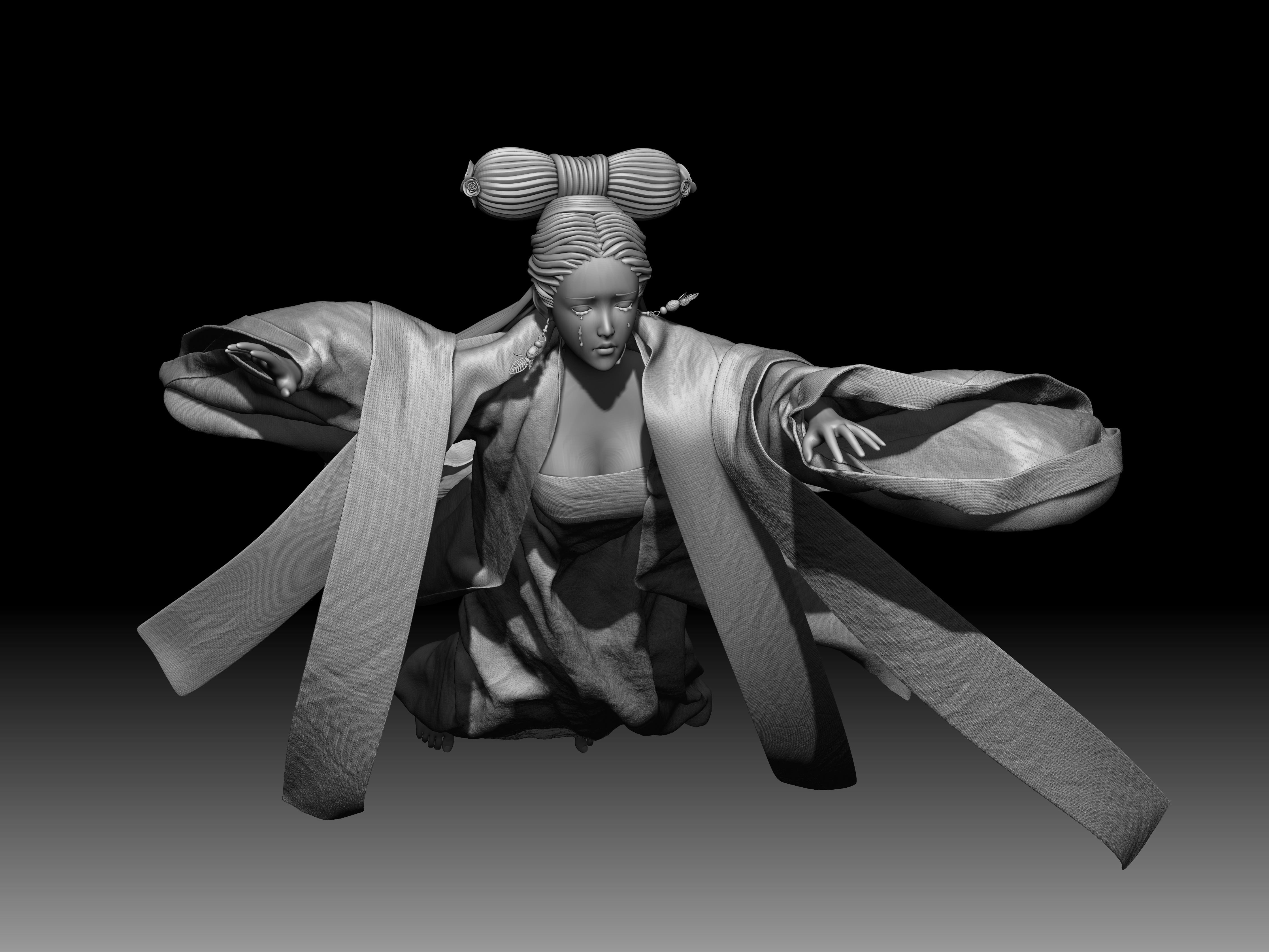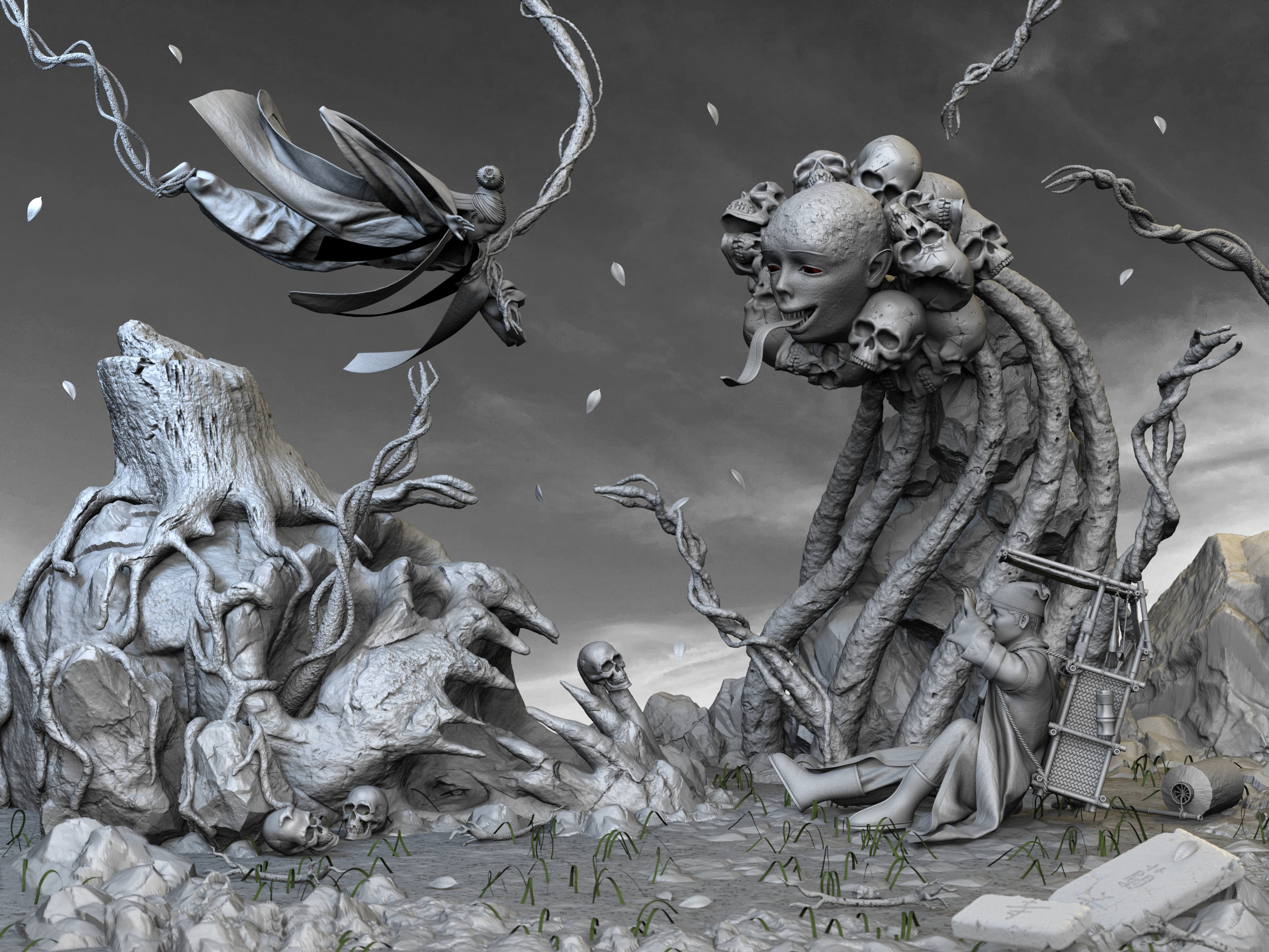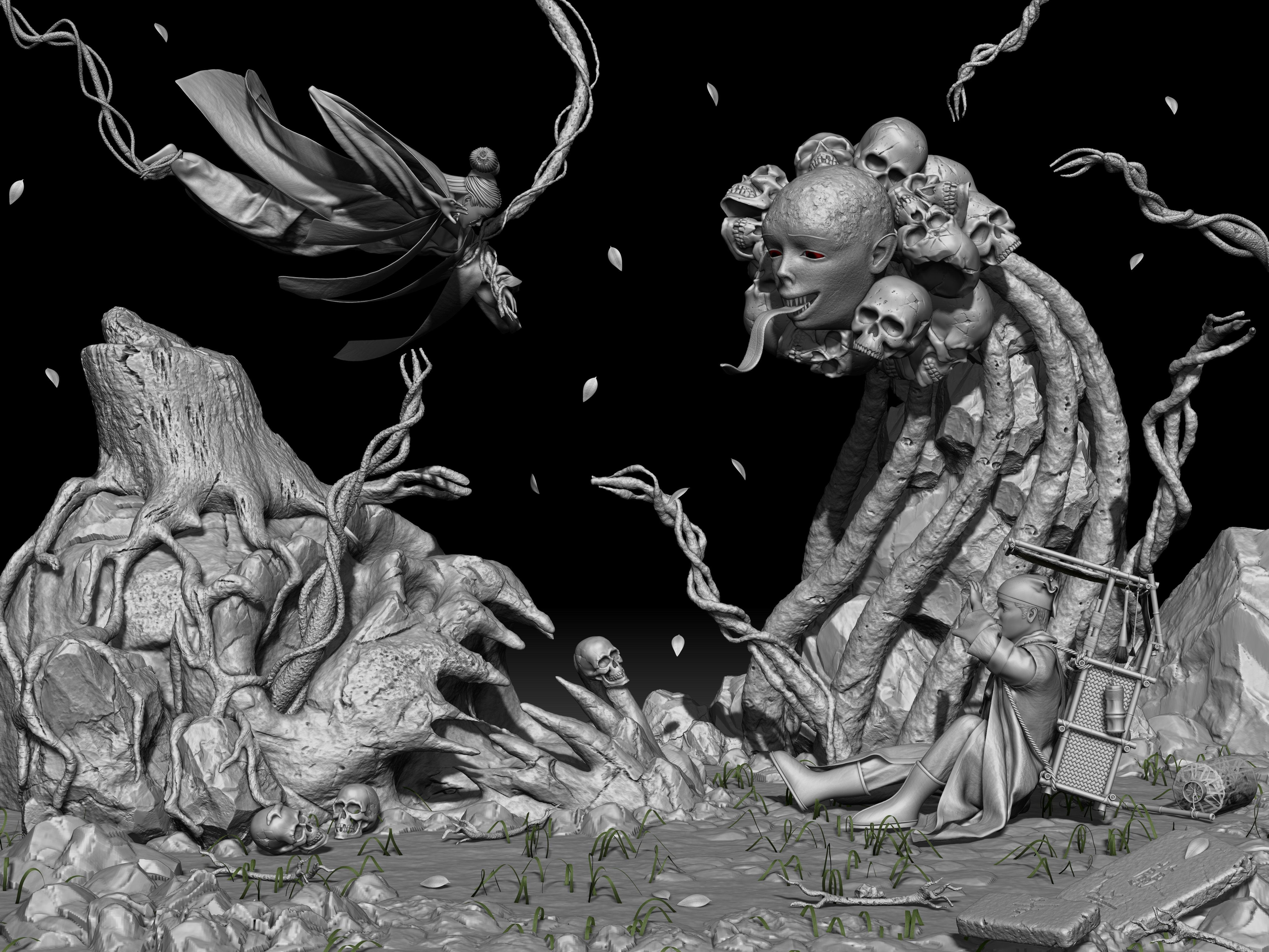 主题:倩女幽魂。人物:宁采臣,聂小倩,黑山老妖。创作灵感:黑山老妖为了阻止小倩和宁采臣一起,然后臣臣吓N。软件使用了MAYA,ZB,MD渲染用的KEYSHOT