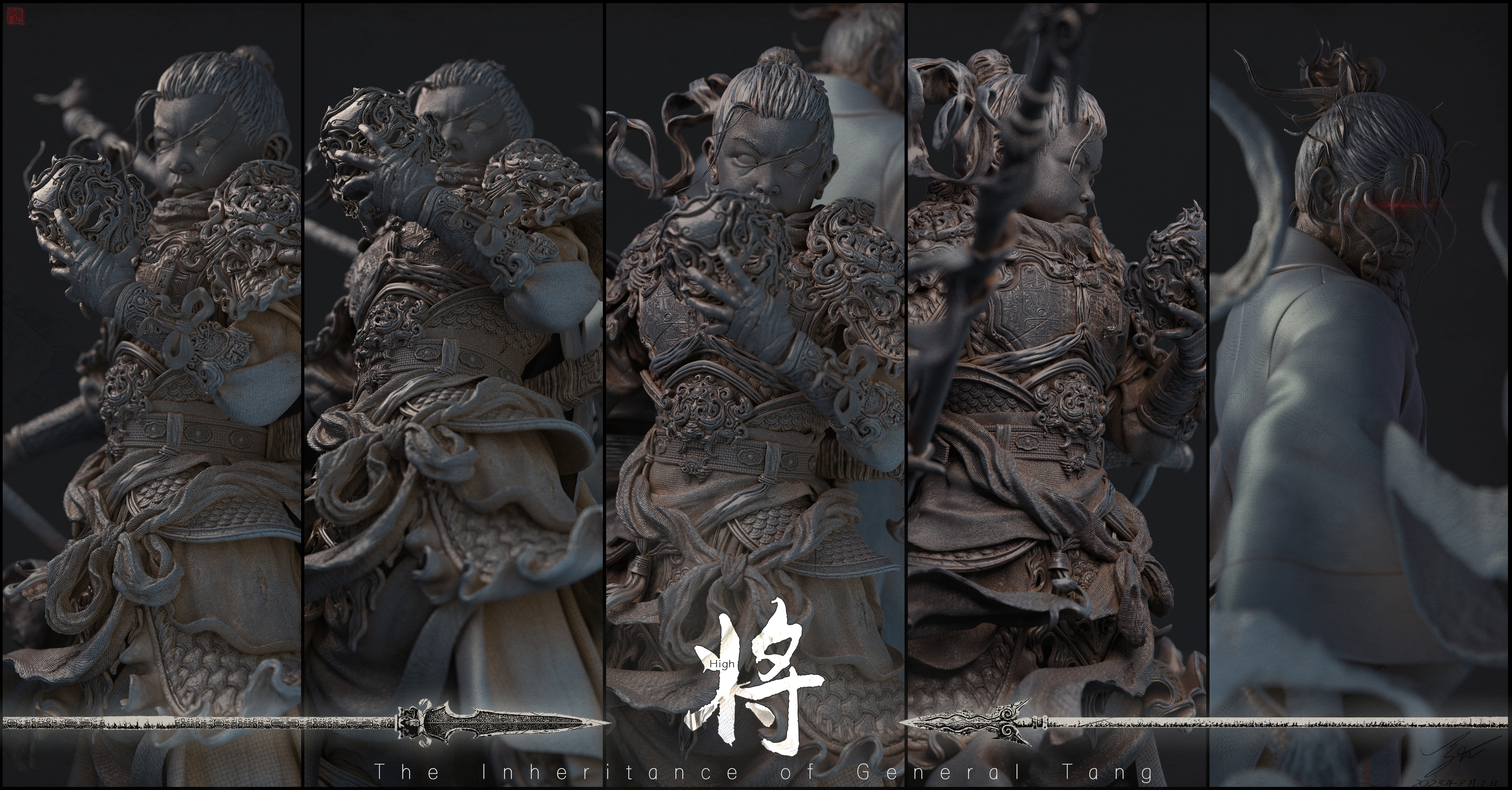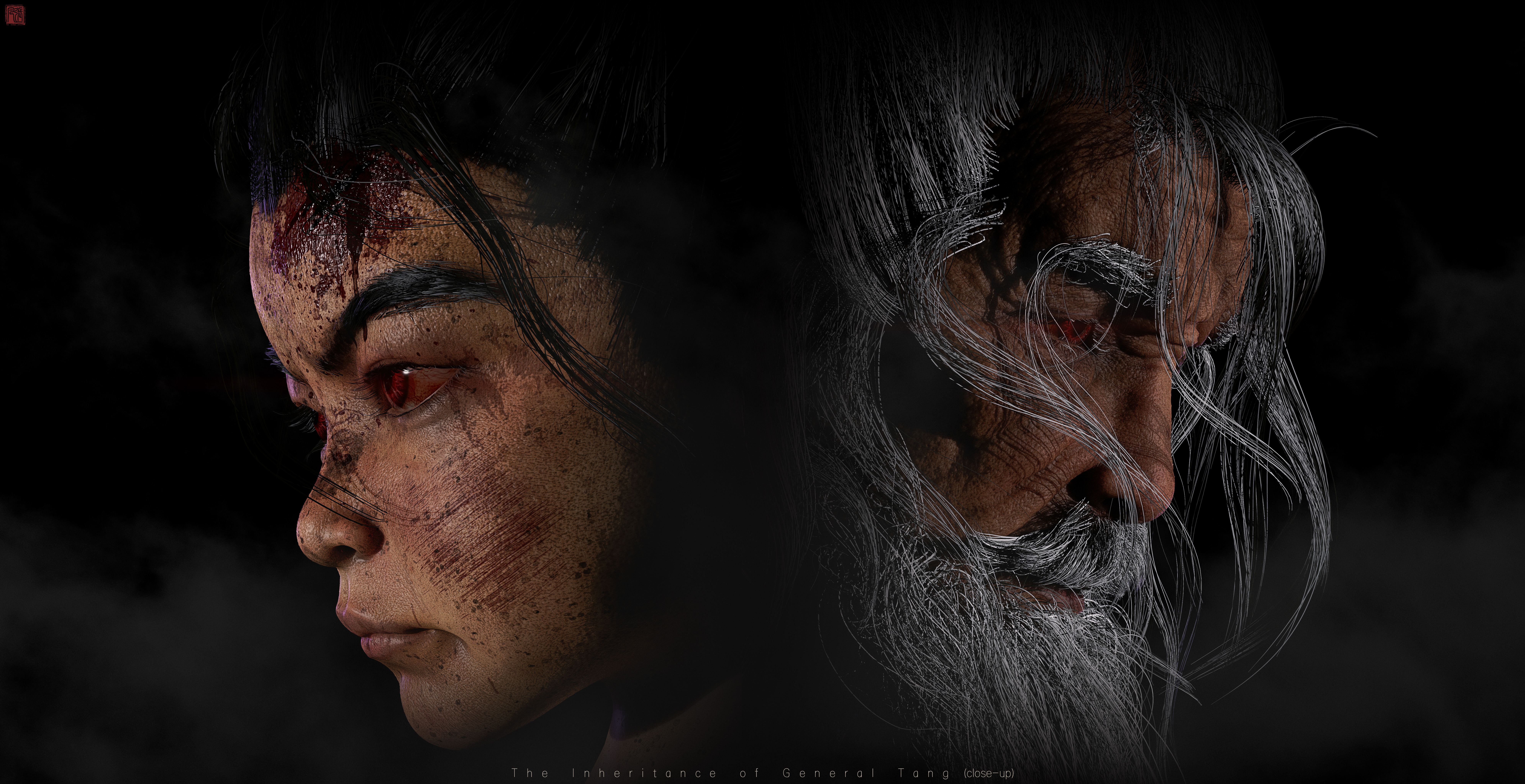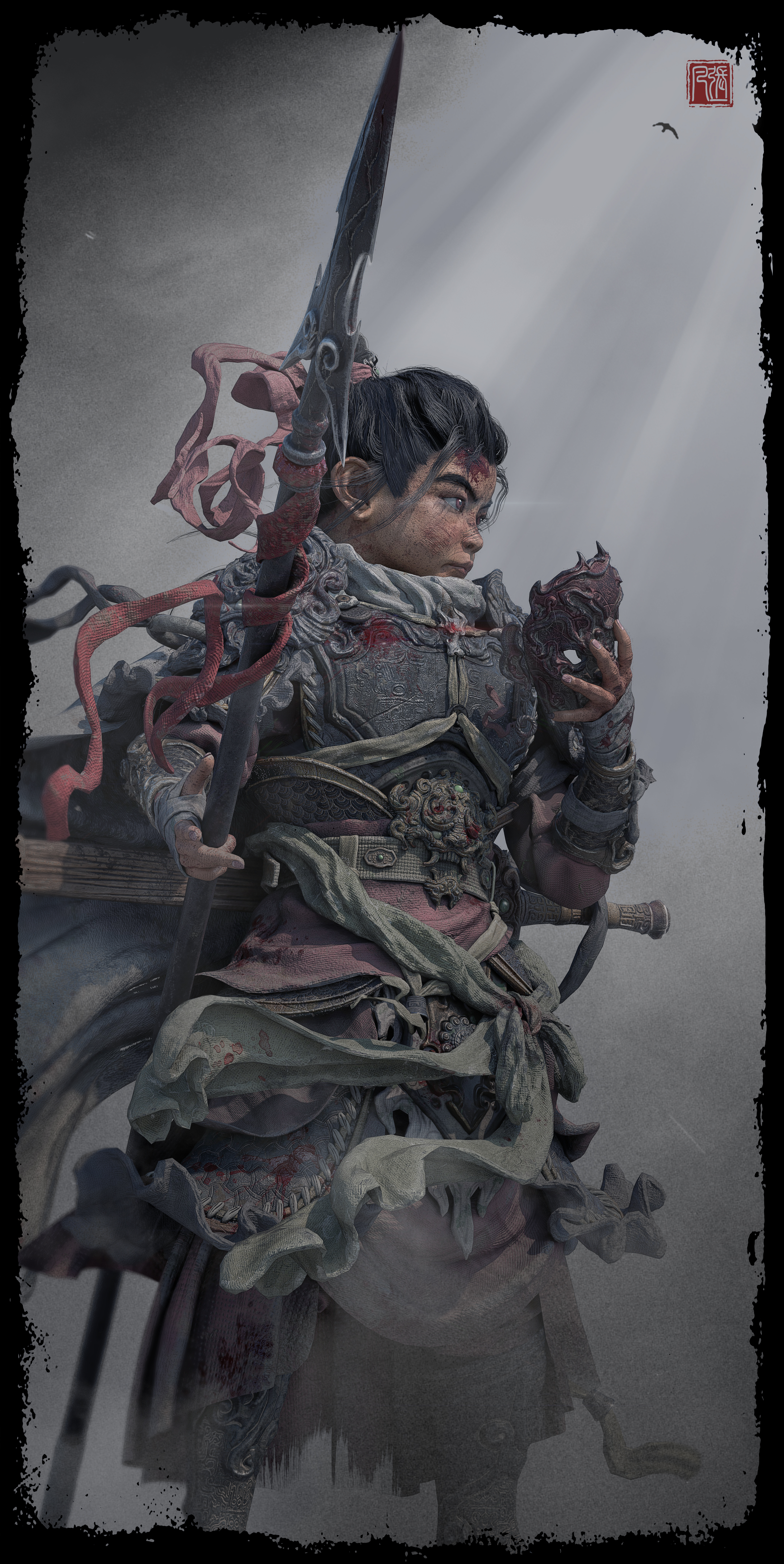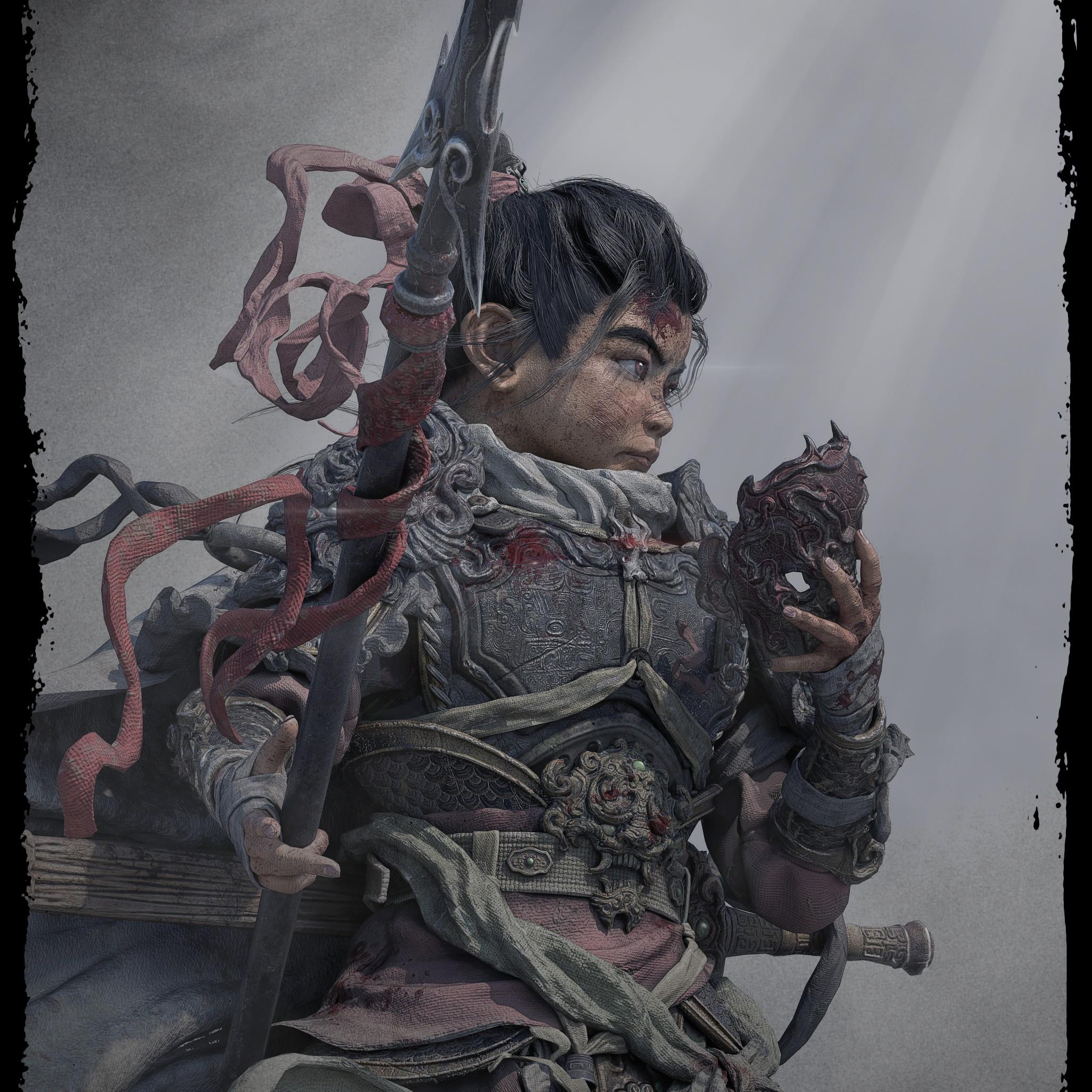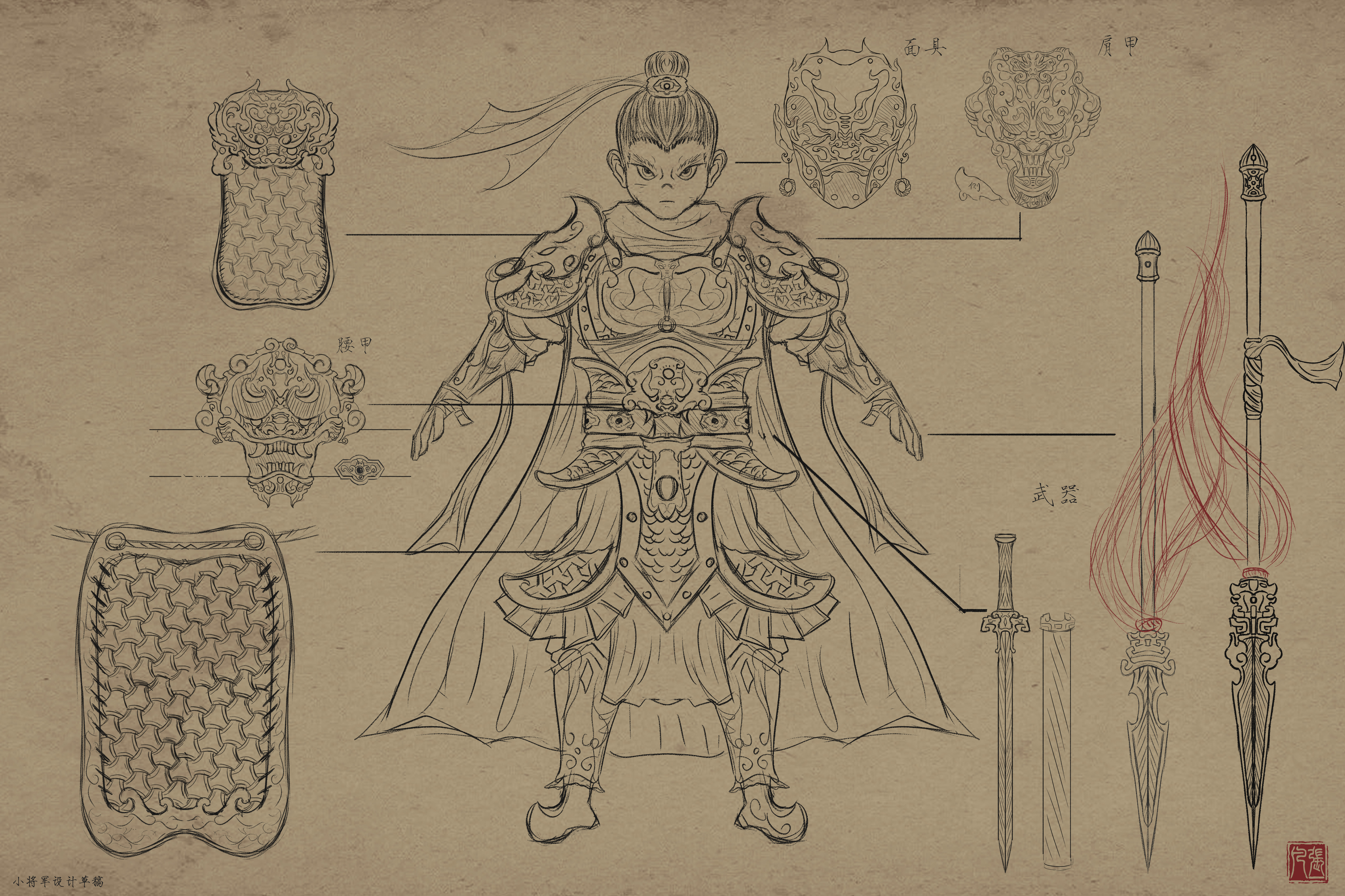 造型以古代铠甲、传统花纹、鬼面、以及较软的布料为主;材料方面整体饱和并没有那么高,我选择用傩戏面具、旧金属、古剑、以及一点玉石点缀为参考,从设计到制作还原了我心目中一位唐朝小将军的形象,在用一位老者形成鲜明的对比,从而增加画面的故事感。