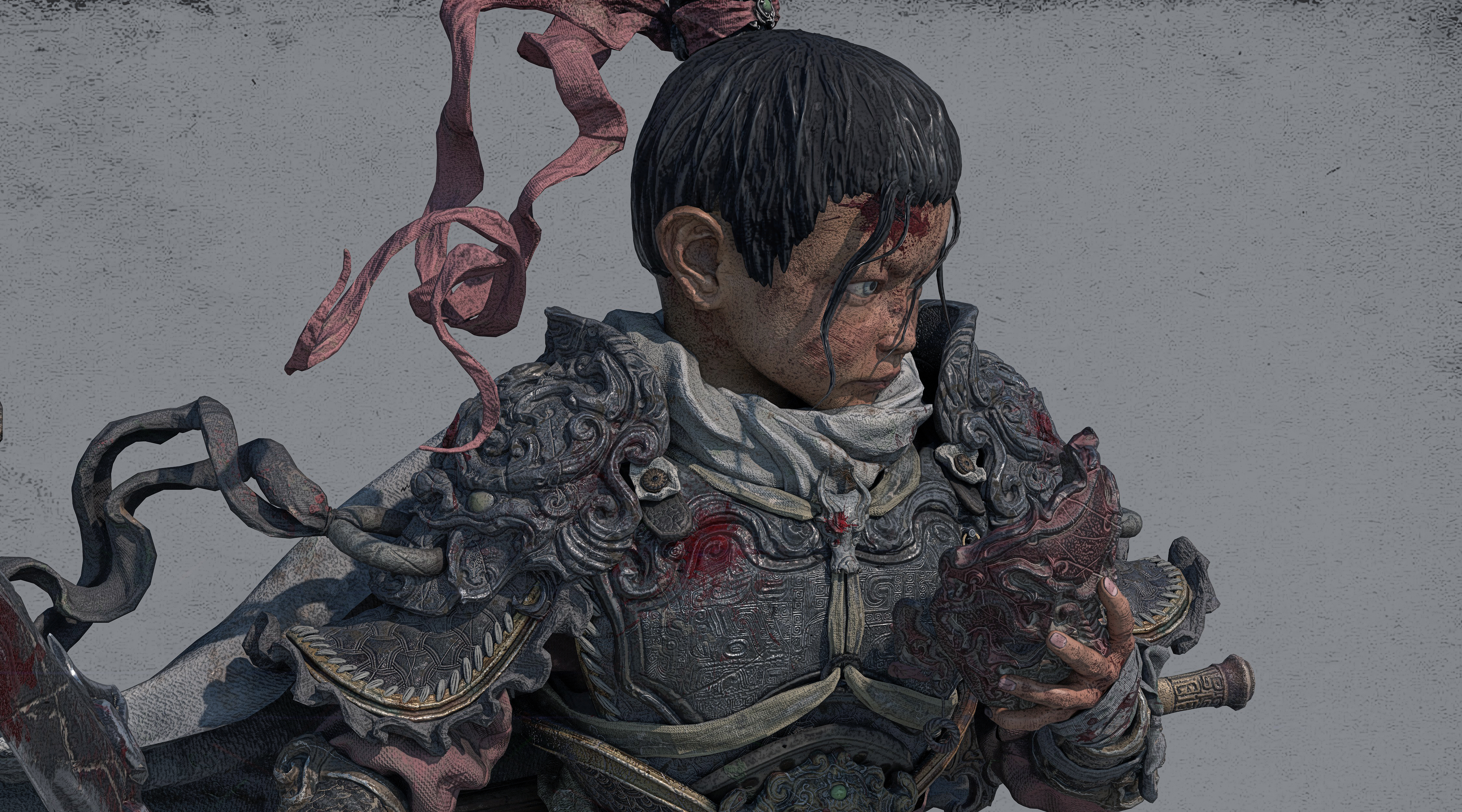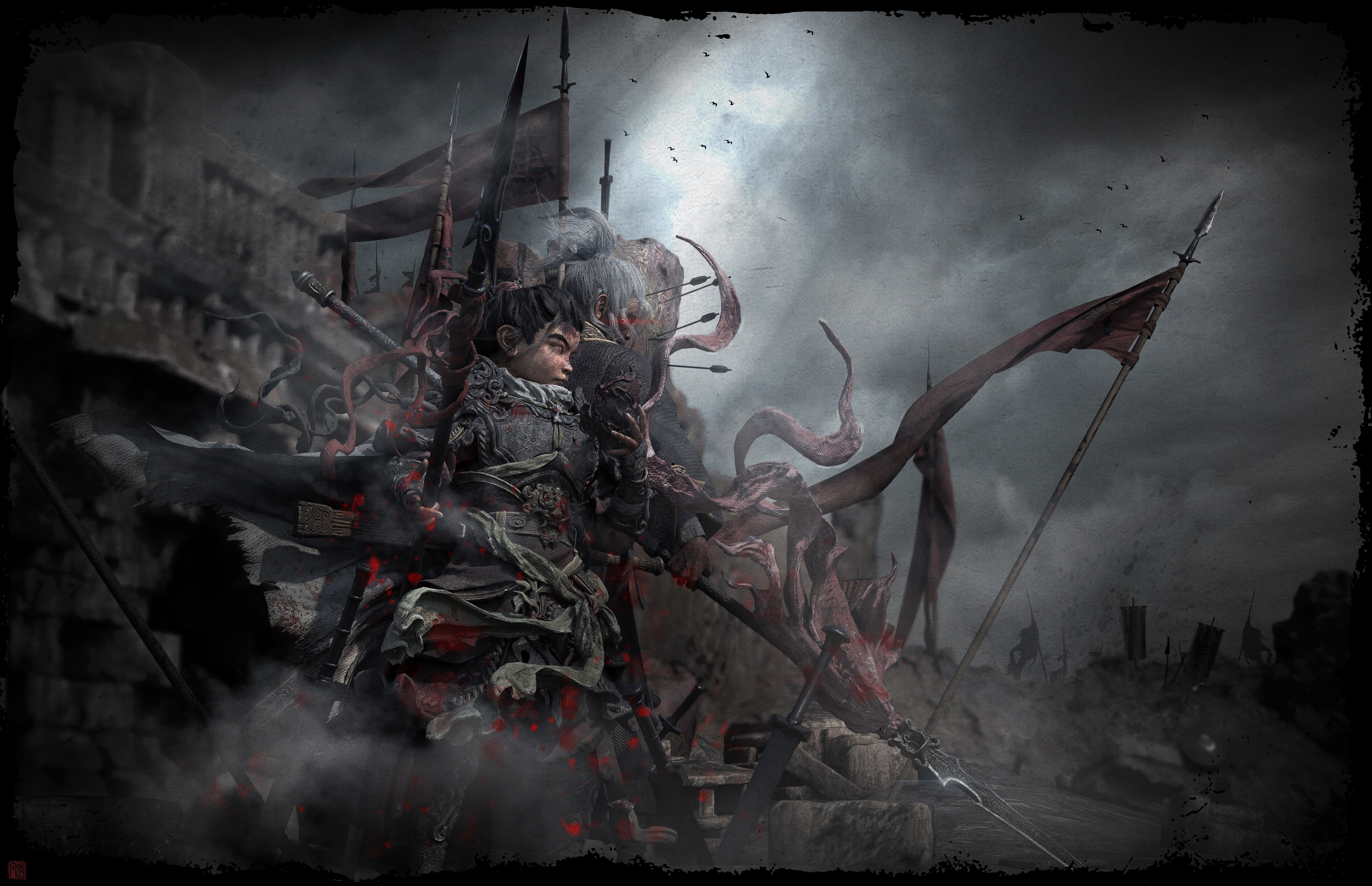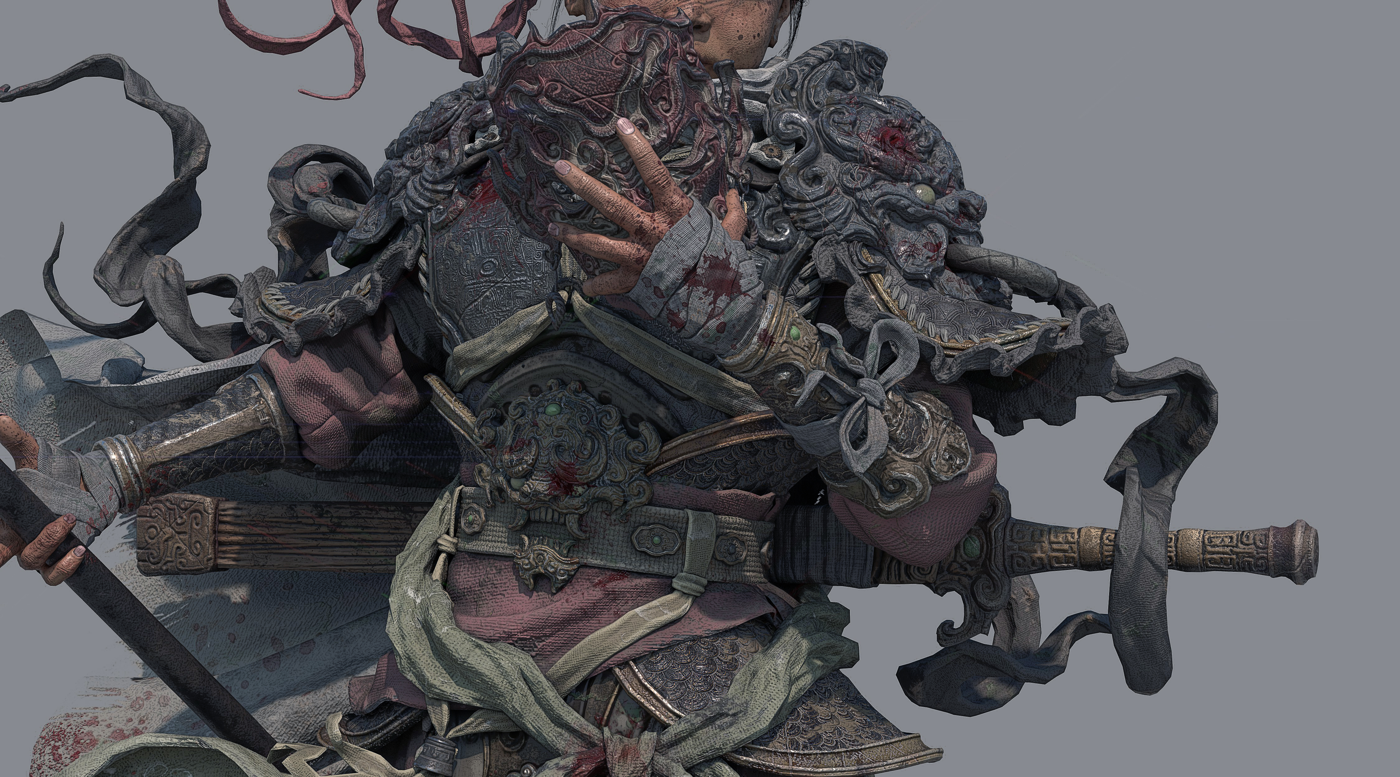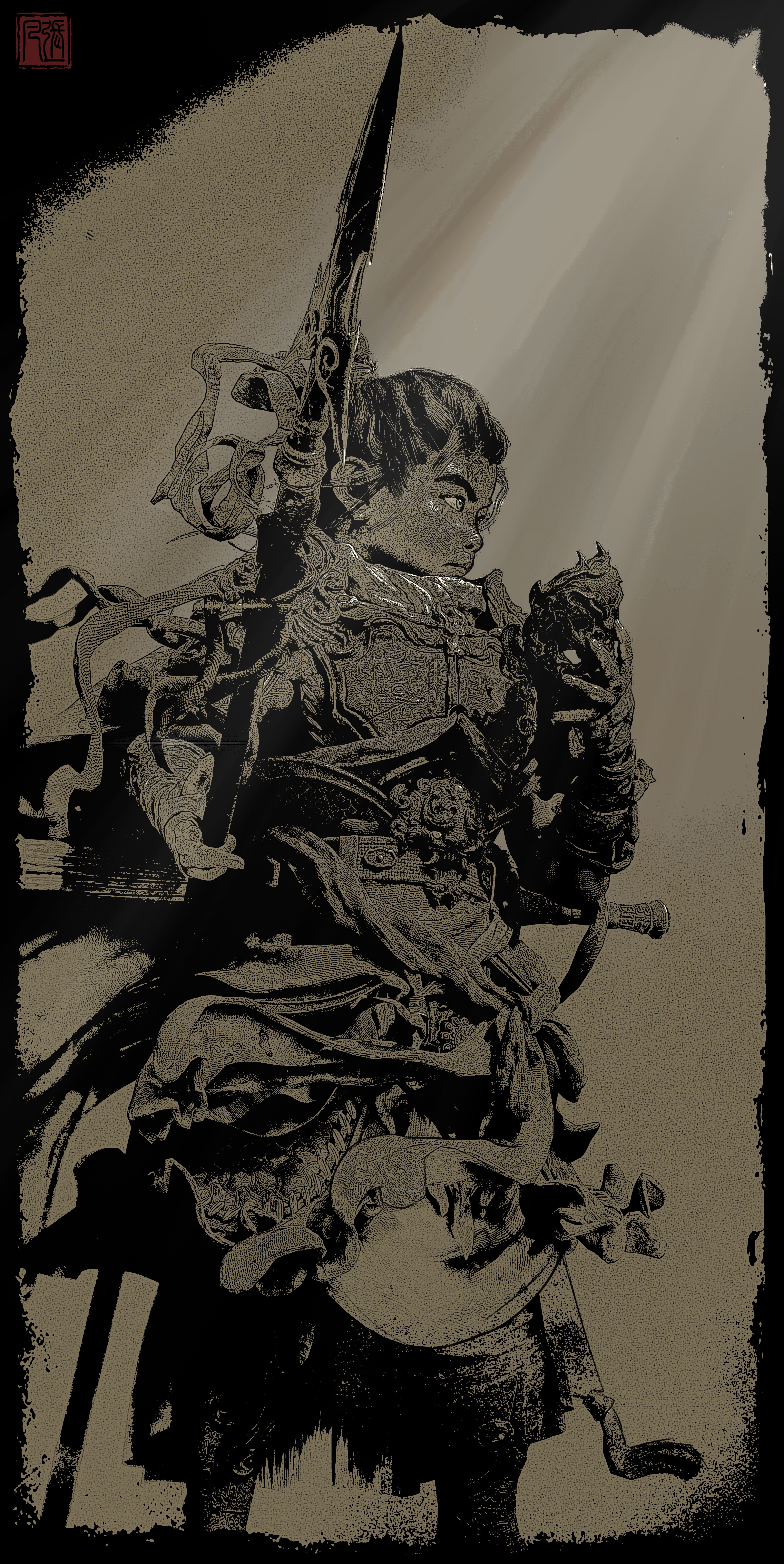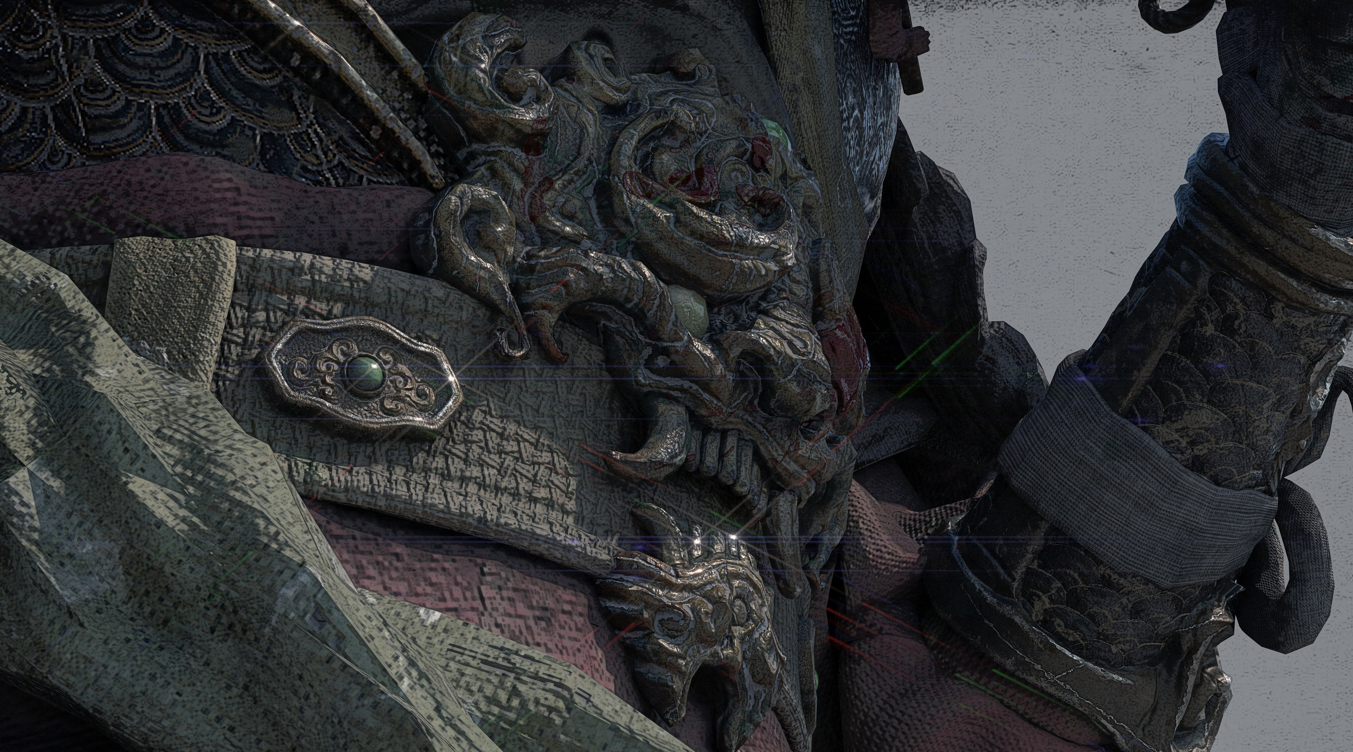 造型以古代铠甲、传统花纹、鬼面、以及较软的布料为主;材料方面整体饱和并没有那么高,我选择用傩戏面具、旧金属、古剑、以及一点玉石点缀为参考,从设计到制作还原了我心目中一位唐朝小将军的形象,在用一位老者形成鲜明的对比,从而增加画面的故事感。