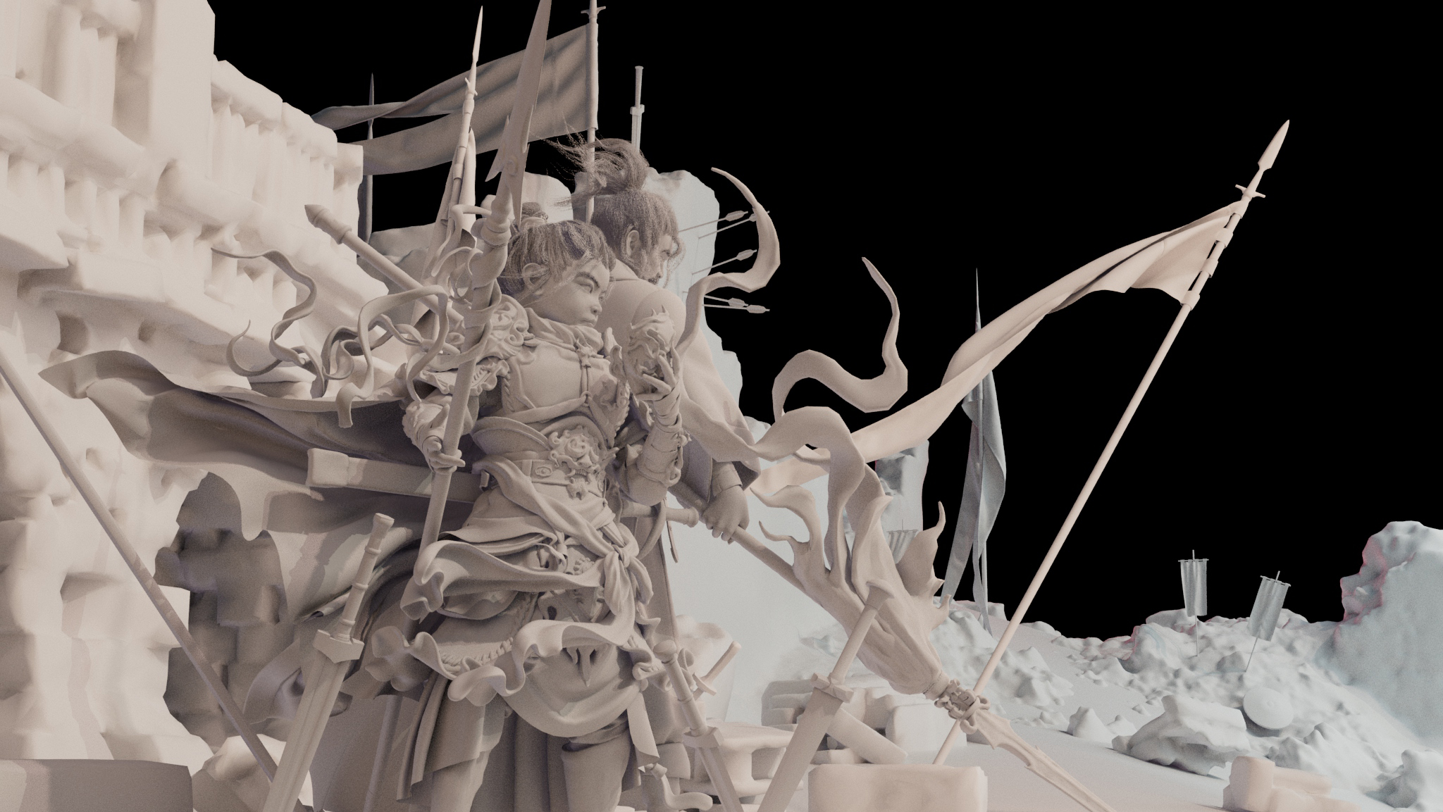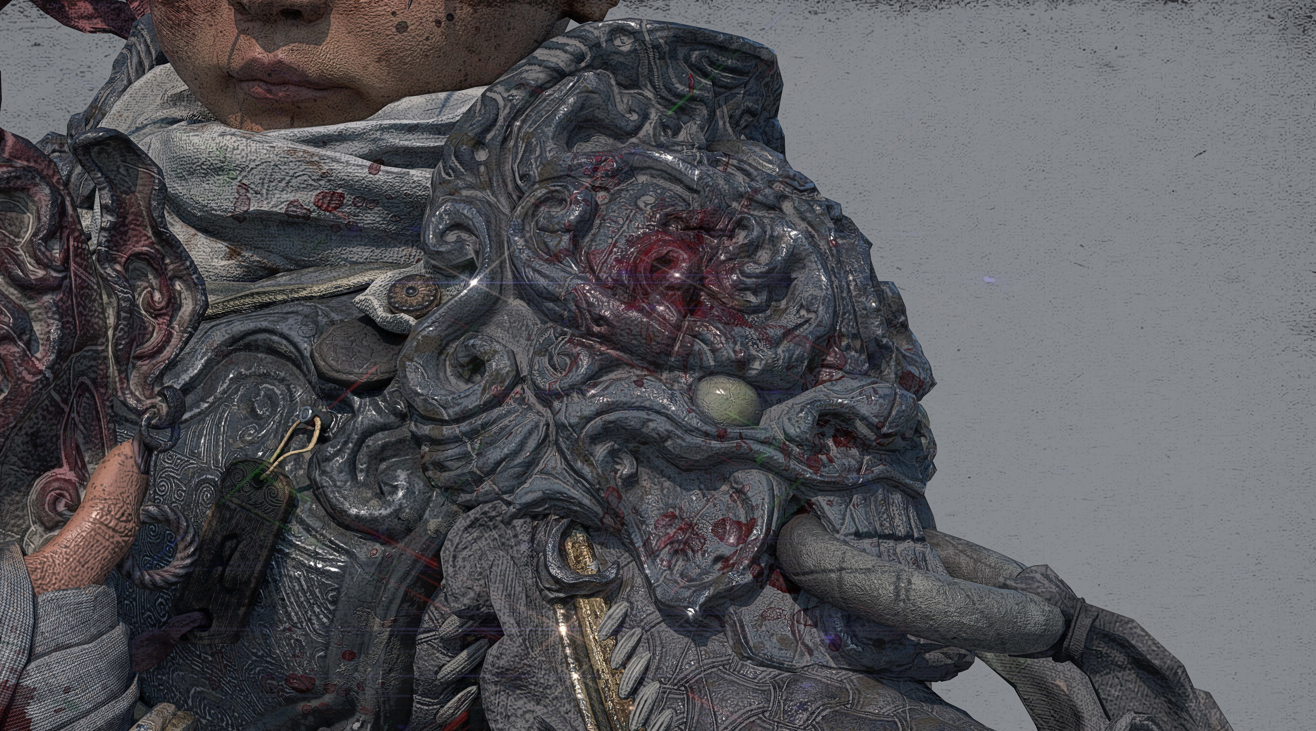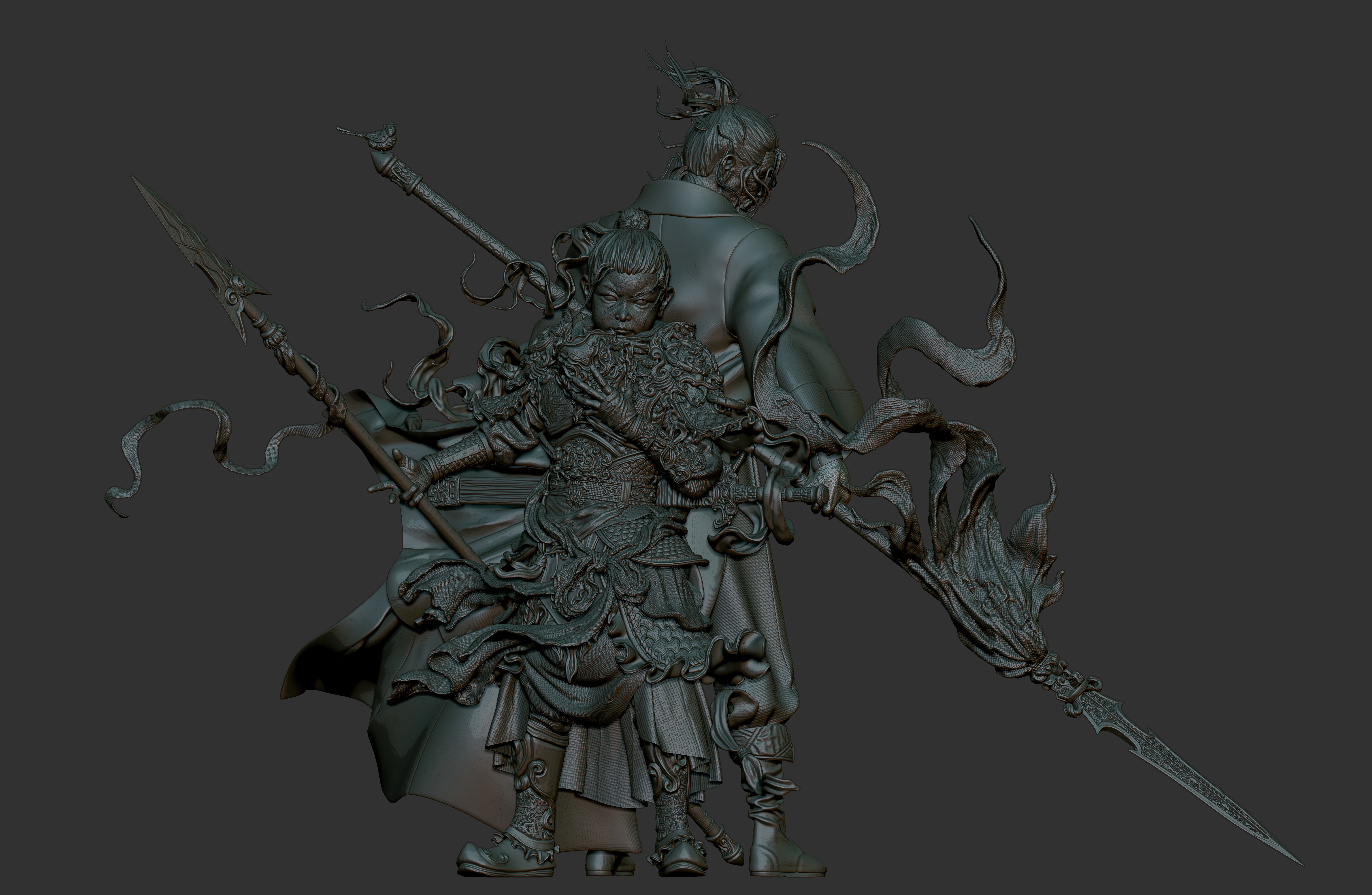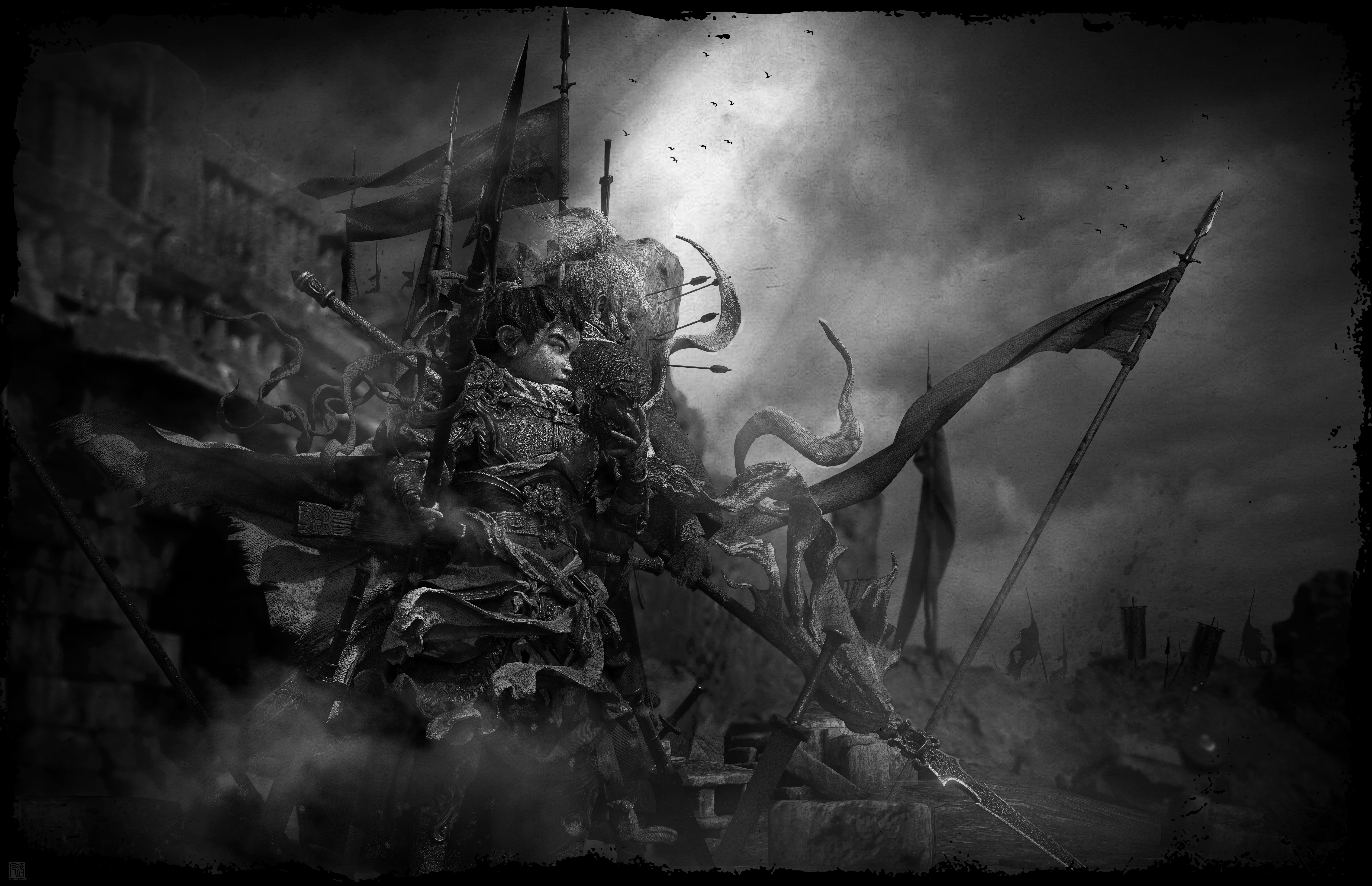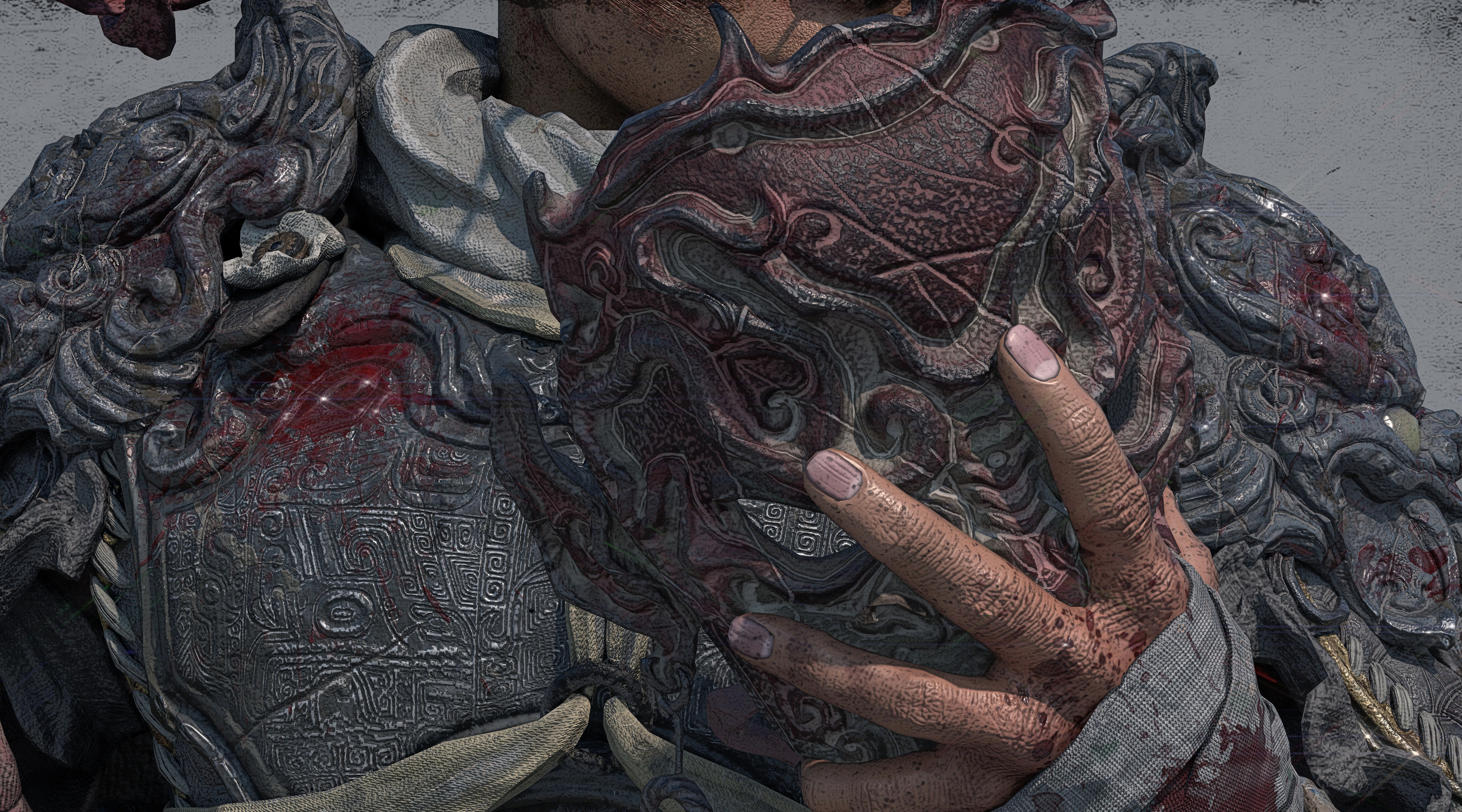 造型以古代铠甲、传统花纹、鬼面、以及较软的布料为主;材料方面整体饱和并没有那么高,我选择用傩戏面具、旧金属、古剑、以及一点玉石点缀为参考,从设计到制作还原了我心目中一位唐朝小将军的形象,在用一位老者形成鲜明的对比,从而增加画面的故事感。