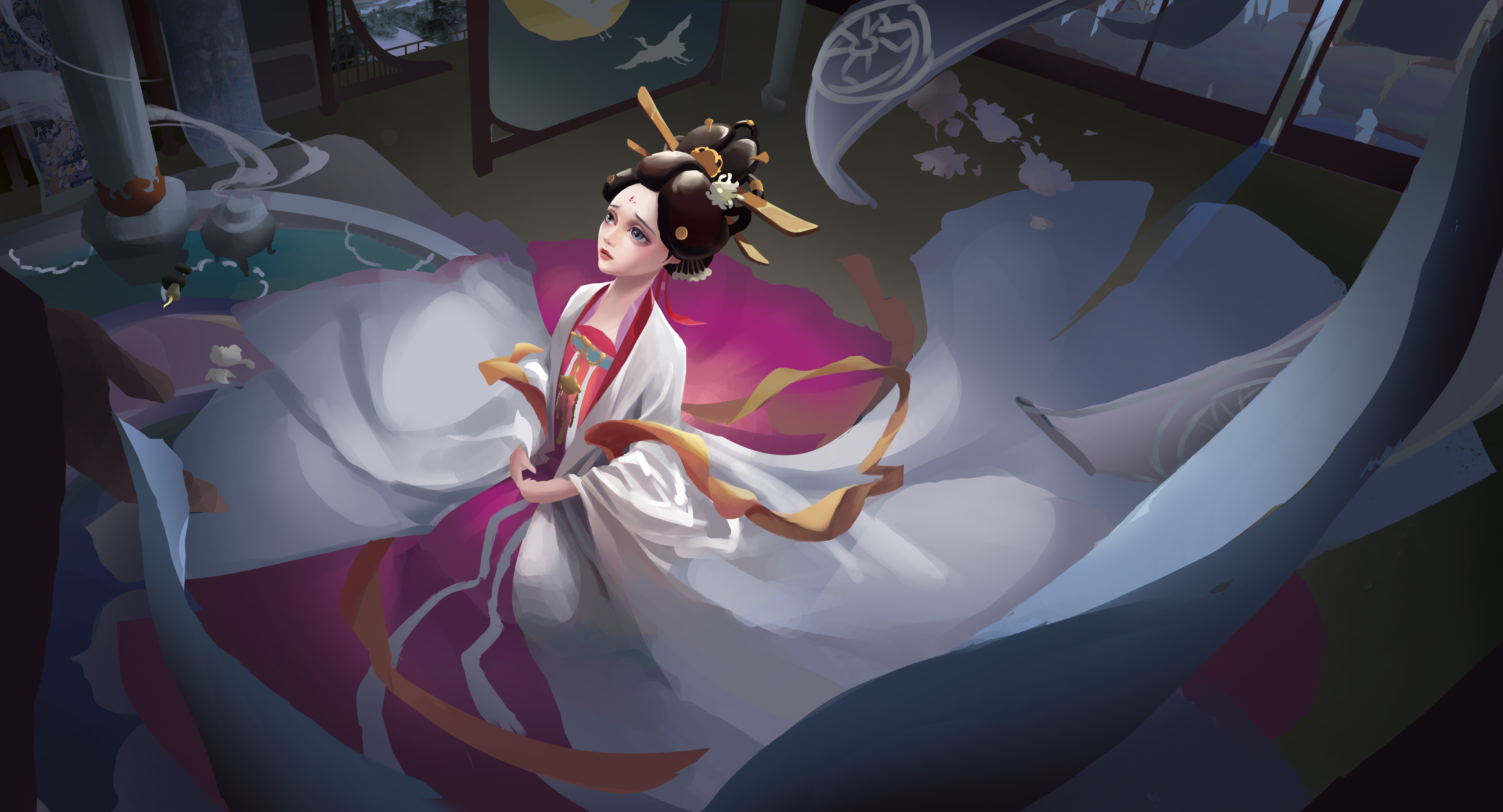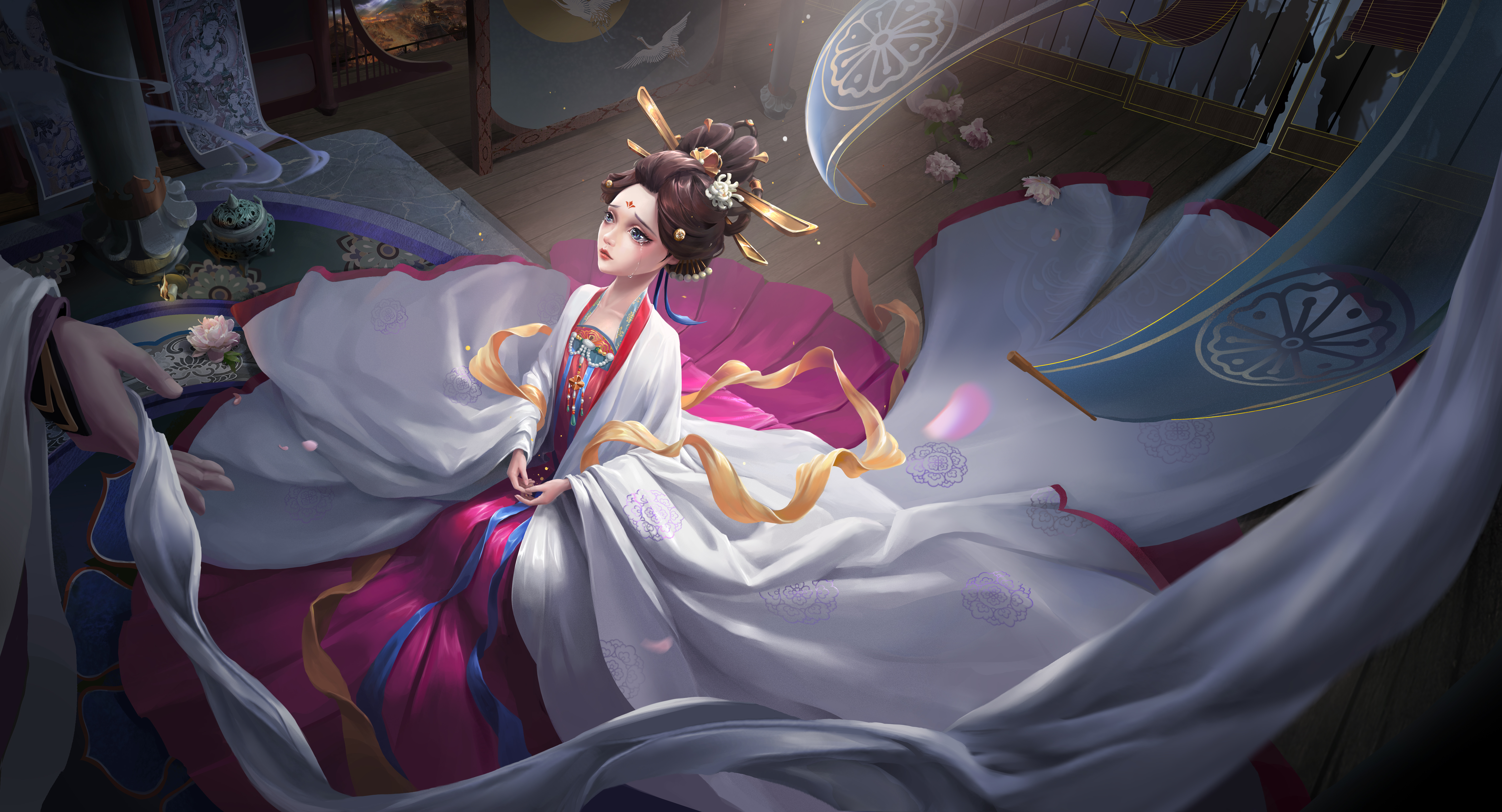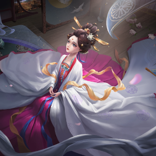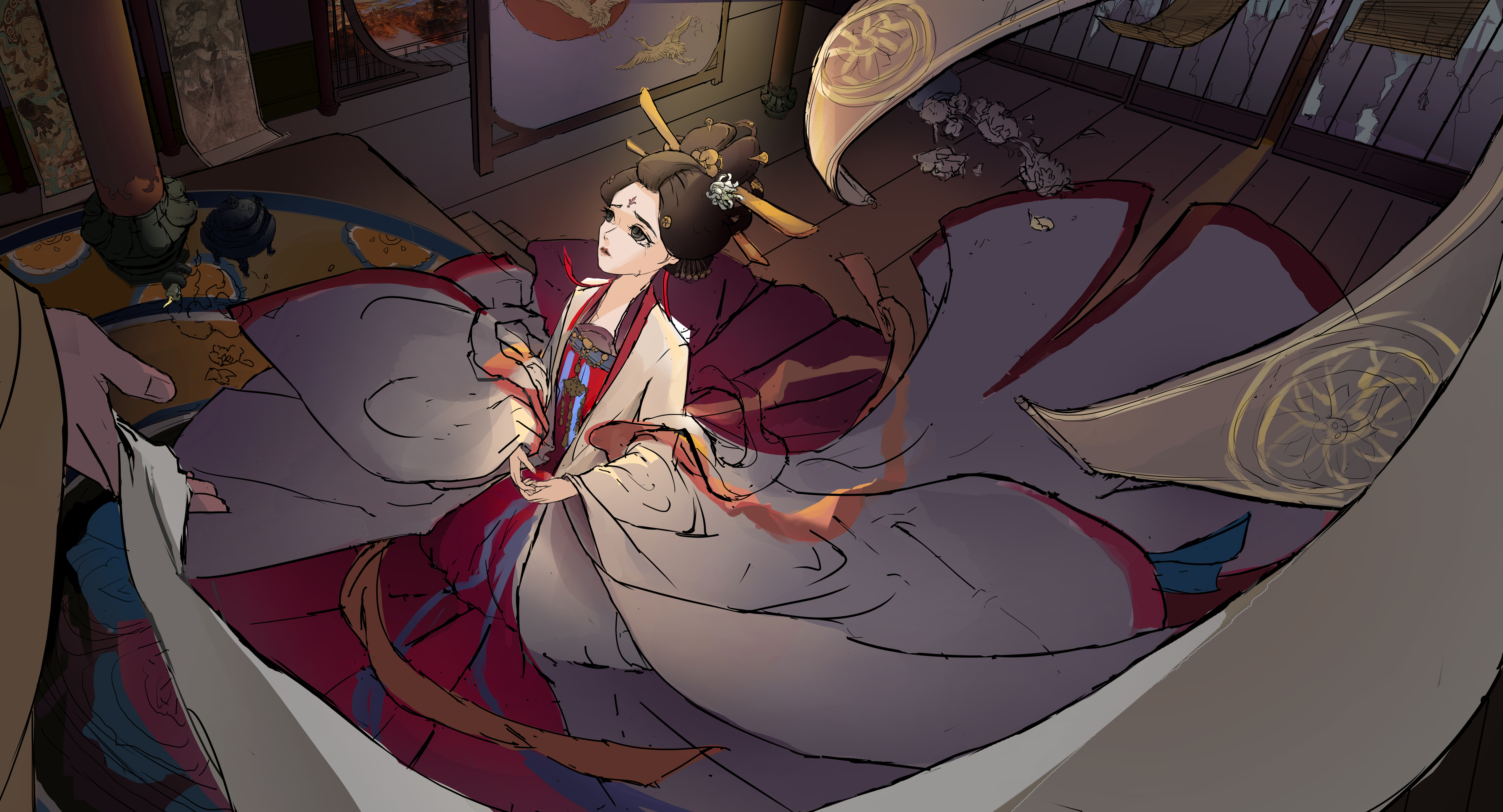 旨在表现玄宗与玉环凄美婉转的爱情传说。画面聚焦于玄宗迫于无奈亲手为玉环递上白绫的瞬间。表现玉环身处乱世如浮萍般动荡的无奈,以及家国爱情两难全的绝望气氛。