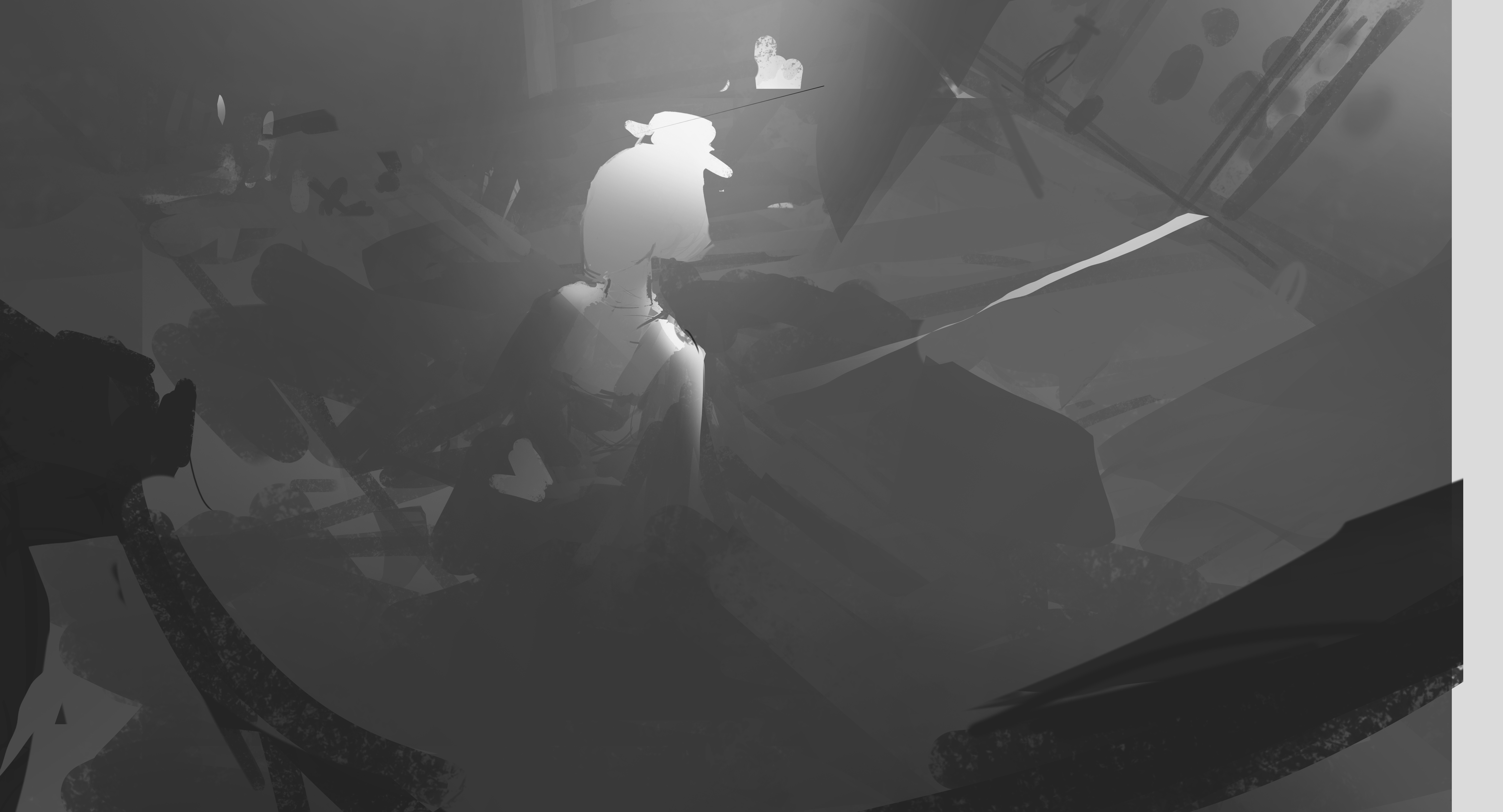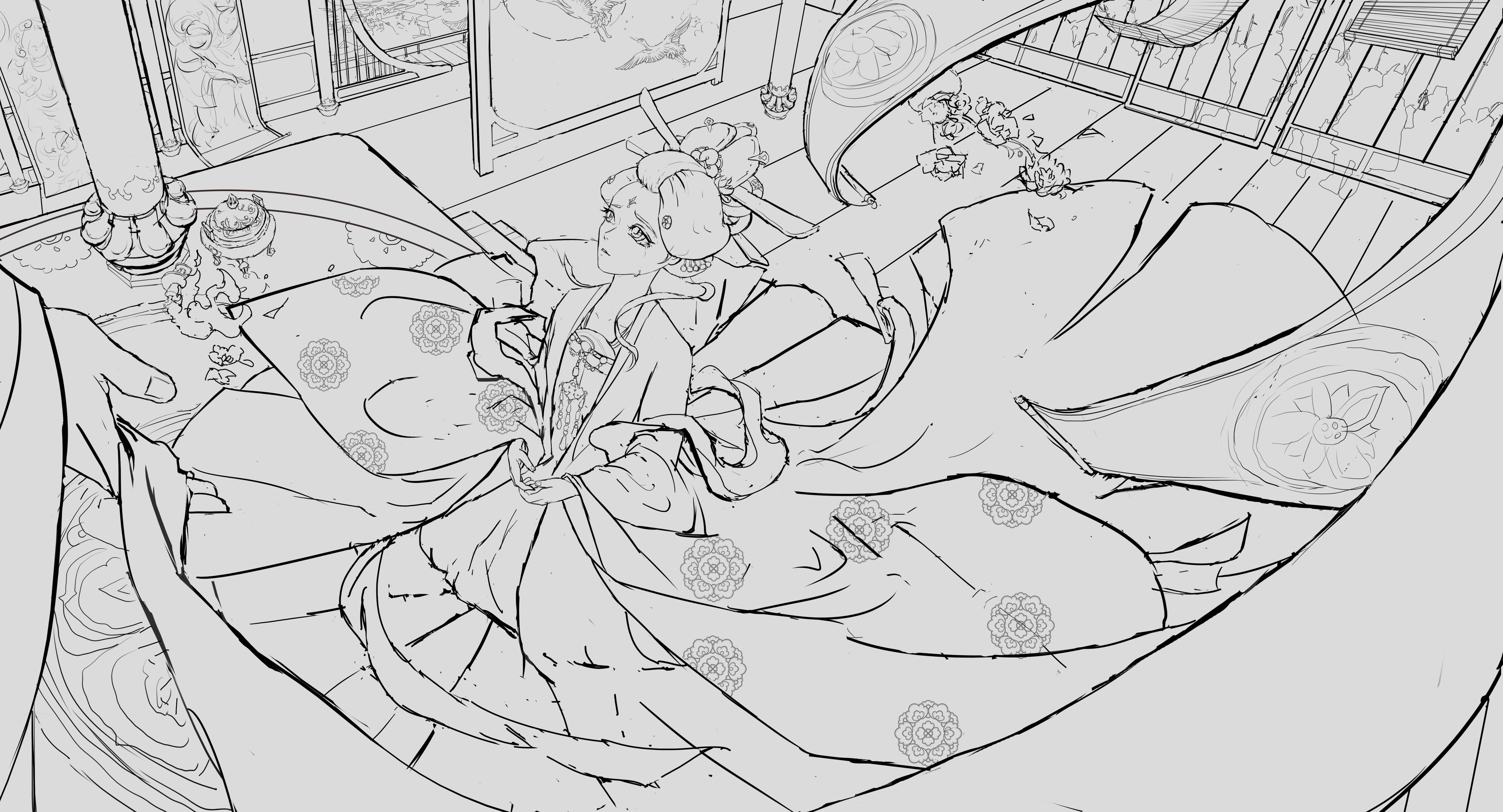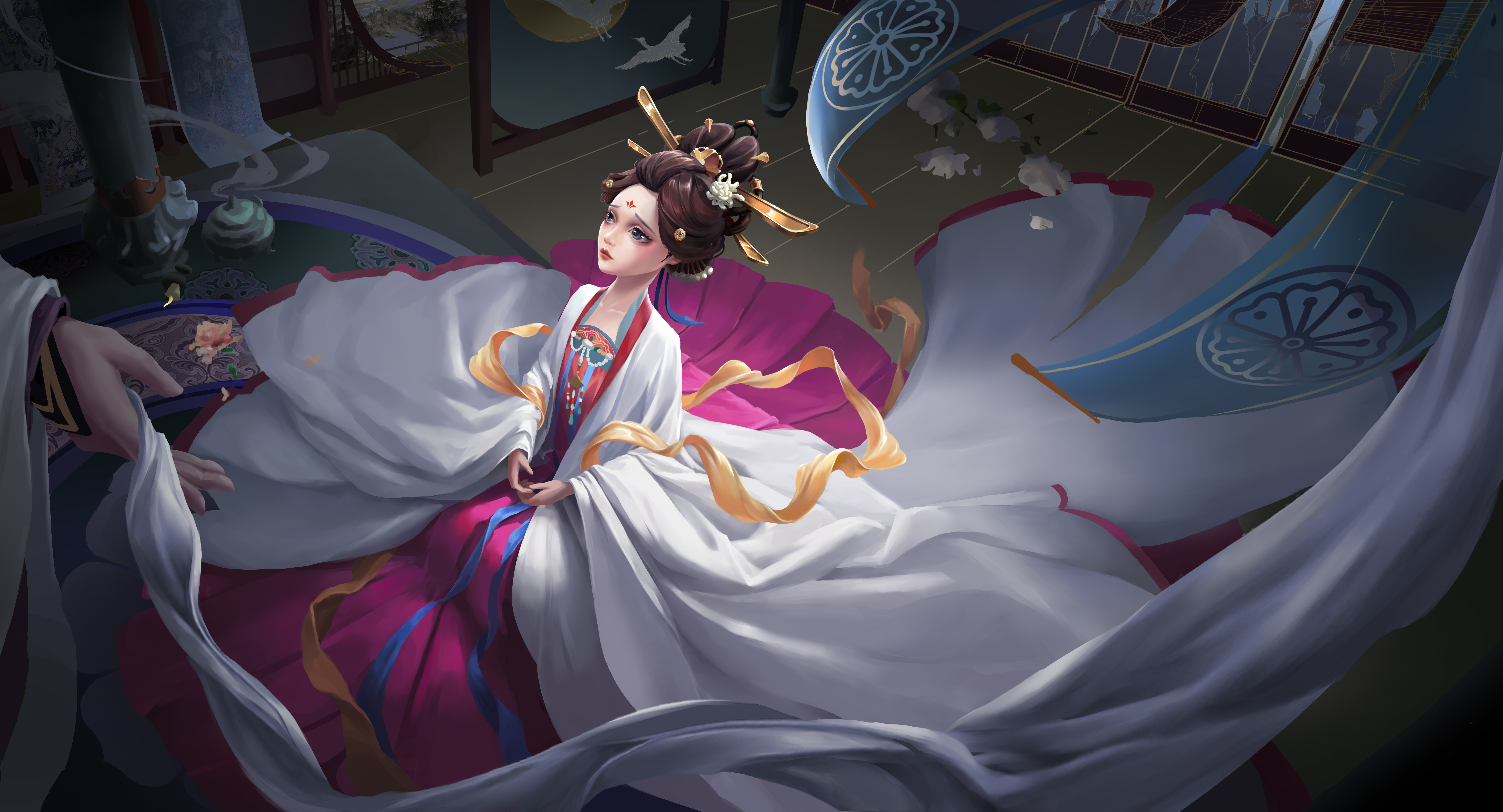 旨在表现玄宗与玉环凄美婉转的爱情传说。画面聚焦于玄宗迫于无奈亲手为玉环递上白绫的瞬间。表现玉环身处乱世如浮萍般动荡的无奈,以及家国爱情两难全的绝望气氛。