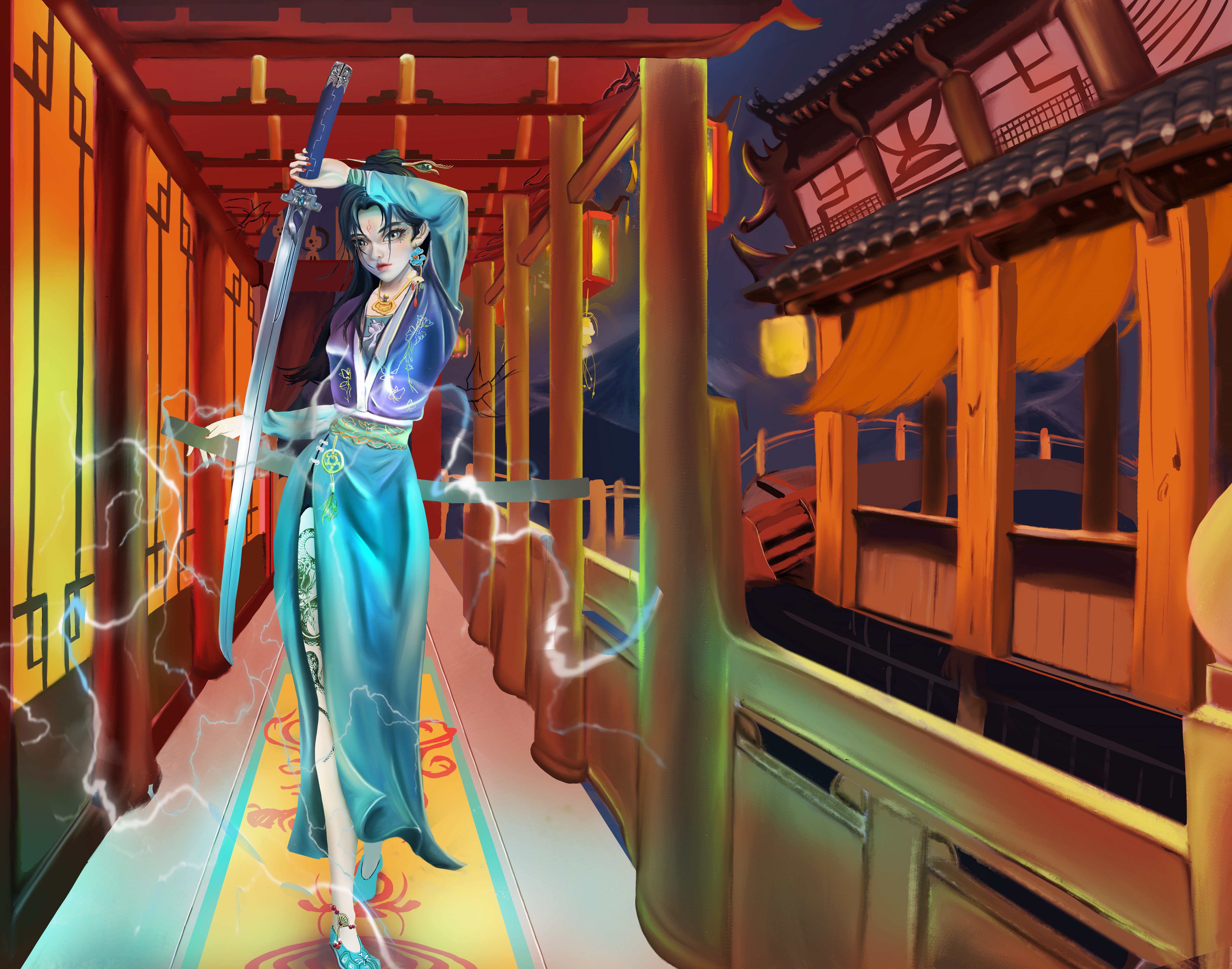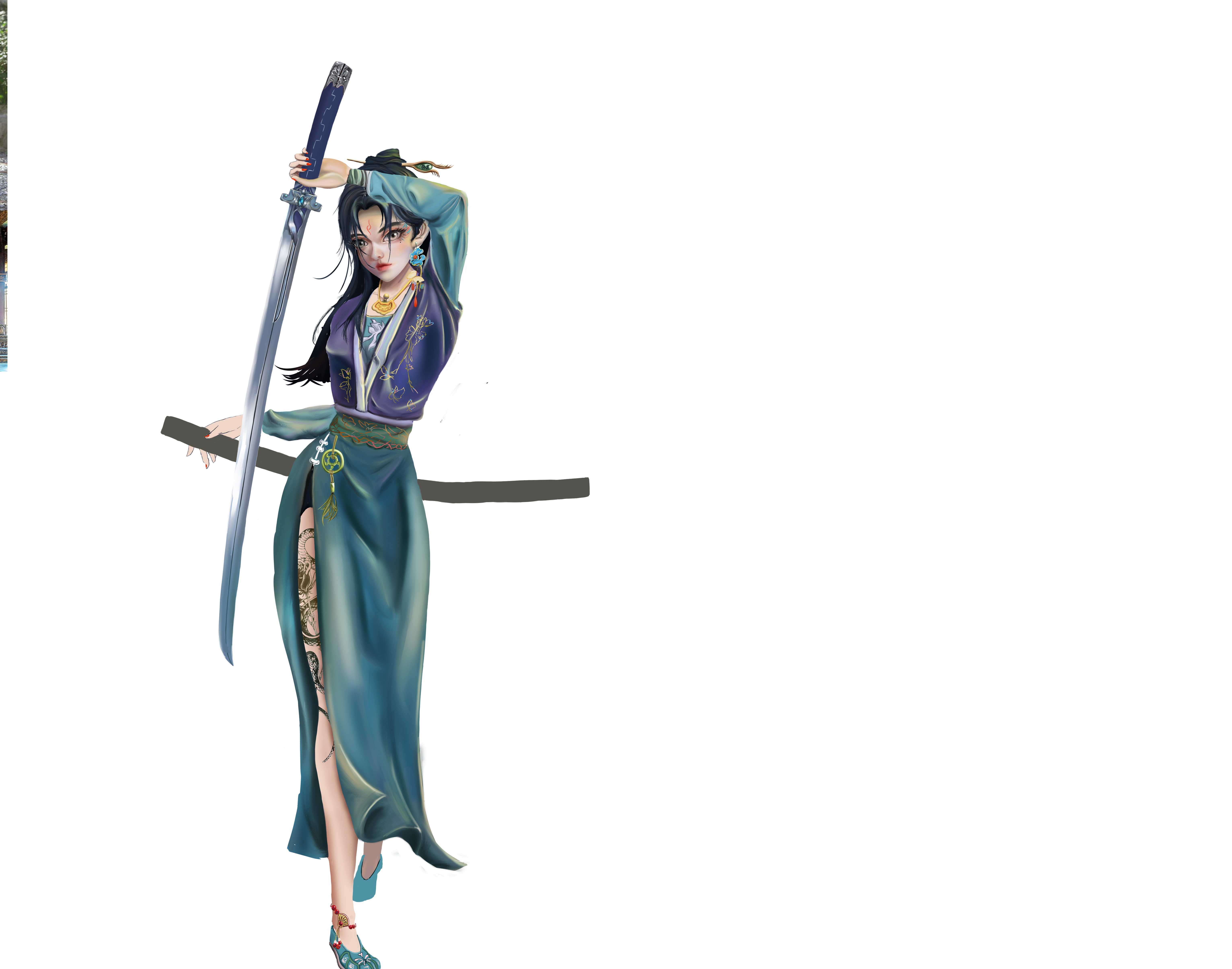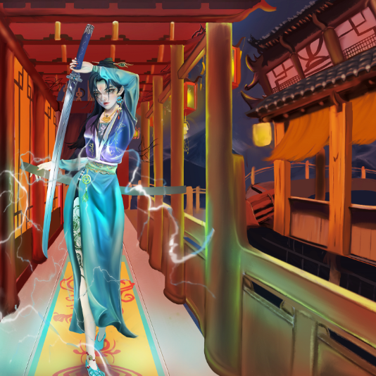 她身穿青色罗裙,长发如瀑布般披散在背后,双眸闪烁着冷酷的光芒。手中握着一柄锋利的剑,剑身散发着电光。她身姿卓越,步伐坚定,眼神杀气凛然,注视前方。带着自信的笑容,仿佛做好了一切准备,她虽为女子,但剑术无以伦比,为即将展开一场无情的战斗带着些许期待。
