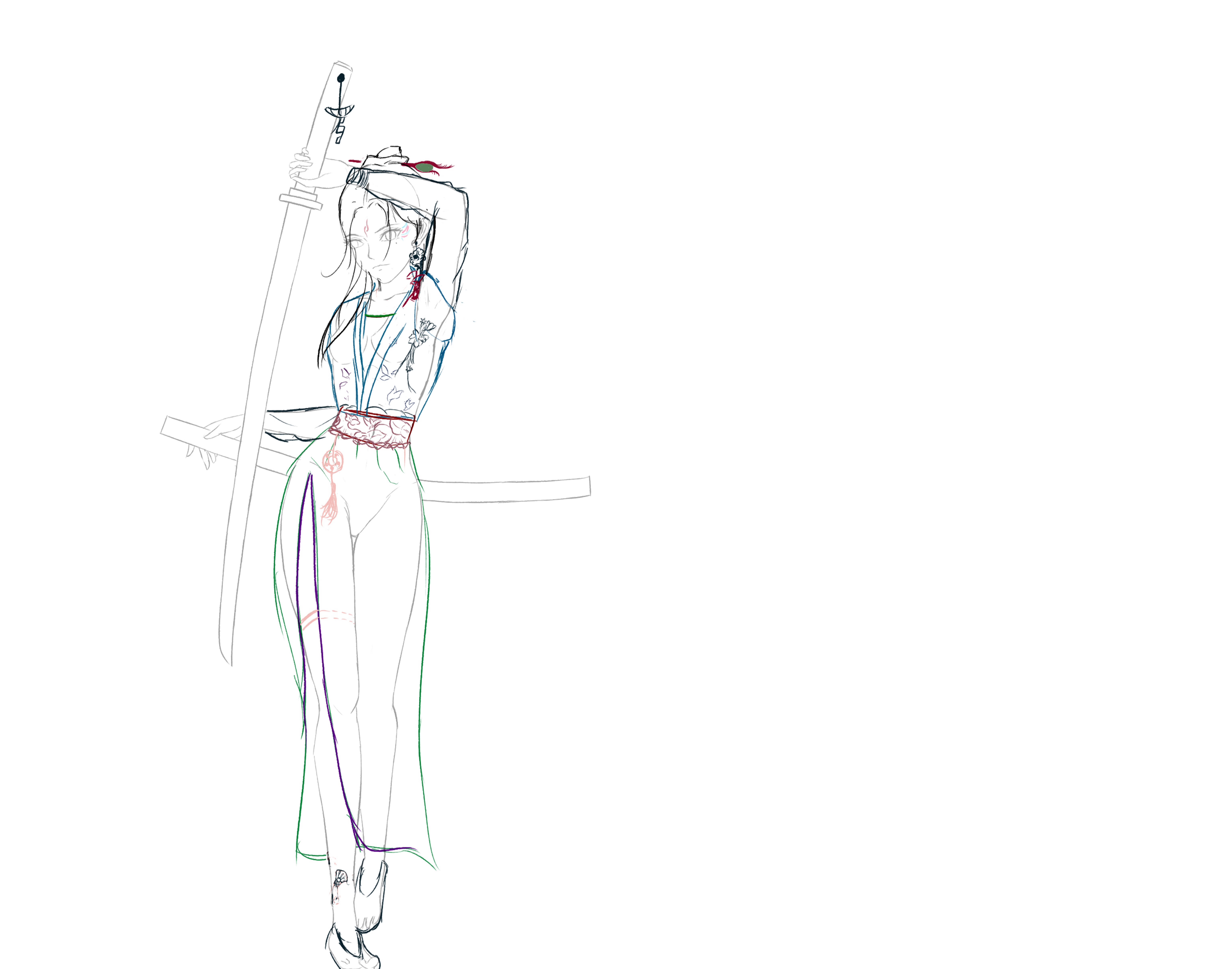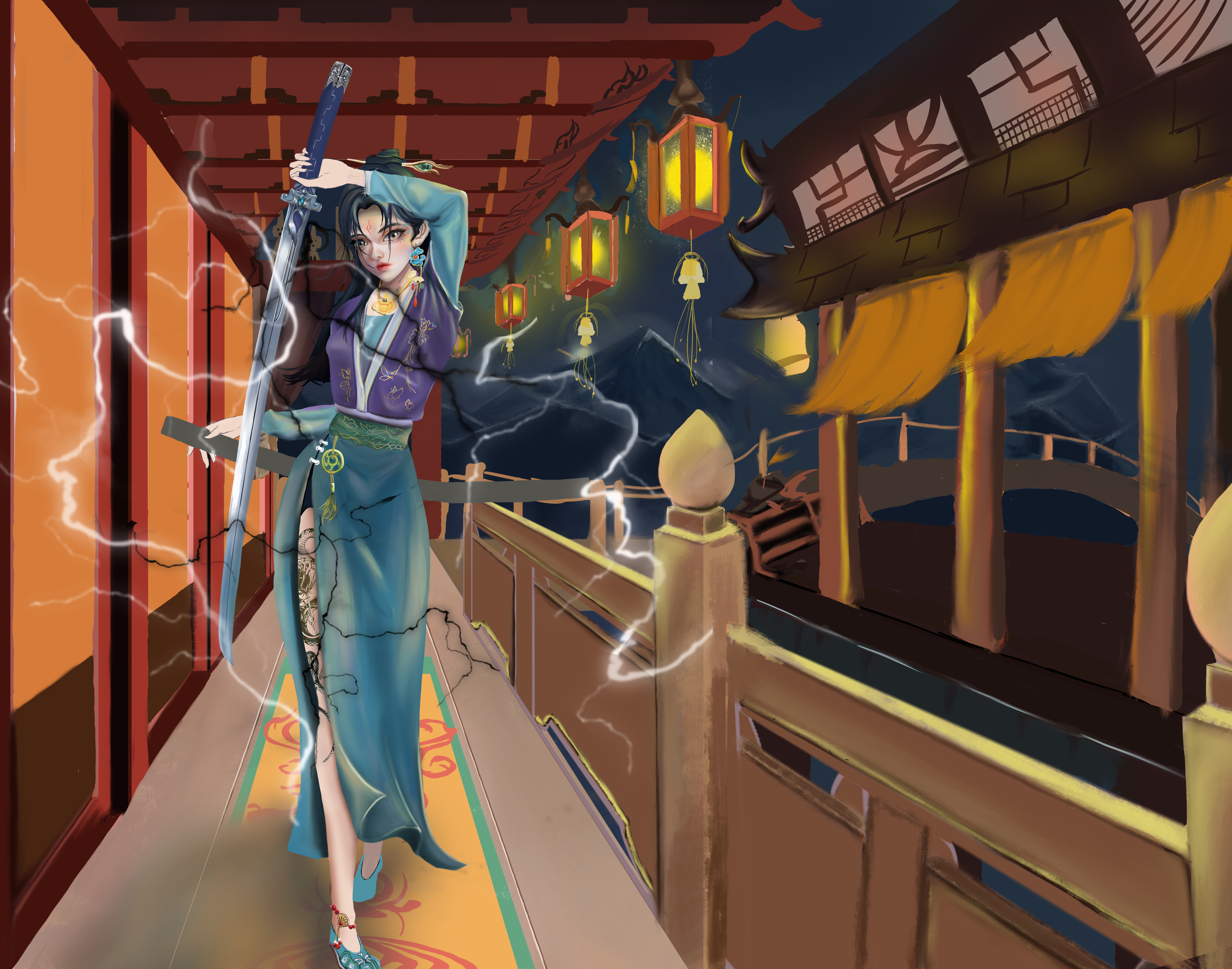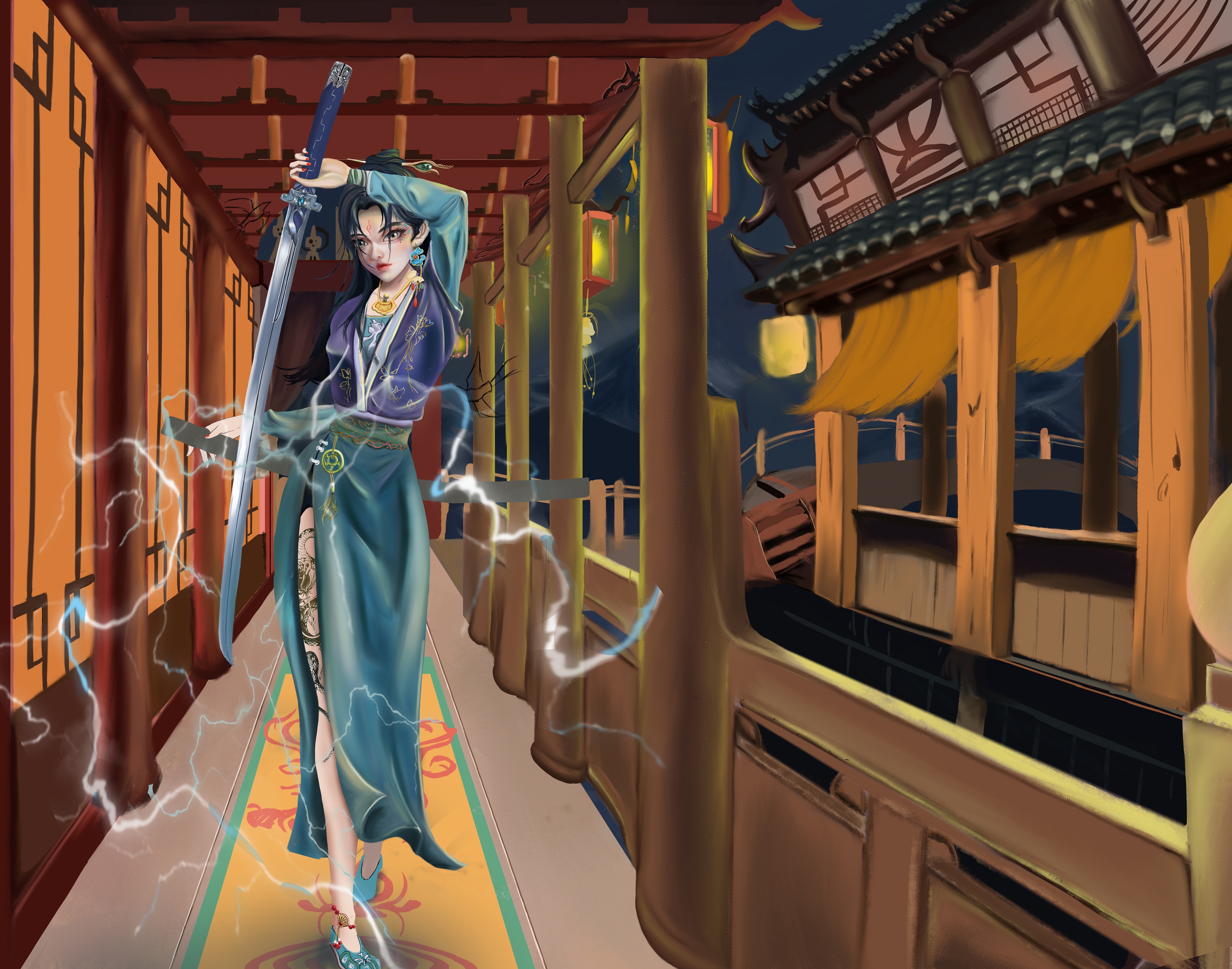 她身穿青色罗裙,长发如瀑布般披散在背后,双眸闪烁着冷酷的光芒。手中握着一柄锋利的剑,剑身散发着电光。她身姿卓越,步伐坚定,眼神杀气凛然,注视前方。带着自信的笑容,仿佛做好了一切准备,她虽为女子,但剑术无以伦比,为即将展开一场无情的战斗带着些许期待。