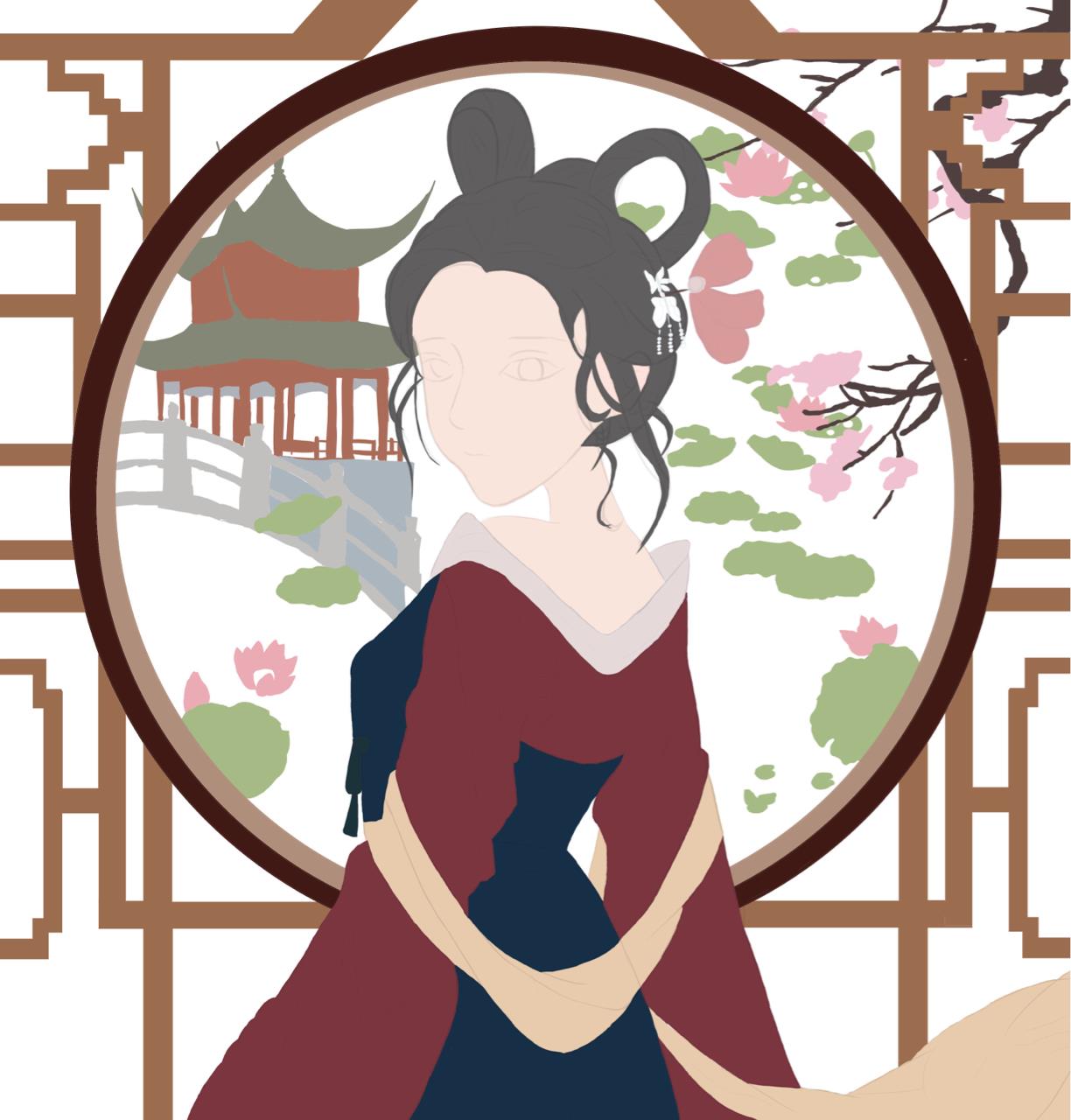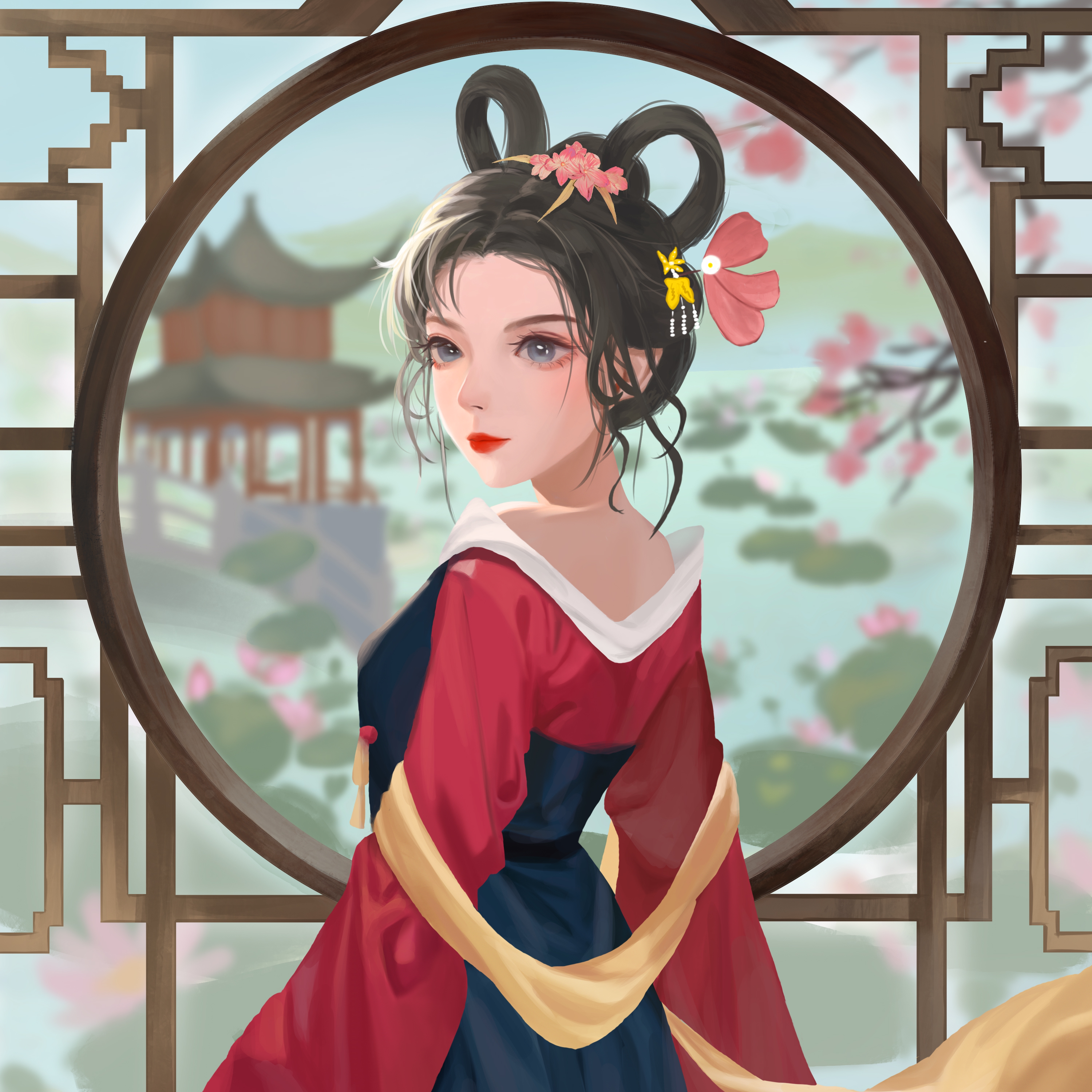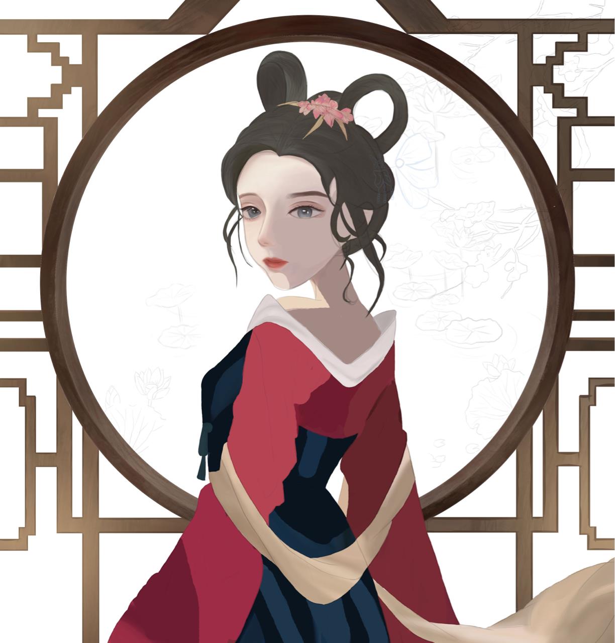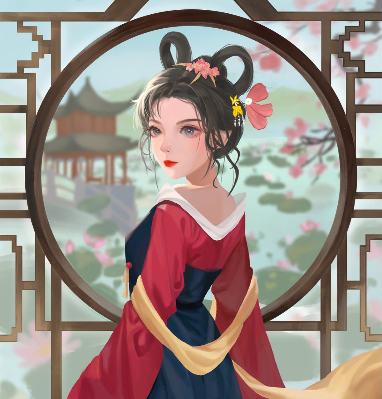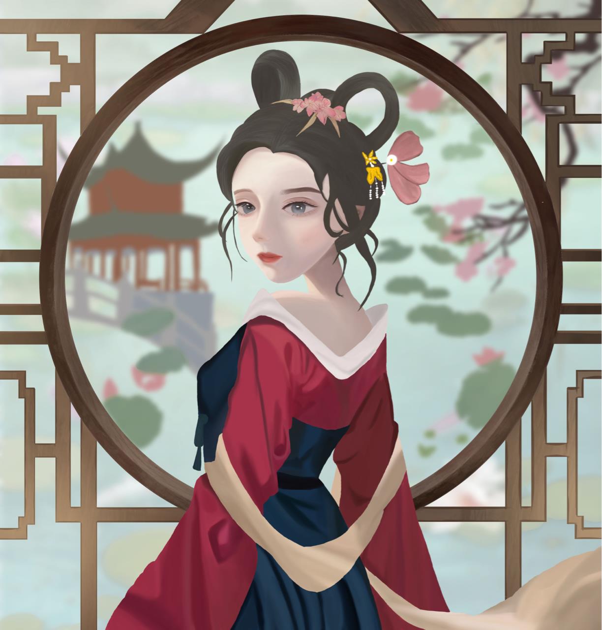 大唐之春,繁花似锦,少女细细欣赏每朵荷花怒放,不负长安城好风光。