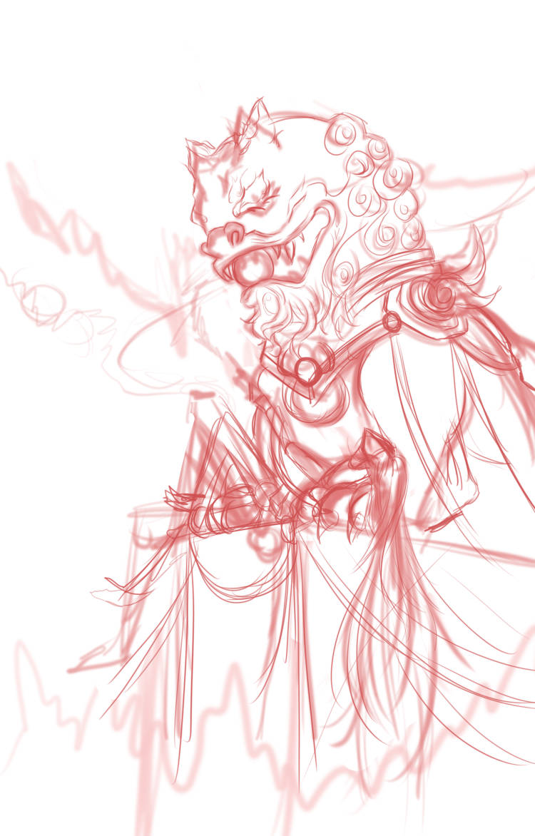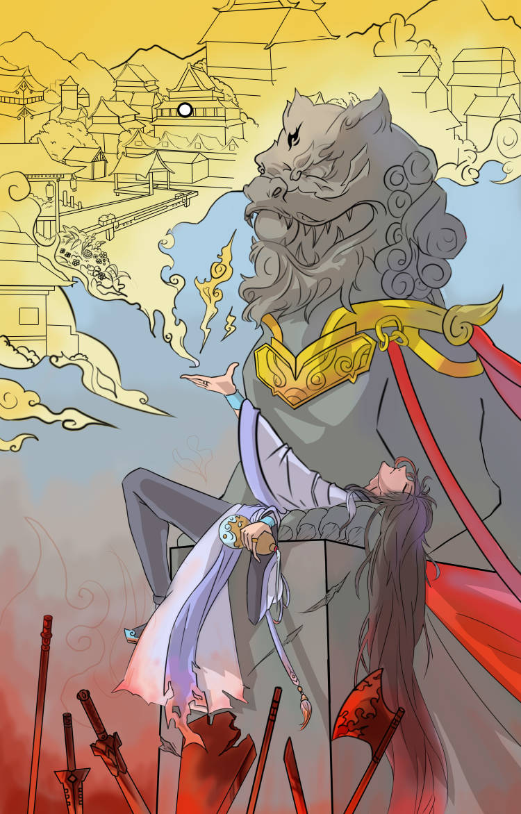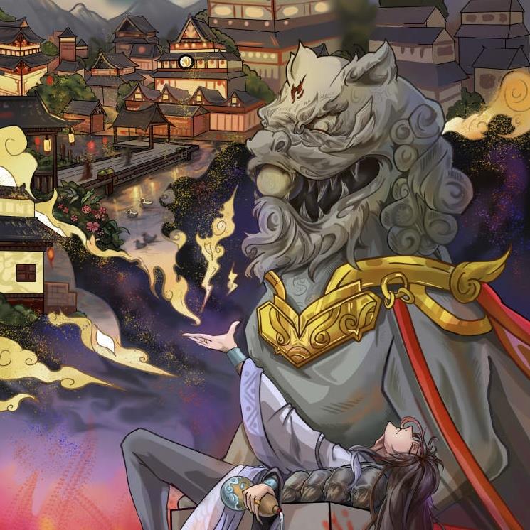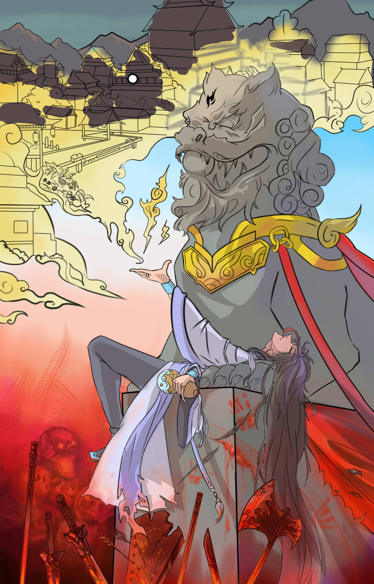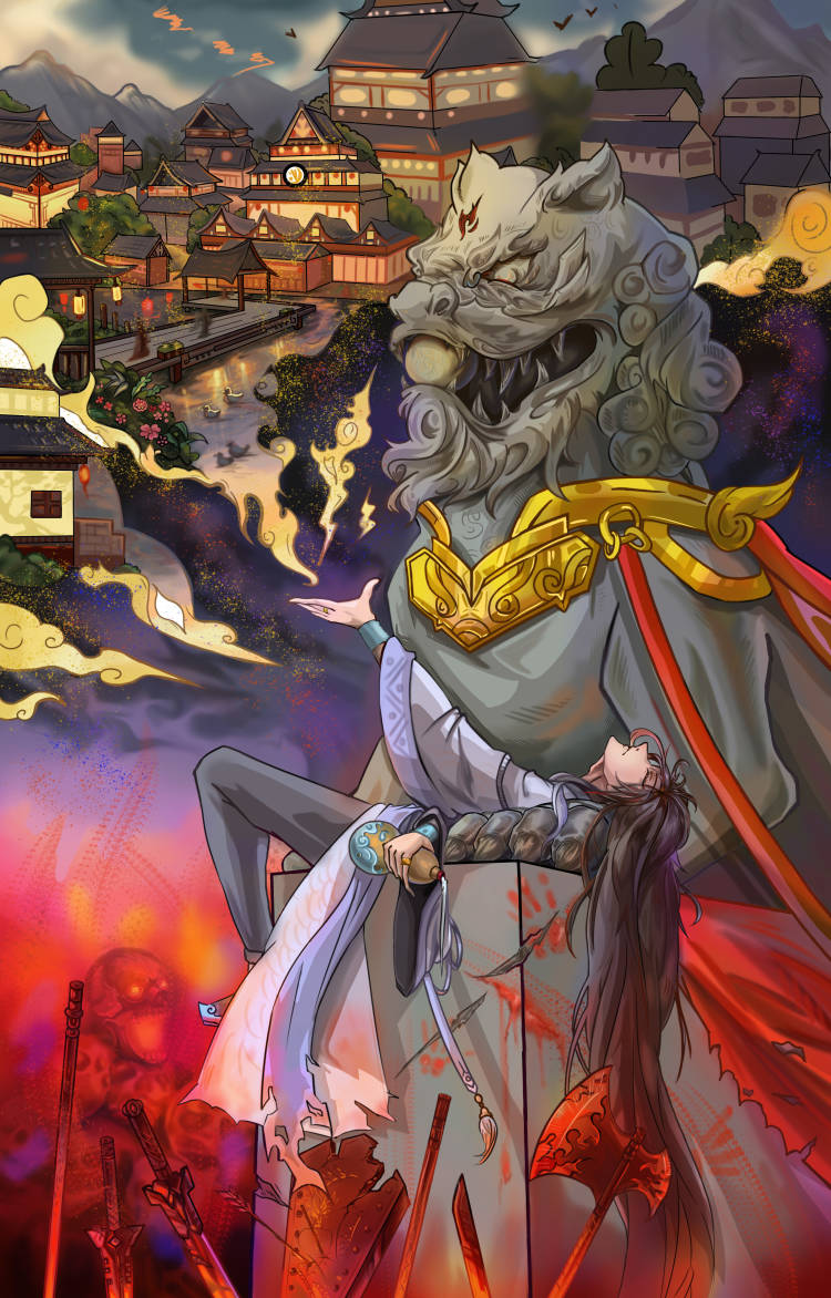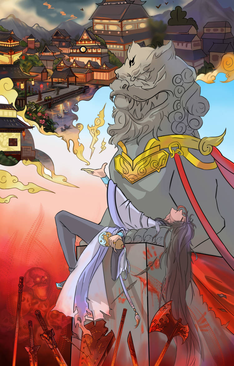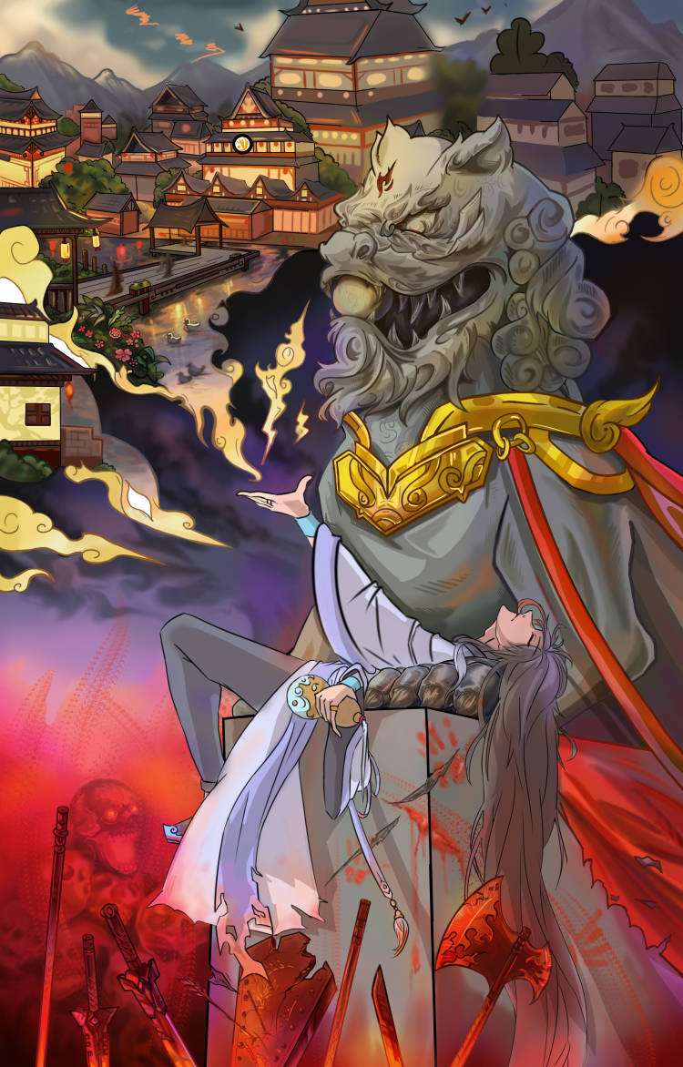 偏偏红叶常,染红刃武港。作品创作灵感来于唐朝衰败结束华丽又安定的生活,民众深处暴乱混沌,却无法阻止衰败时刻,回想起的曾经那份光明幸福的生活(大唐盛世)守望漫长冬夜对黎明的向往只是最后的结局只有绝望,也是画面构图上,上面的幻想的盛世繁华,随着视线向下移动,也就变成了历史最后本来的样子,巅峰一去不复返,只有战火不断民不聊生,通过画面的上下区分唐朝两个阶段的区别,而石狮子则作为时间的概念,也是通过上下的对比,负责表达盛世唐衰,石狮子的上半部分会光亮华贵,透露这大唐巅峰的荣耀,下半部分则是破败不堪满目疮痍,表现唐朝衰落的悲凉凄惨,而躺在石狮子是的角色这负责把画面需要表达的反差带给观众,深处其中有的只有对唐的惋惜。