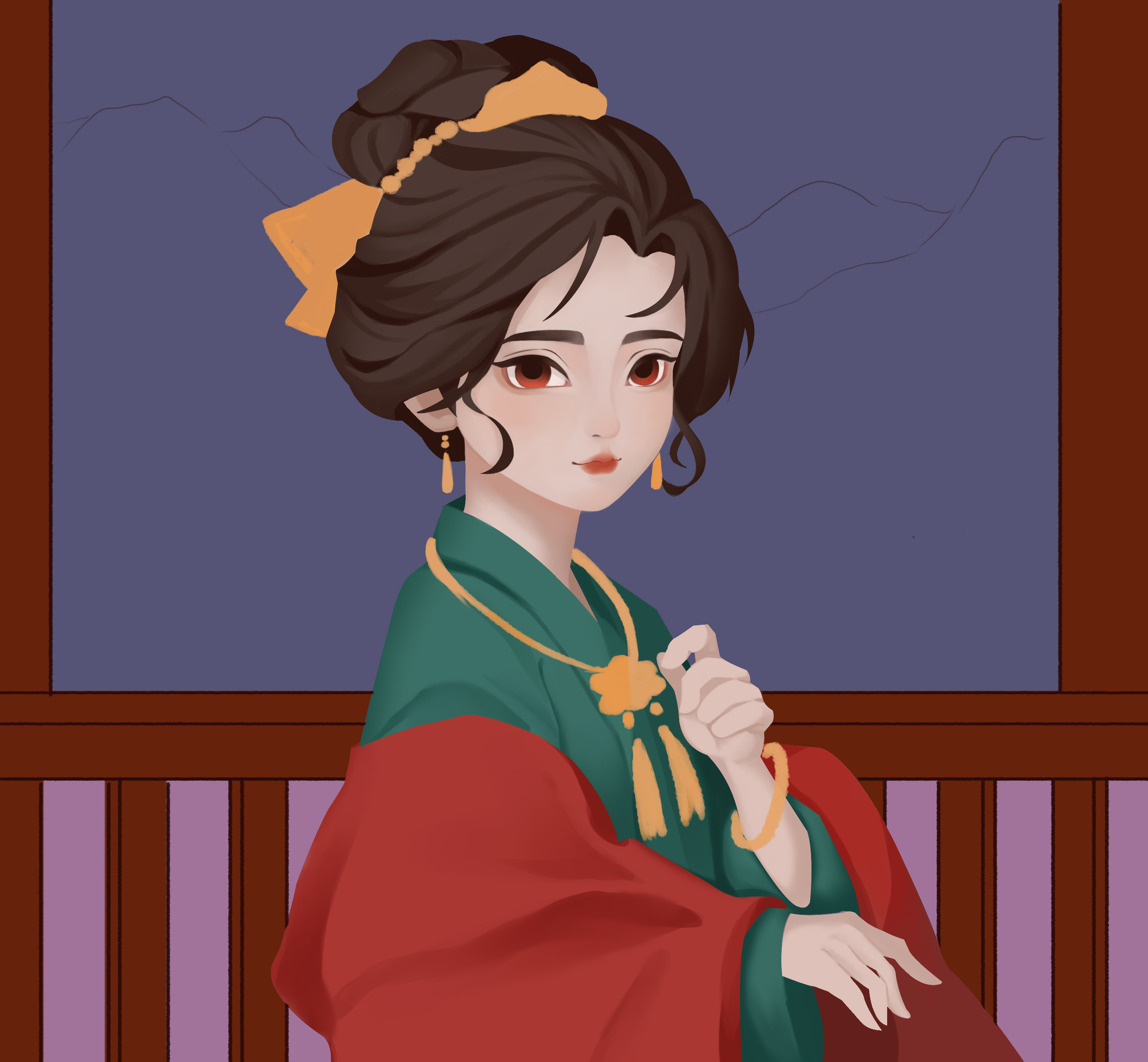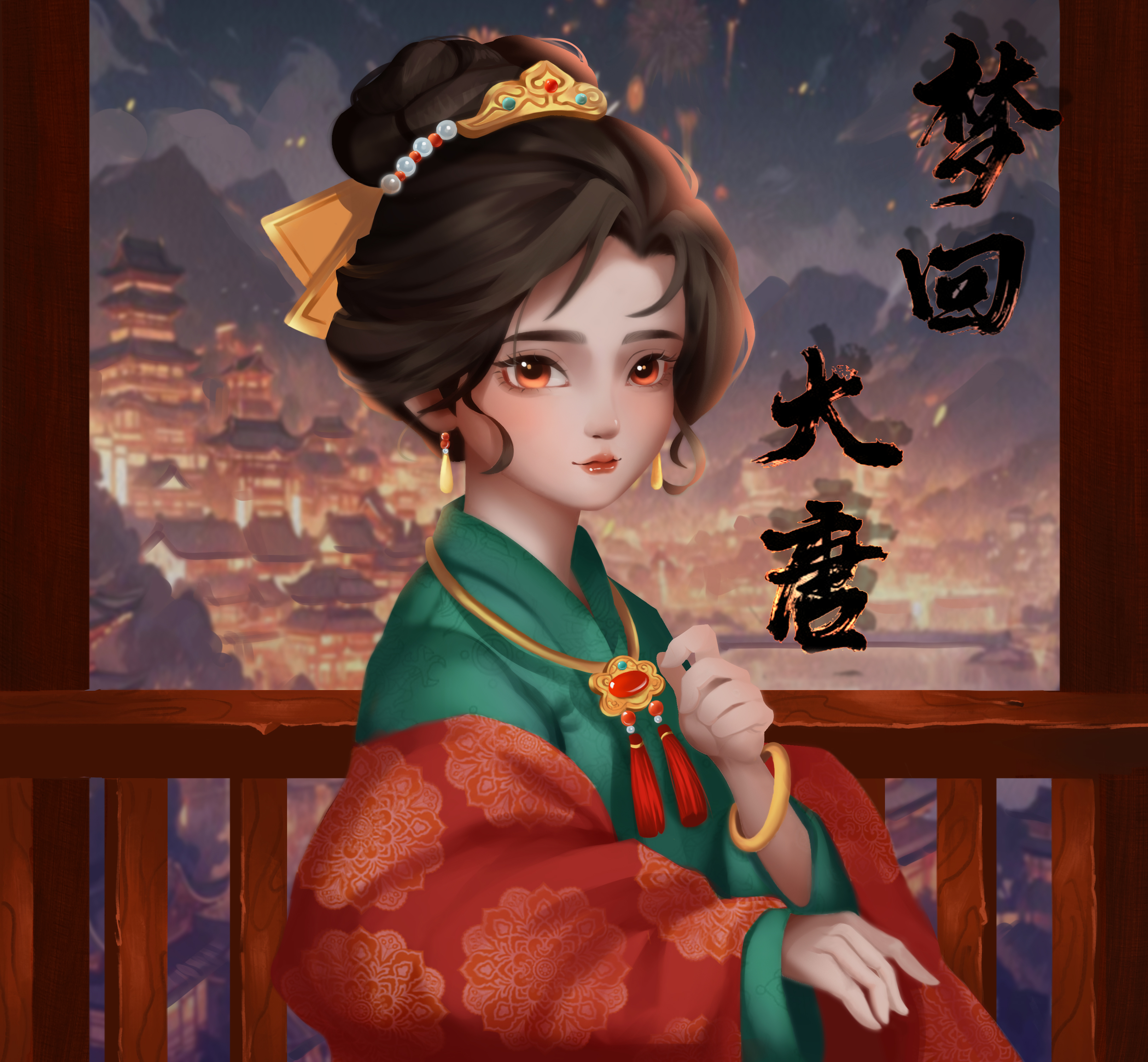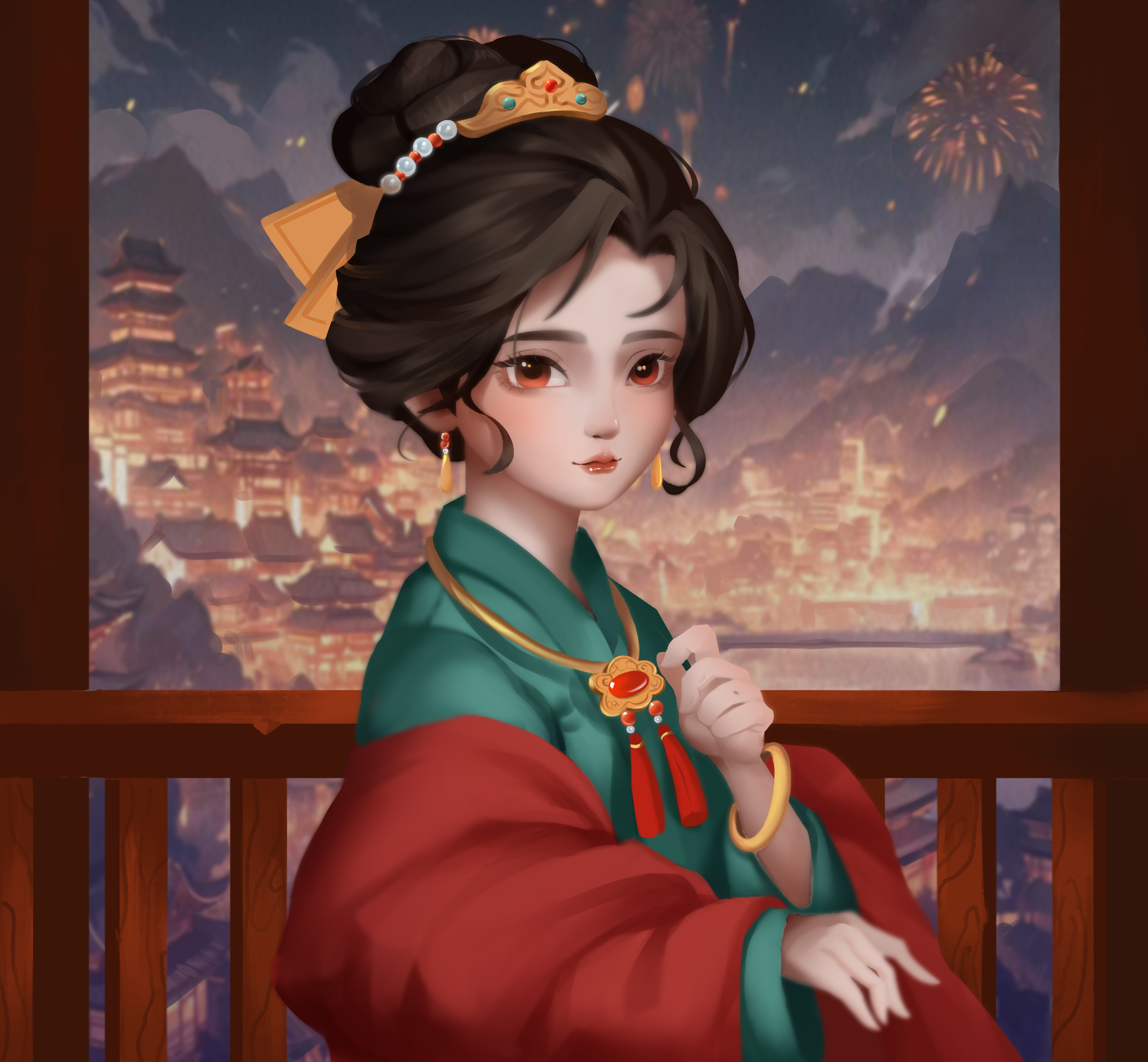 富家小姐在高楼上,欣赏灯会美景