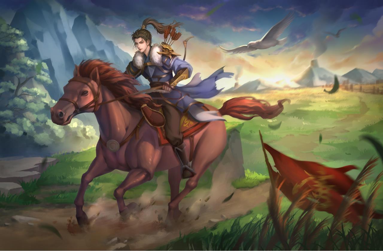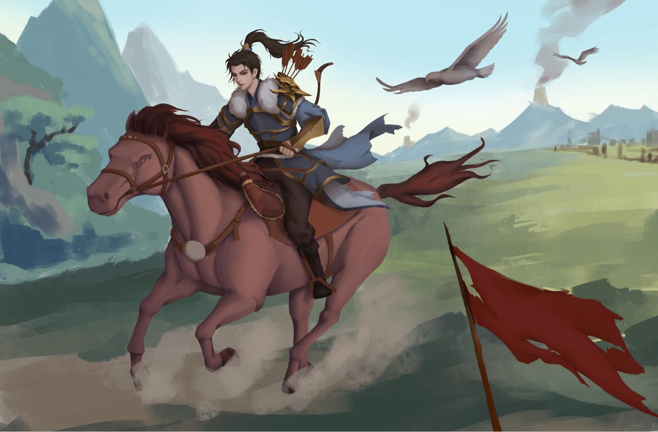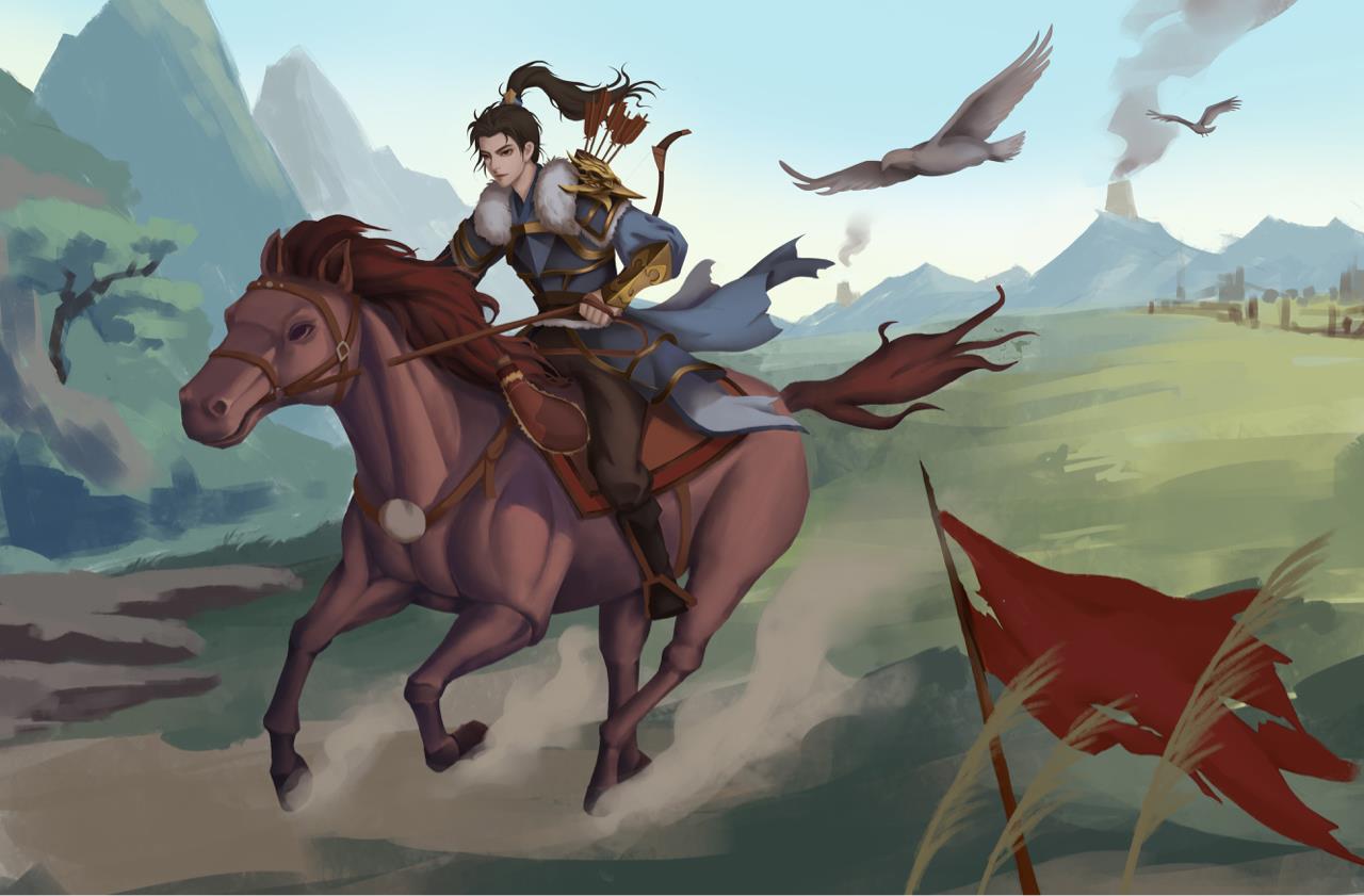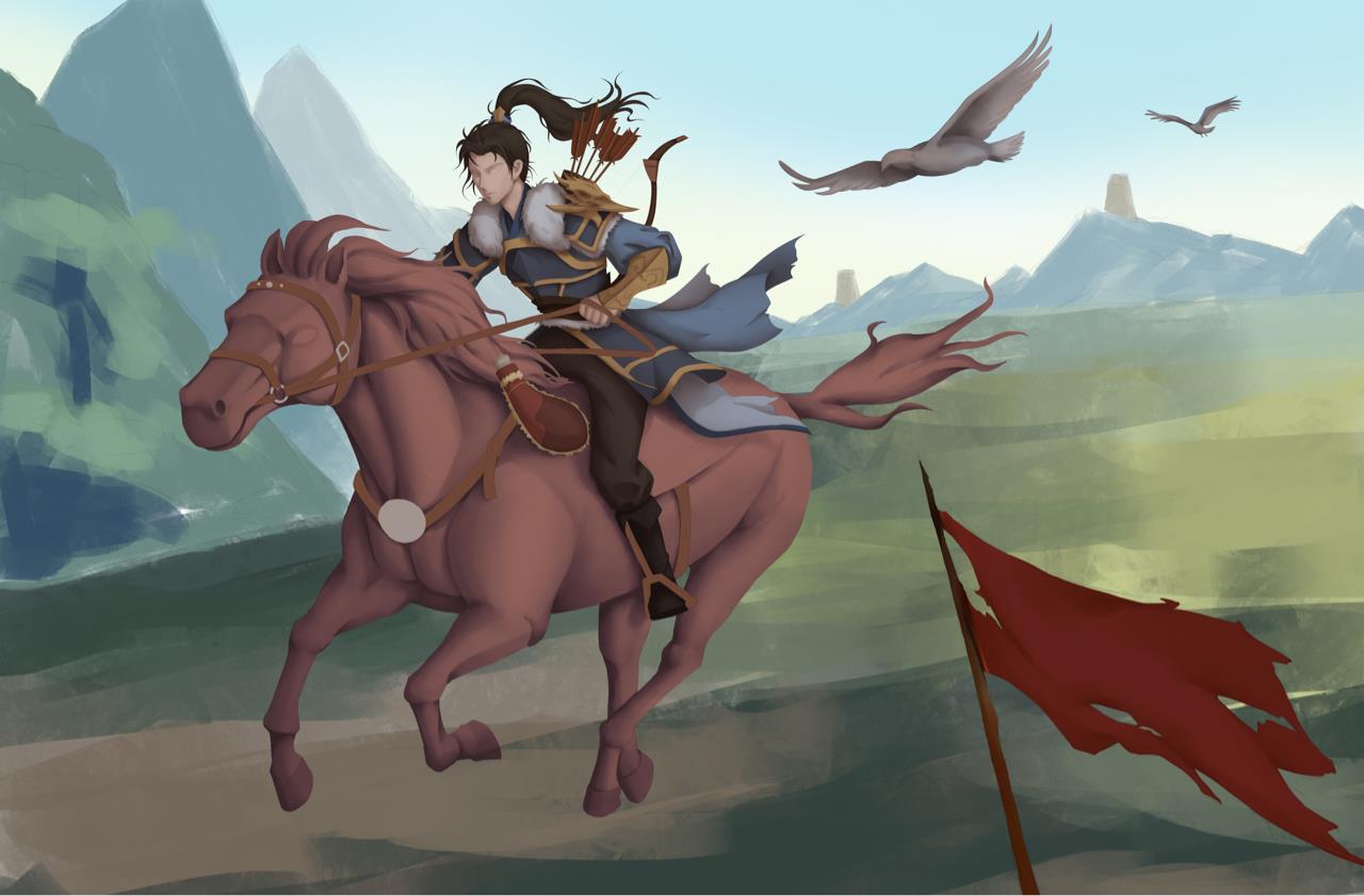 作品名叫《烽火》,作品的背景发生在唐朝统一战争时期,最终唐朝得以扫灭群雄,重新统一天下。画面主体是一个士兵骑着马赶着去报信,士兵的肩部和天上都有鹰的元素,象征着勇猛的士兵,部队的高度训练和迅速行动能力,而在唐代或更早期的宫殿和寺庙中也常常会有鹰雕像,用以象征皇室的上帝圣洁的恩赐,圣鹰以其伟大的象征意义,也能为战士们提高士气。背景的远山上的烽火台也点了题,大唐盛世从这场战争开始了。