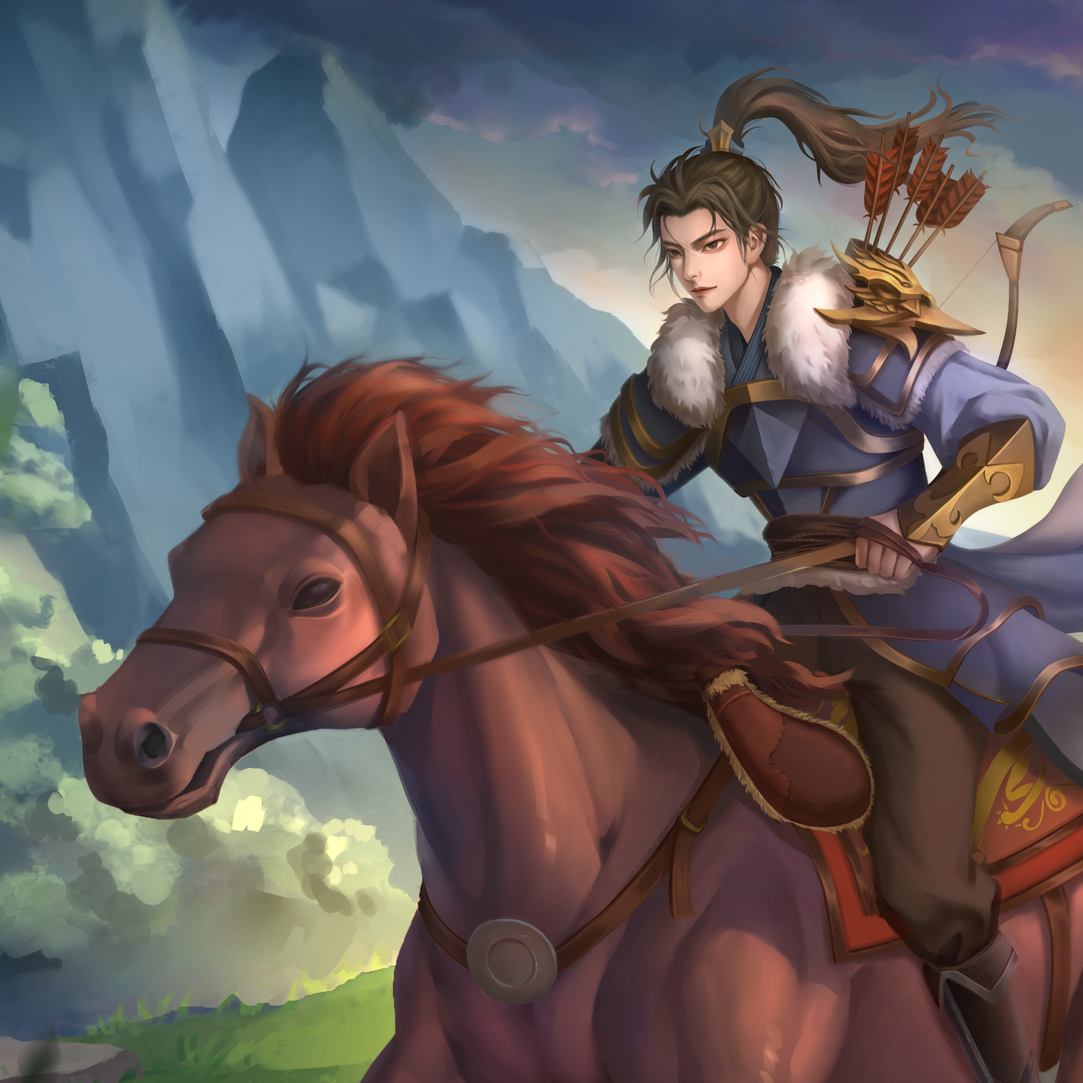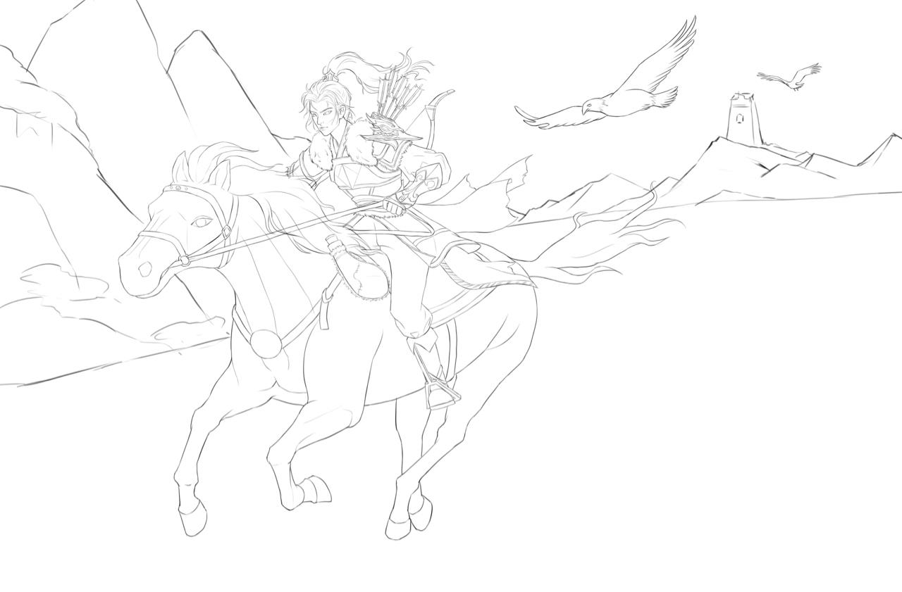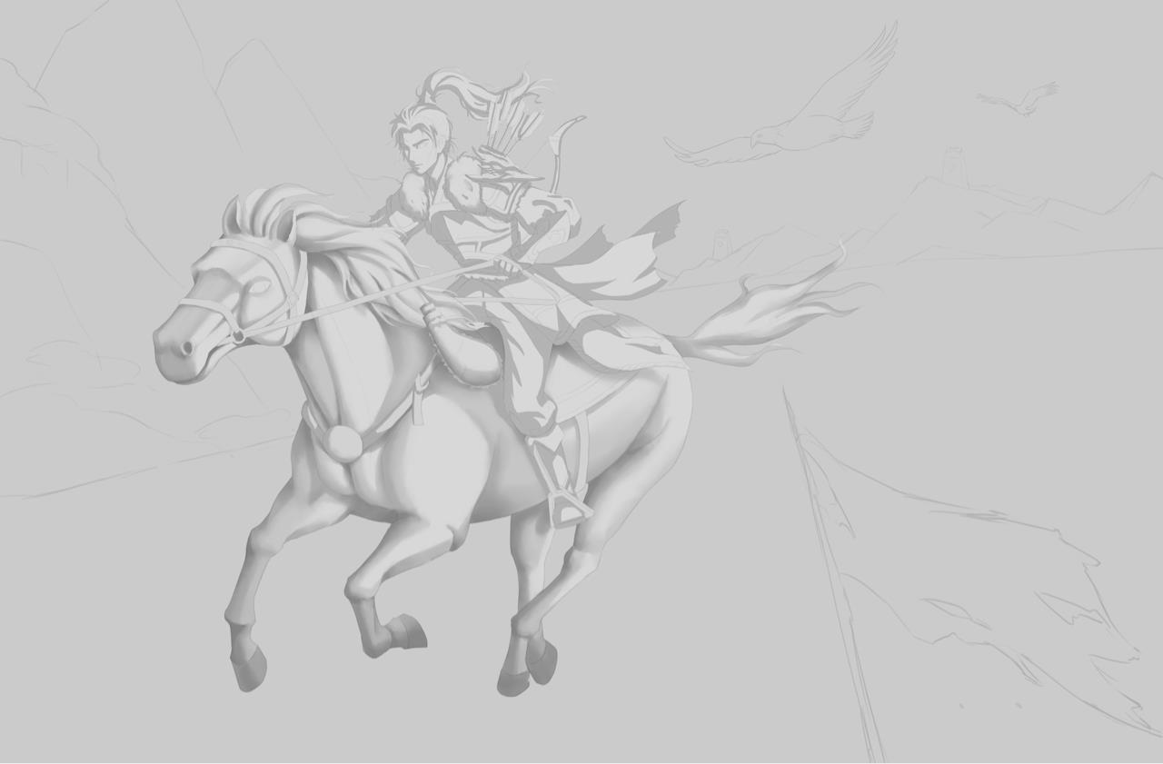 作品名叫《烽火》,作品的背景发生在唐朝统一战争时期,最终唐朝得以扫灭群雄,重新统一天下。画面主体是一个士兵骑着马赶着去报信,士兵的肩部和天上都有鹰的元素,象征着勇猛的士兵,部队的高度训练和迅速行动能力,而在唐代或更早期的宫殿和寺庙中也常常会有鹰雕像,用以象征皇室的上帝圣洁的恩赐,圣鹰以其伟大的象征意义,也能为战士们提高士气。背景的远山上的烽火台也点了题,大唐盛世从这场战争开始了。