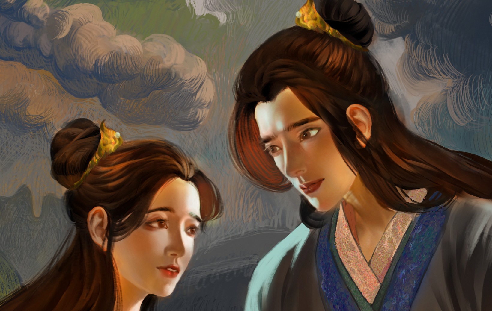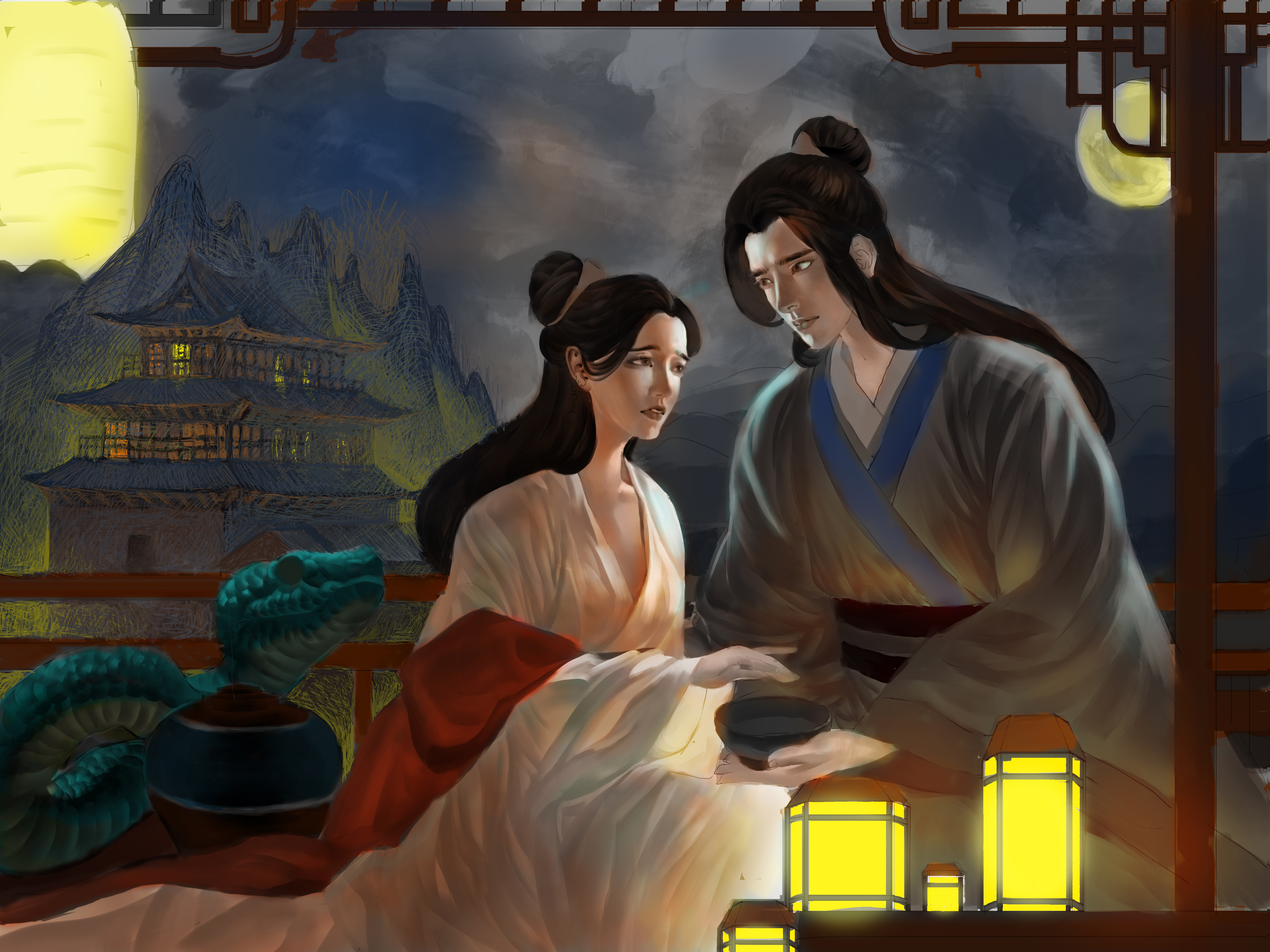 我习惯先画光影再上色,他们的衣服色彩朴素,说明只是普通的老百姓身份,在宁静的黑夜,虽然只有些许温暖的烛光,但也叫人温暖心头。