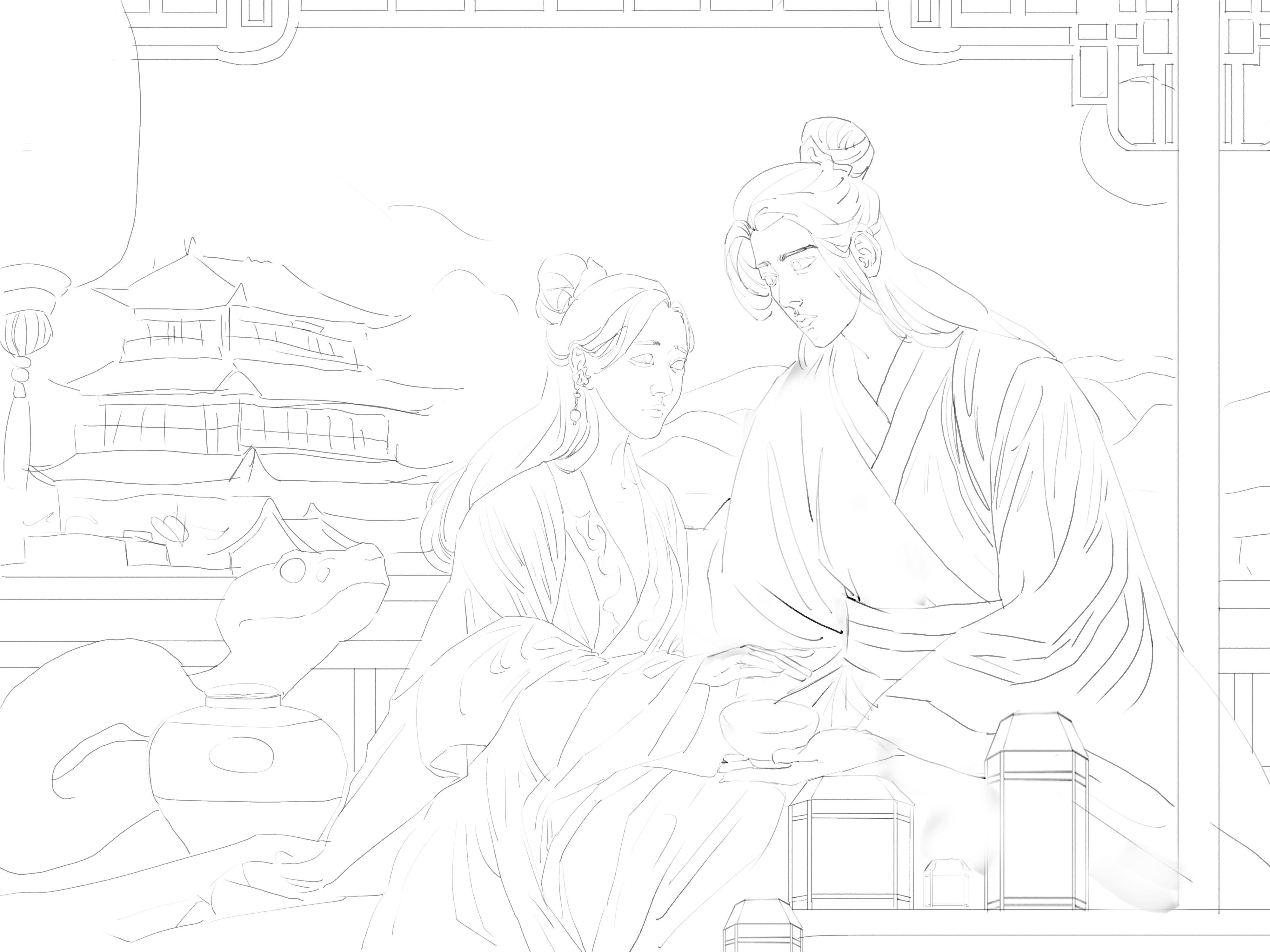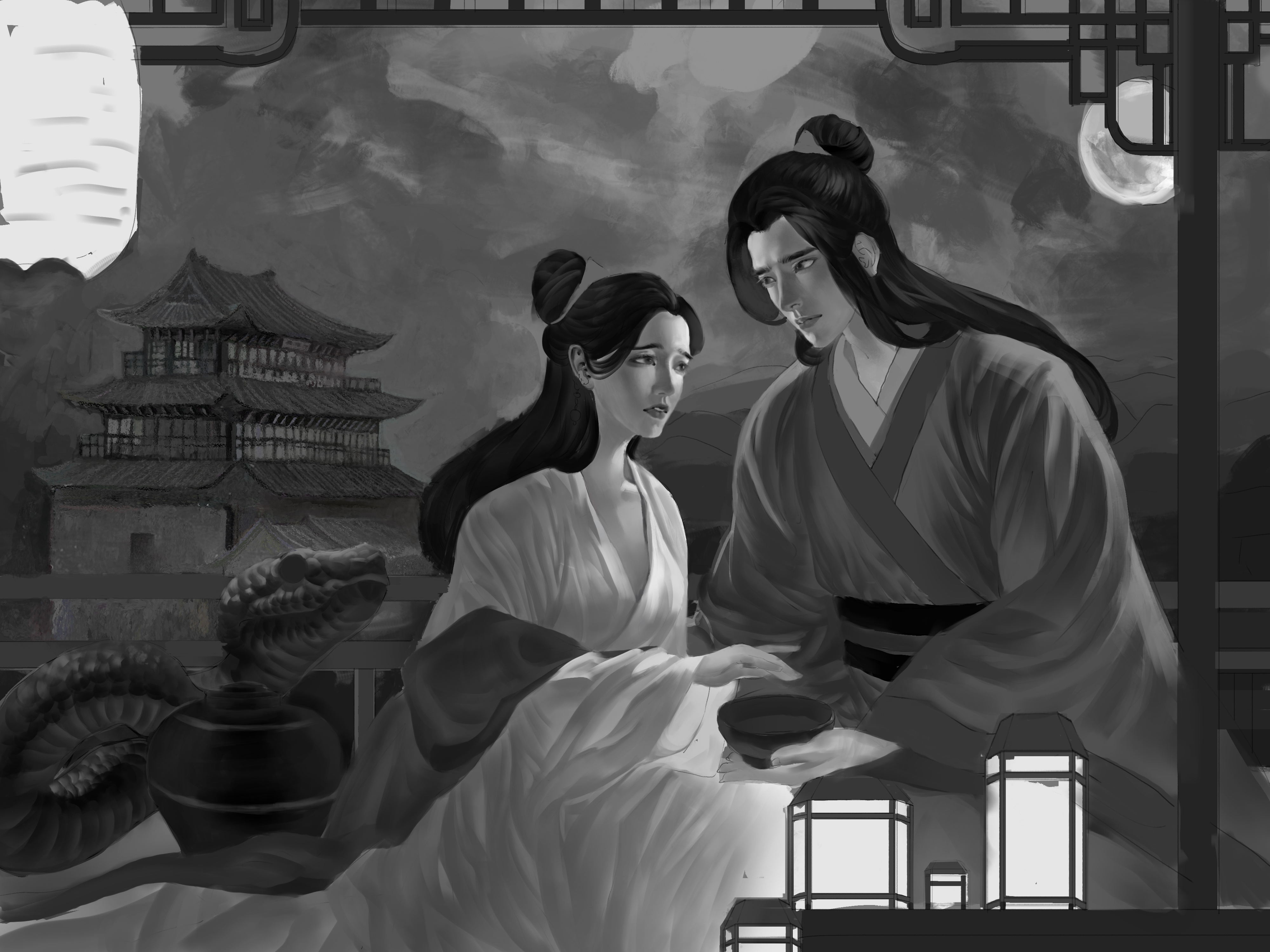 完成线稿后,我定下了整个画面的大致光影,分开色调,进行初步的光影细化。