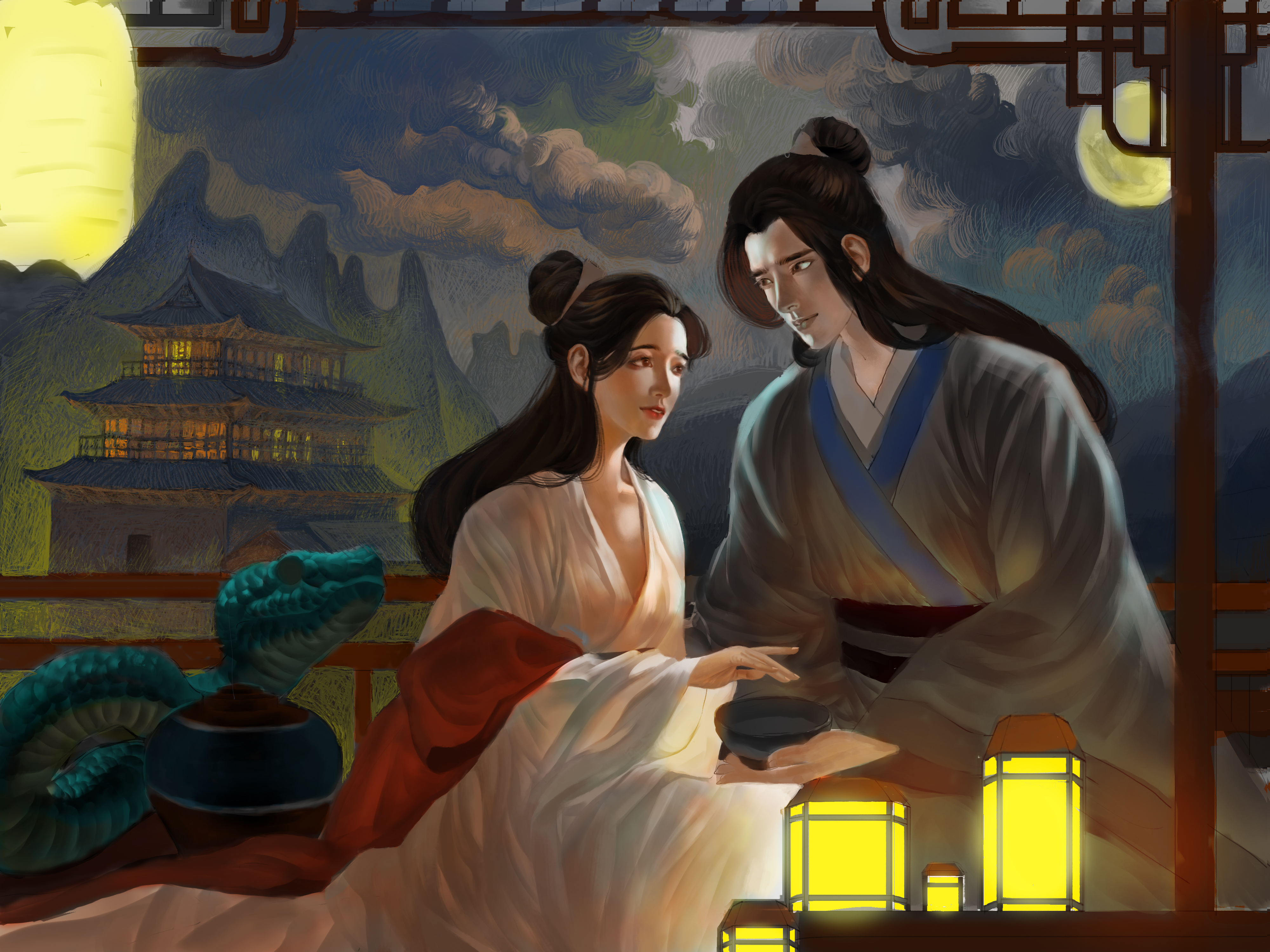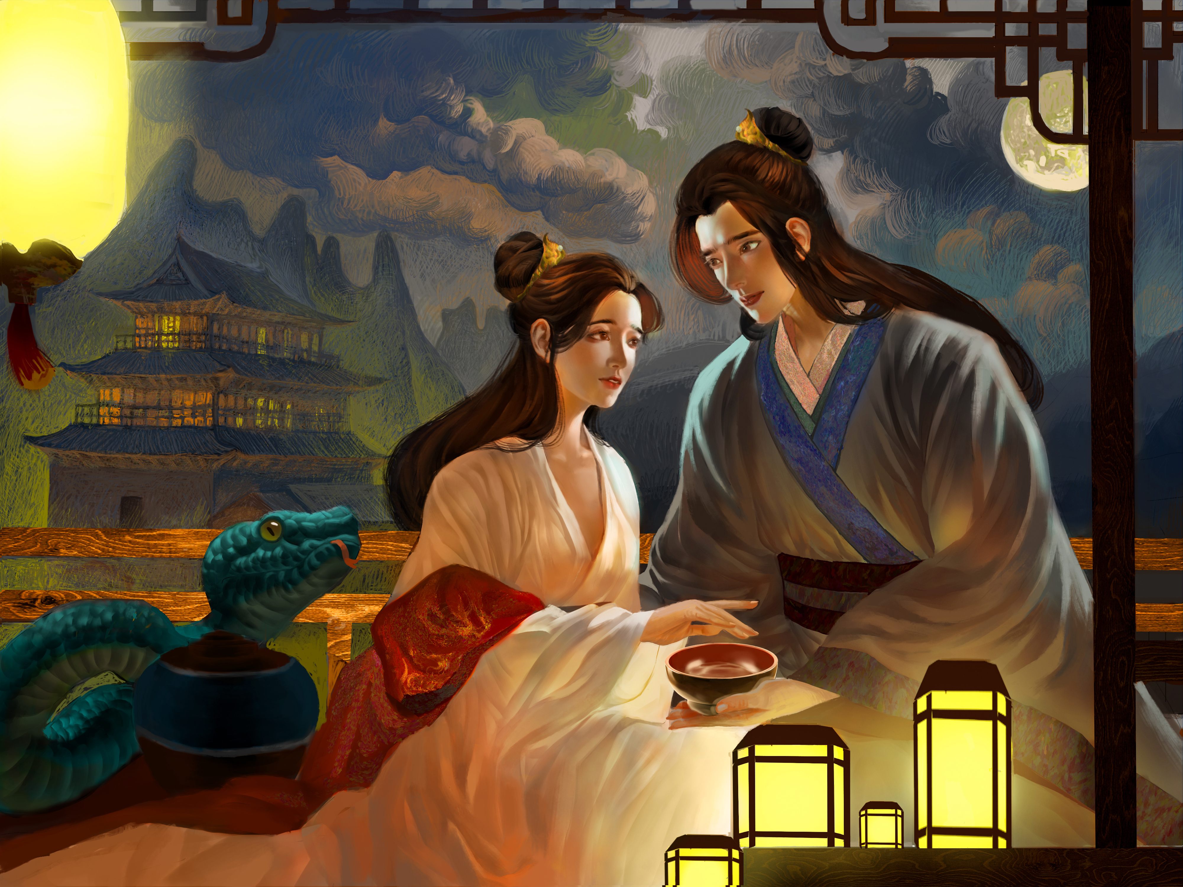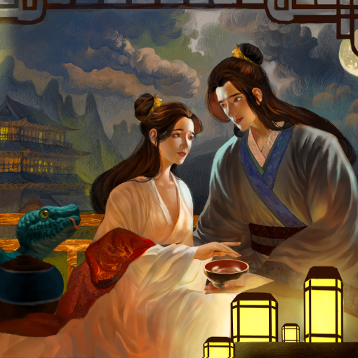 许仙被白娘子原型惊吓后又被救回,画面里白娘子和许仙面对面,沉浸在许仙复活的喜悦中,小青开心地速速前来祝贺。在这里,我们看到白娘子对许仙的爱情是如此忠贞和伟大。她不顾千难万险去取仙草,只为许仙能活过来,她的爱纯粹且执着,毫无保留地奉献一切。这种忠贞的爱情,像黑夜中的明灯,照亮彼此的生命,也让我们对爱情有了更深的感悟与敬畏。