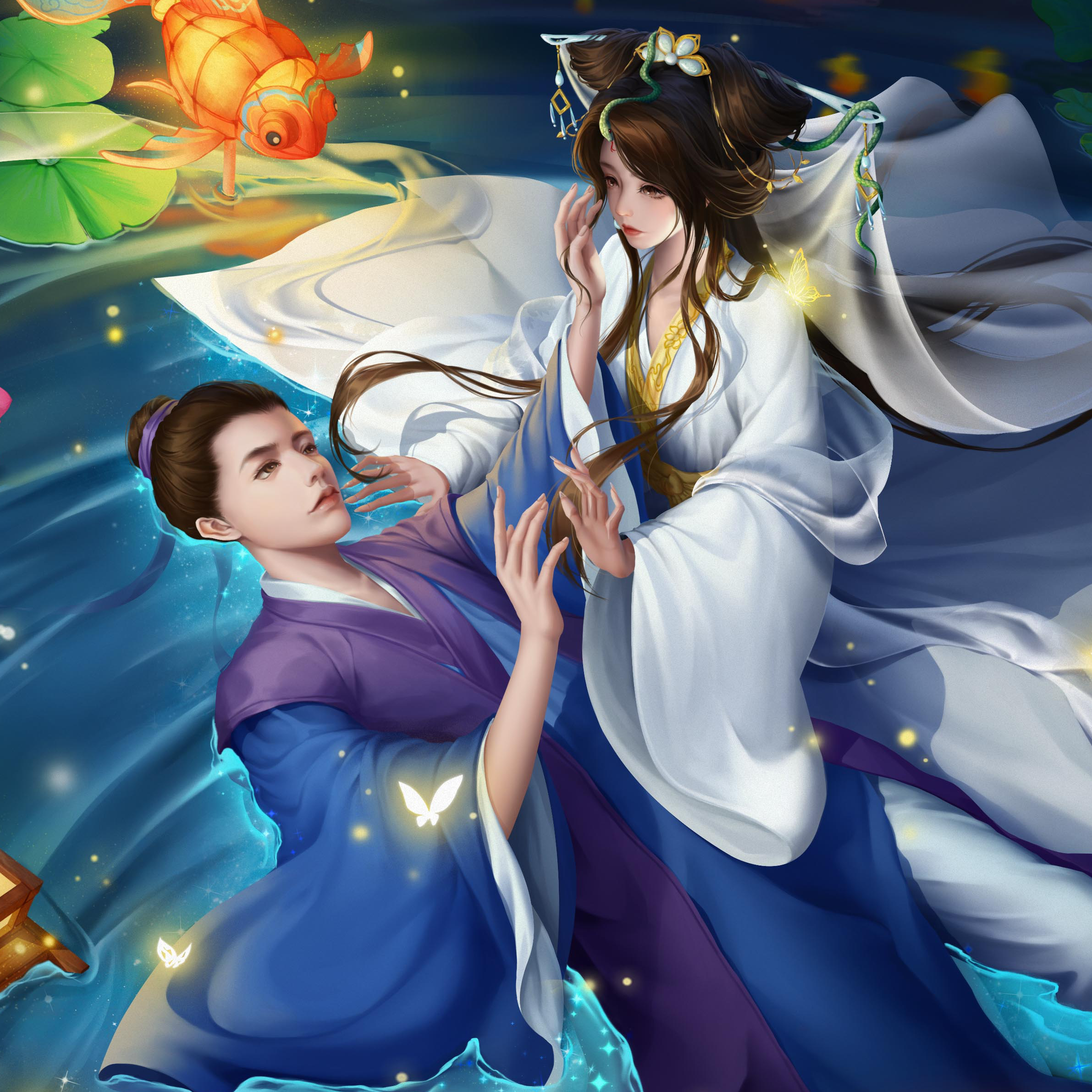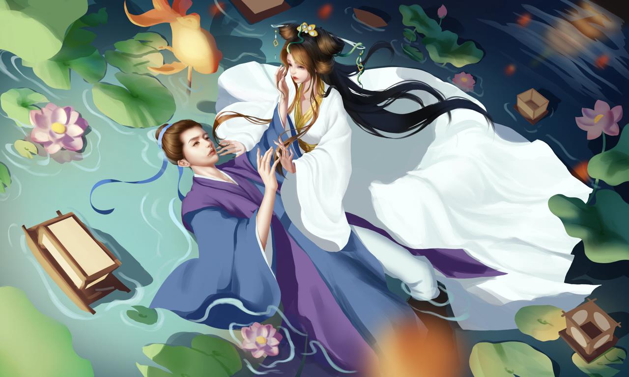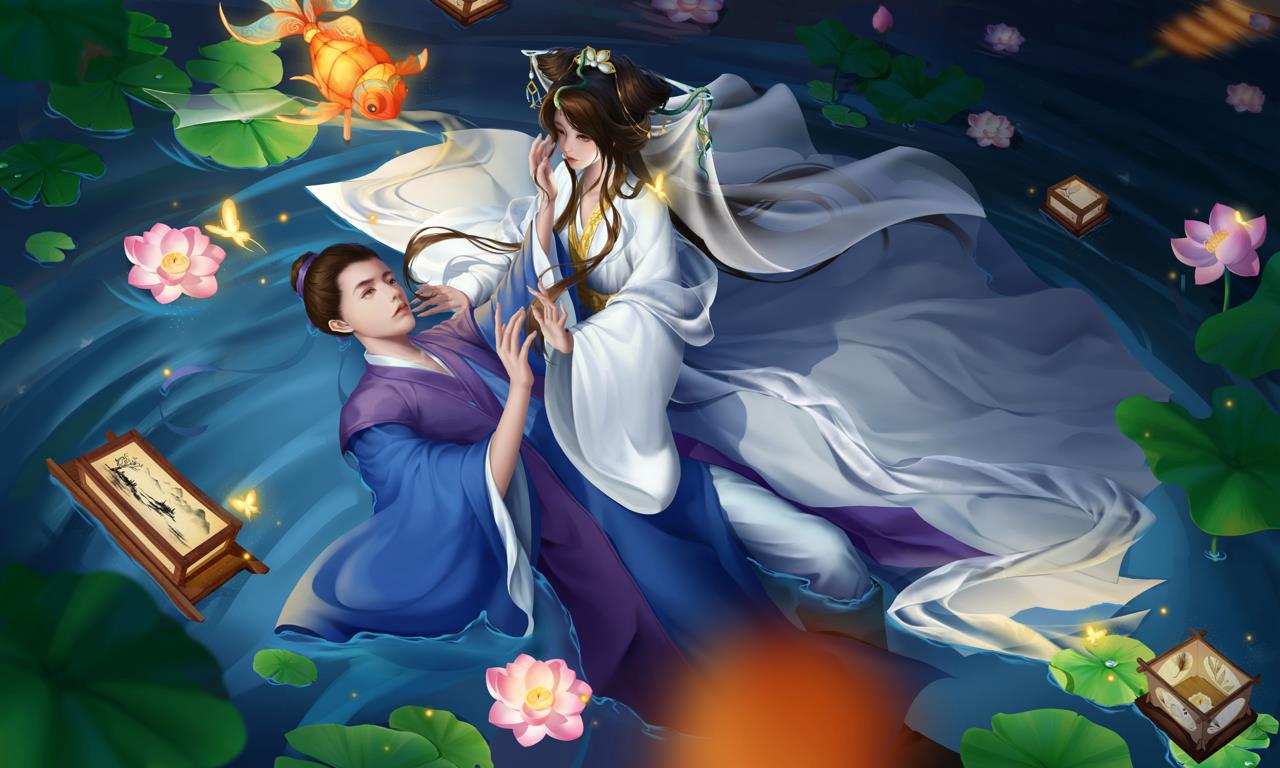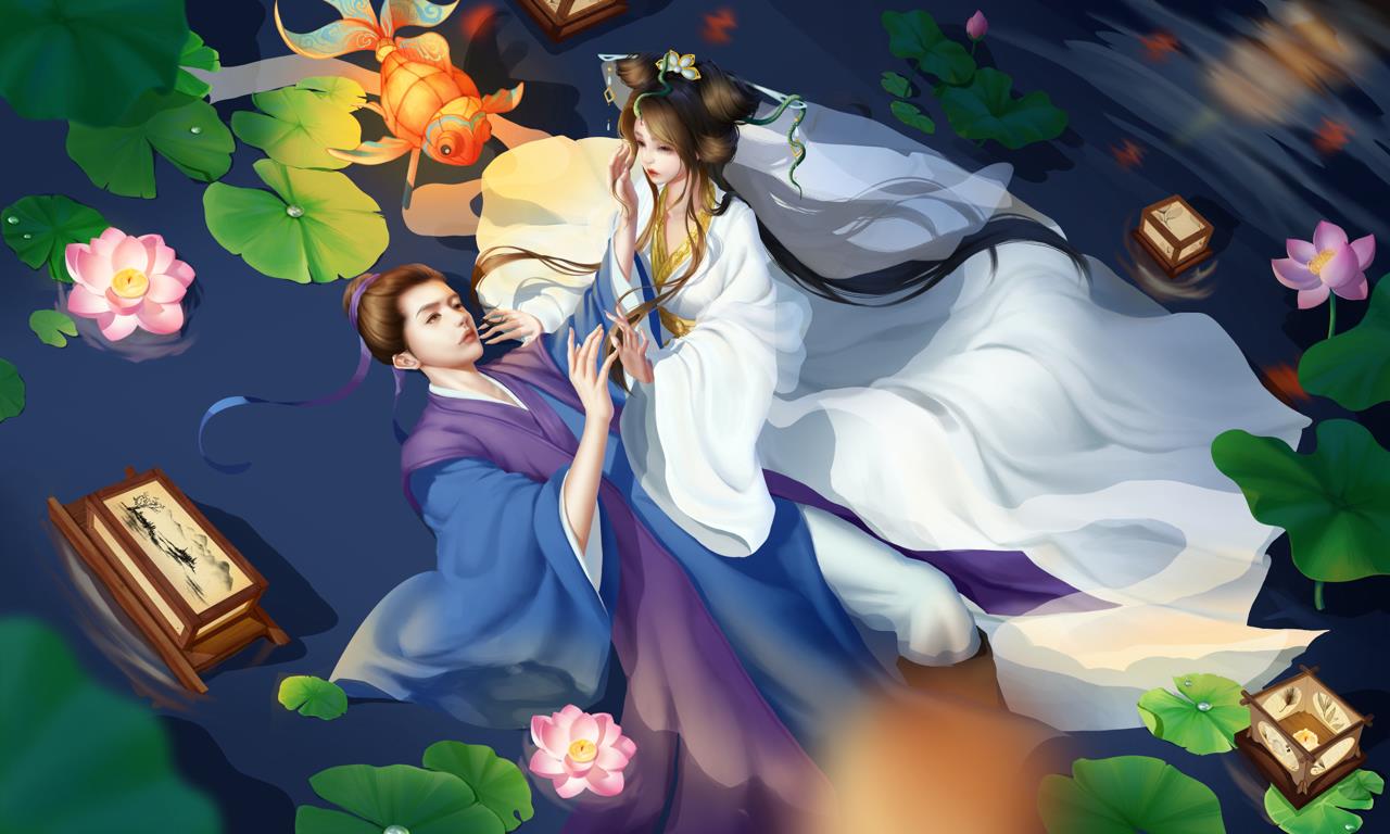 在一个寂静的夜晚,月光如银洒落,荷花池中央被一片柔和的光辉所笼罩。池中的荷花娇艳欲滴,每一朵都似仙子般亭亭玉立。许仙驻足观赏,心中不禁赞叹大自然的神奇与美丽。就在此时,一道倩影从荷花丛中飘然而至,她身着白衣,宛如仙子下凡,正是传说中的白娘子。白娘子在荷花池中轻盈地穿梭,她的衣裙随着水波轻轻飘动,如同白色的云彩在碧波中起舞。仿佛有一种神奇的力量将他们牵引到了一起。他们彼此相视一笑,眼中充满了惊喜与好奇。许仙温文尔雅地向白娘子行礼问好,而白娘子则微笑着回应,她的声音如同天籁之音,让人陶醉其中。他们聊得很投机,仿佛有说不完的话题。许仙被白娘子的智慧和才情所折服,而白娘子也被许仙的儒雅和真诚所打动。在月光的映照下,两人的身影交织在一起,形成了一幅美丽的画面。