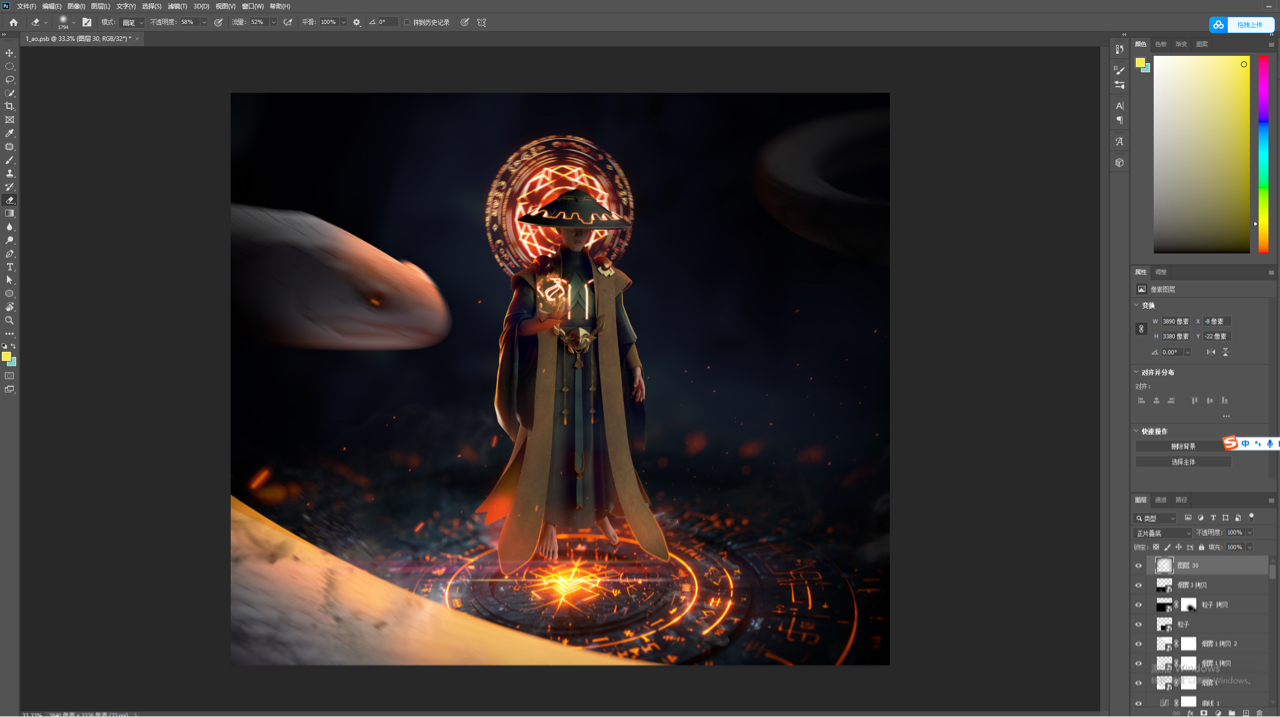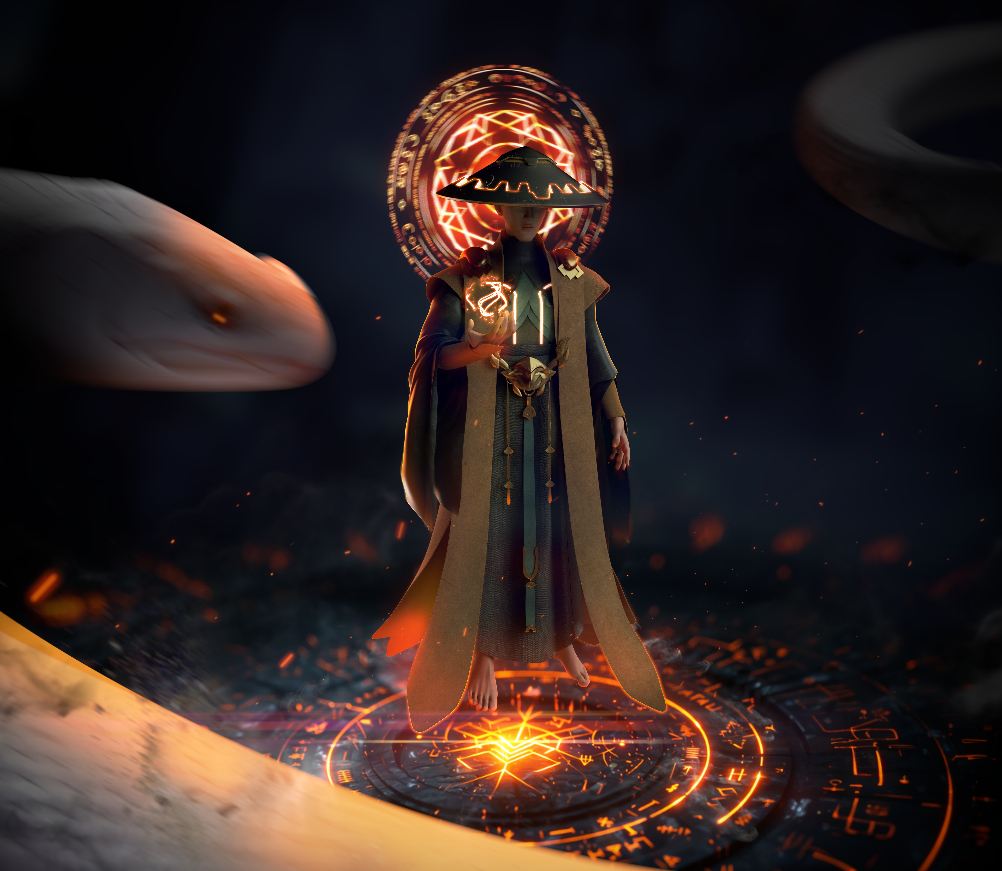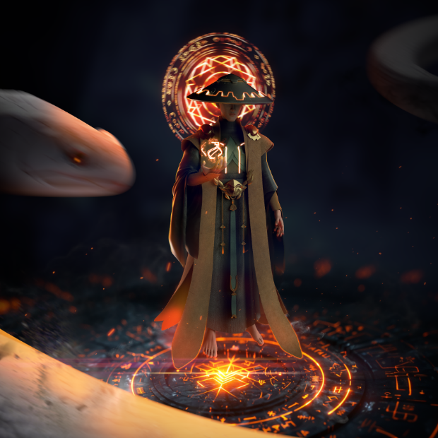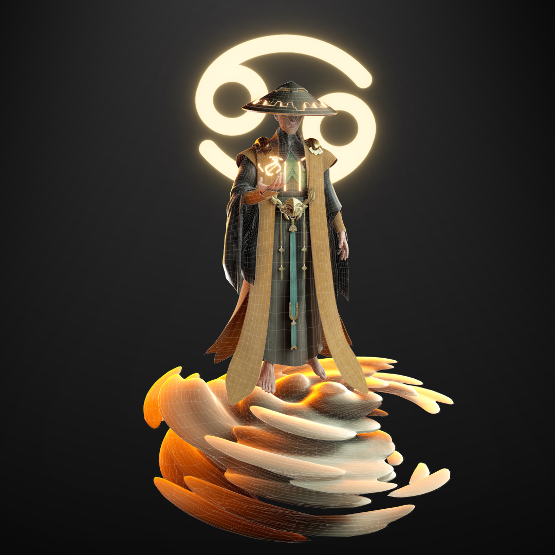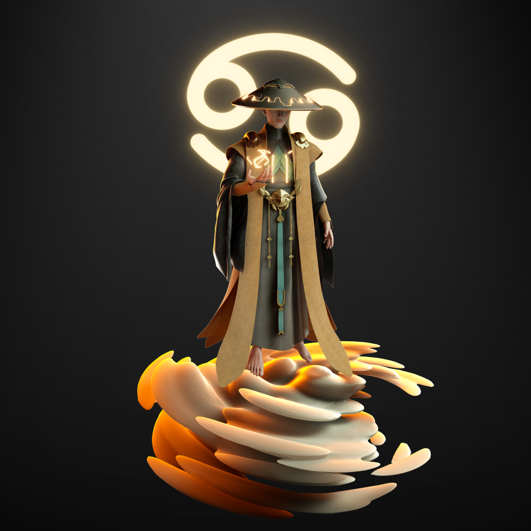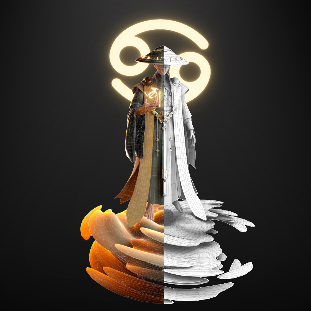 创作理念:作品以《白蛇传》为文化背景进行创作,展示了一场法海与白蛇对决即将拉开的画面,法海佛光普照,默念天雷咒,强大的阵法已然展现,白蛇亦发起攻势,为爱决一死战,二人战斗一触即发,可人妖殊途,是该歌颂白蛇对爱情的执着与向往,还是法海对佛法的坚持和对妖邪的警惕,究竟是自由还是礼法