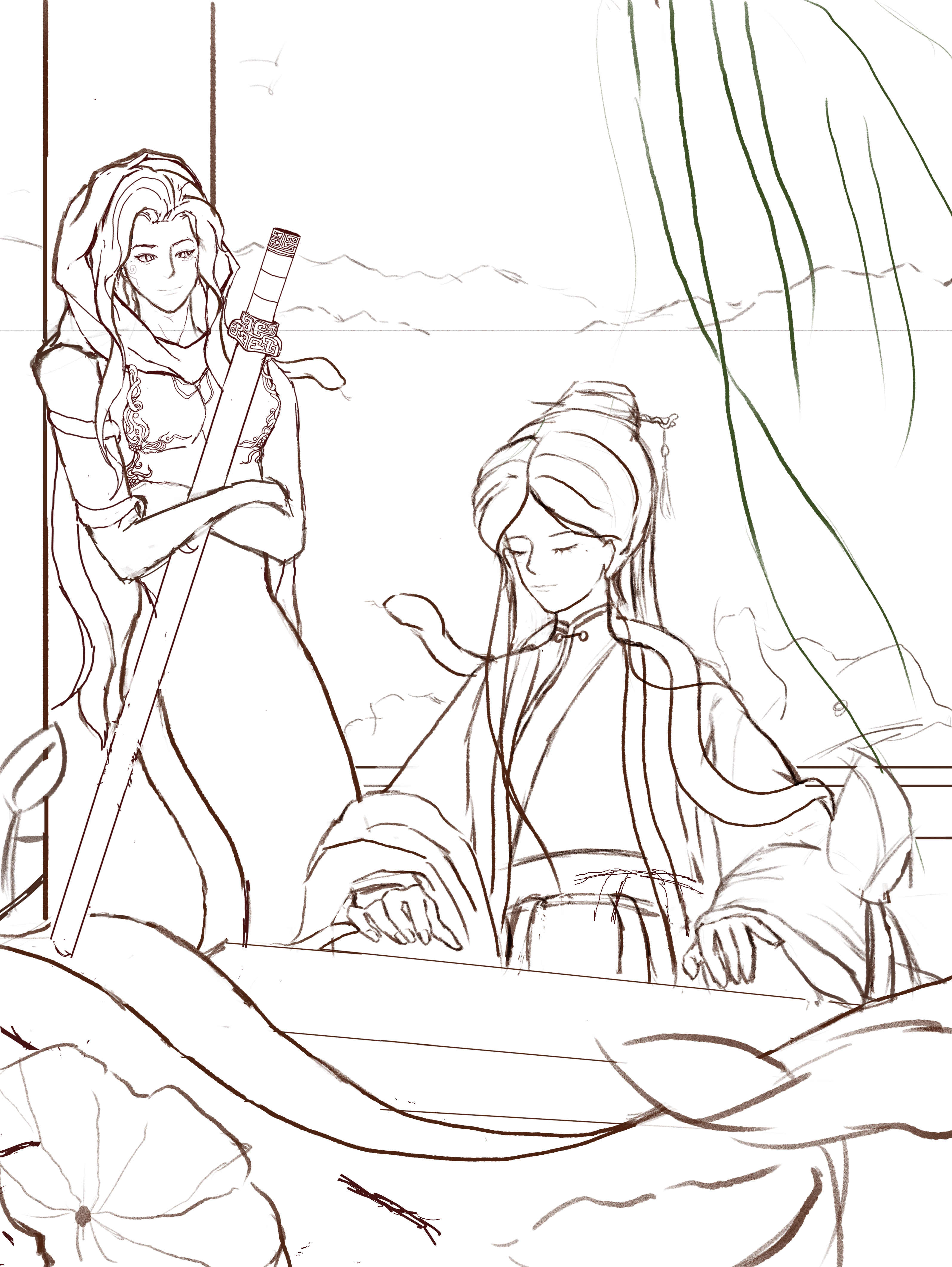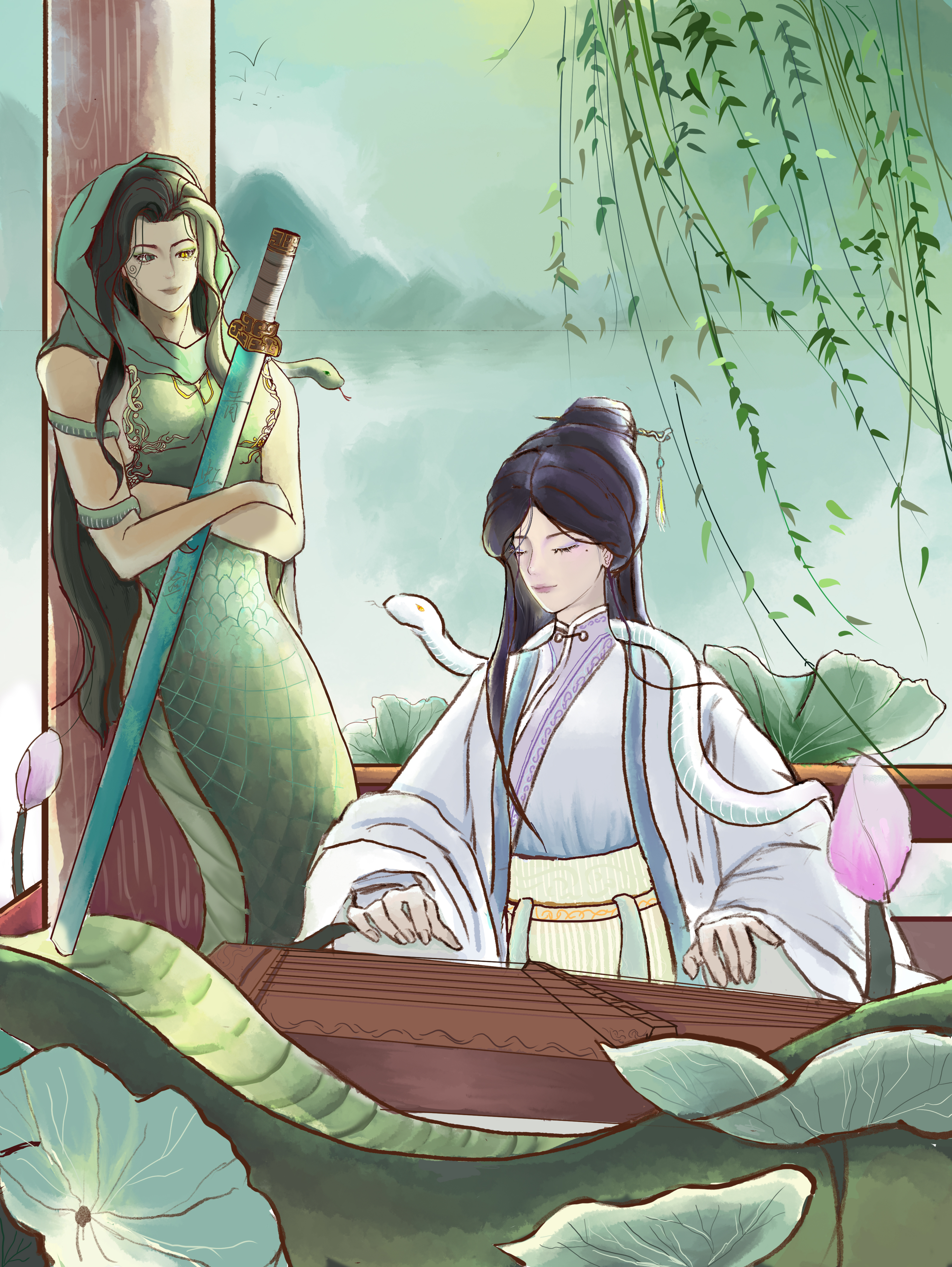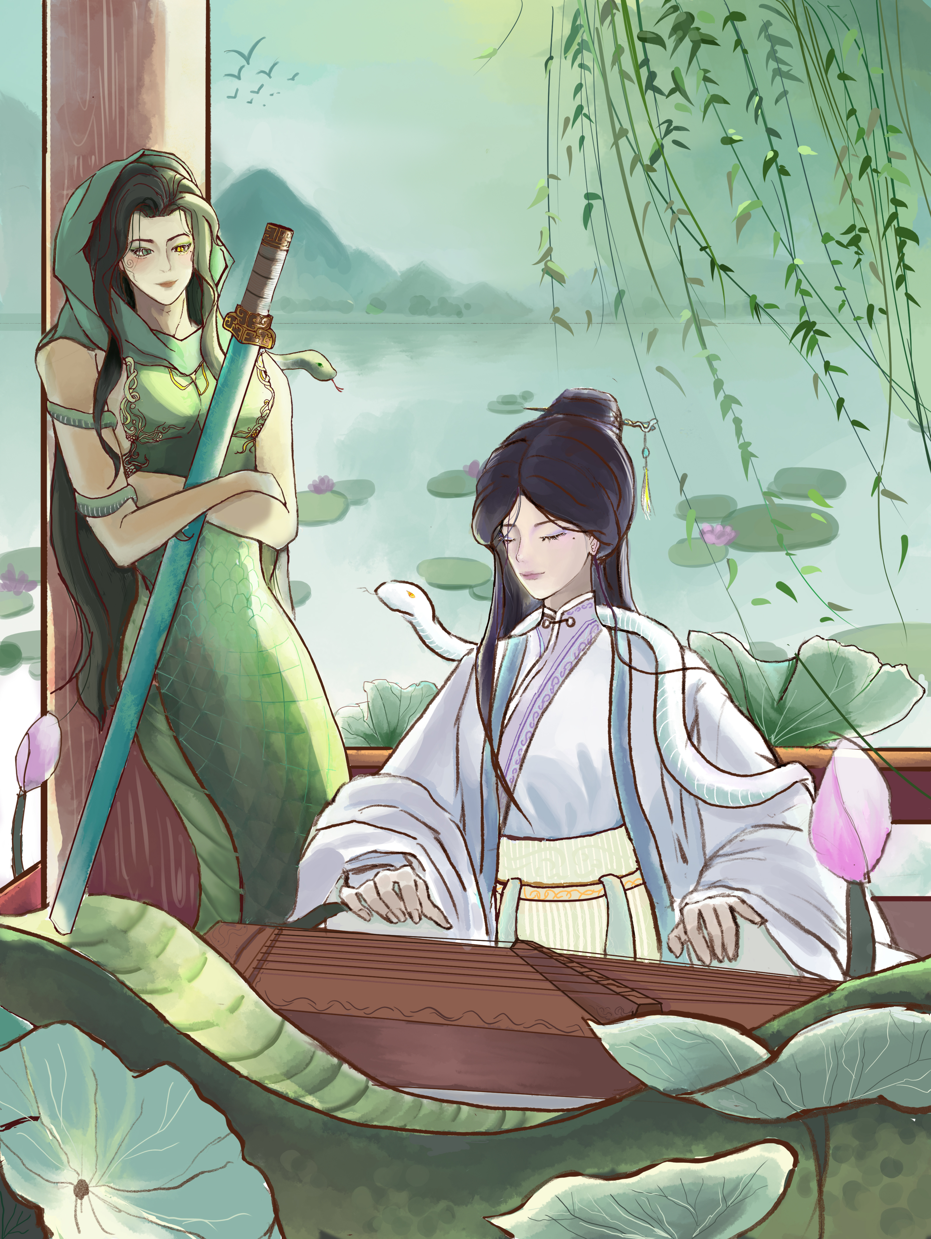 当她们再次漫步于西湖之畔,湖光山色依旧潋滟秀丽,层峦叠翠间仿佛诉说着千年的故事。此时的白蛇轻抚琴弦,那古朴的琴声与窗外滴滴答答的雨声交织在一起,仿佛在通过旋律回忆着过往的岁月。窗外的山峦中,再也寻不见宁古塔的身影,只留下岁月的痕迹和无尽的遐想。