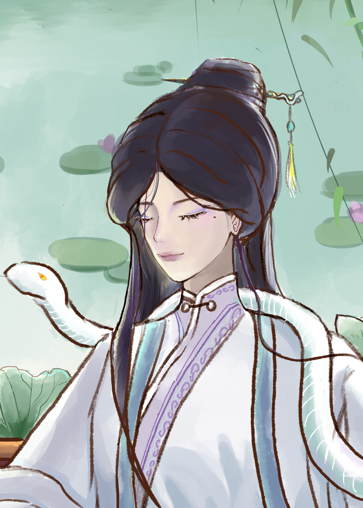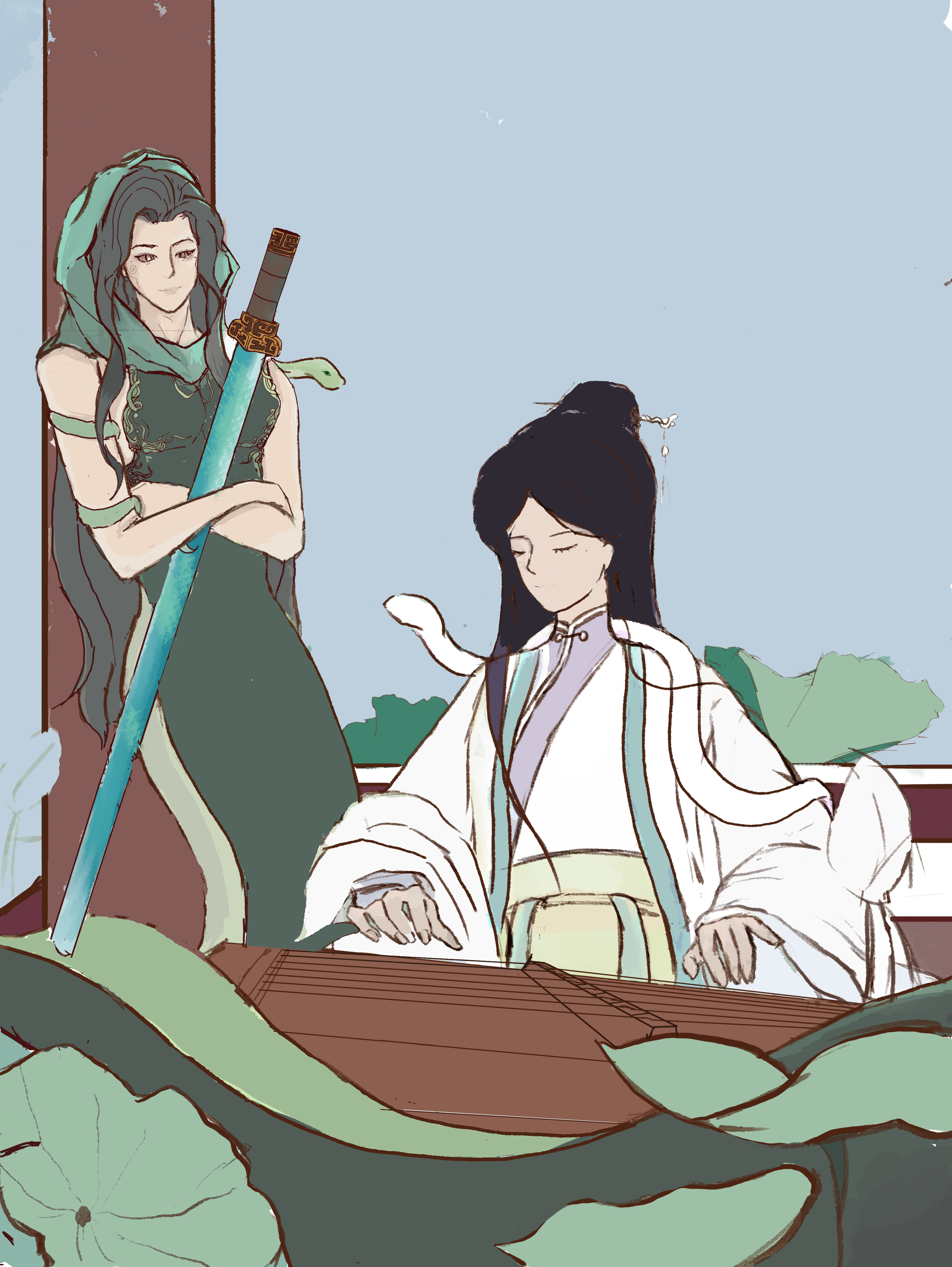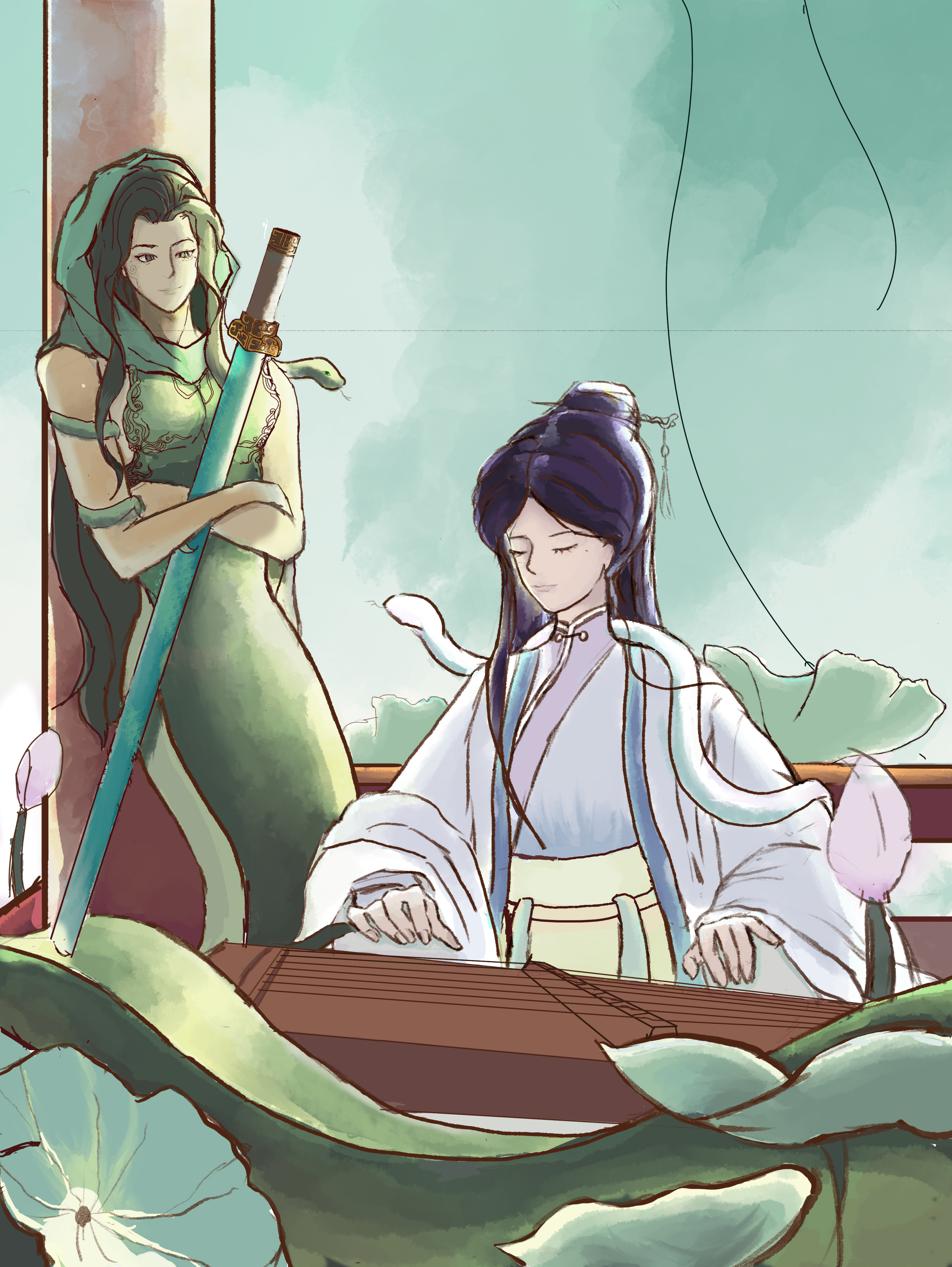随着雨声的逐渐增大,琴声也变得愈发欢快起来。这欢快的旋律既是对过去自己的告别,又寄托了对未来的期许。青蛇望着她的姐姐,眼中满是欣慰与喜悦,她由衷地为白蛇感到高兴。就让这悠扬的琴音随风飘去吧,带走所有的过往与忧伤,只留下对未来的无限憧憬和希望。