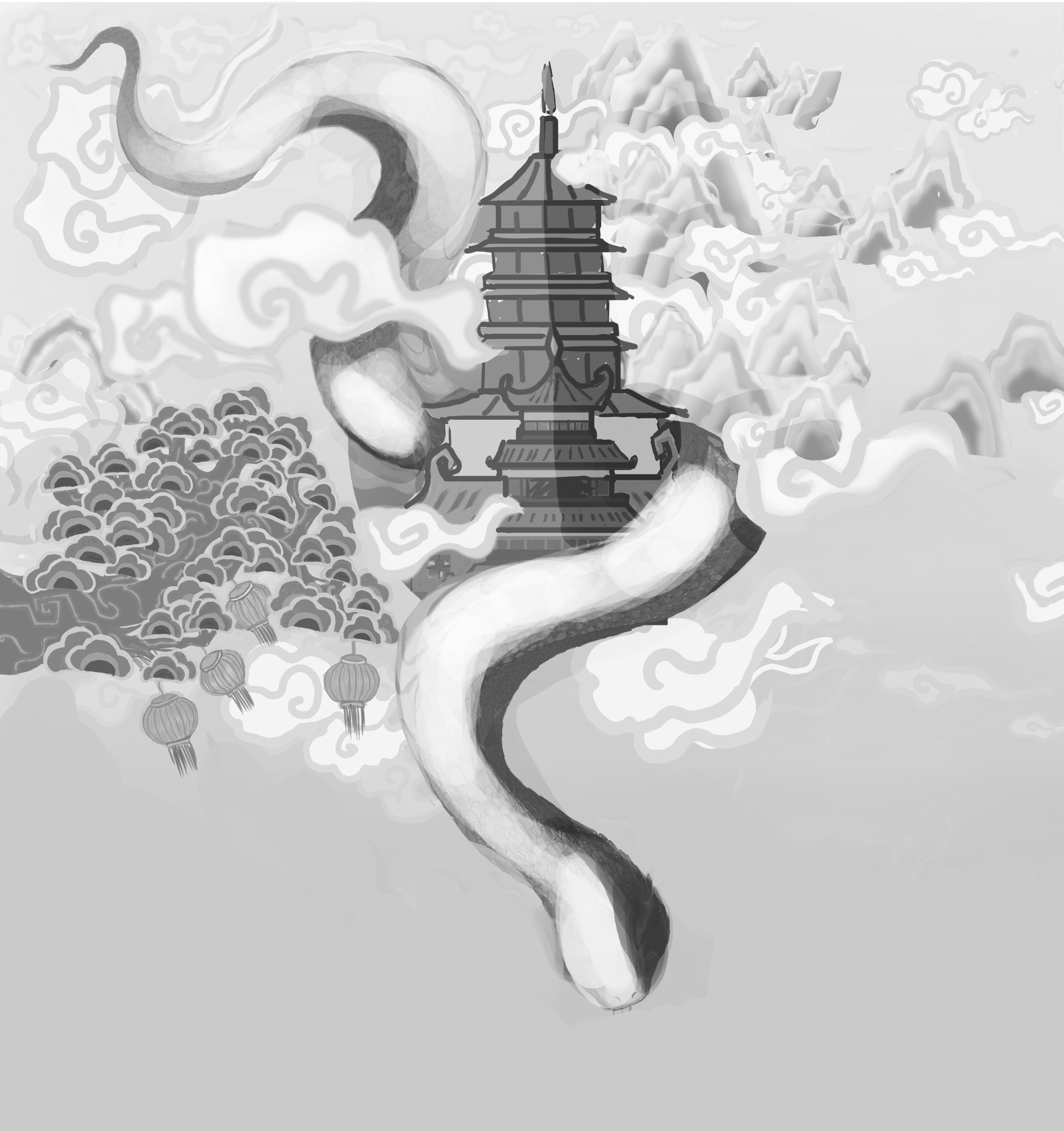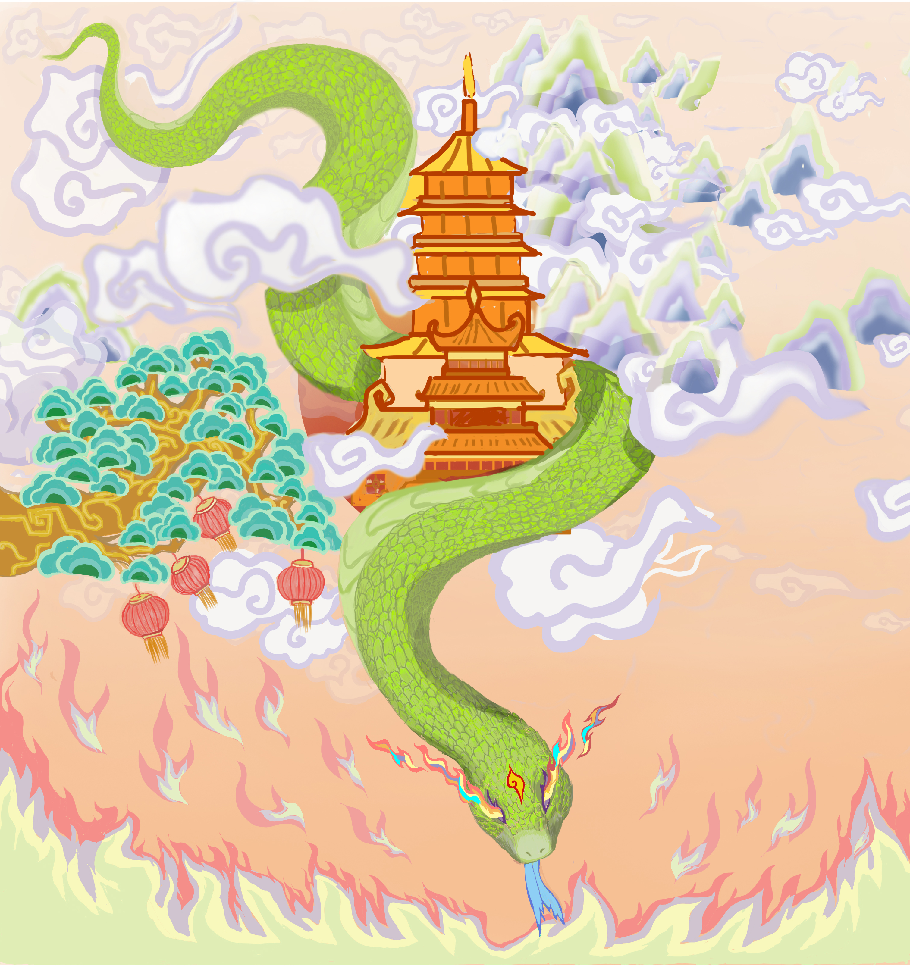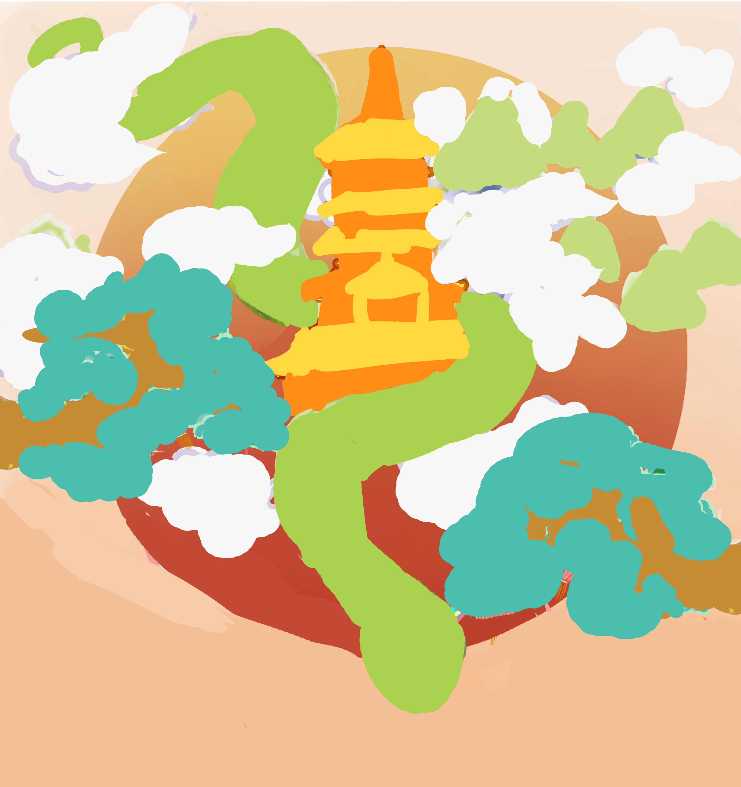 玉岳之巅,云海苍苍,大雁雄翔,玉树吉笼;日霞蛇起卷,鹤楼今安何夕日。