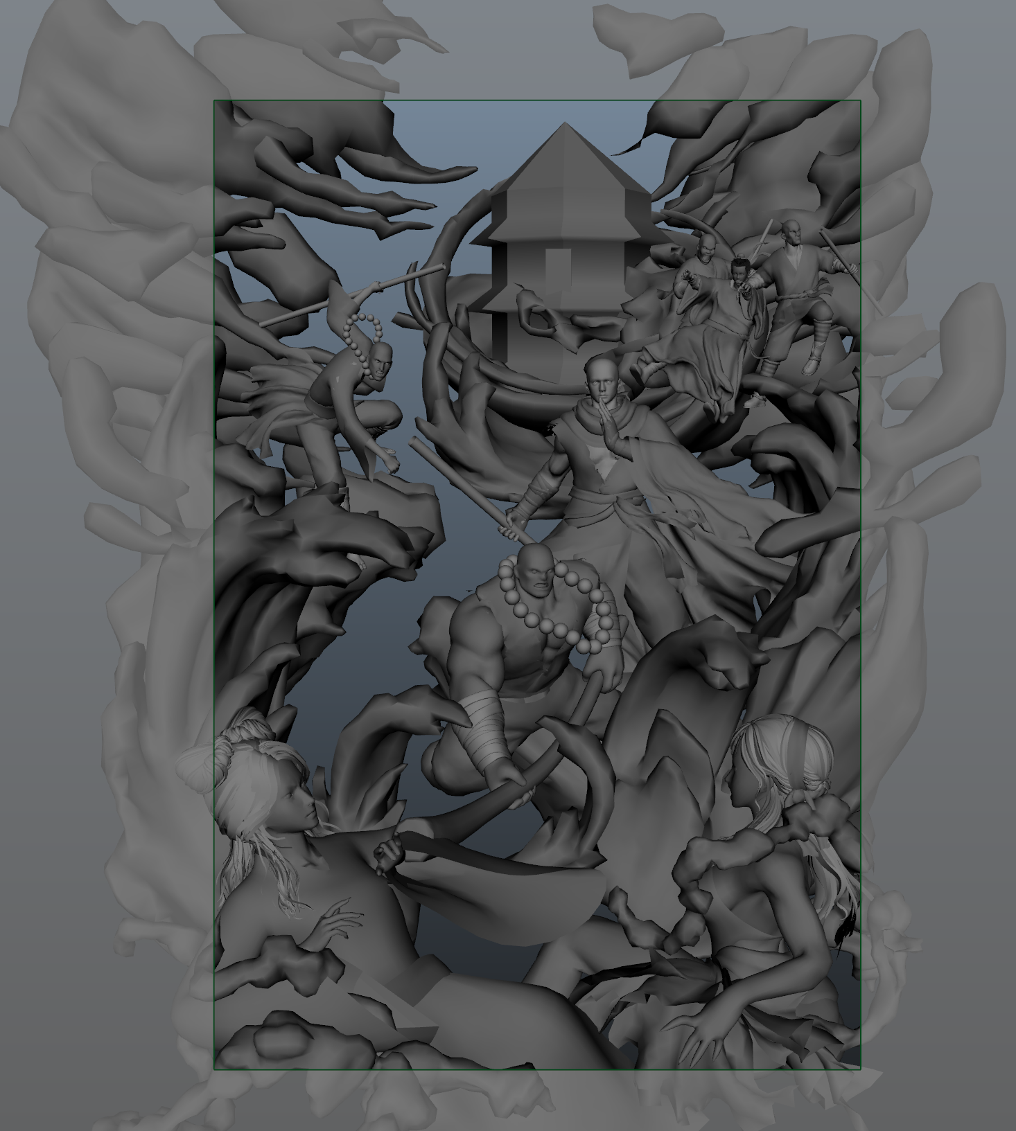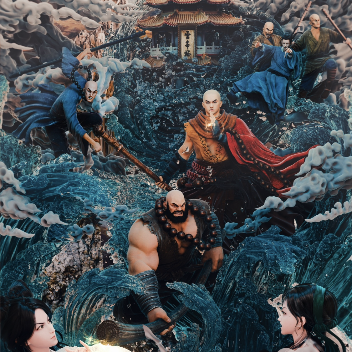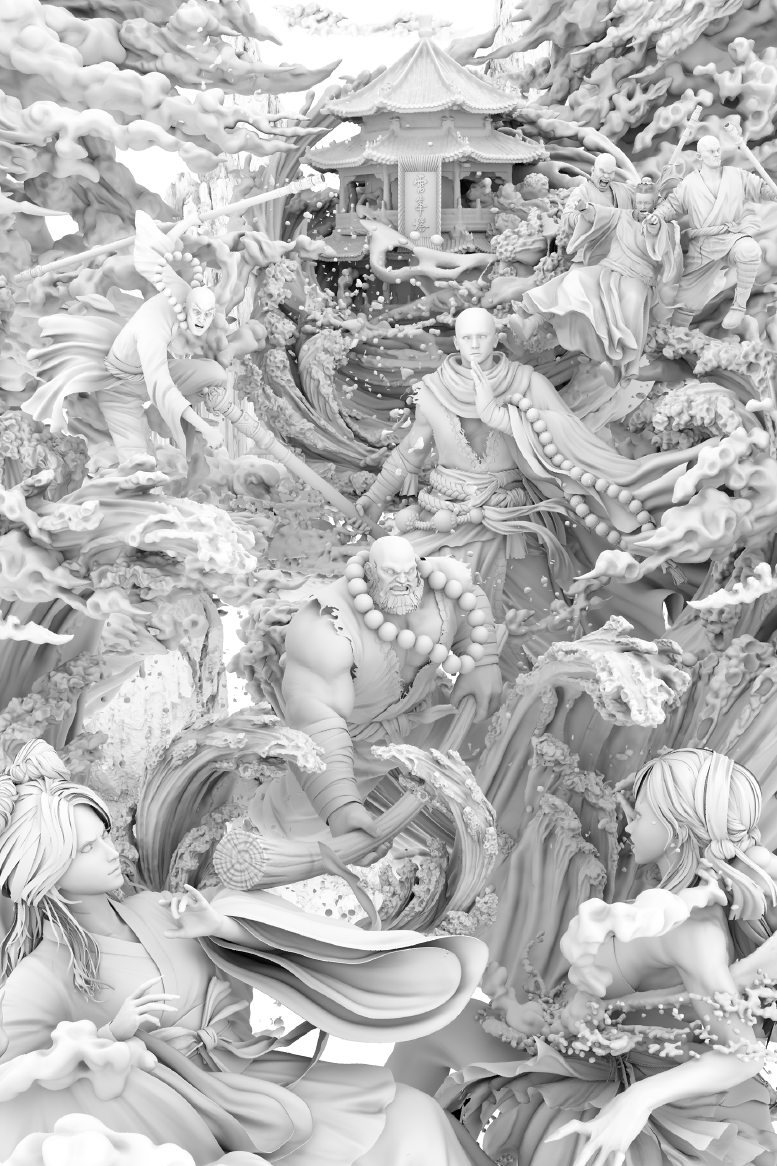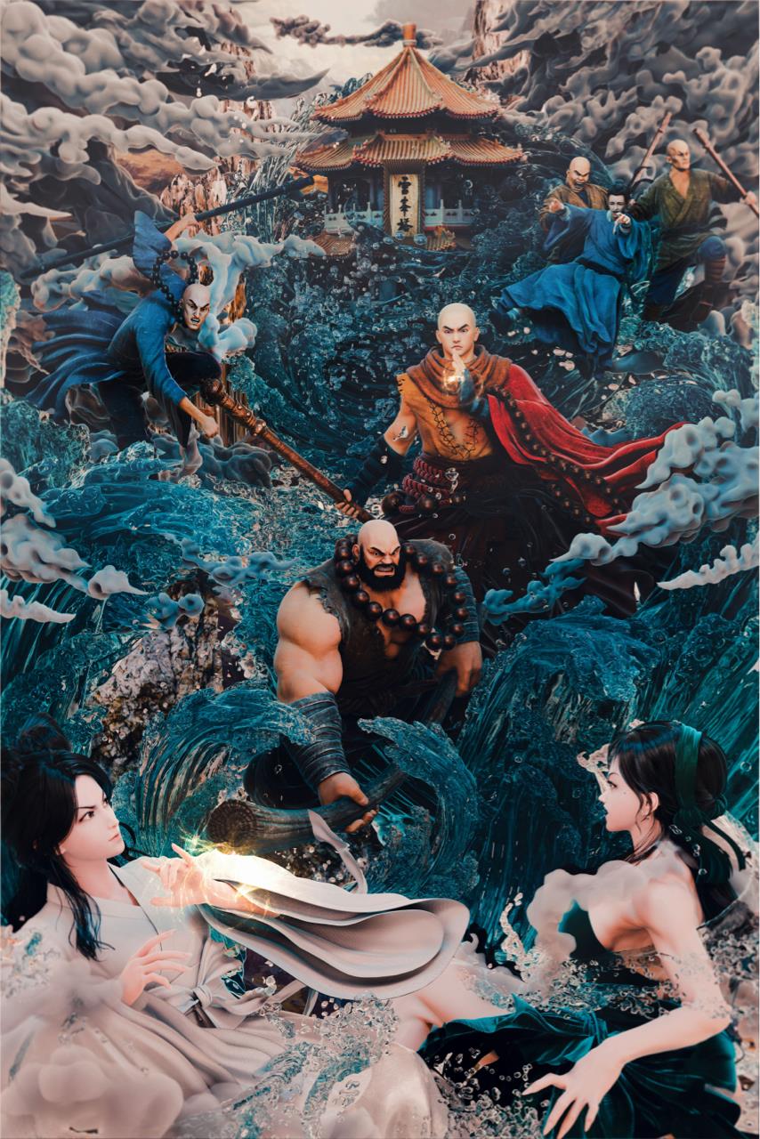 白蛇传故事——《水漫金山》 “水漫金山”是中国传统民间故事《白蛇传》中的一个经典情节,具有丰富的文化内涵和艺术价值。 我想展现出白素贞为救许仙与法海之间的激烈冲突,突出白素贞对爱情的坚定和执着,她不惜一切代价与法海对抗,体现她勇敢的性格特点。同时也展现法海维护所谓的“天道”的坚决。通过对滔天巨浪的表现,营造出洪水泛滥、波涛汹涌的场景,给画面带来强烈的视觉冲击。将白蛇作为千年蛇妖的“战斗力”展现得淋漓尽致,传递了白素贞对许仙深厚的爱情,以及她在面对困境时的无奈和悲愤,引发情感共鸣.