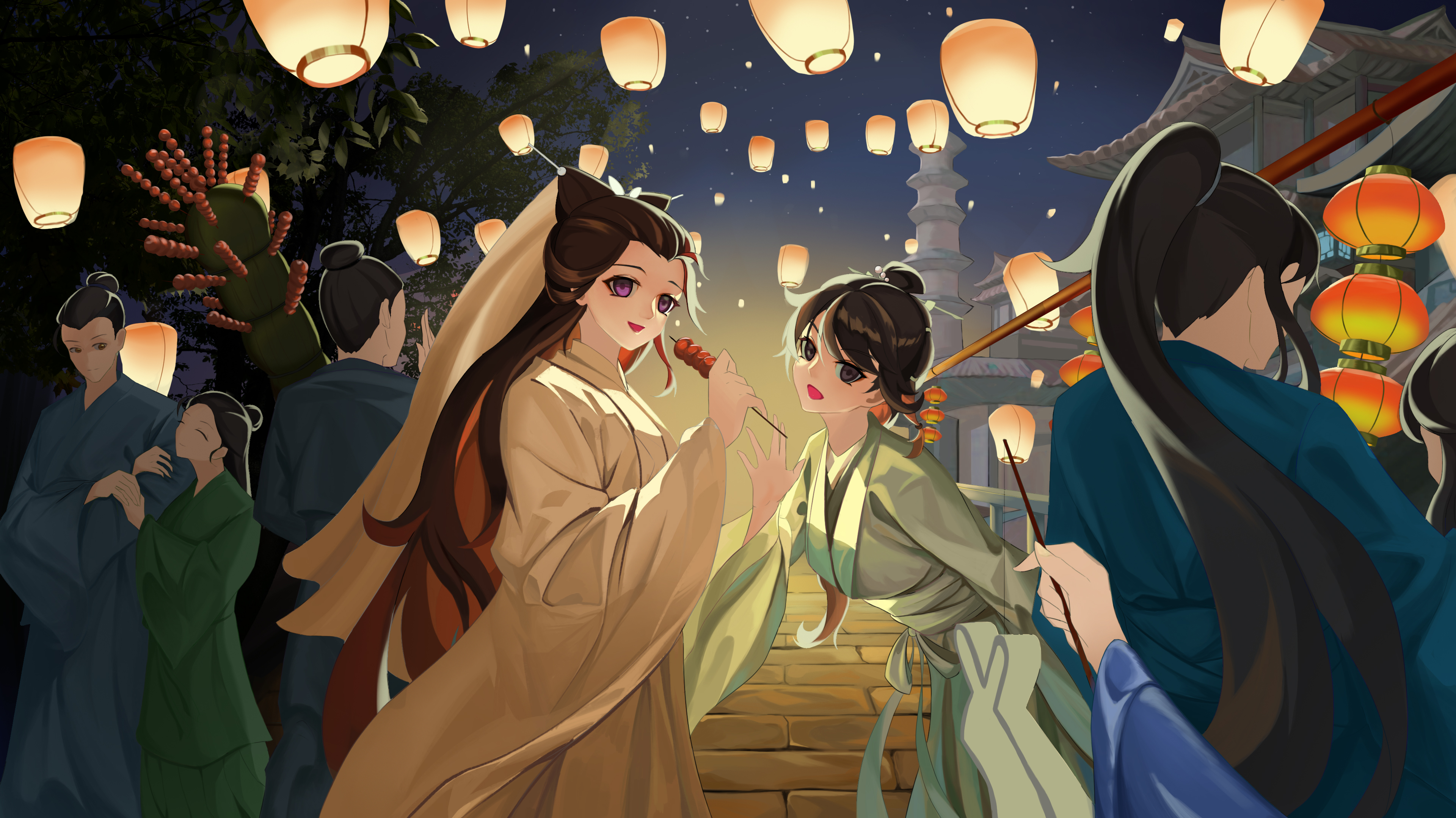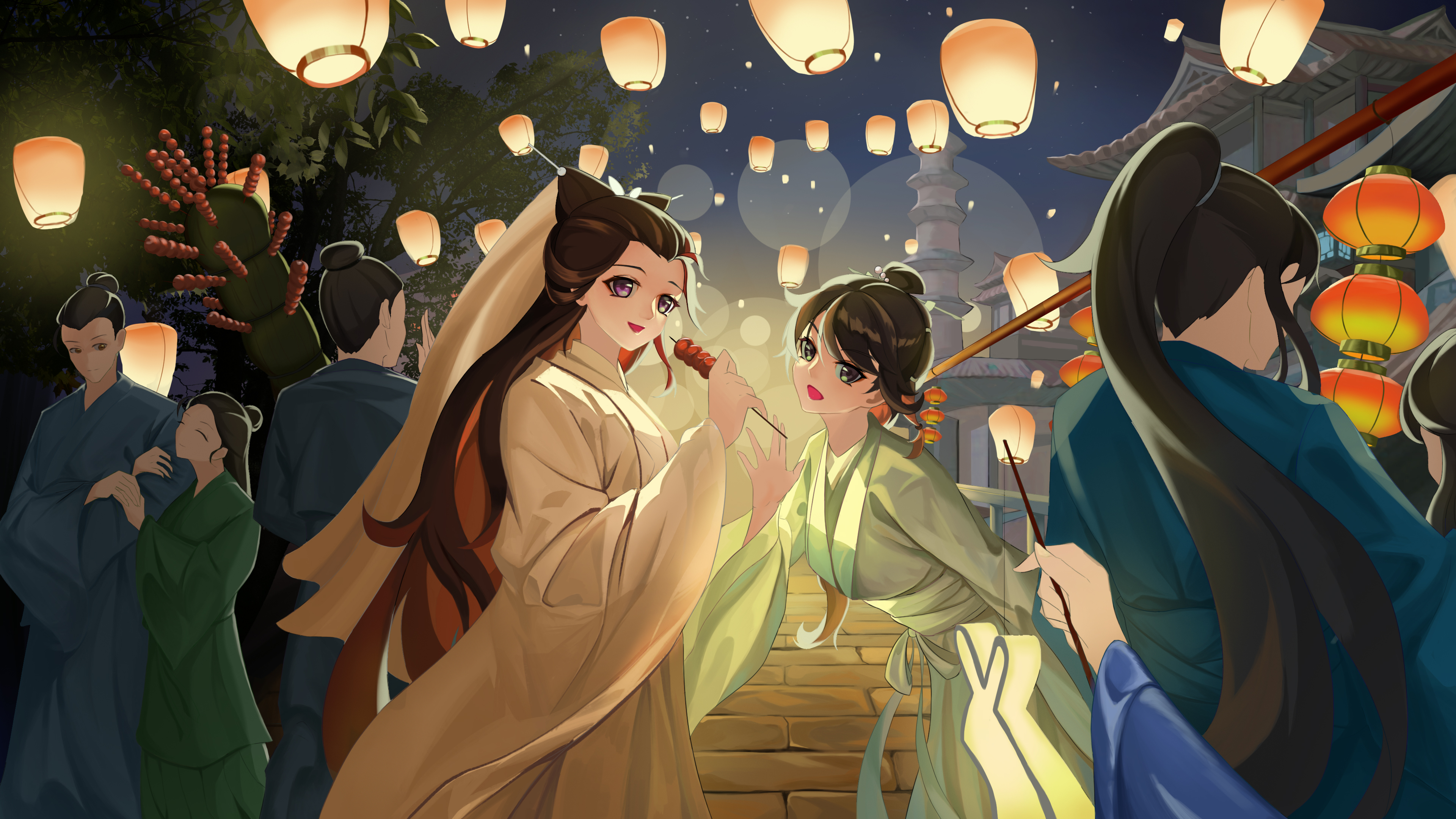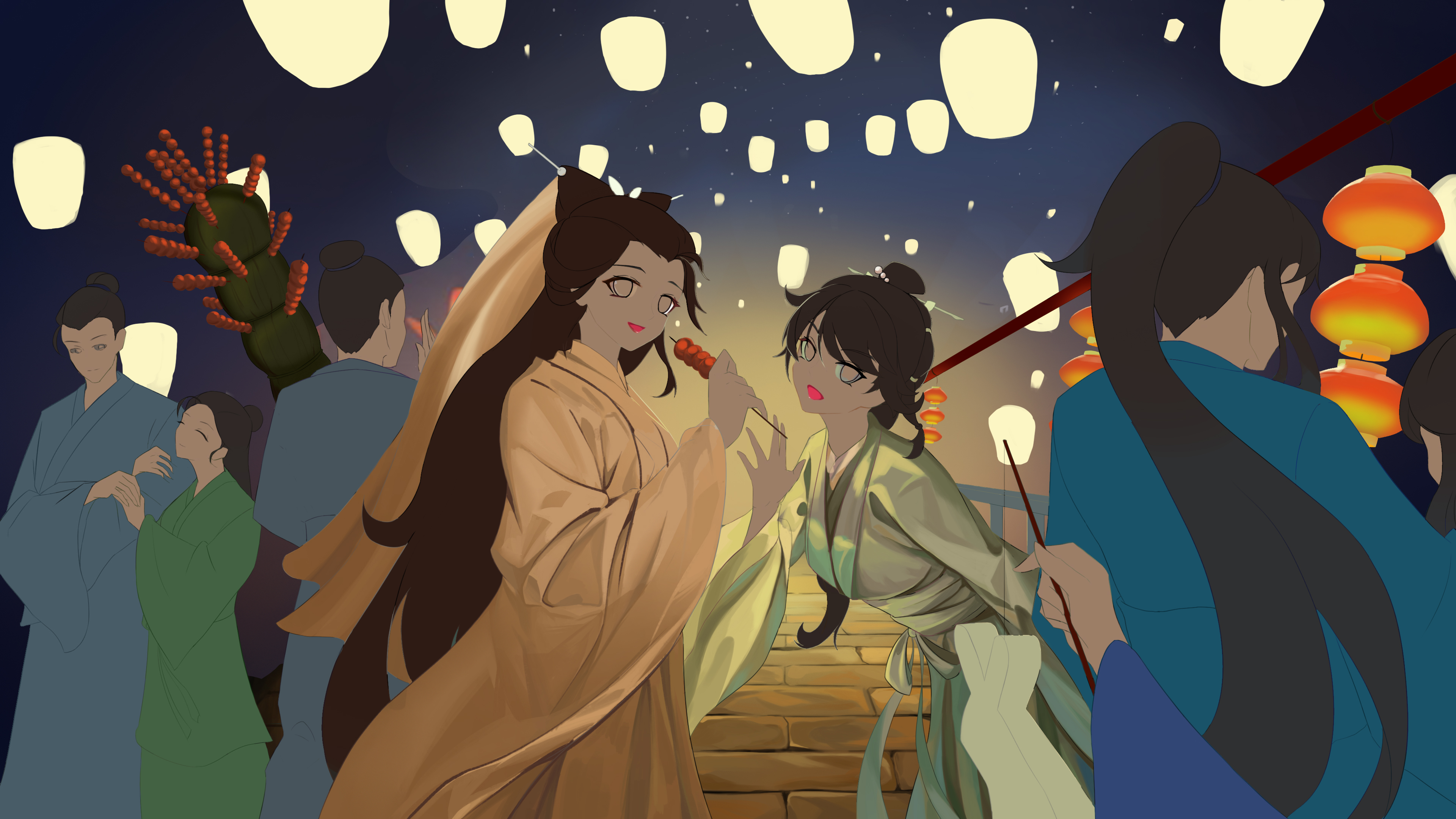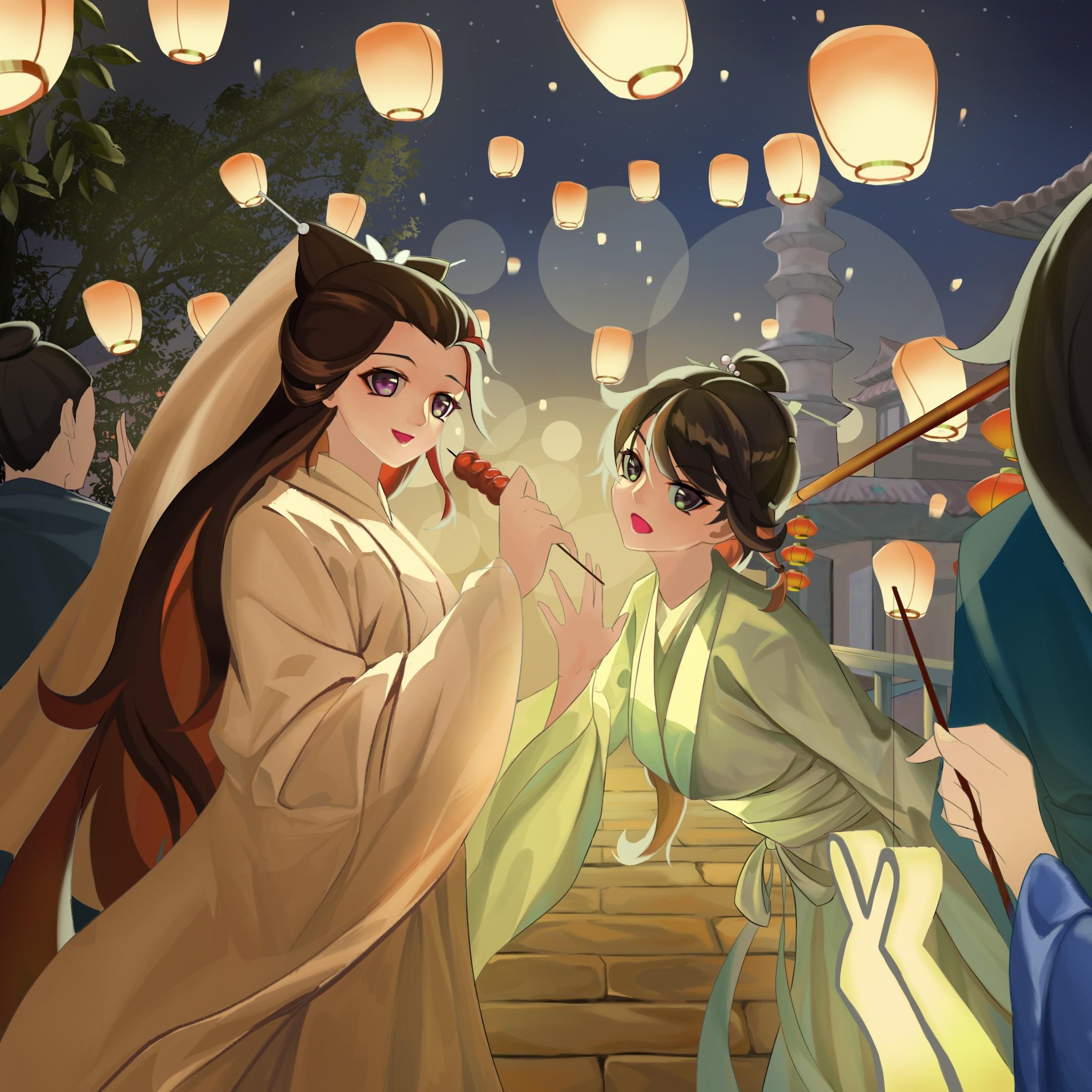 我挑着灯,处处找寻,口中呼喊着她们。忽然耳畔声音传来,回头看到她们向我招手