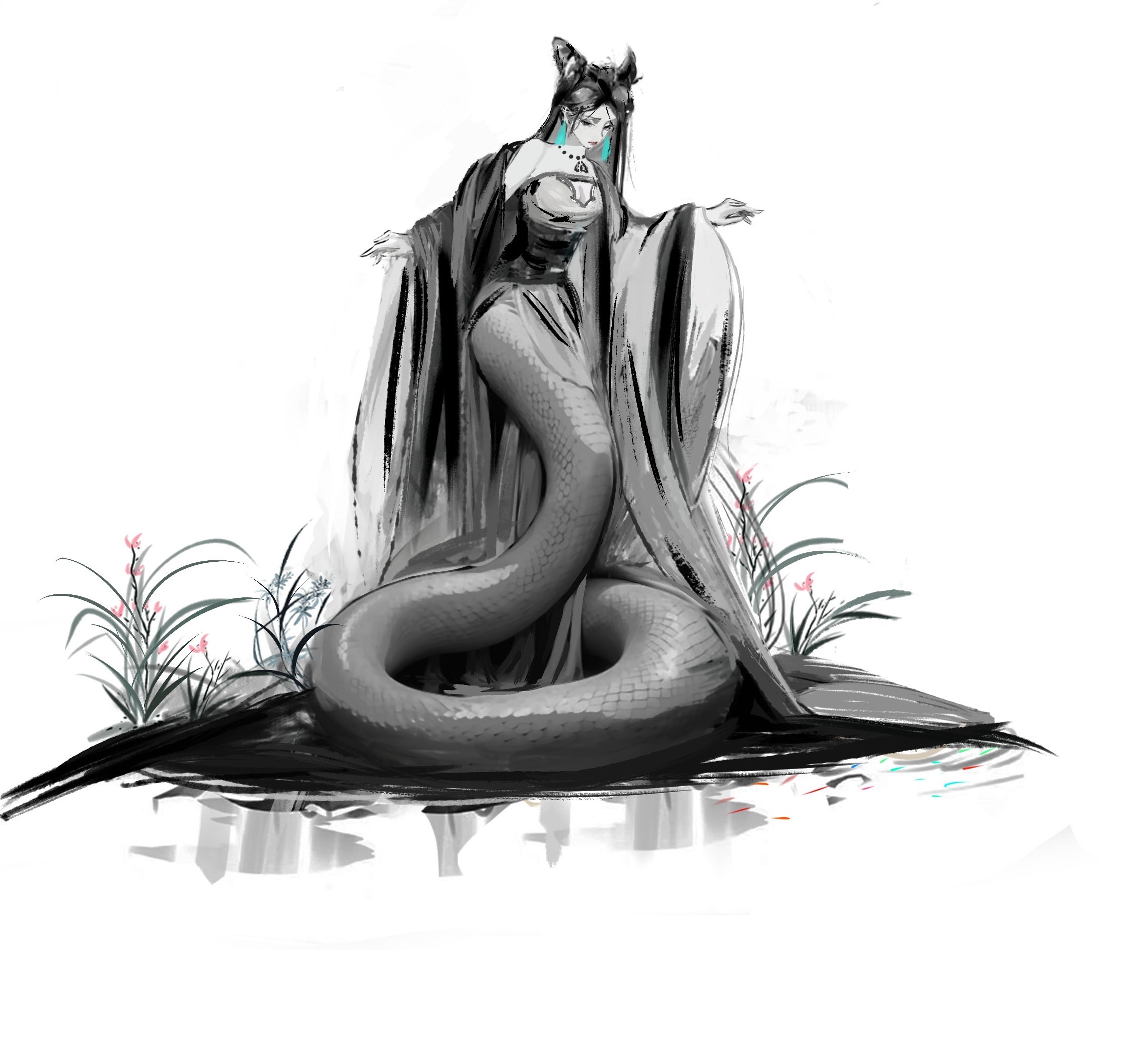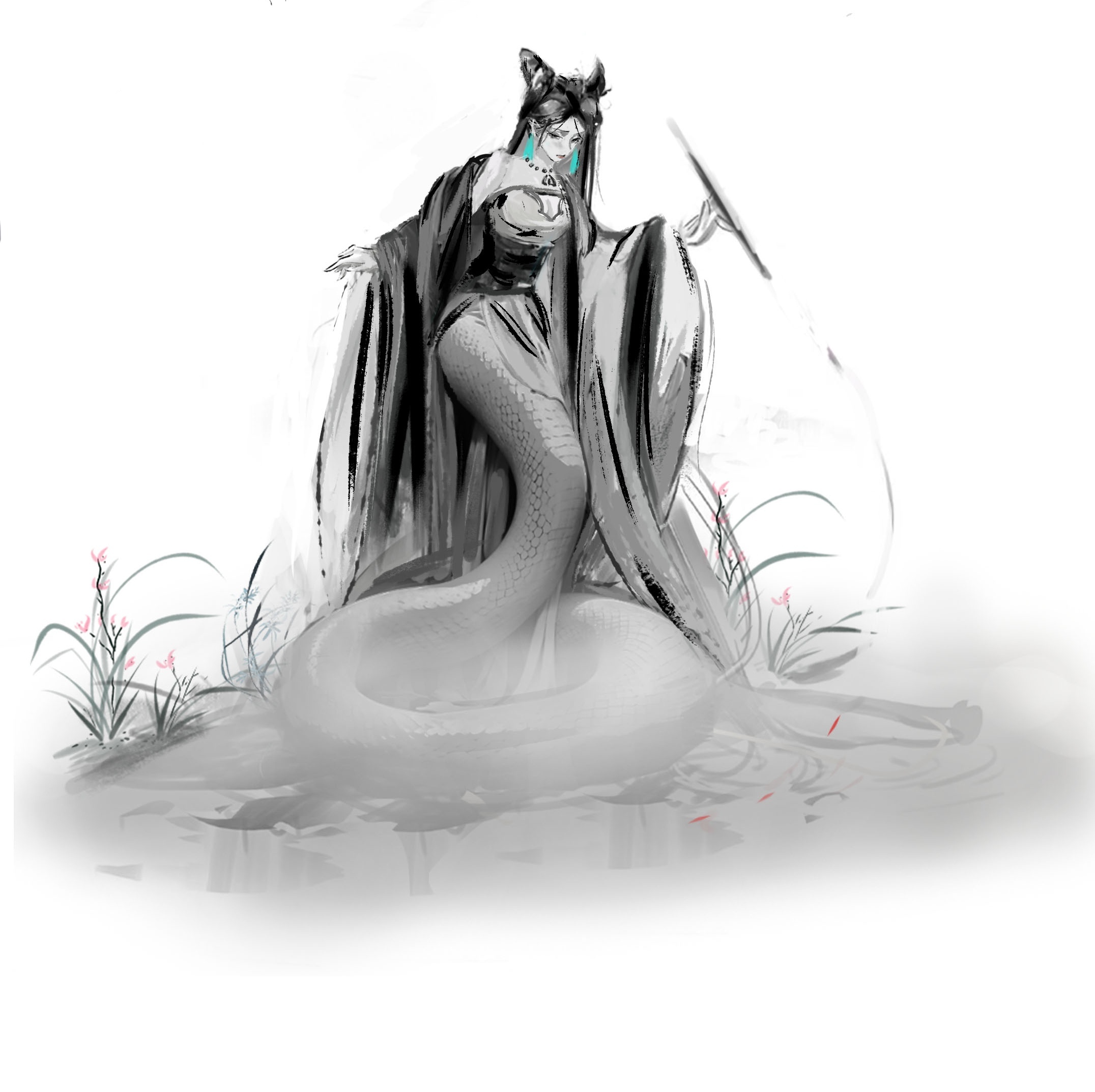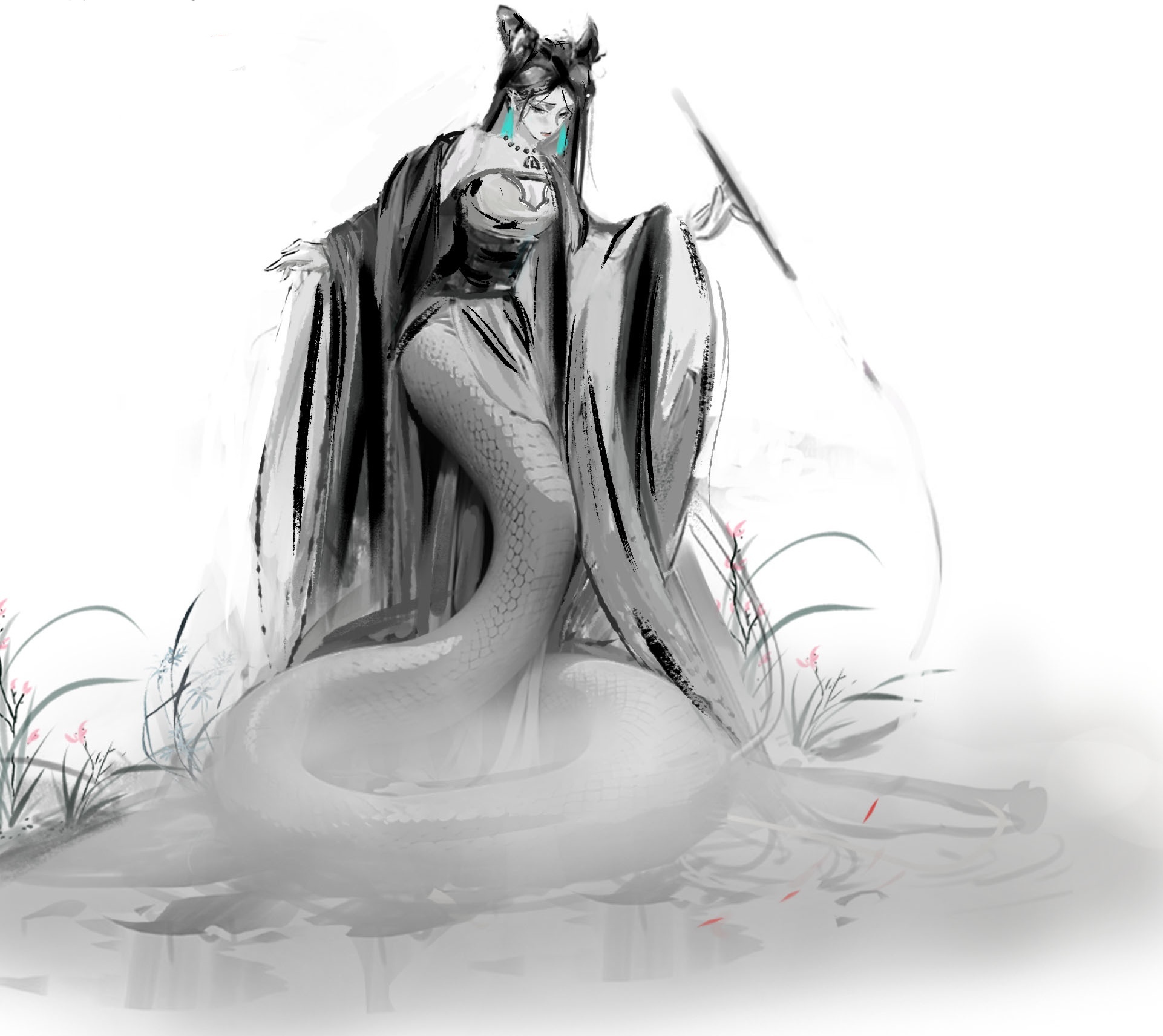 从水墨中走出来的白蛇,使用黑白来创作,仅仅对小草使用一点点色彩变化
