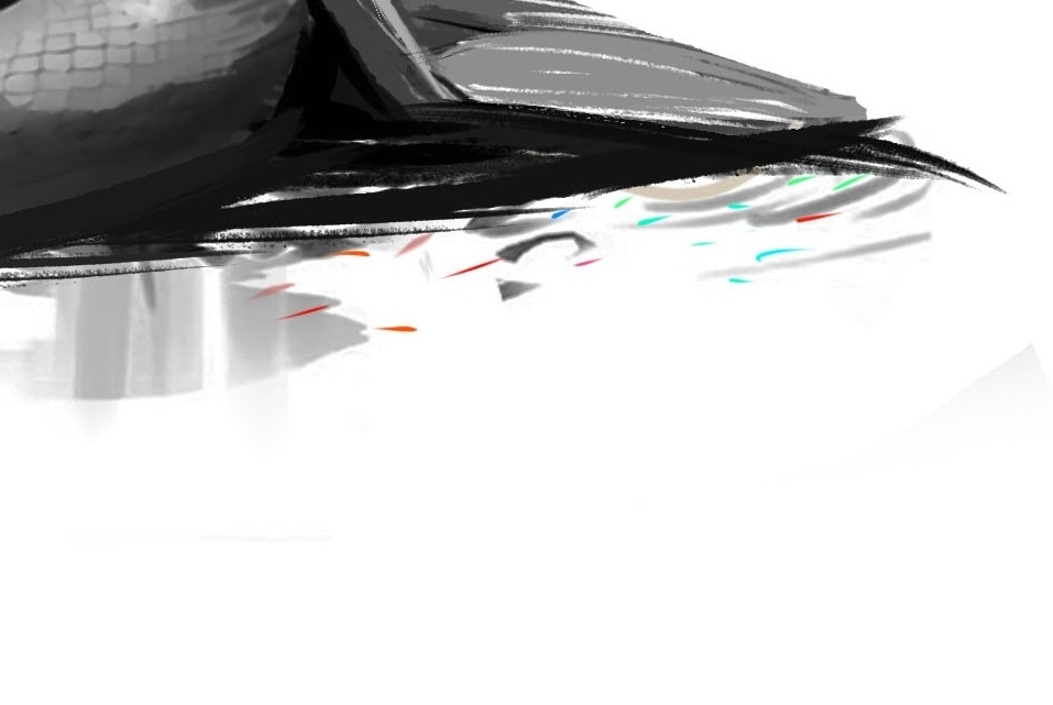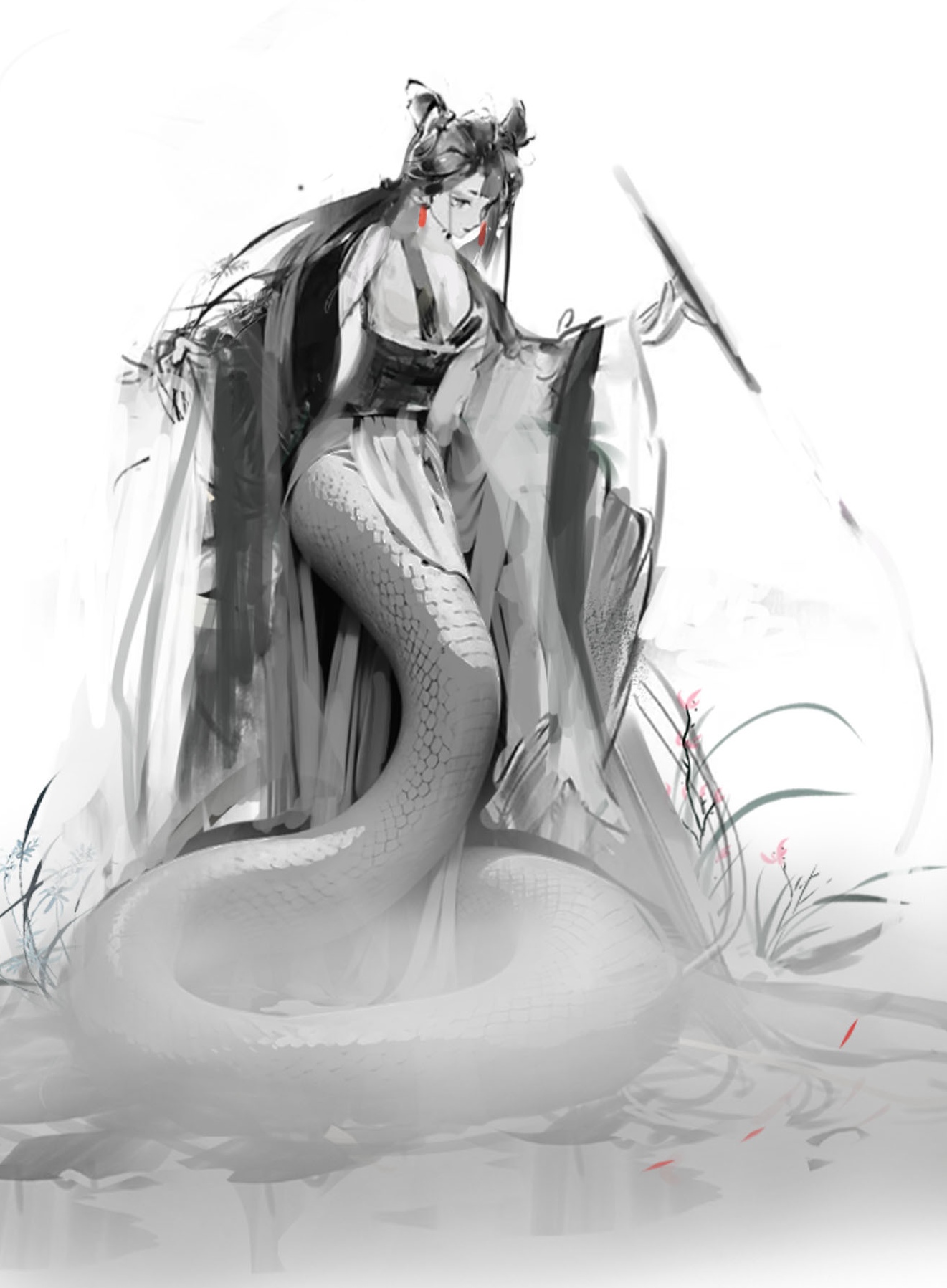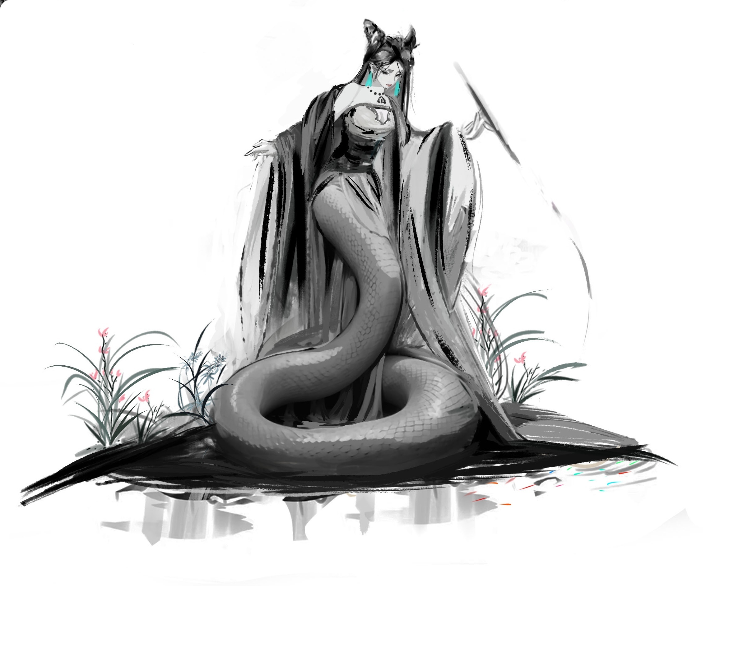 从水墨中走出来的白蛇,使用黑白来创作,仅仅对小草使用一点点色彩变化