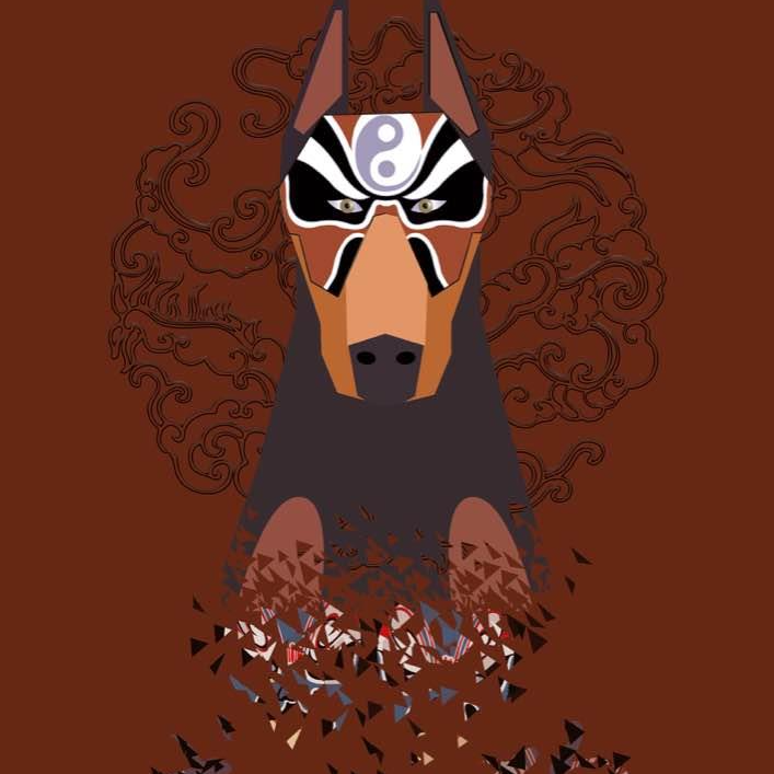 以中国脸谱为元素,和狗狗的形象相结合。