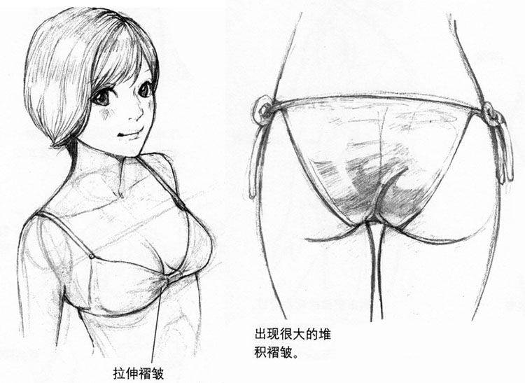 注意泳衣堆积褶皱的表现。