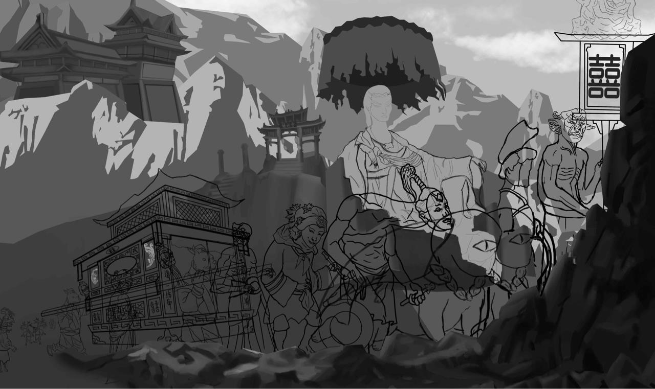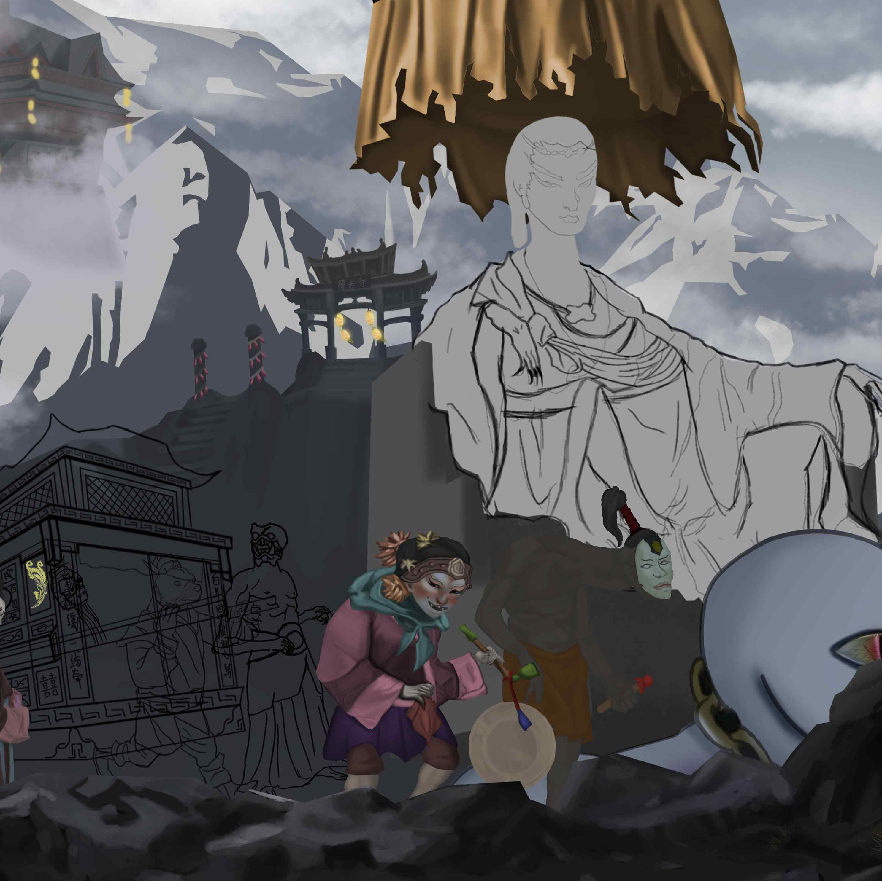 此画描绘了黑山老妖从兰若寺,接亲回来时的壮观场景。百鬼欢呼,热闹非凡。