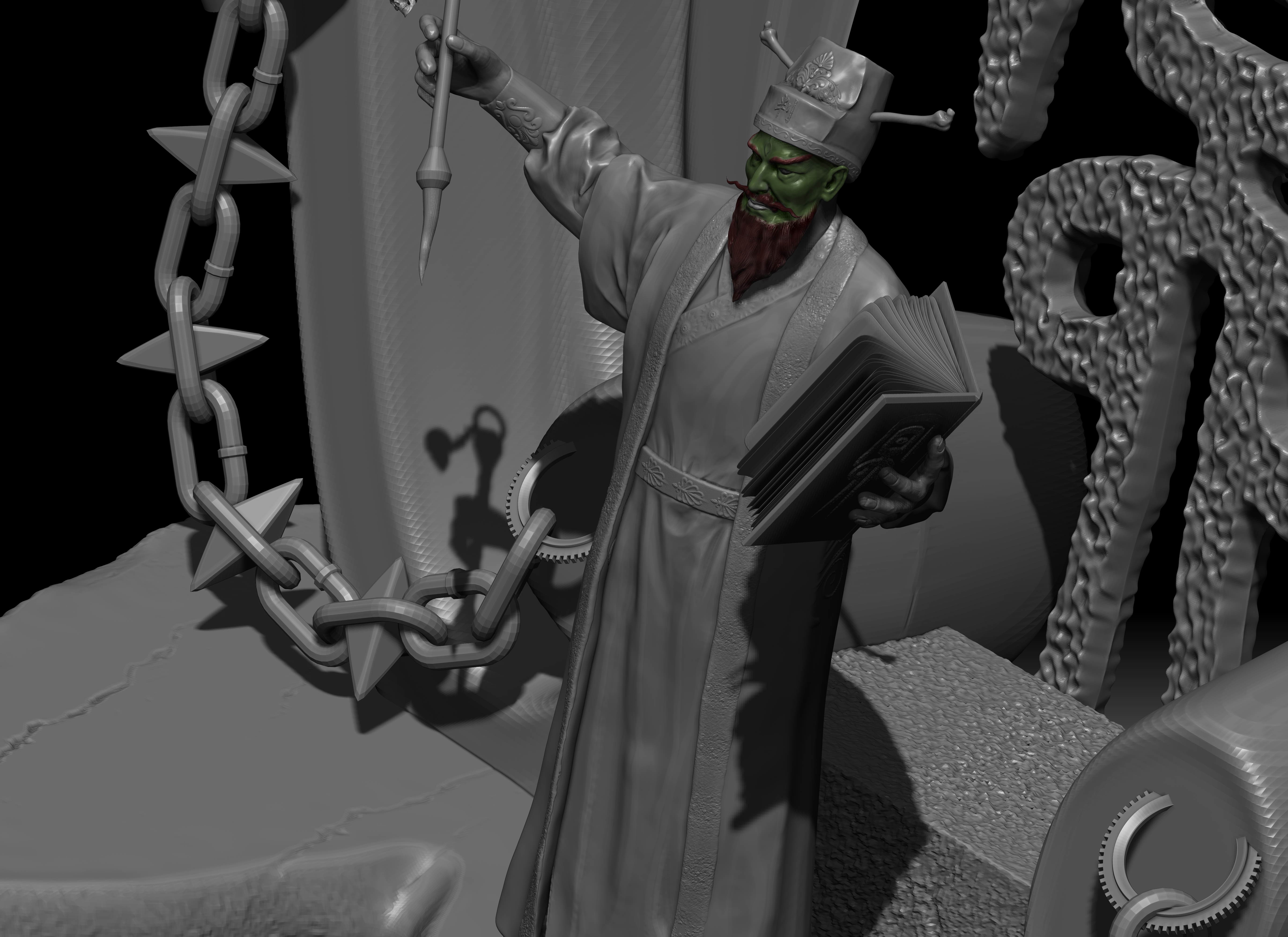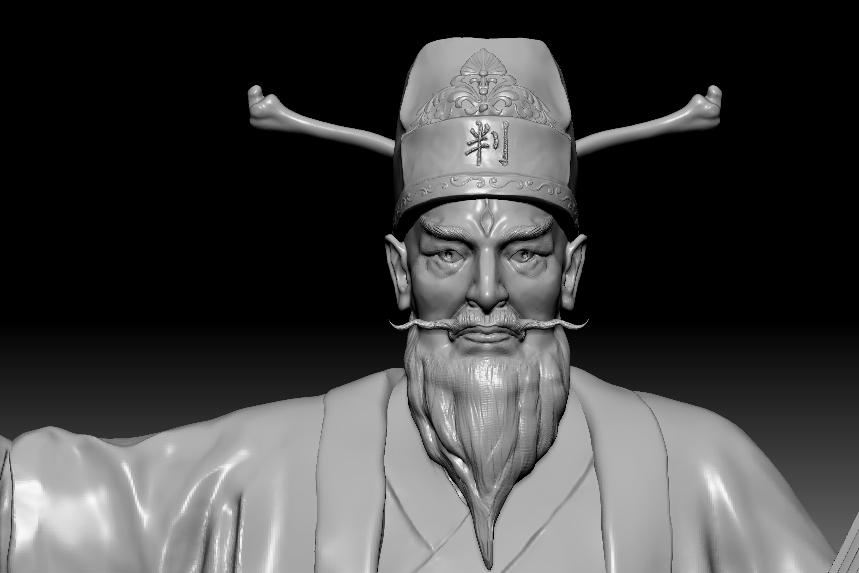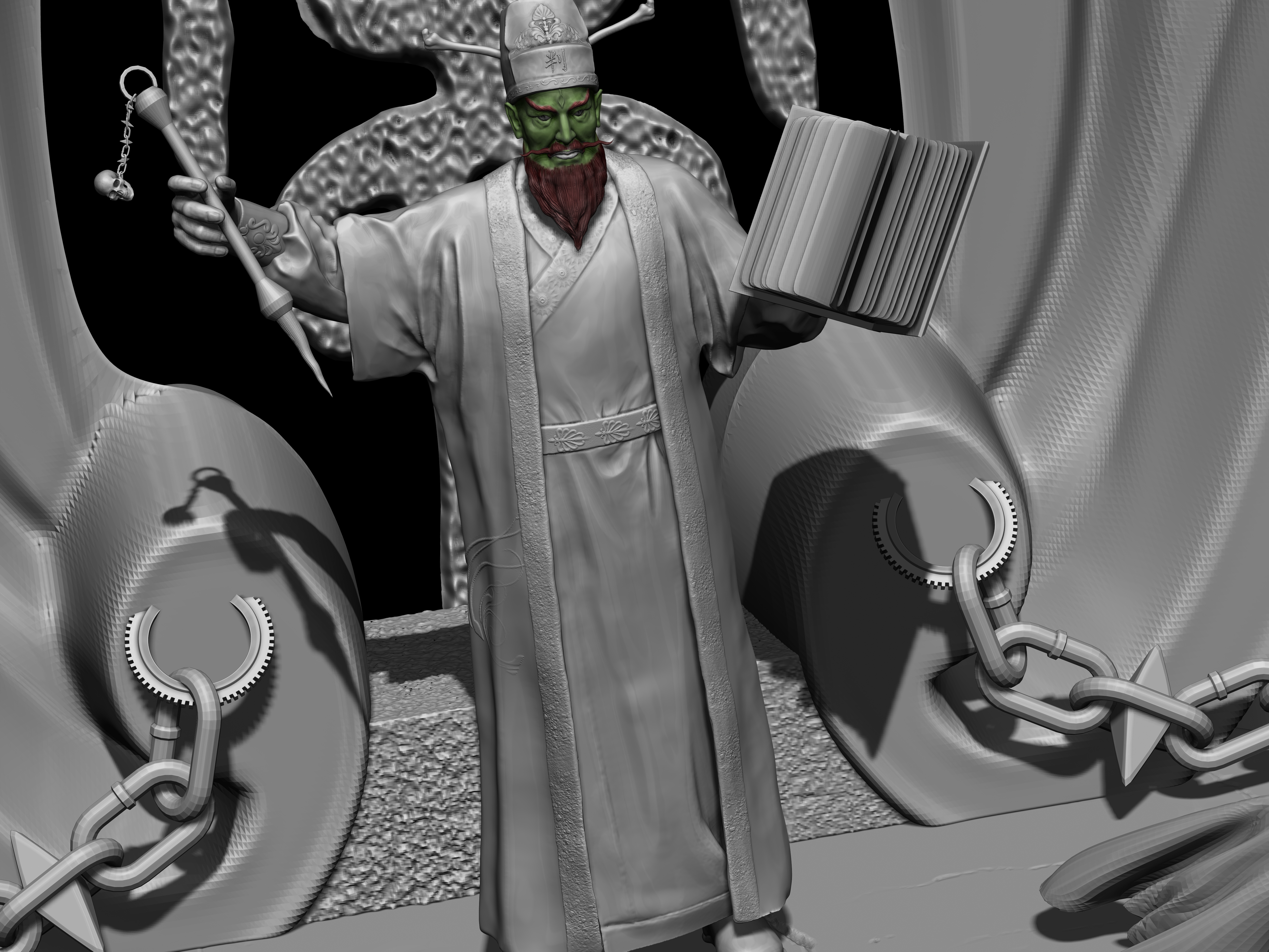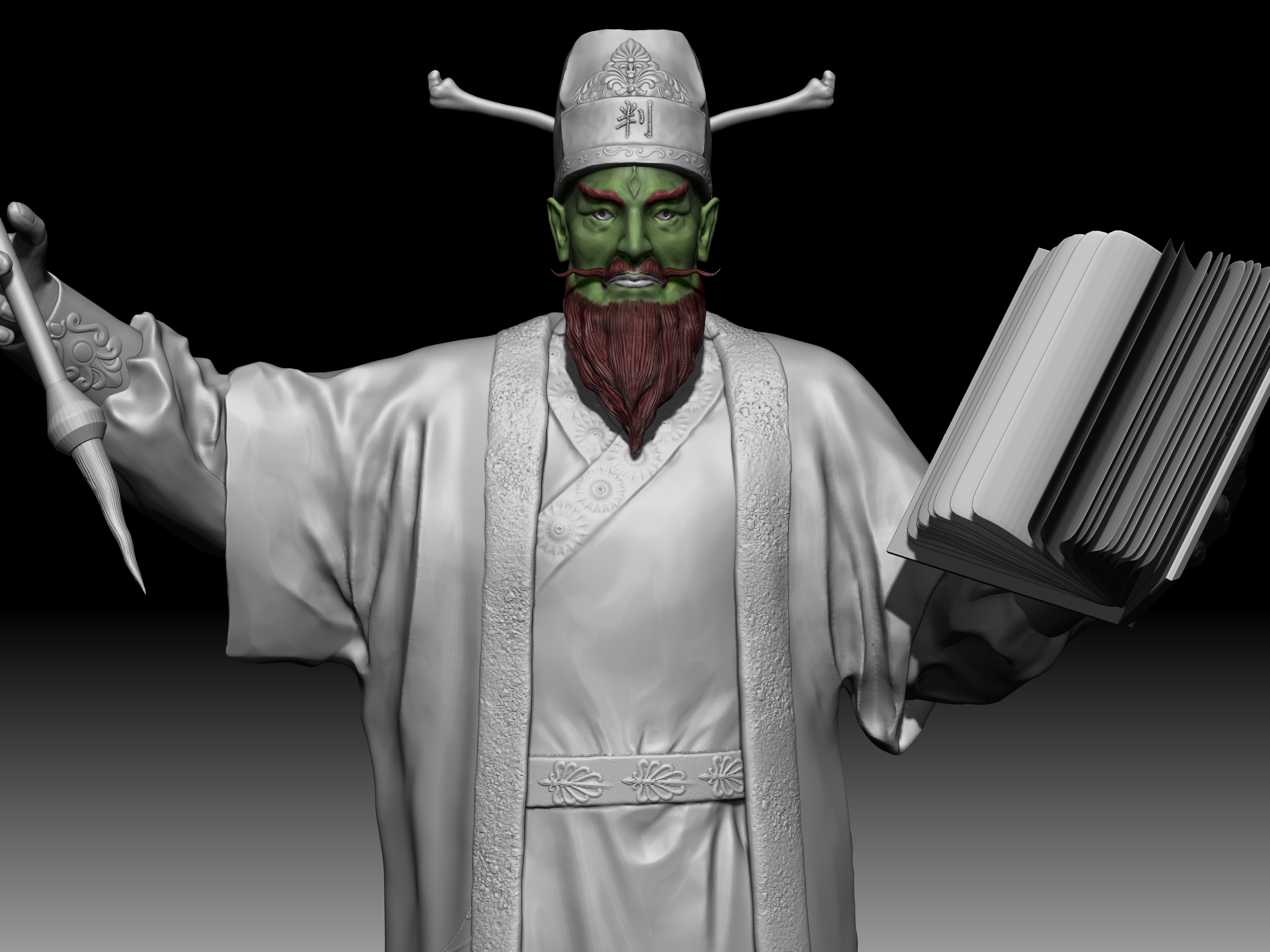 陆判是冥界的阴司,他双目如电,一副大义禀然的样子。其职责是使恶人受到惩罚,为冤者平反昭雪。他相貌狰狞,绿面红须,性格豪迈,刚强,监察人间寿尽之人,铁笔一勾,即来勾魂。在《聊斋志异》中,朱尔旦与陆判为友,为其换心,为其妻其后为其妻子换头,只留脖颈间一条红线,线上线下判若两人,可谓神技。