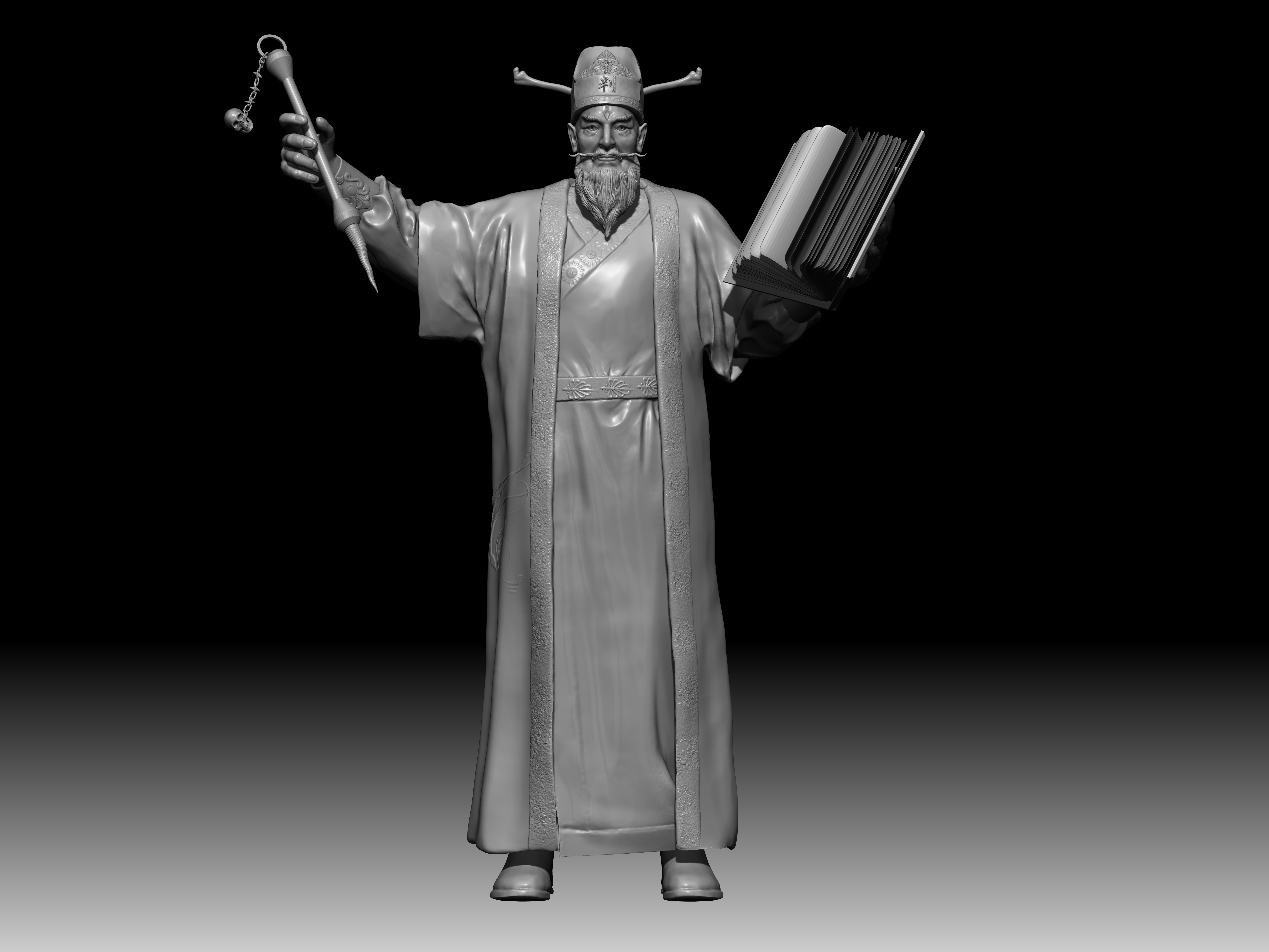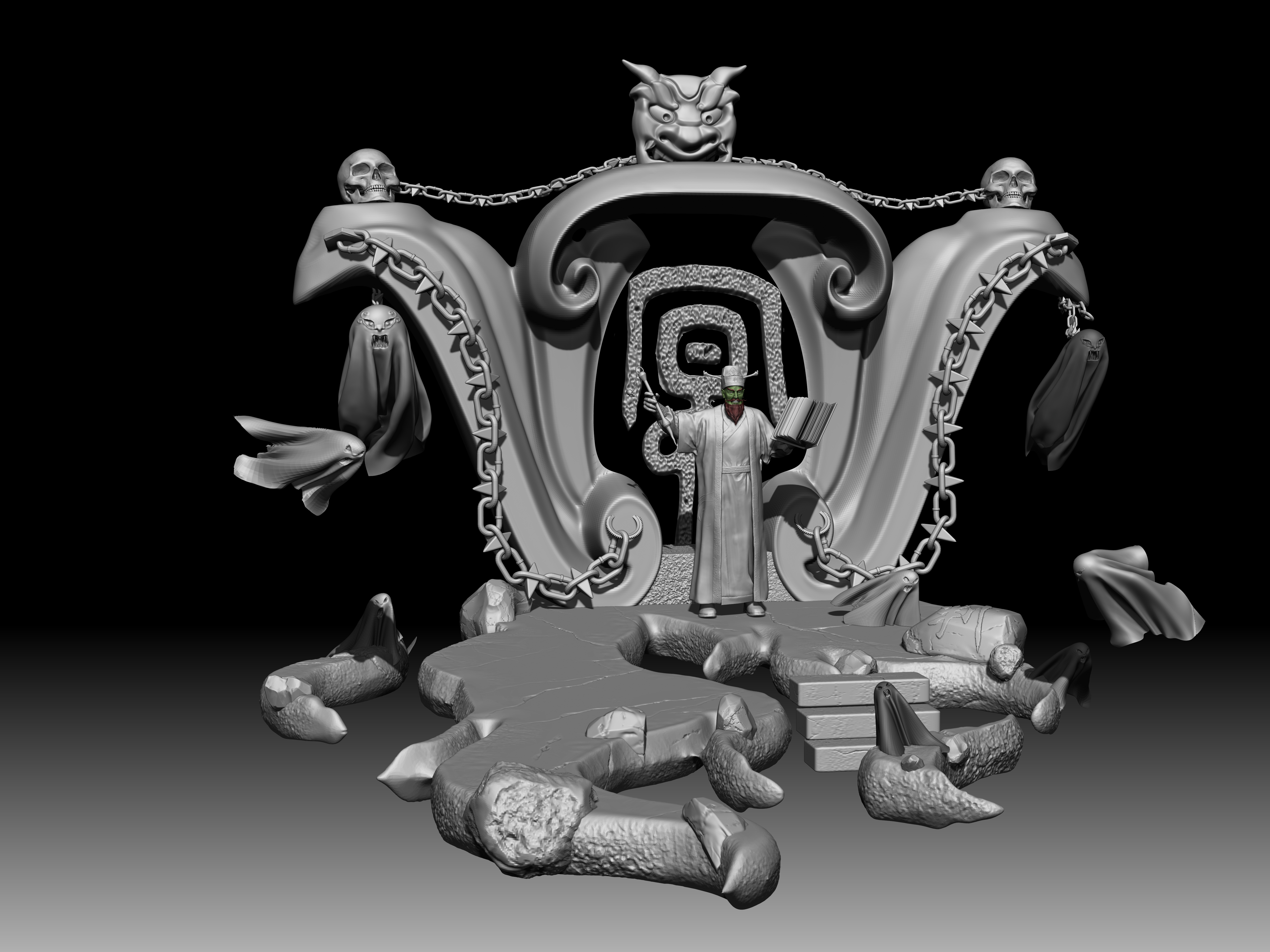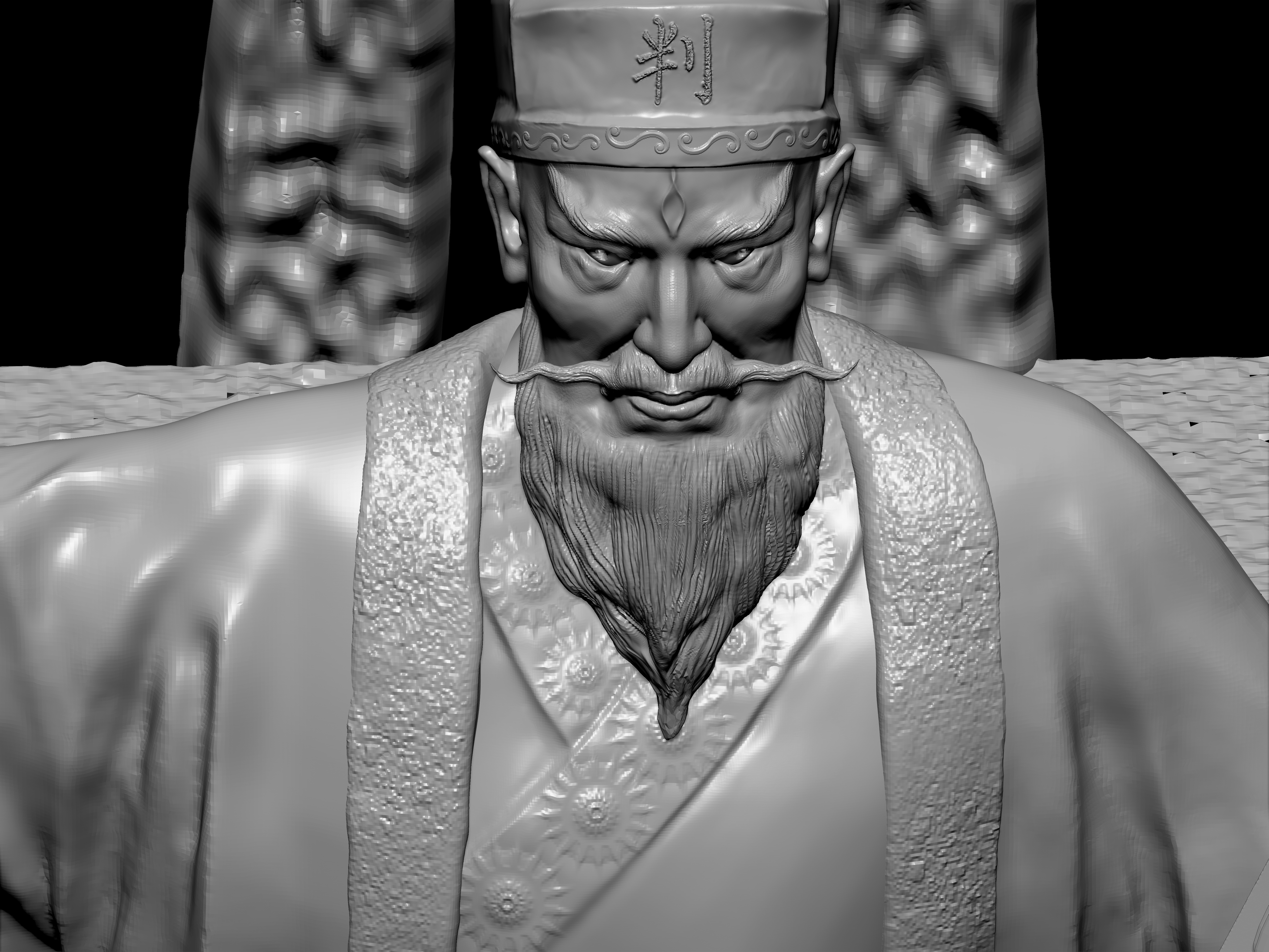 陆判是冥界的阴司,他双目如电,一副大义禀然的样子。其职责是使恶人受到惩罚,为冤者平反昭雪。他相貌狰狞,绿面红须,性格豪迈,刚强,监察人间寿尽之人,铁笔一勾,即来勾魂。在《聊斋志异》中,朱尔旦与陆判为友,为其换心,为其妻其后为其妻子换头,只留脖颈间一条红线,线上线下判若两人,可谓神技。