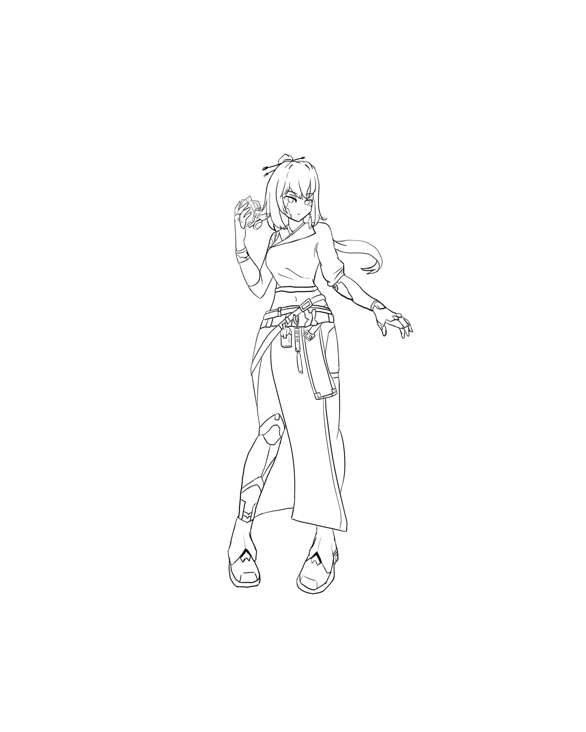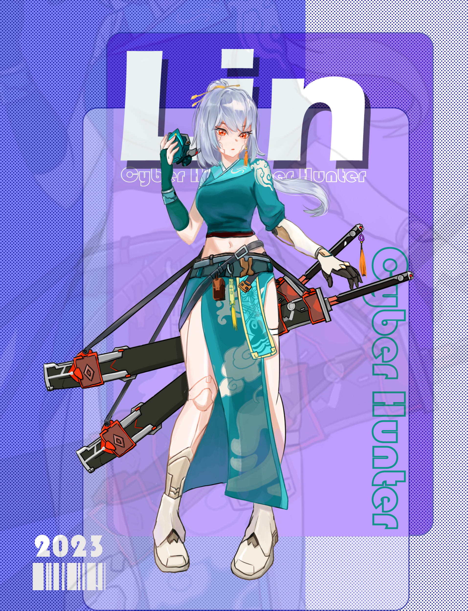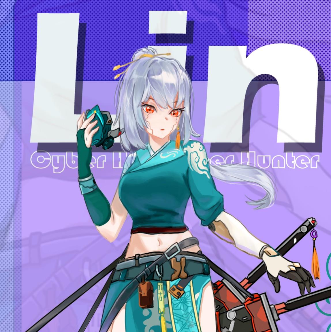 此作品为结合了唐朝与赛博朋克的元素的一名女性剑客,名字叫作琳,腰处所带的刀是以唐刀为原型的且结合了机械元素的风格。