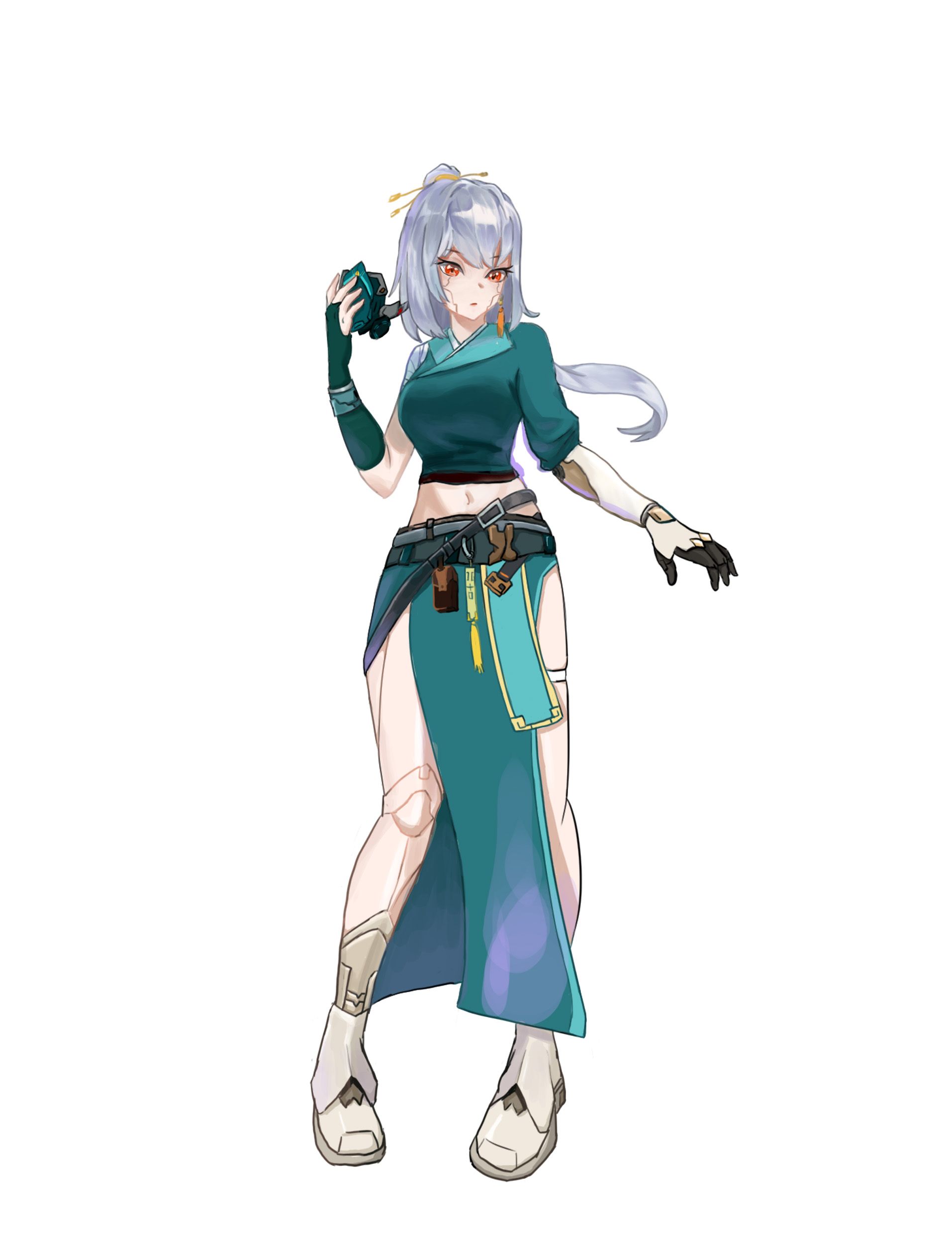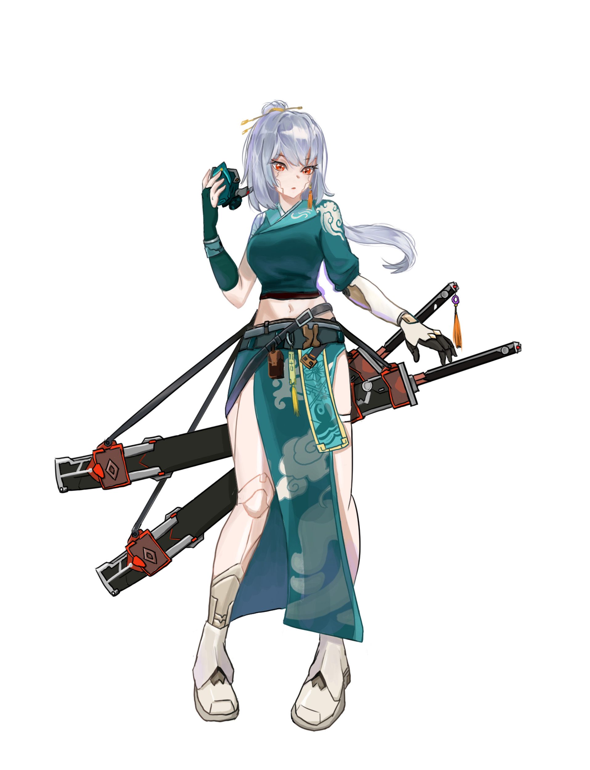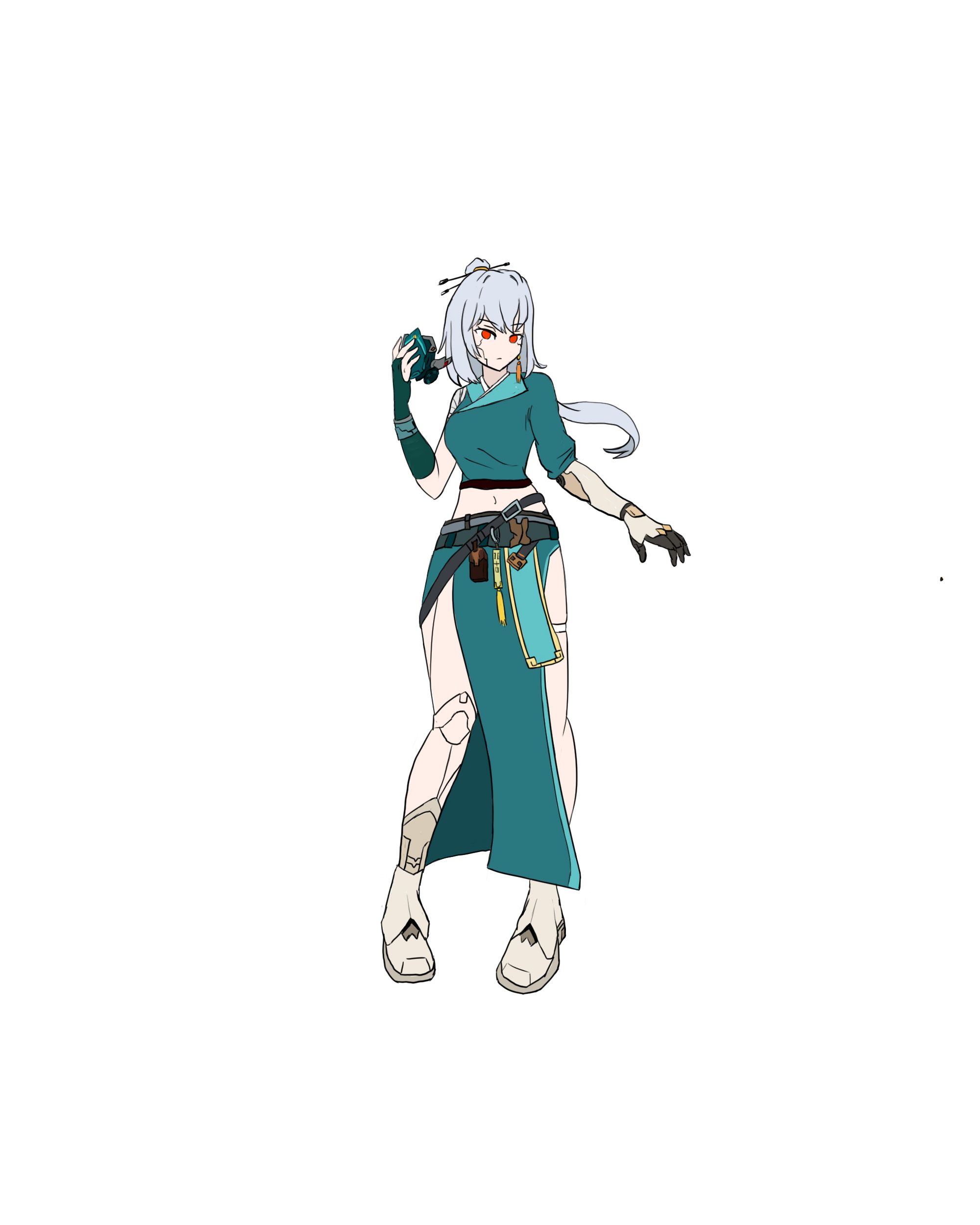 此作品为结合了唐朝与赛博朋克的元素的一名女性剑客,名字叫作琳,腰处所带的刀是以唐刀为原型的且结合了机械元素的风格。